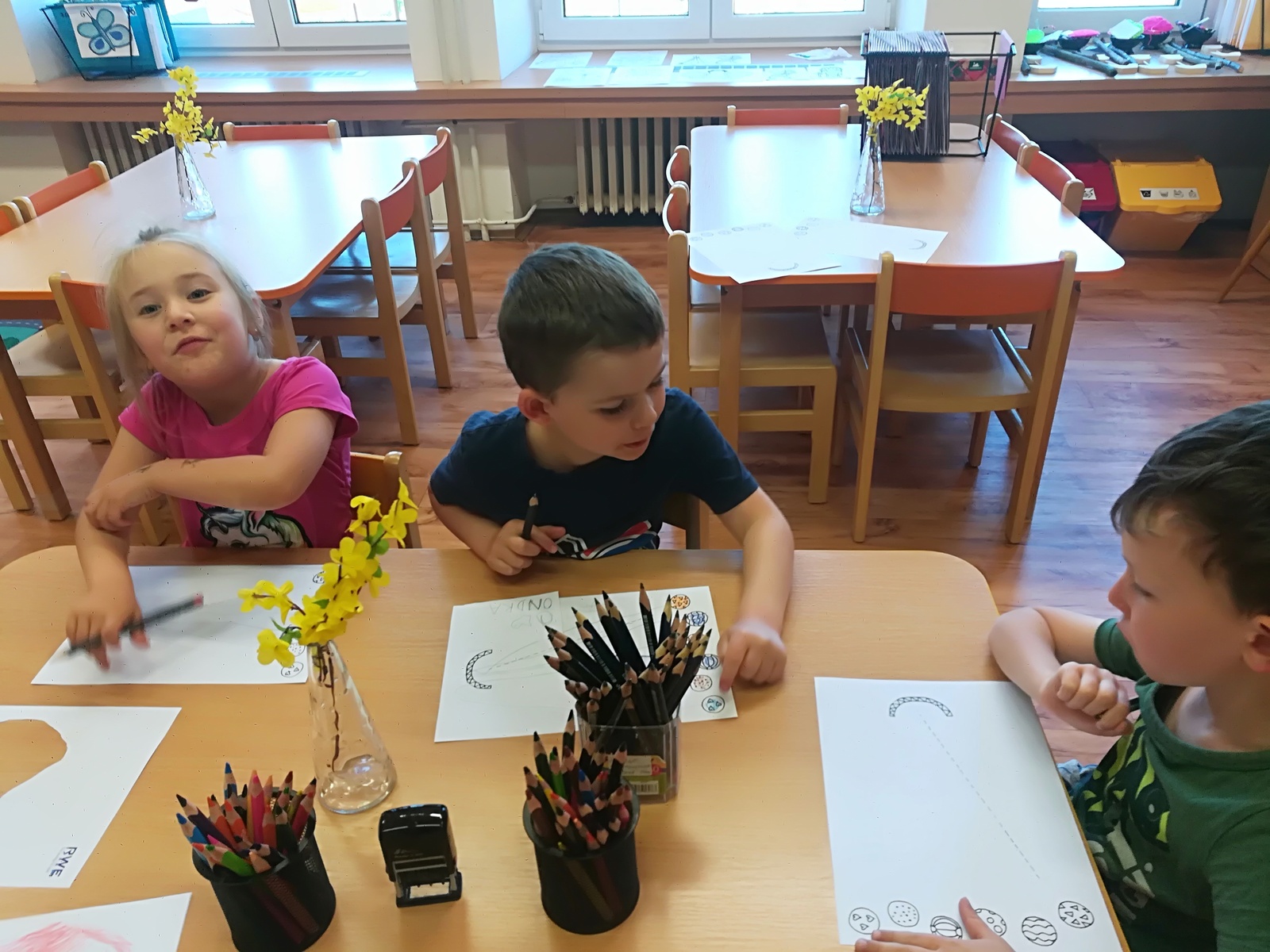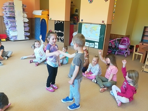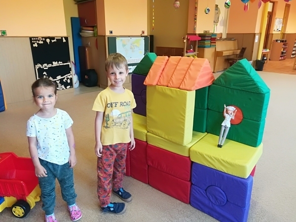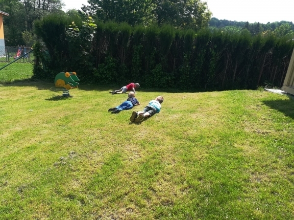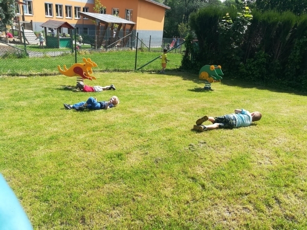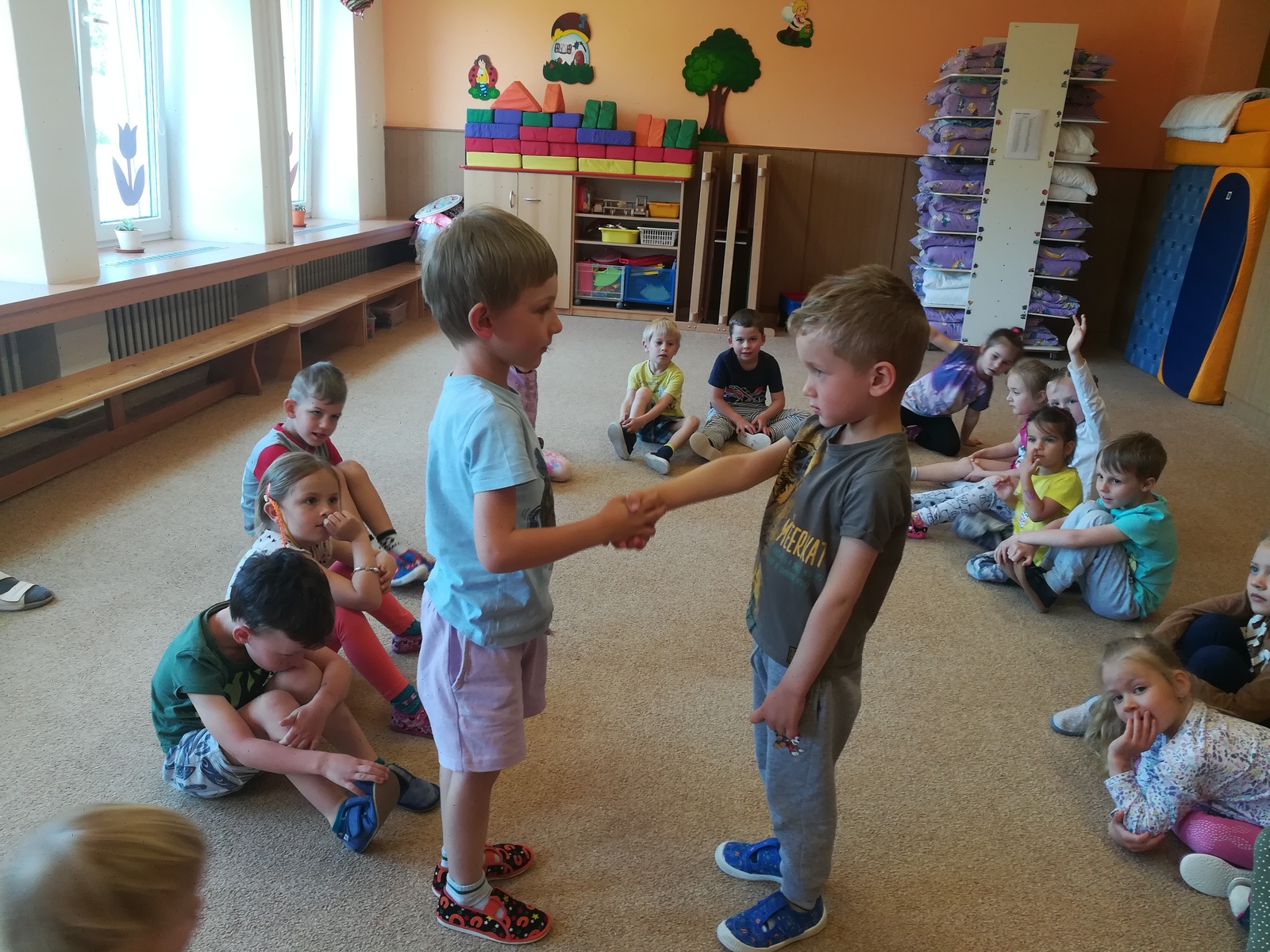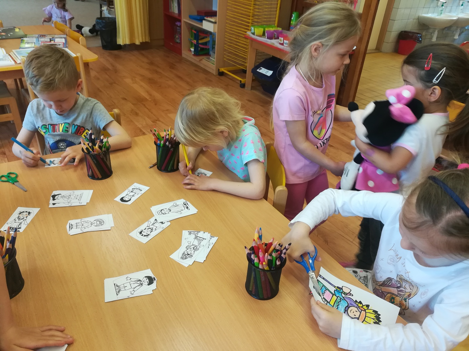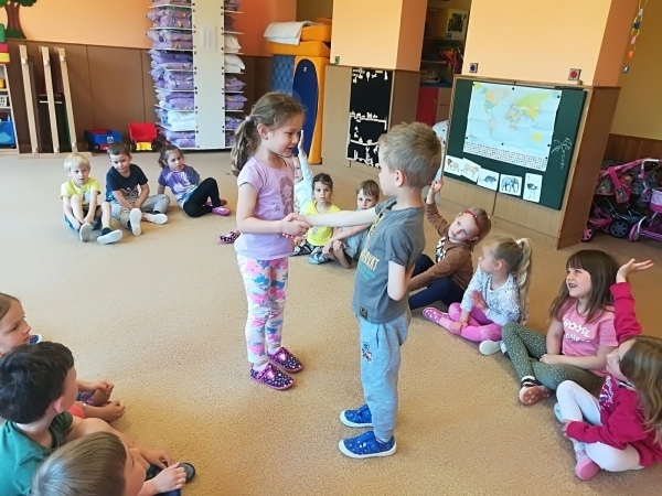 O tom, že na celém světě žijí děti, které se od nás sice liší, ale zároveň jsou nám hodně podobné jsme si povídali v týdnu nazvaném Děti slaví svátek. Na mapě jsme si ukázali všechny světadíly, řekli si jejich názvy a snažili jsme se zapamatovat, že my žijeme v České republice, v Evropě. Vyrobili jsme si loutky dětí, vybarvovali, vystřihávali, při hrách s nimi jsme rozvíjeli komunikativní dovednosti, hráli jsme si na námořníky - cestovali lodí po světě…na papíru jsme zkoušeli rovnou čarou trefit míčem do branky. Při vybarvování obrázků jsme se řídili jejich počtem (do 5- ti). S Vašíkem jsme oslavili jeho narozeniny. Konečně nám počasí dovolilo na travnatém kopečku válet sudy :-) V pátek jsme si užili veselé dovádění s bublinkami a klaunem Hopsalínem.