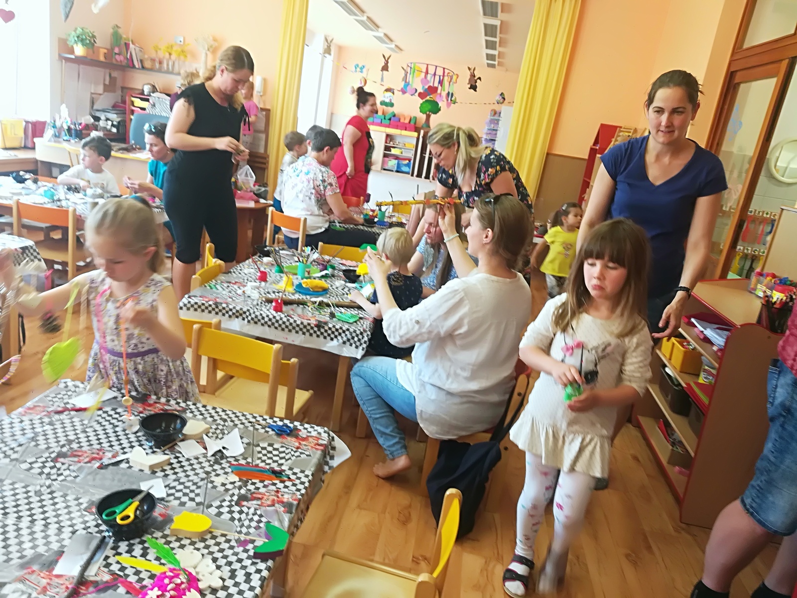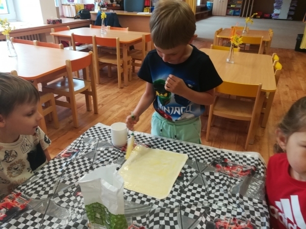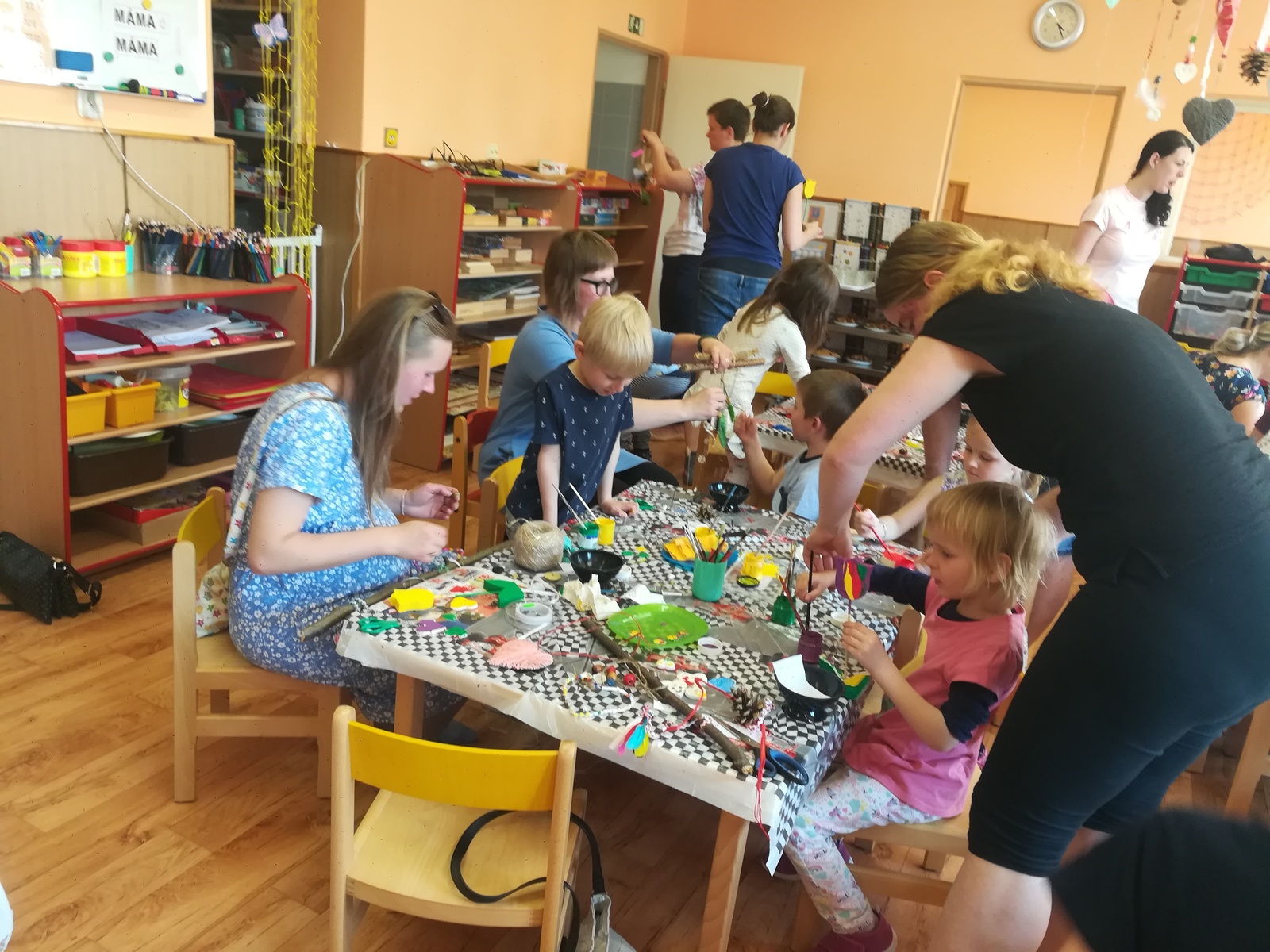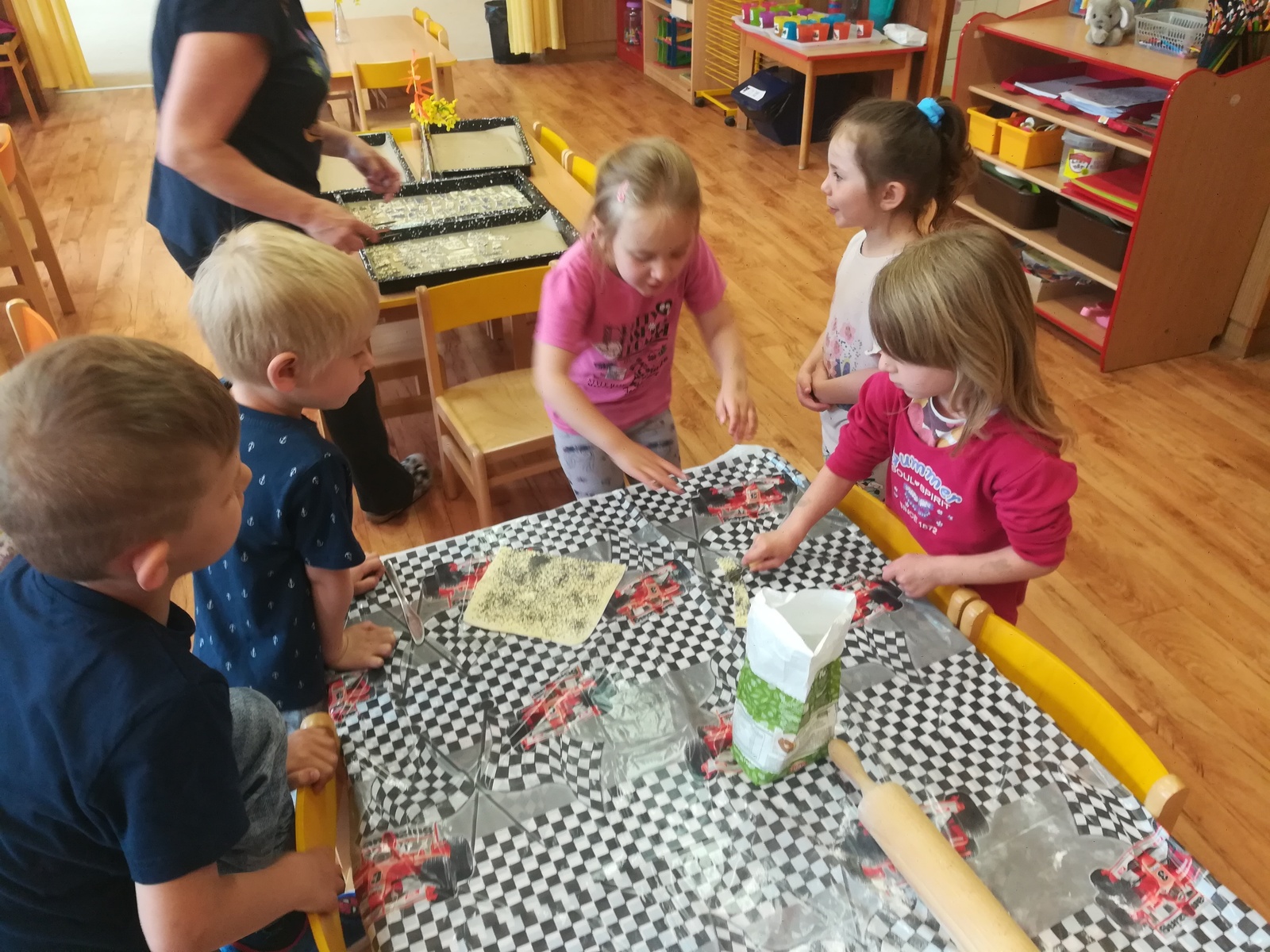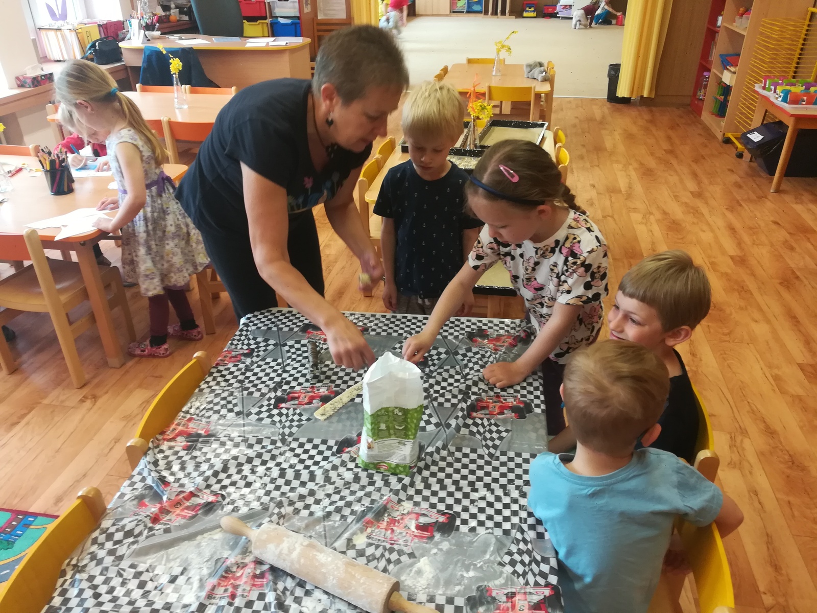 Z listového těsta jsme vyváleli, vykrájeli, posypali mákem a kmínem se solí a uložili na plechy tyčinky (paní kuchařky nám je upekly, za což tímto ještě jednou děkujeme), abychom měli něco dobrého k zakousnutí při naší tvořivé dílničce. Na úvod jsme maminkám přednesli básničku, zatančili taneček a zazpívali písničky, potom jsme společně zdobili barvami dřevěné tulipánky a vytvořili ozdobný závěs plný srdíček z lásky.