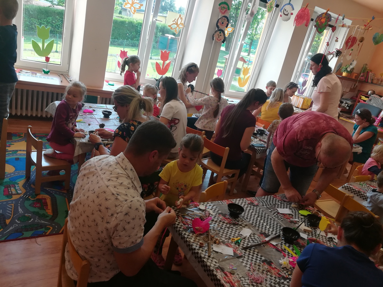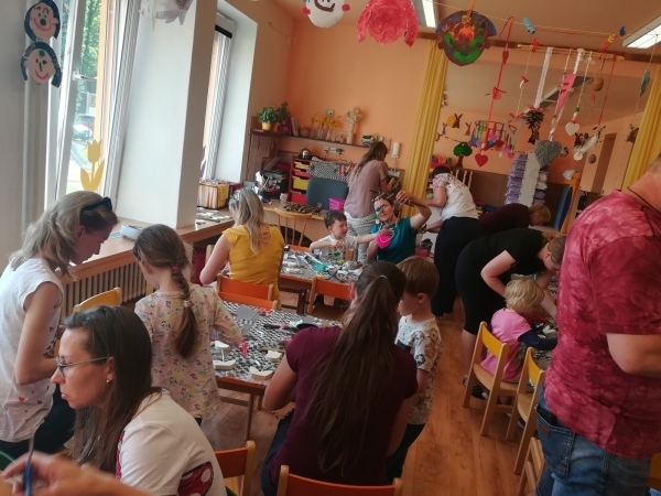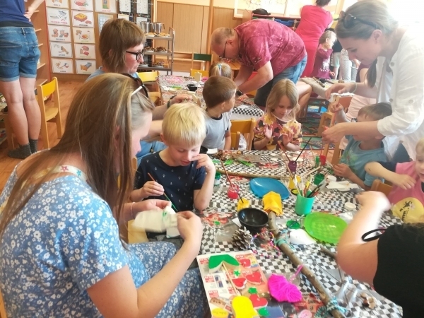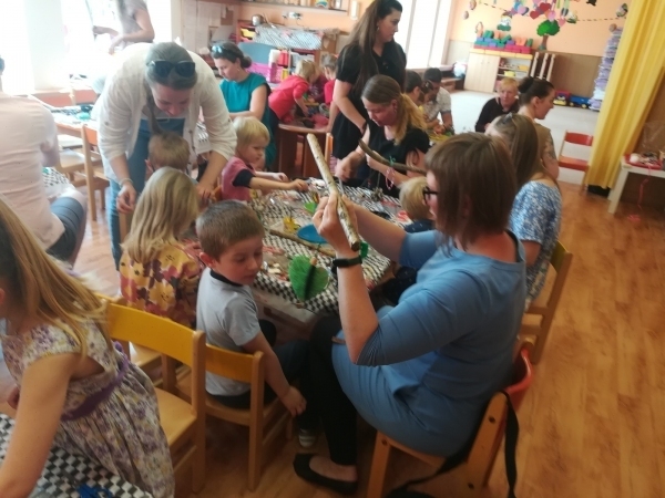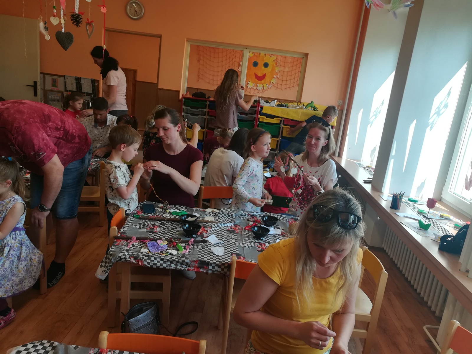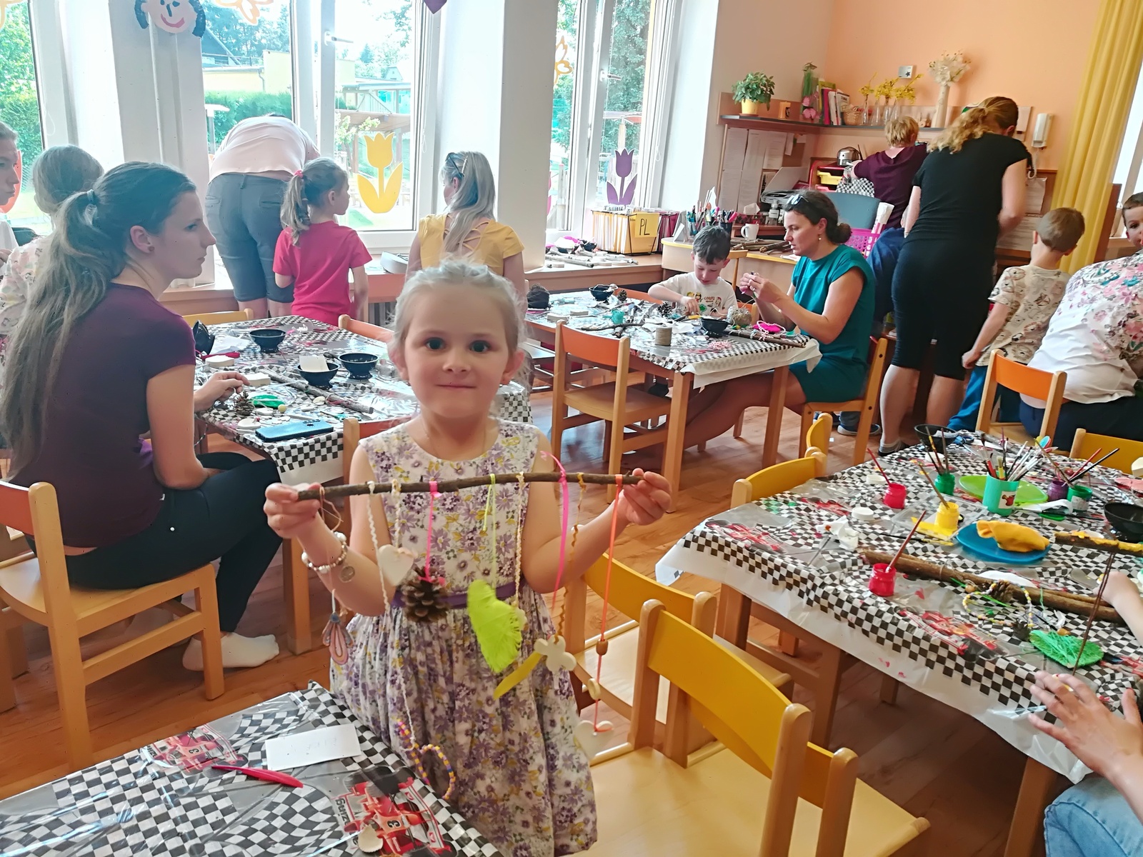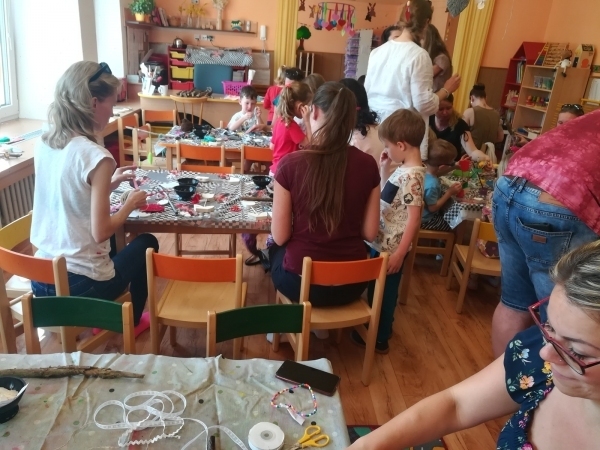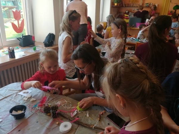 Z listového těsta jsme vyváleli, vykrájeli, posypali mákem a kmínem se solí a uložili na plechy tyčinky (paní kuchařky nám je upekly, za což tímto ještě jednou děkujeme), abychom měli něco dobrého k zakousnutí při naší tvořivé dílničce. Na úvod jsme maminkám přednesli básničku, zatančili taneček a zazpívali písničky, potom jsme společně zdobili barvami dřevěné tulipánky a vytvořili ozdobný závěs plný srdíček z lásky.