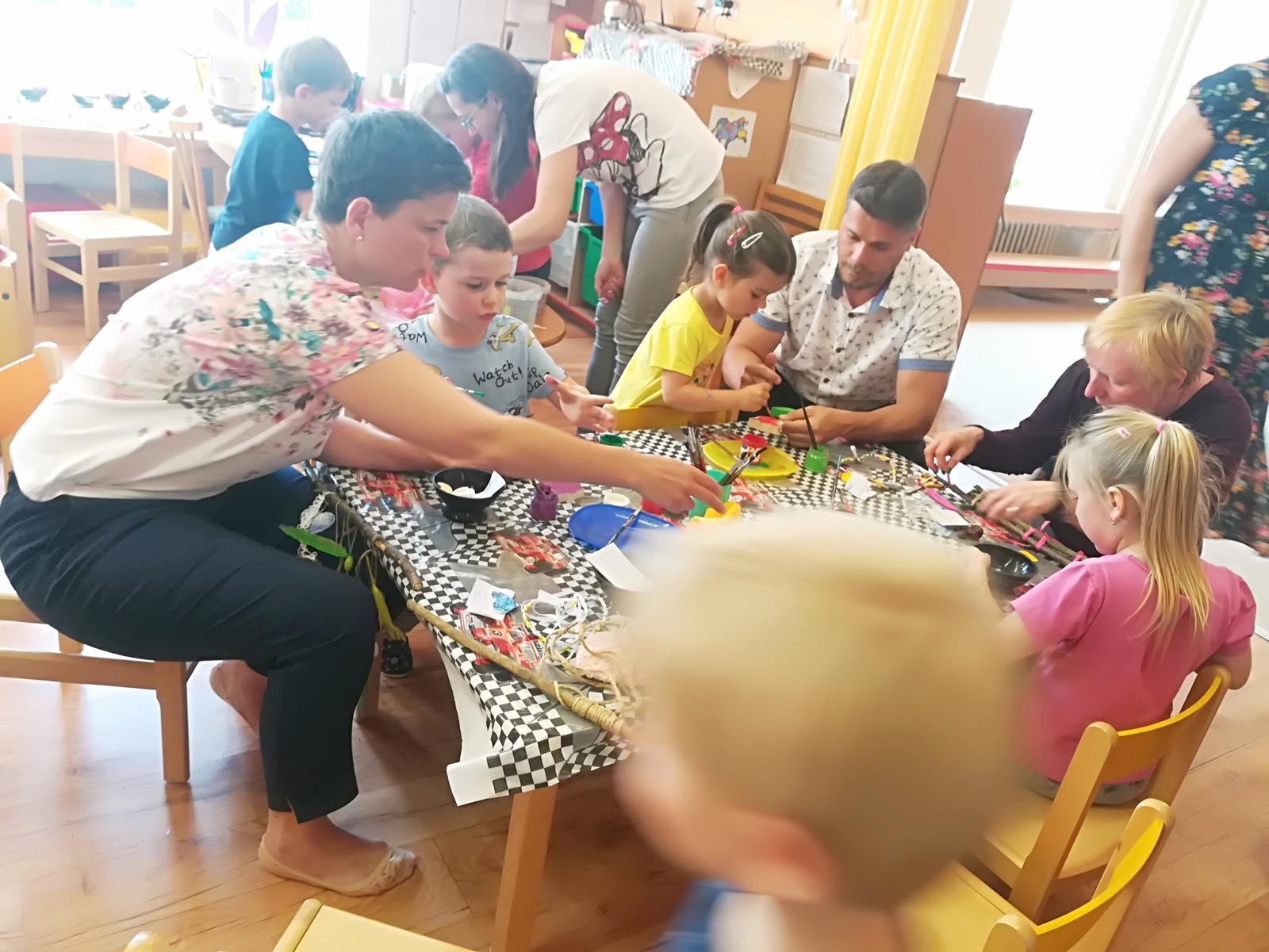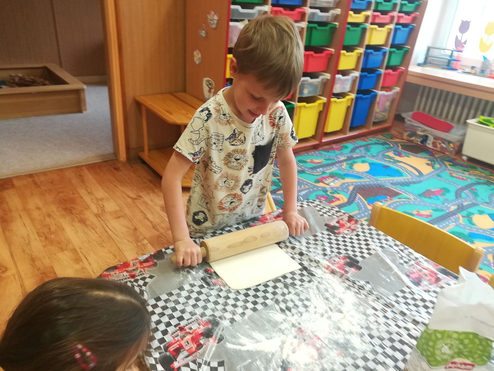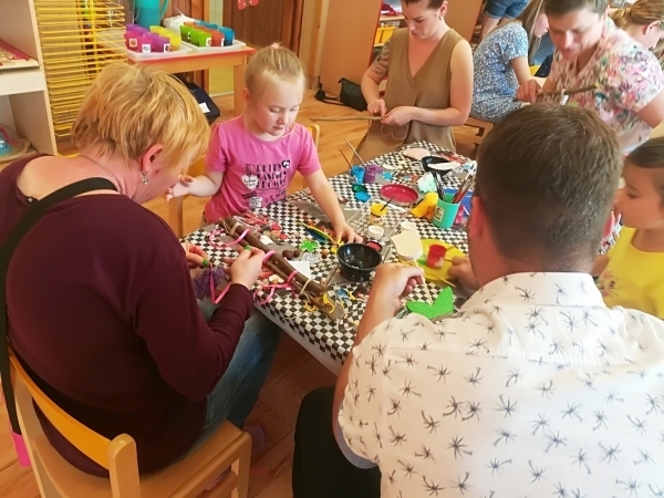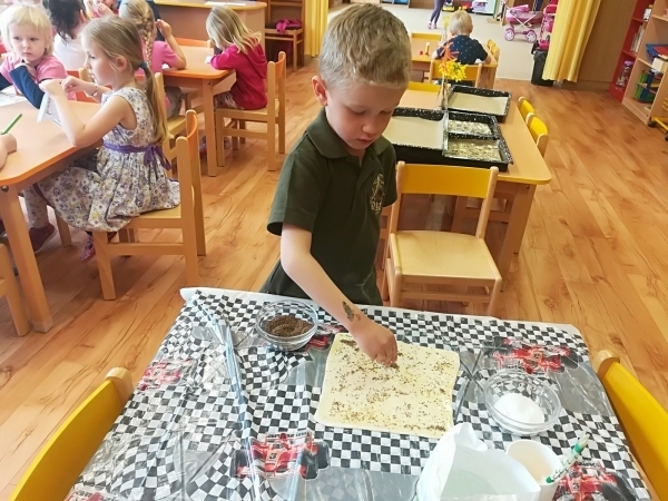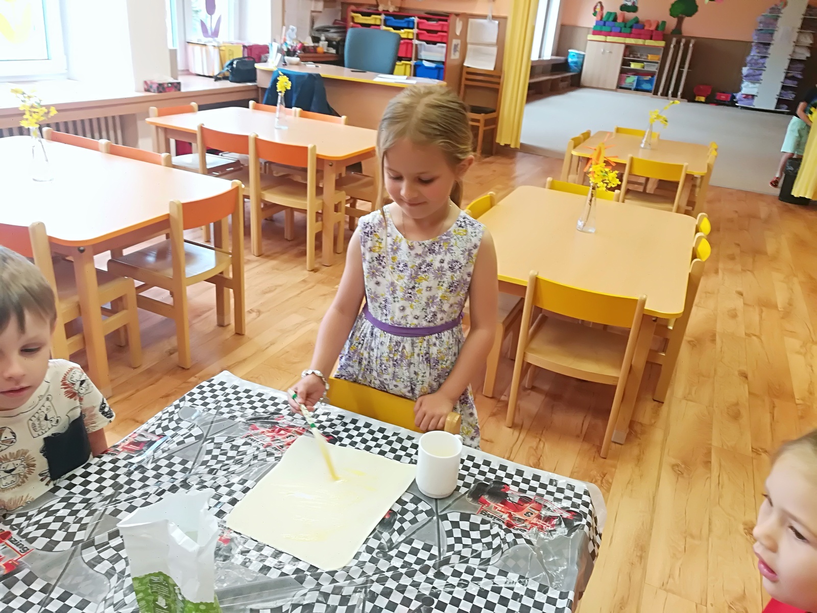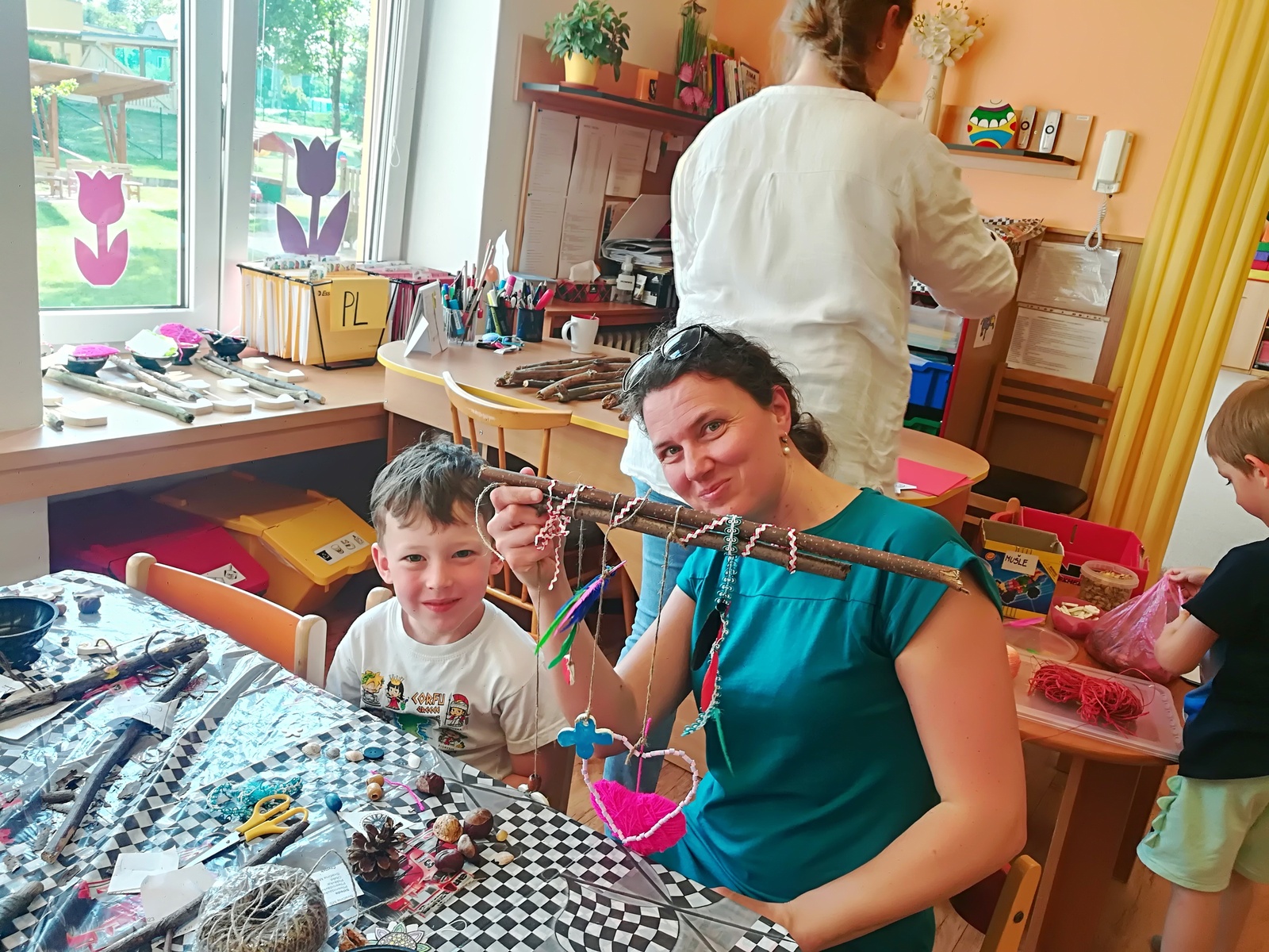 Z listového těsta jsme vyváleli, vykrájeli, posypali mákem a kmínem se solí a uložili na plechy tyčinky (paní kuchařky nám je upekly, za což tímto ještě jednou děkujeme), abychom měli něco dobrého k zakousnutí při naší tvořivé dílničce. Na úvod jsme maminkám přednesli básničku, zatančili taneček a zazpívali písničky, potom jsme společně zdobili barvami dřevěné tulipánky a vytvořili ozdobný závěs plný srdíček z lásky.