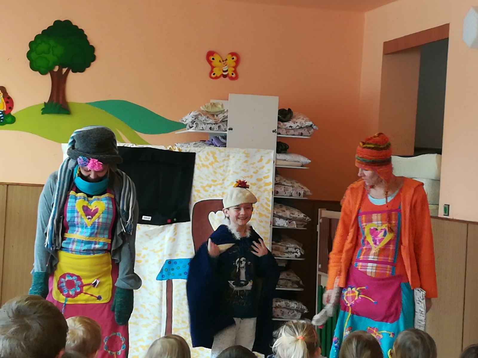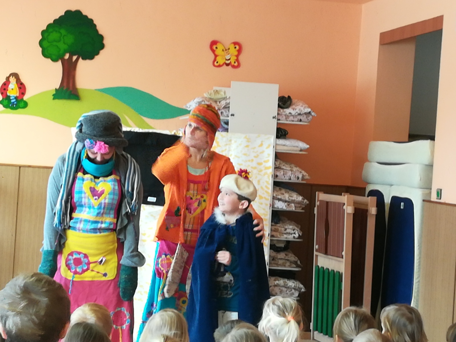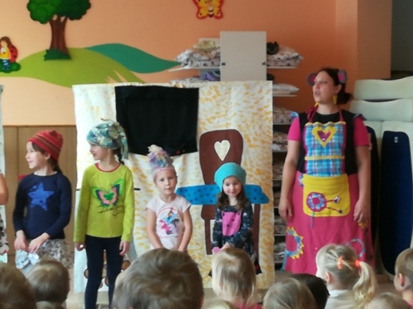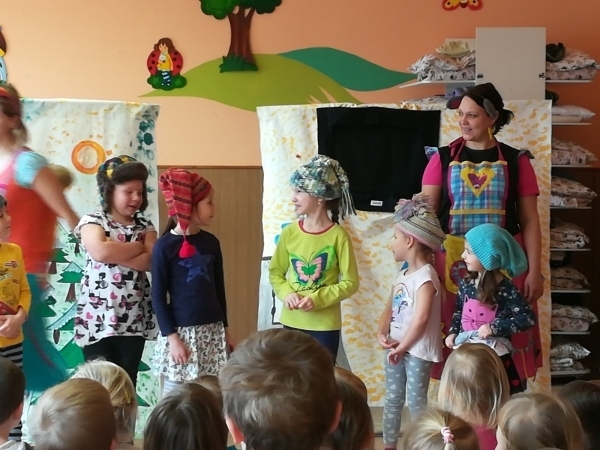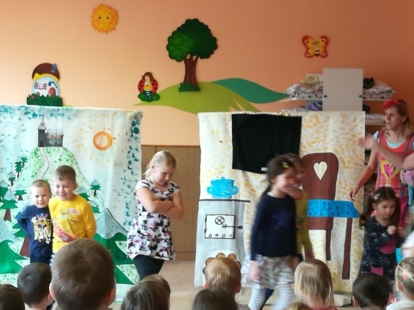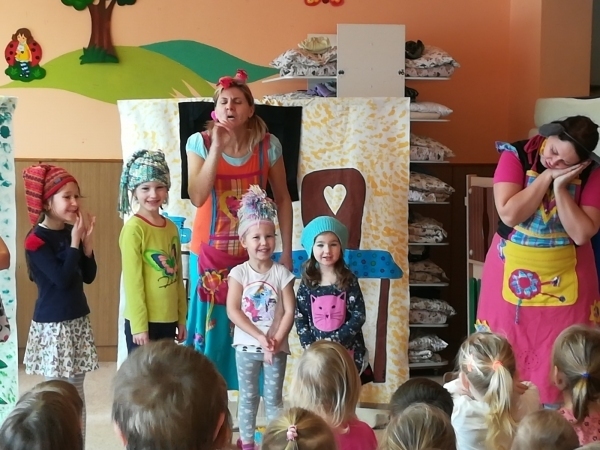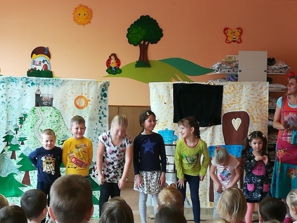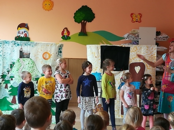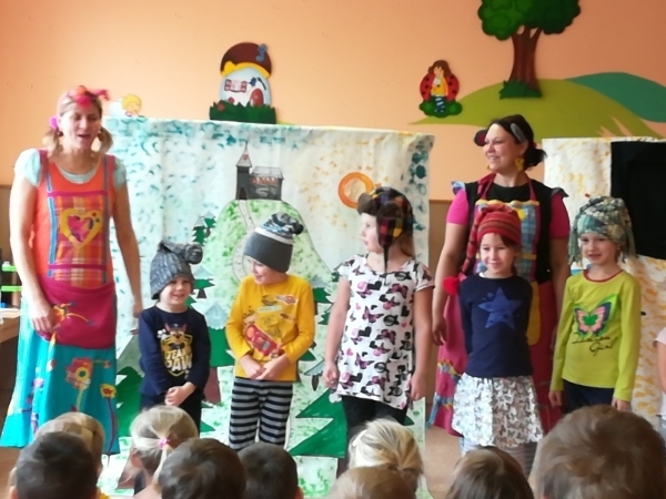 Dnes nám přivezlo divadélko Ententýky pohádku "Myška Klárka, veverka Terka a Sněhurka". Dozvěděli jsme se v ní o zdravém stravování, ale také o tom, že si od cizích lidí nemáme nic brát. Děti si s chutí zahrály trpaslíky a prince:-)