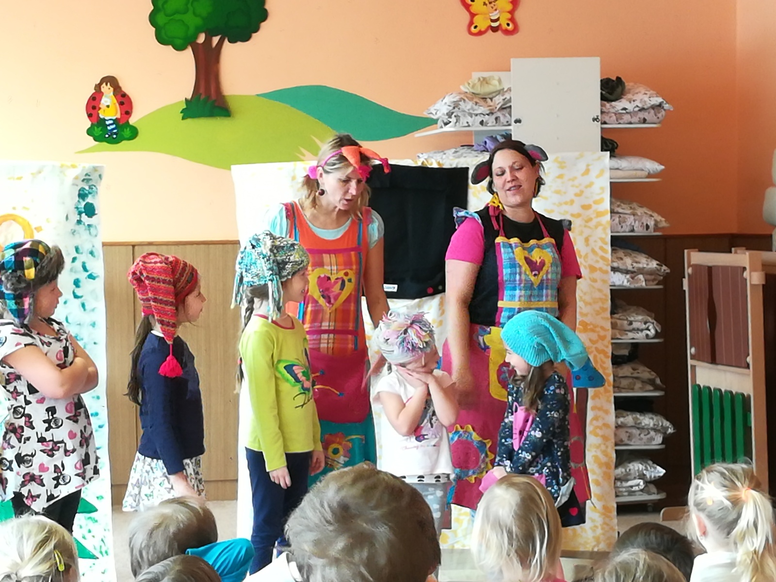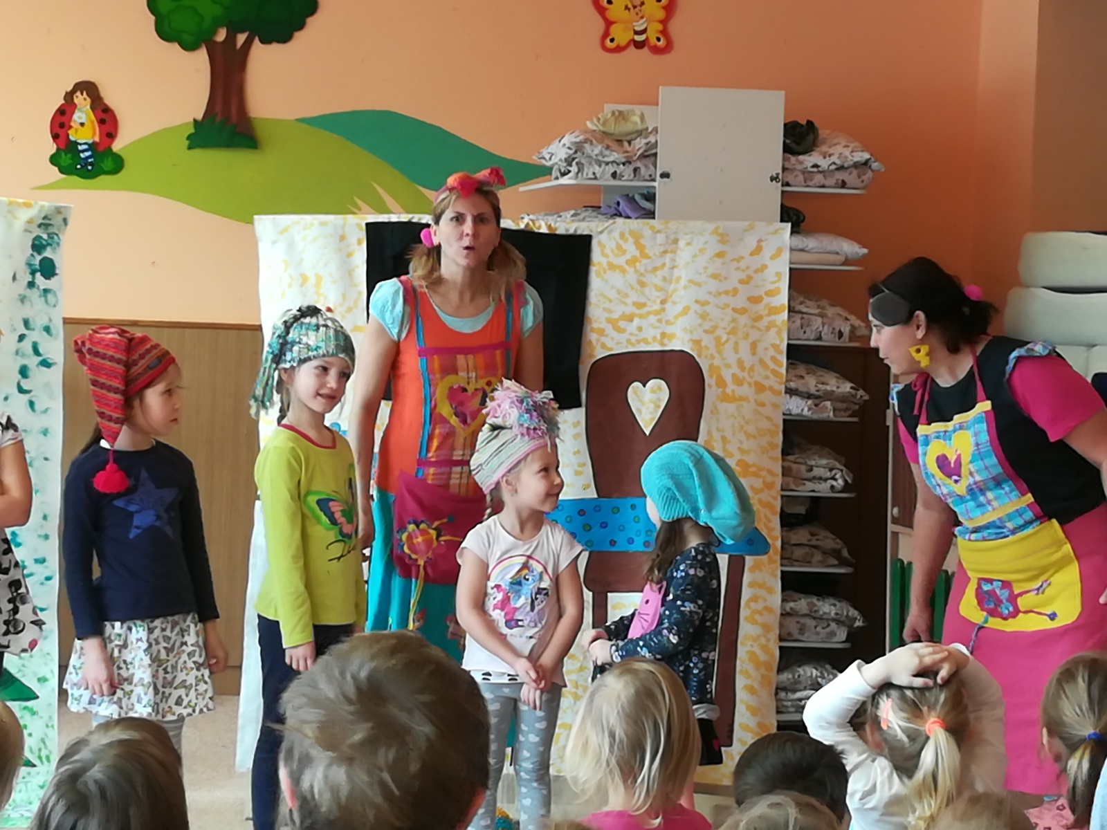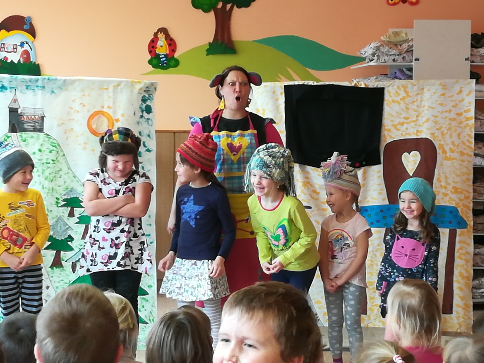 Dnes nám přivezlo divadélko Ententýky pohádku "Myška Klárka, veverka Terka a Sněhurka". Dozvěděli jsme se v ní o zdravém stravování, ale také o tom, že si od cizích lidí nemáme nic brát. Děti si s chutí zahrály trpaslíky a prince:-)