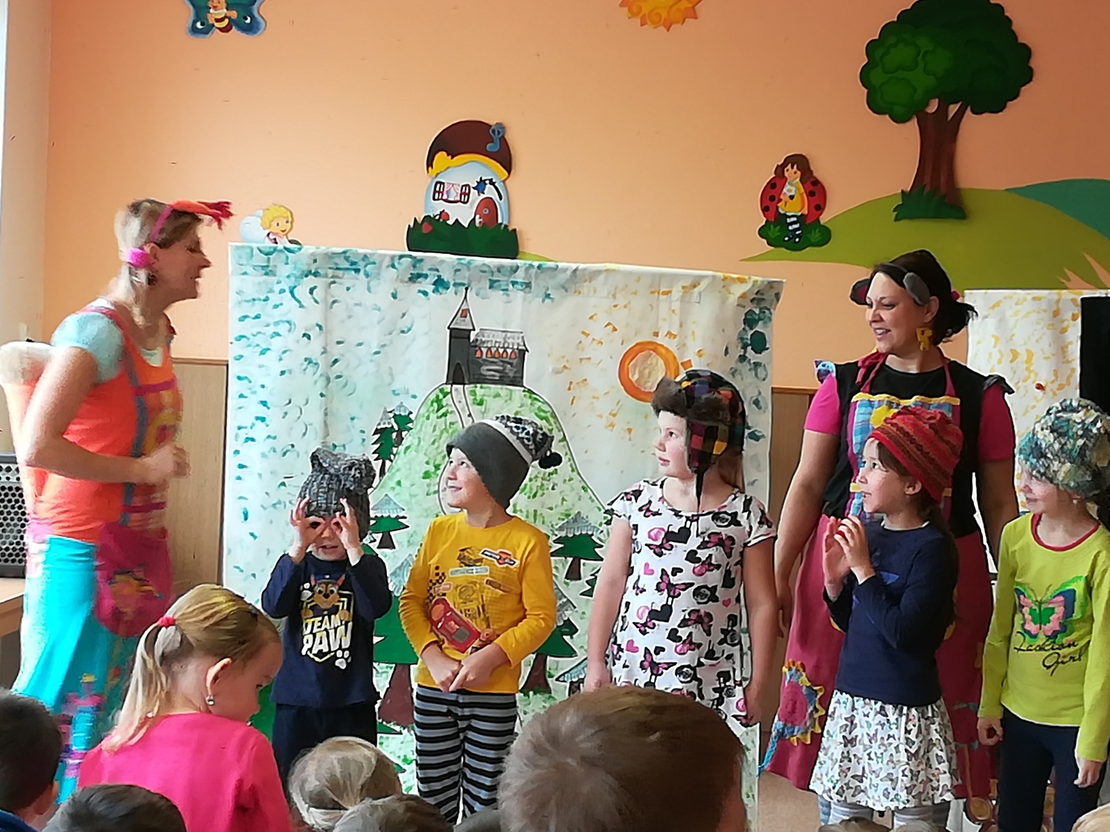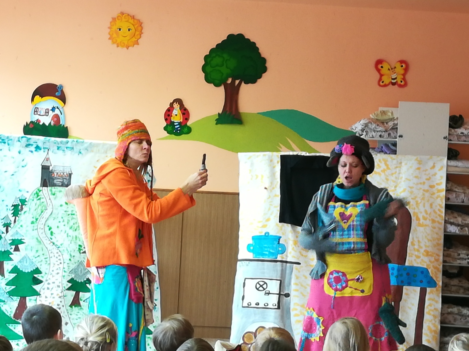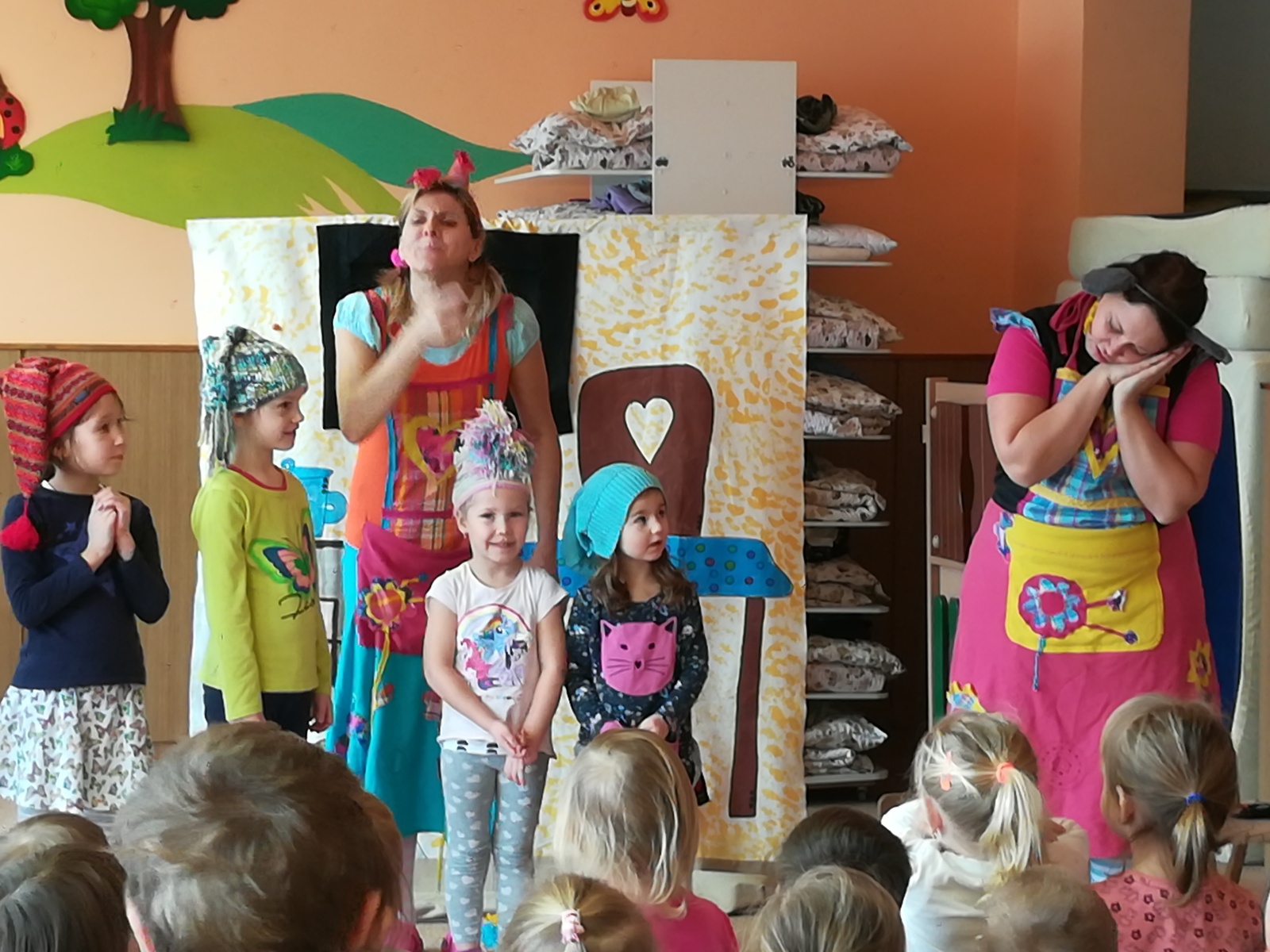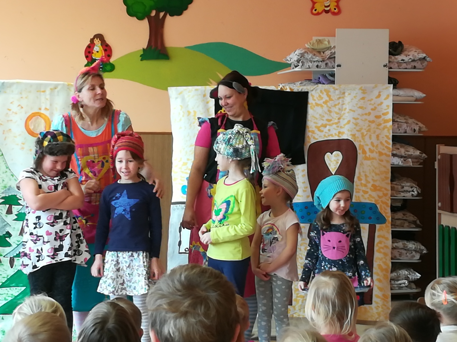 Dnes nám přivezlo divadélko Ententýky pohádku "Myška Klárka, veverka Terka a Sněhurka". Dozvěděli jsme se v ní o zdravém stravování, ale také o tom, že si od cizích lidí nemáme nic brát. Děti si s chutí zahrály trpaslíky a prince:-)