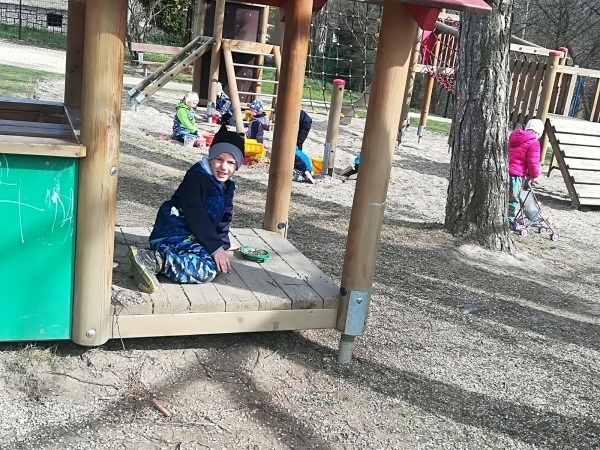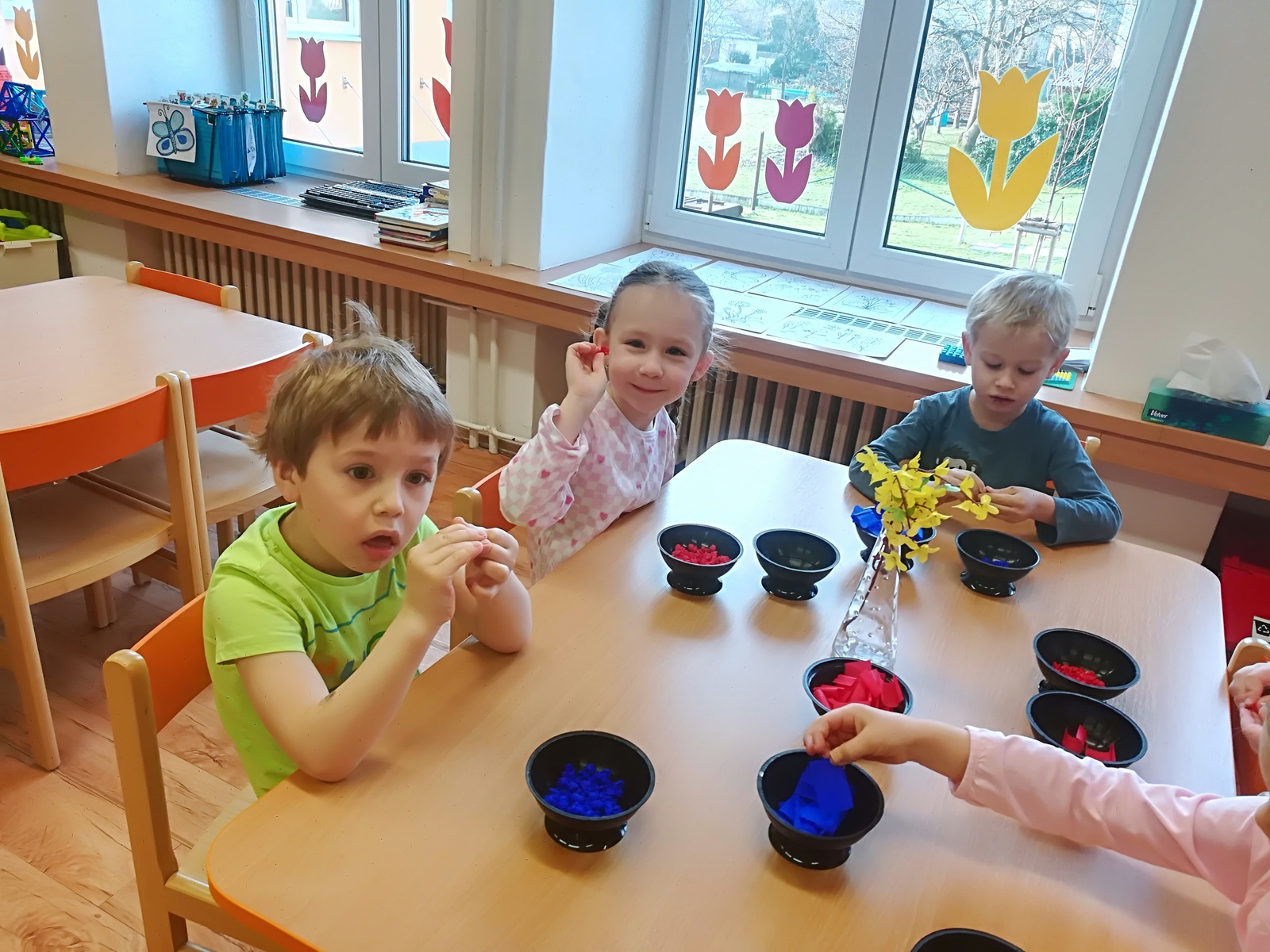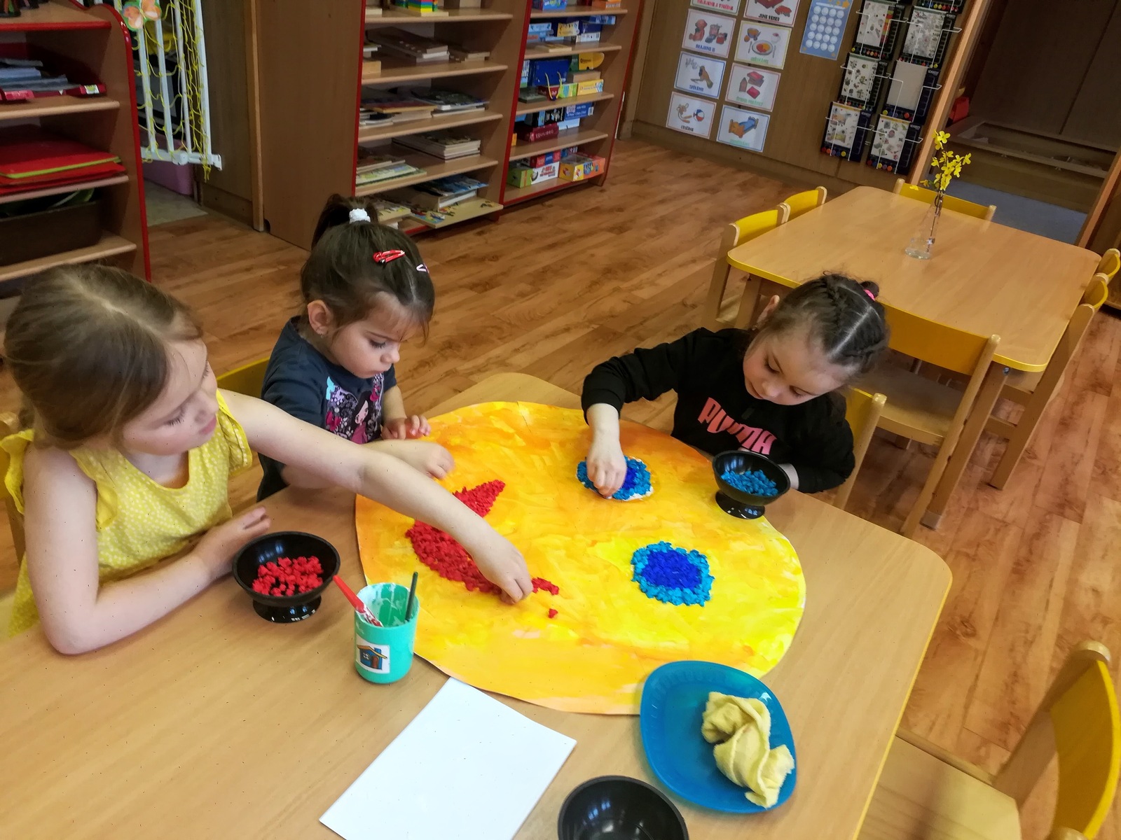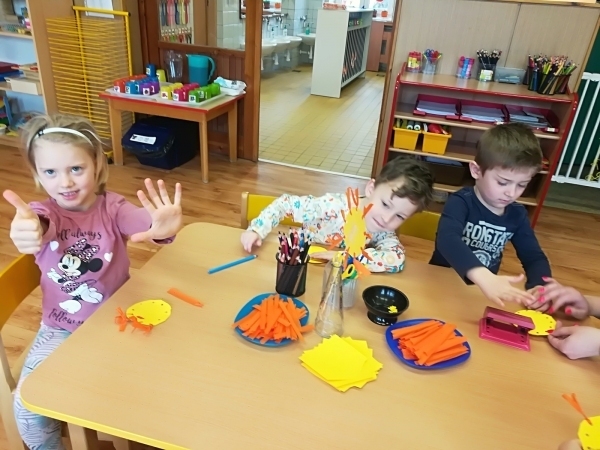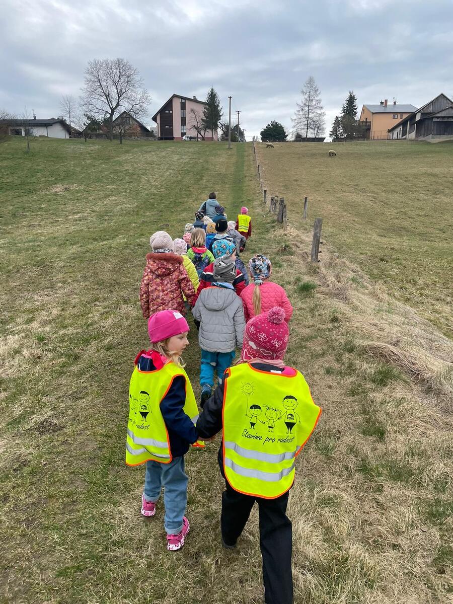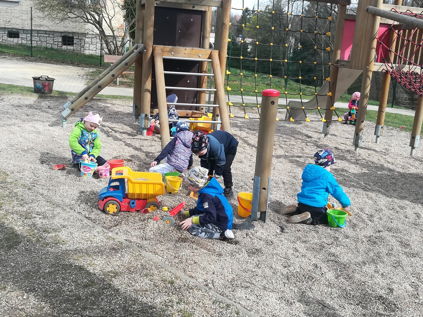 V týdnu nazvaném "Hřej, sluníčko, hřej!" jsme se těšili z přicházejícího jara, poznávali jsme první jarní kytičky nejen na obrázcích, ale i venku, na vycházkách, zkoušeli jsme si zapamatovat jejich názvy, třeba při hudebně-pohybové hře Uvíjíme věneček. Vyrobili jsme si společně velké sluníčko, které se na nás bude usmívat v hracím pokojíčku a každý jedno malé na špejli, třeba do květináče. Dlouhou procházkou jsme došli až na ovčí farmu manželů Tomisových podívat se na jehňátka, ovečky, slepičky, pejsky a kačenky. Mikulášek P. nám představil svá oblíbená zvířátka – mravenečky. Poslechli jsme si nové písničky o jaru a do kelímků zaseli travní semínka. Sluníčka jsme si užívali i na zahradě.