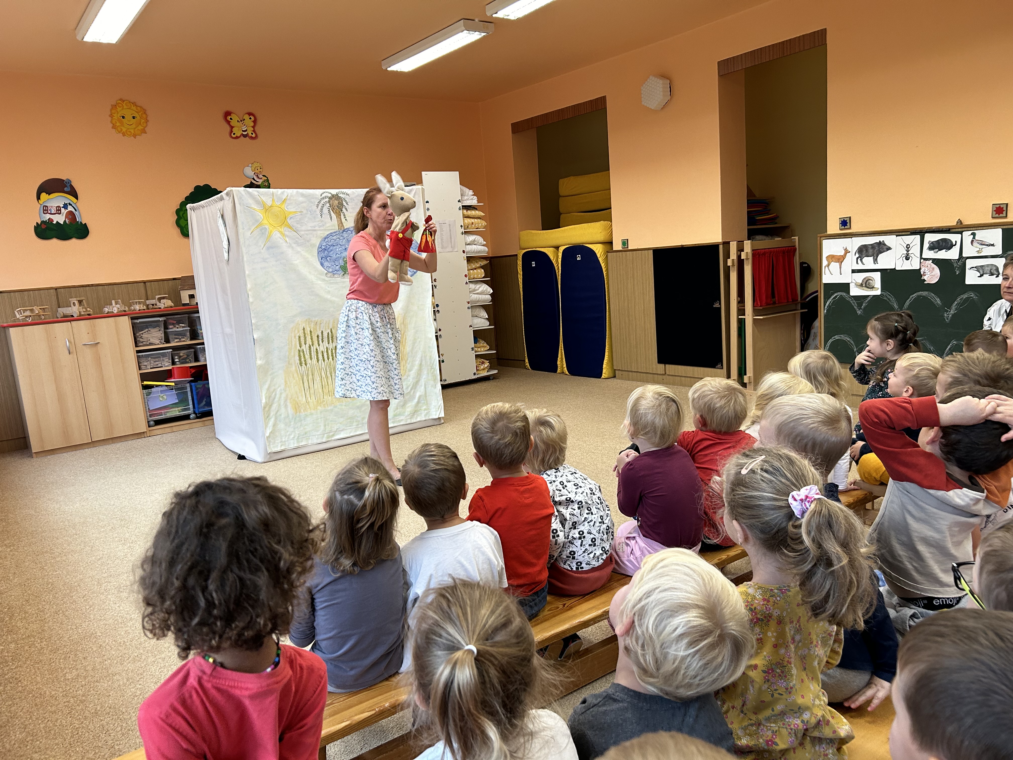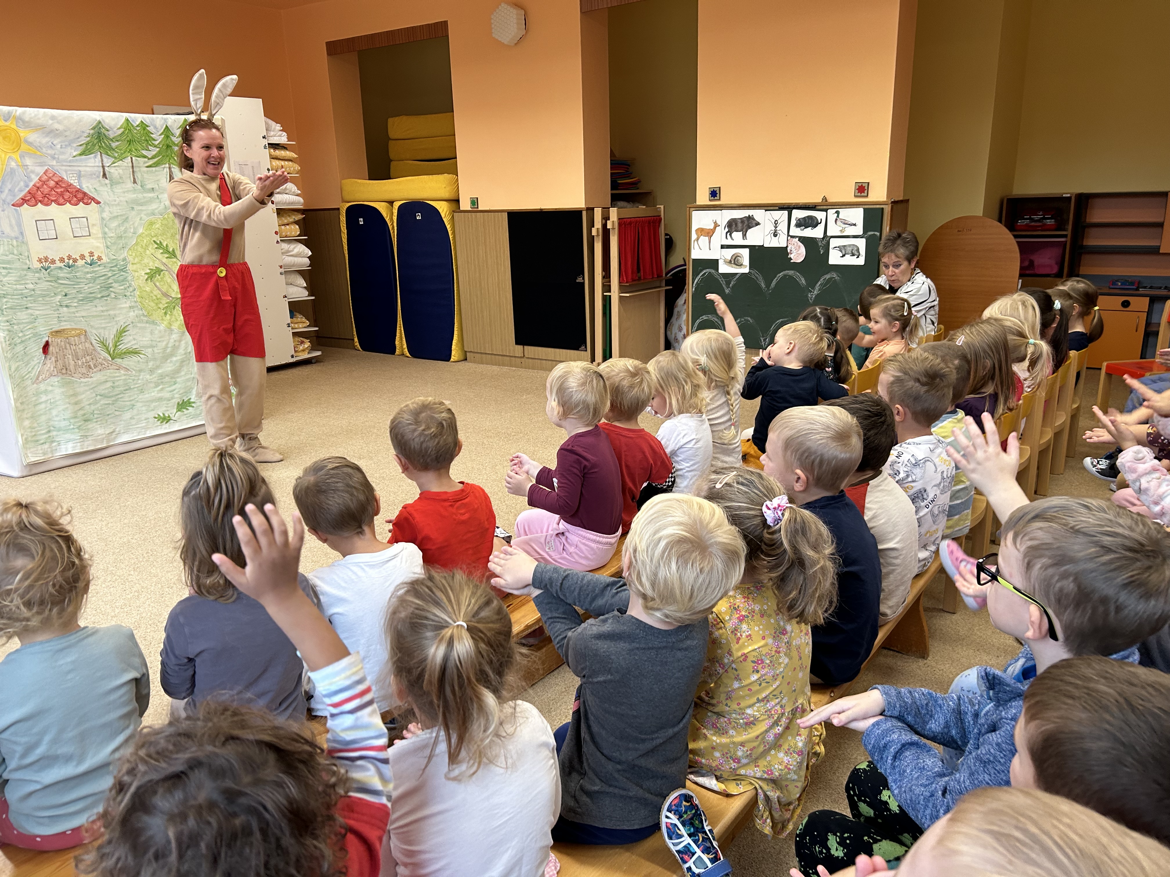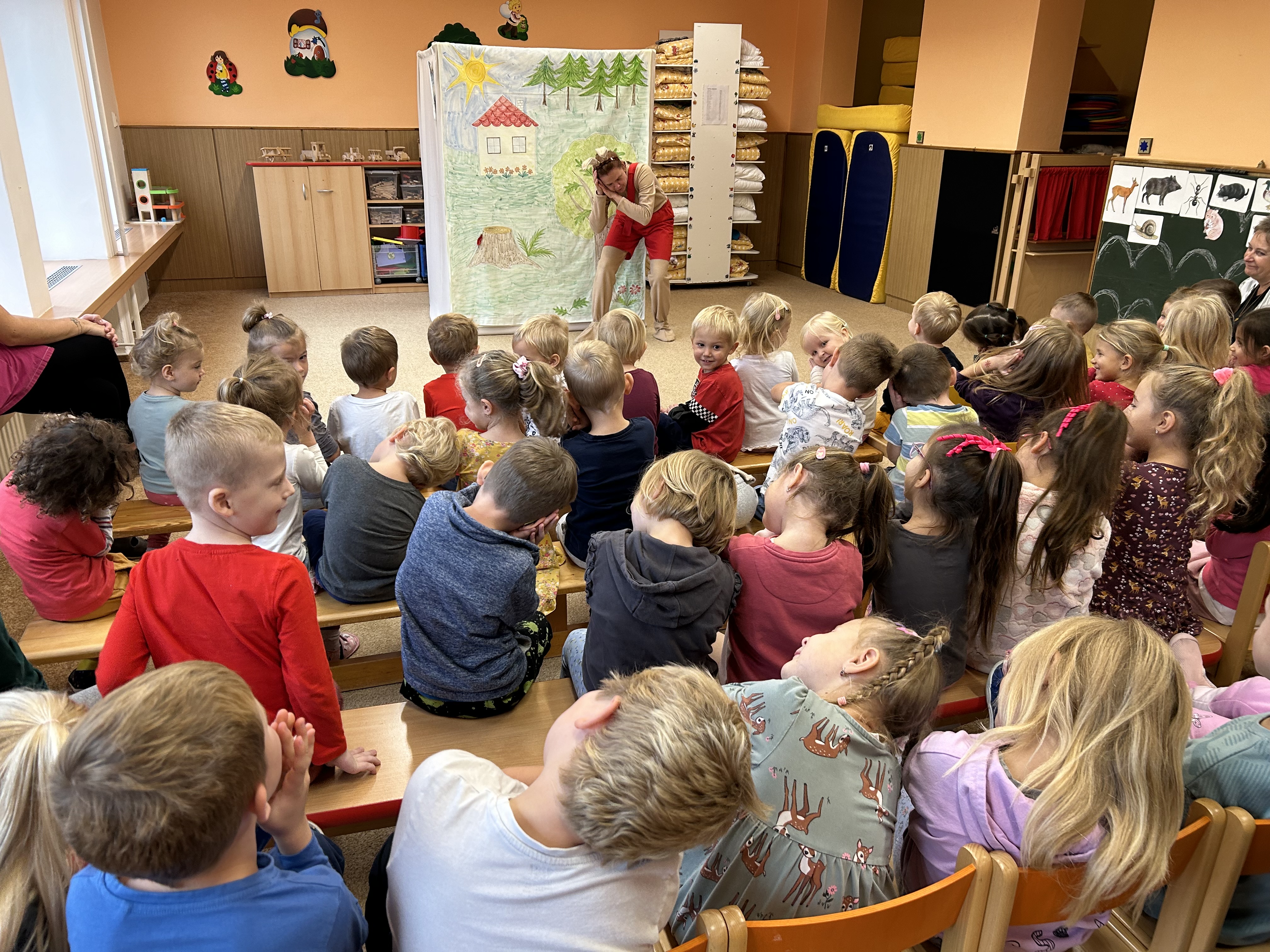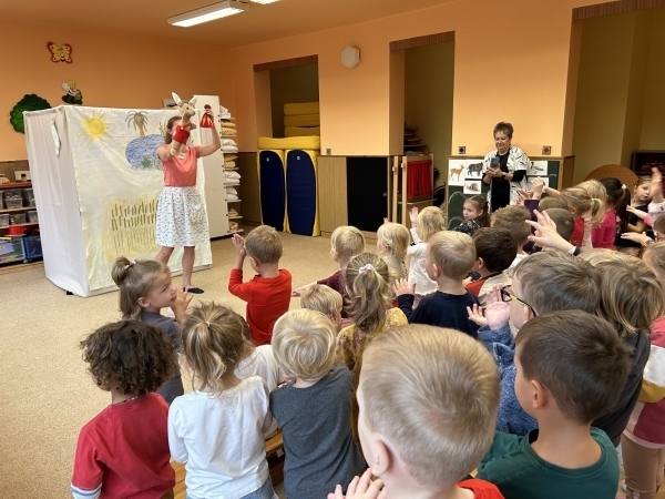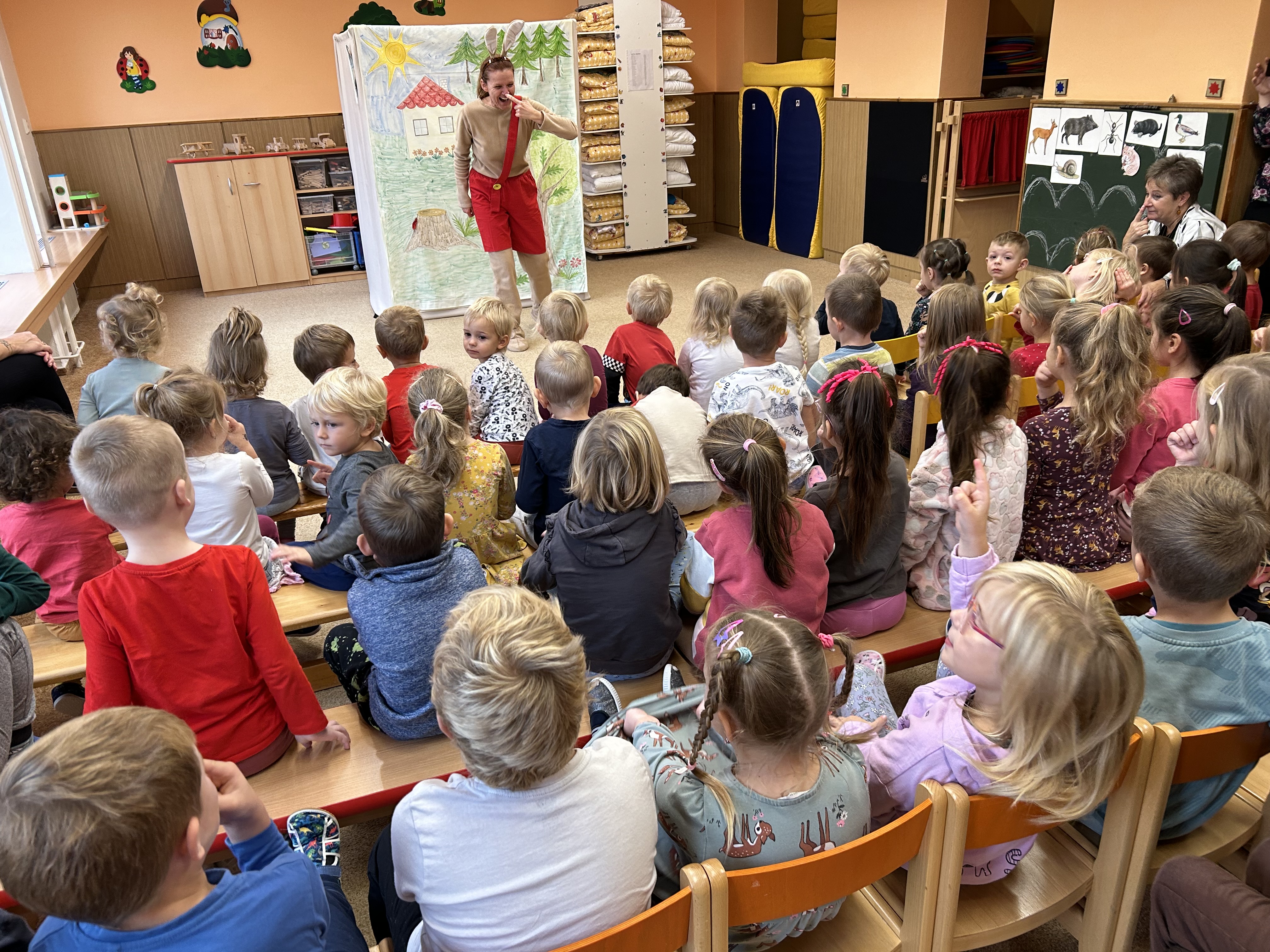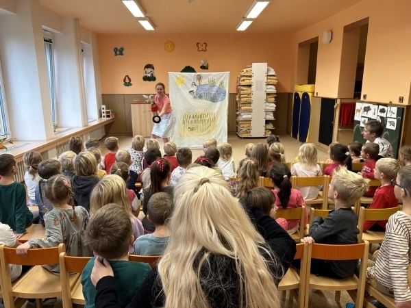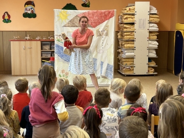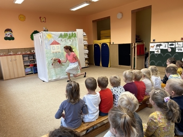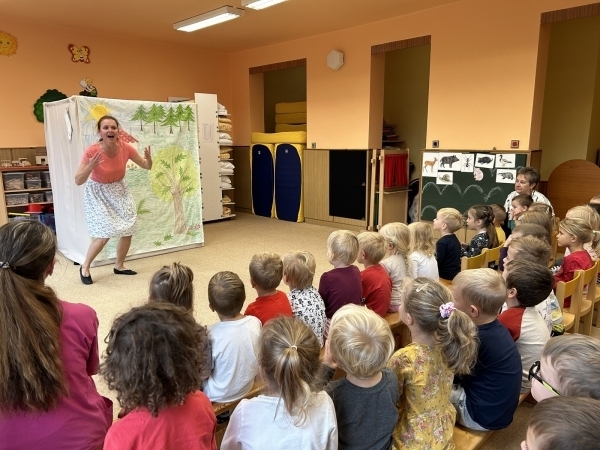Ve středu jsme měli ve školce návštěvu - přijelo k nám divadélko s naučnou pohádkou Jak Karlík zachránil babičku. Hlavní postavou byl králík Karlík, který nám povykládal pěkný příběh, naučil nás krásné písničky a my jsme mu poradili kouzelné slovíčko "prosím”. Hezky nám tak zpestřil zamračený den.