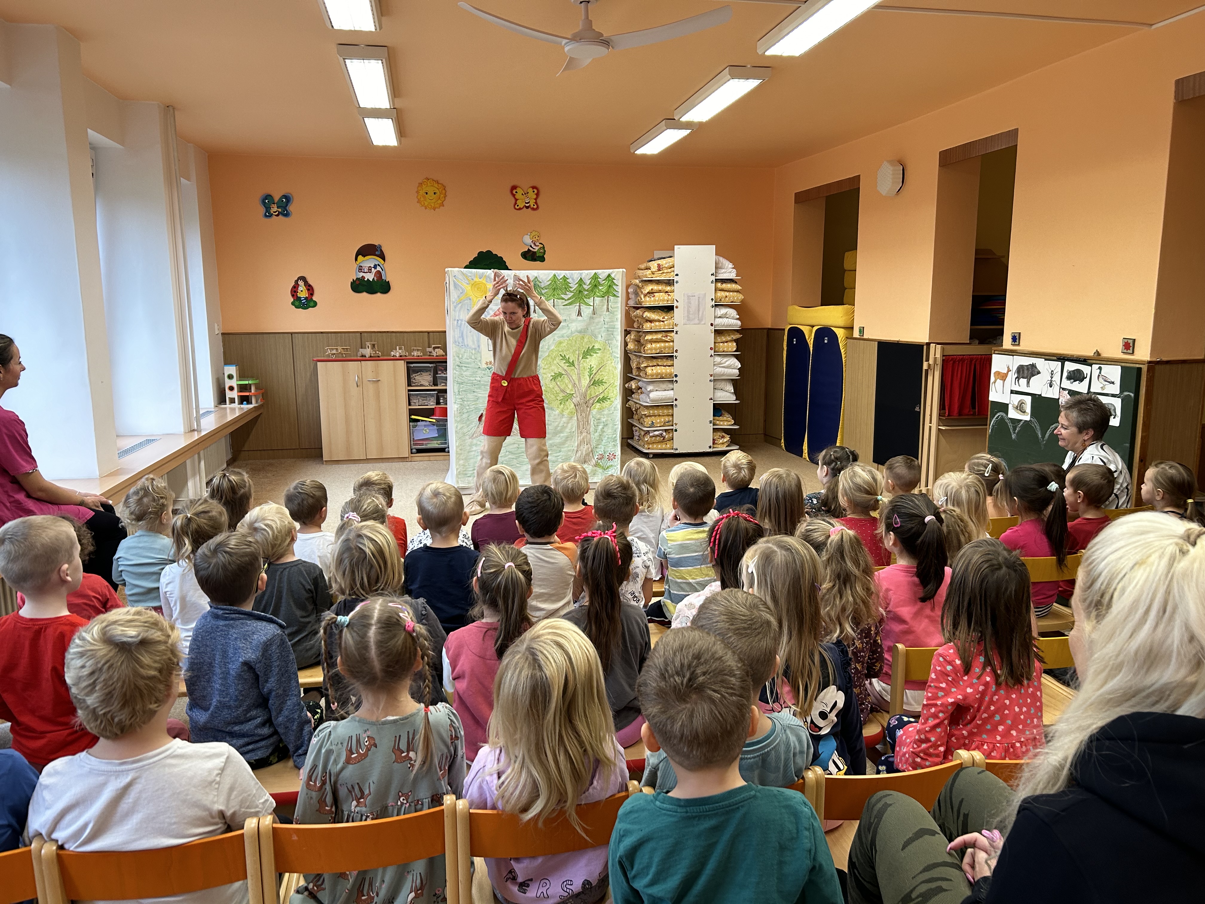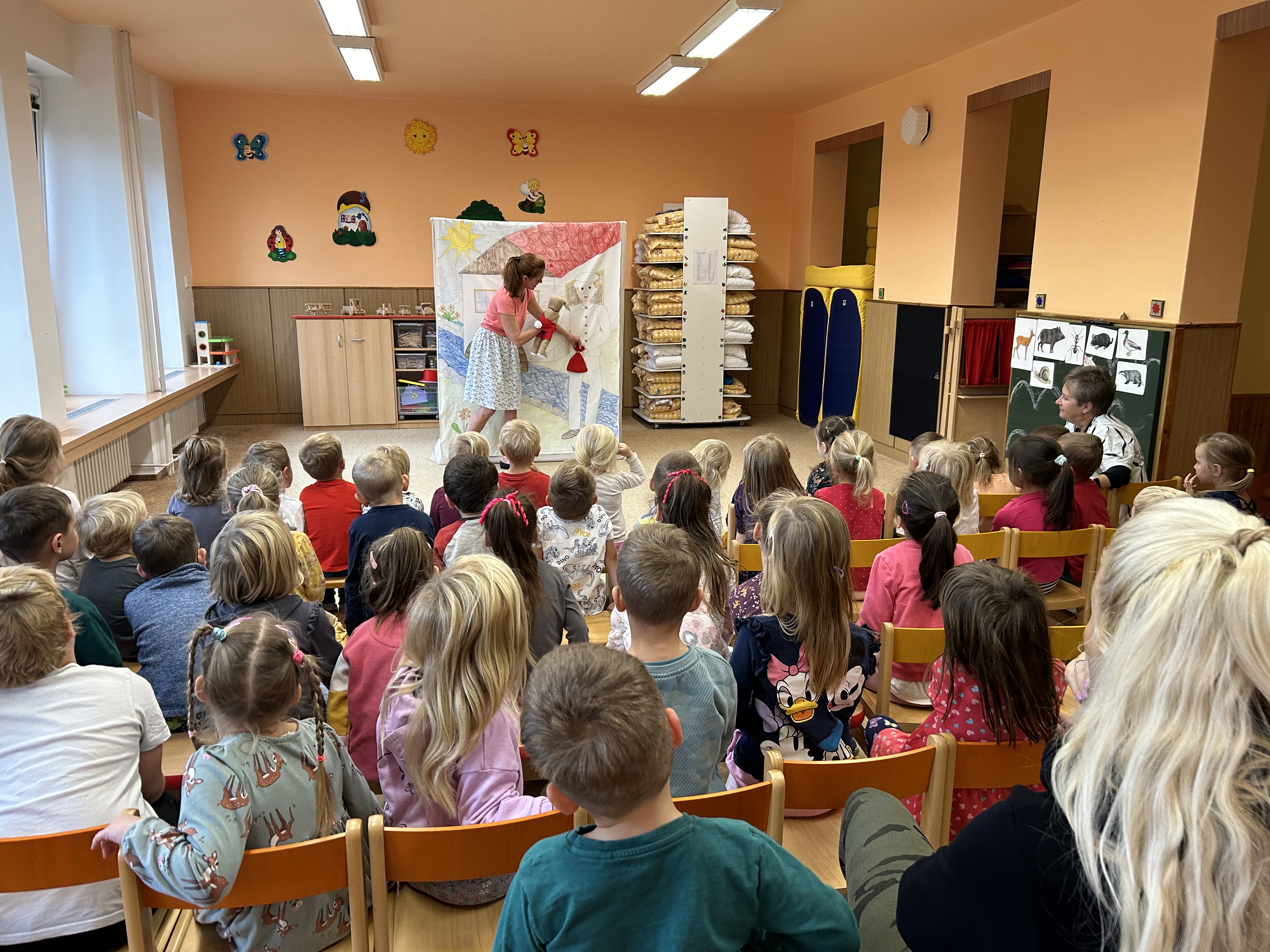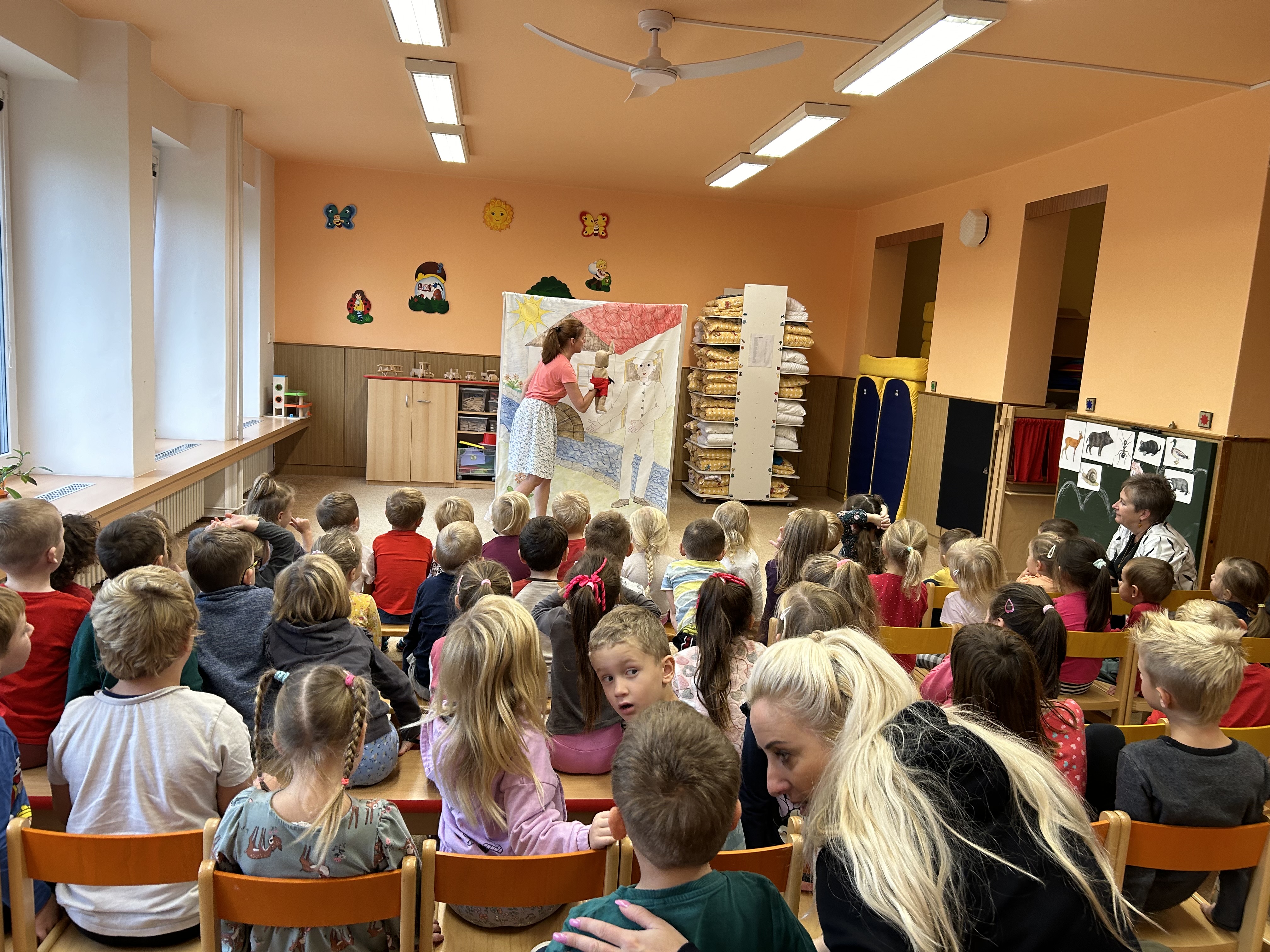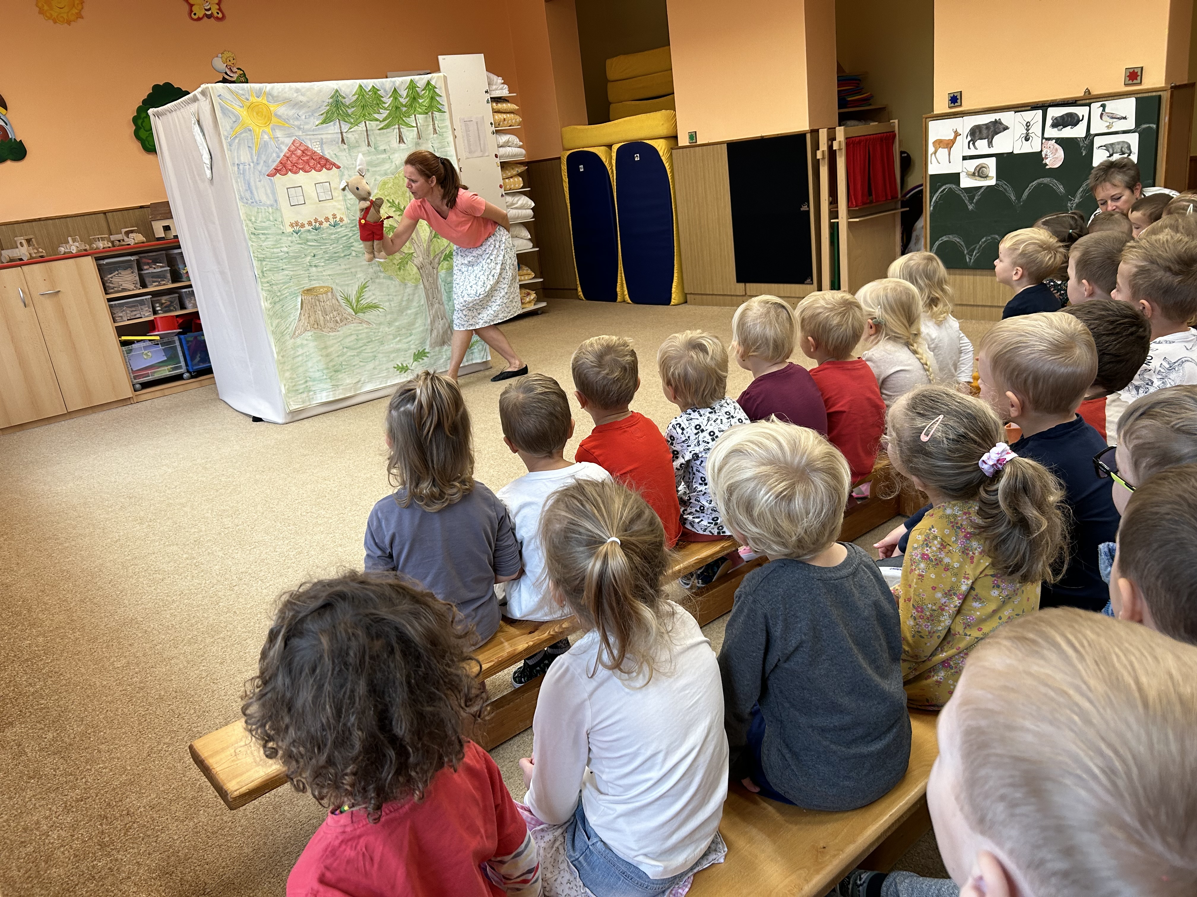 Ve středu jsme měli ve školce návštěvu - přijelo k nám divadélko s naučnou pohádkou Jak Karlík zachránil babičku. Hlavní postavou byl králík Karlík, který nám povykládal pěkný příběh, naučil nás krásné písničky a my jsme mu poradili kouzelné slovíčko "prosím”. Hezky nám tak zpestřil zamračený den.