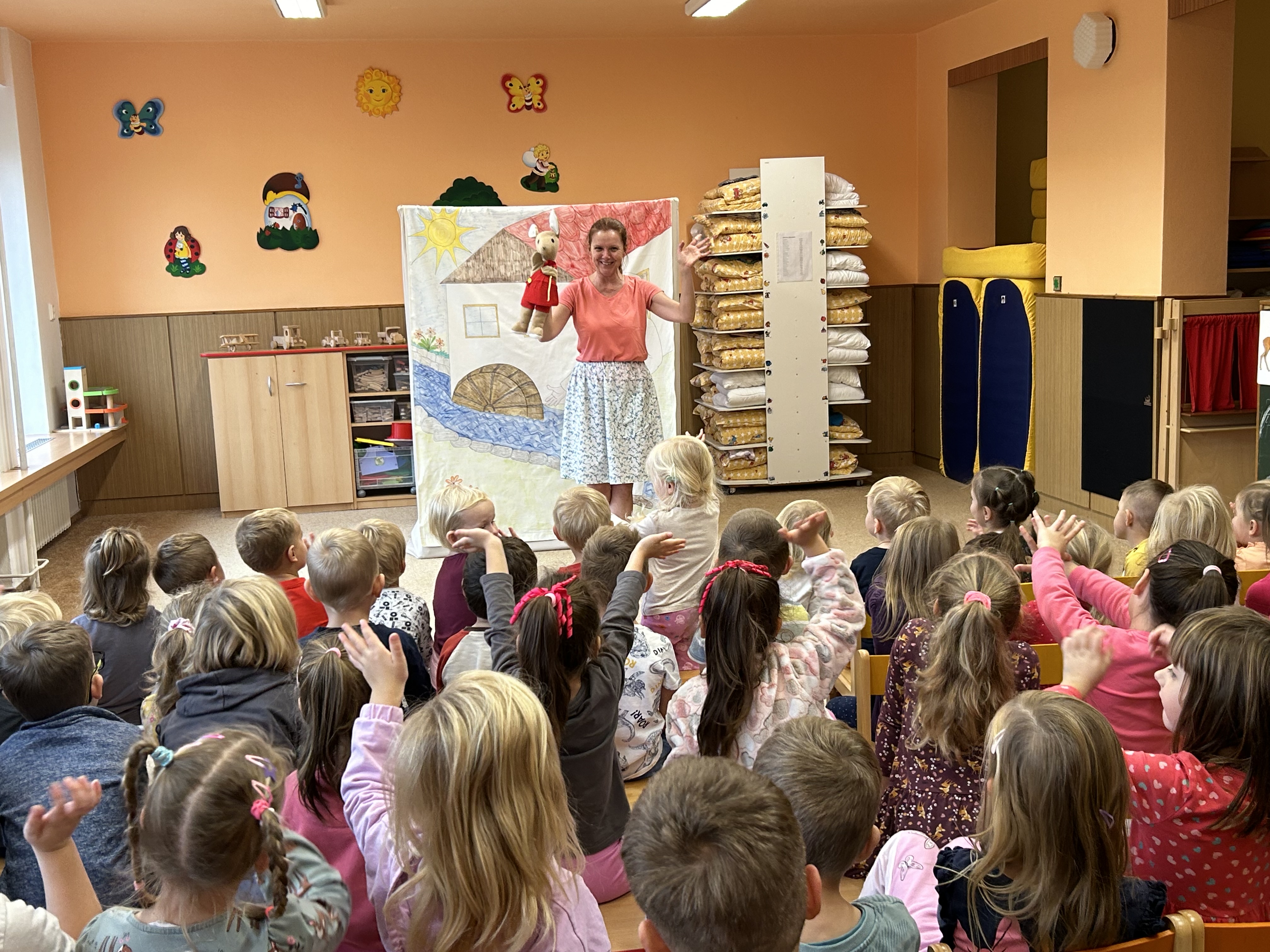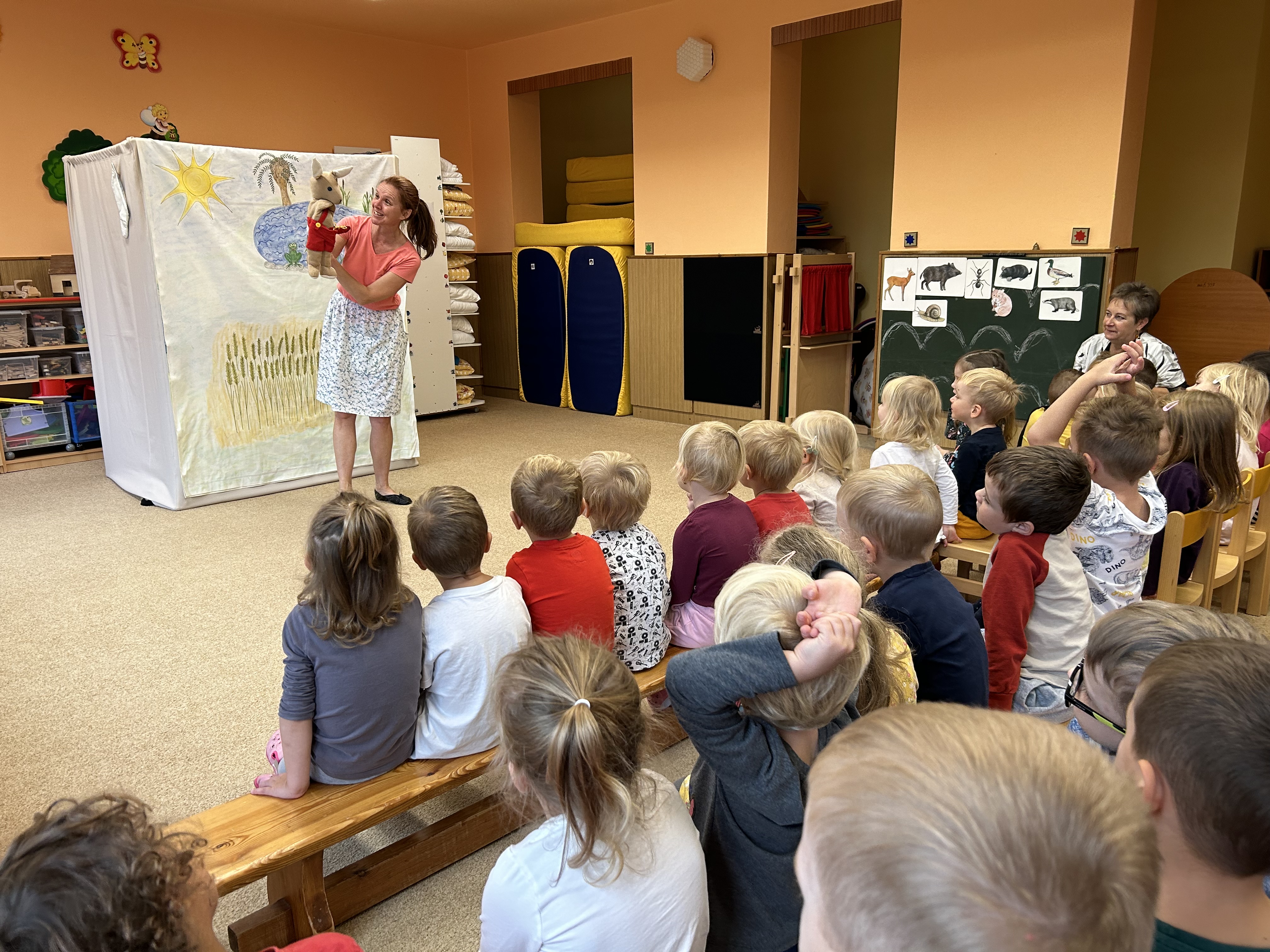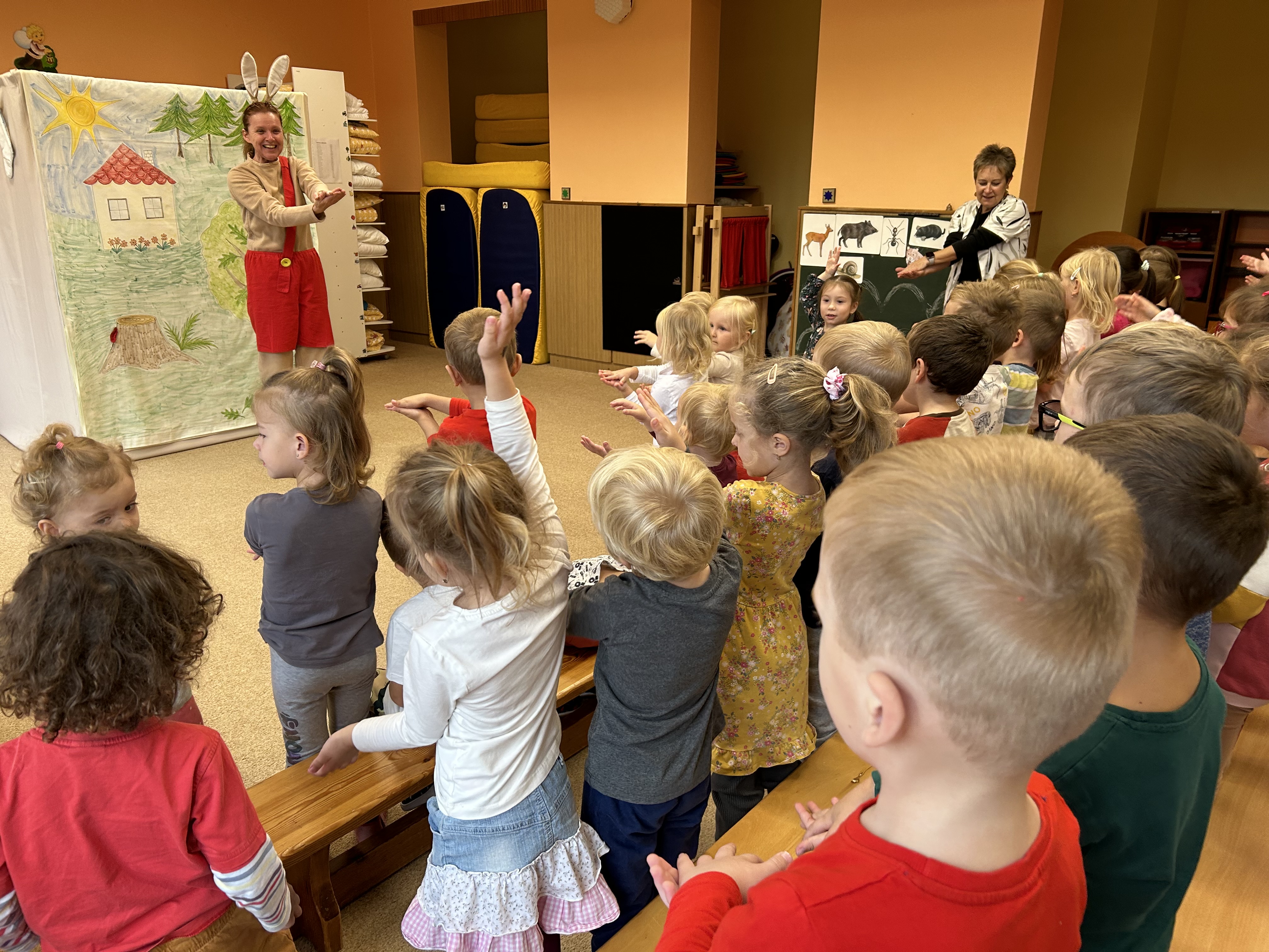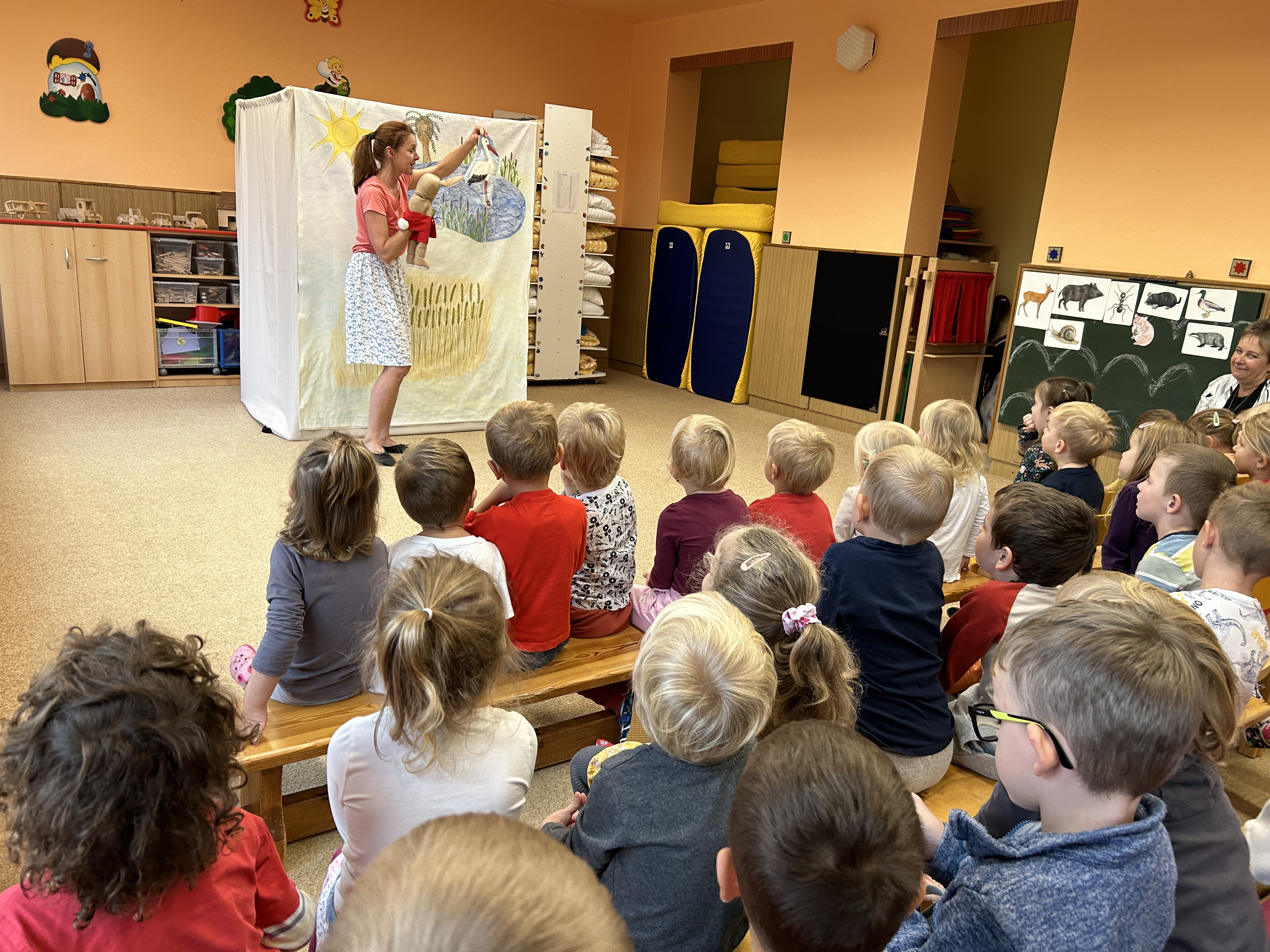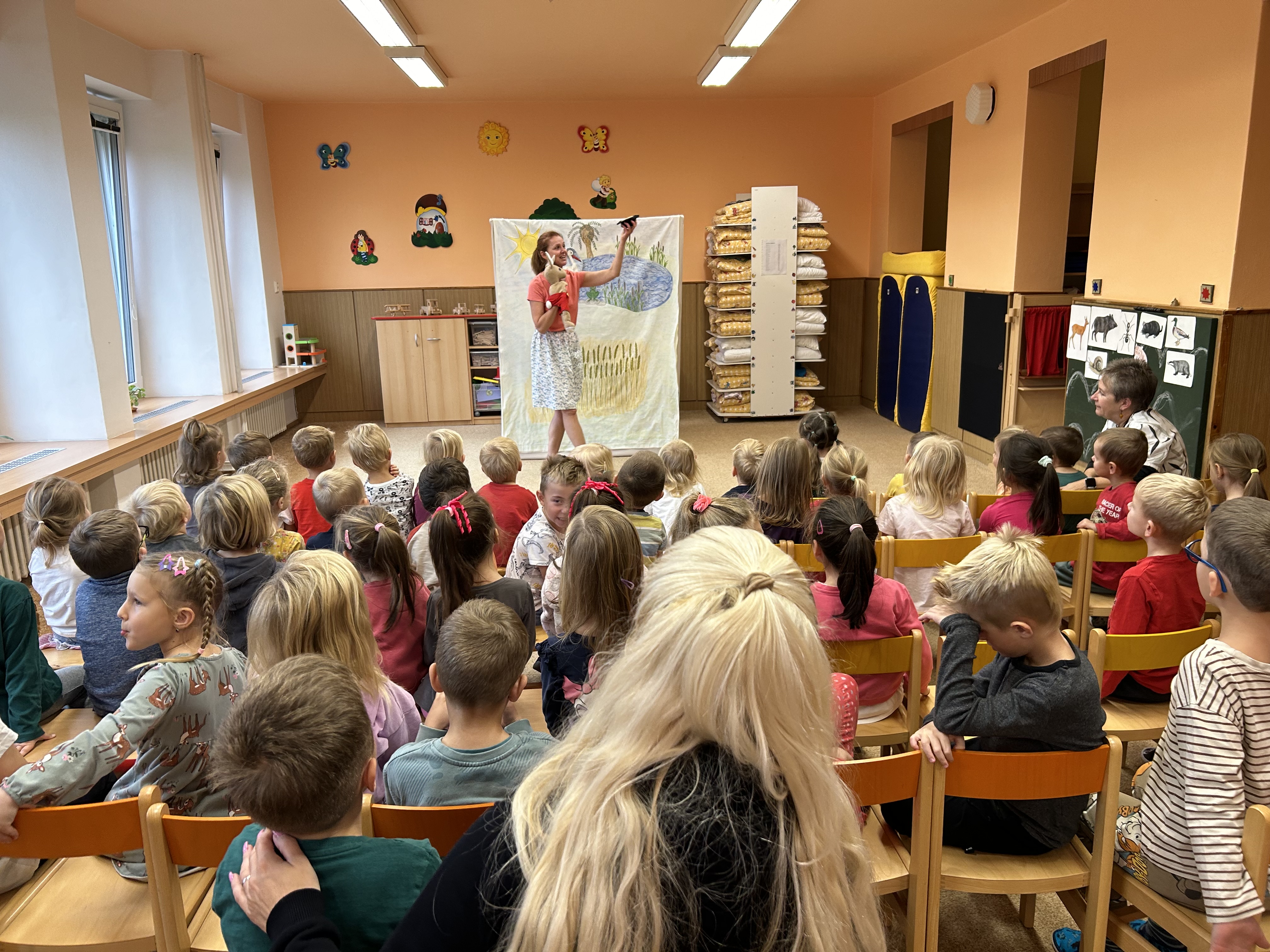Ve středu jsme měli ve školce návštěvu - přijelo k nám divadélko s naučnou pohádkou Jak Karlík zachránil babičku. Hlavní postavou byl králík Karlík, který nám povykládal pěkný příběh, naučil nás krásné písničky a my jsme mu poradili kouzelné slovíčko "prosím”. Hezky nám tak zpestřil zamračený den.