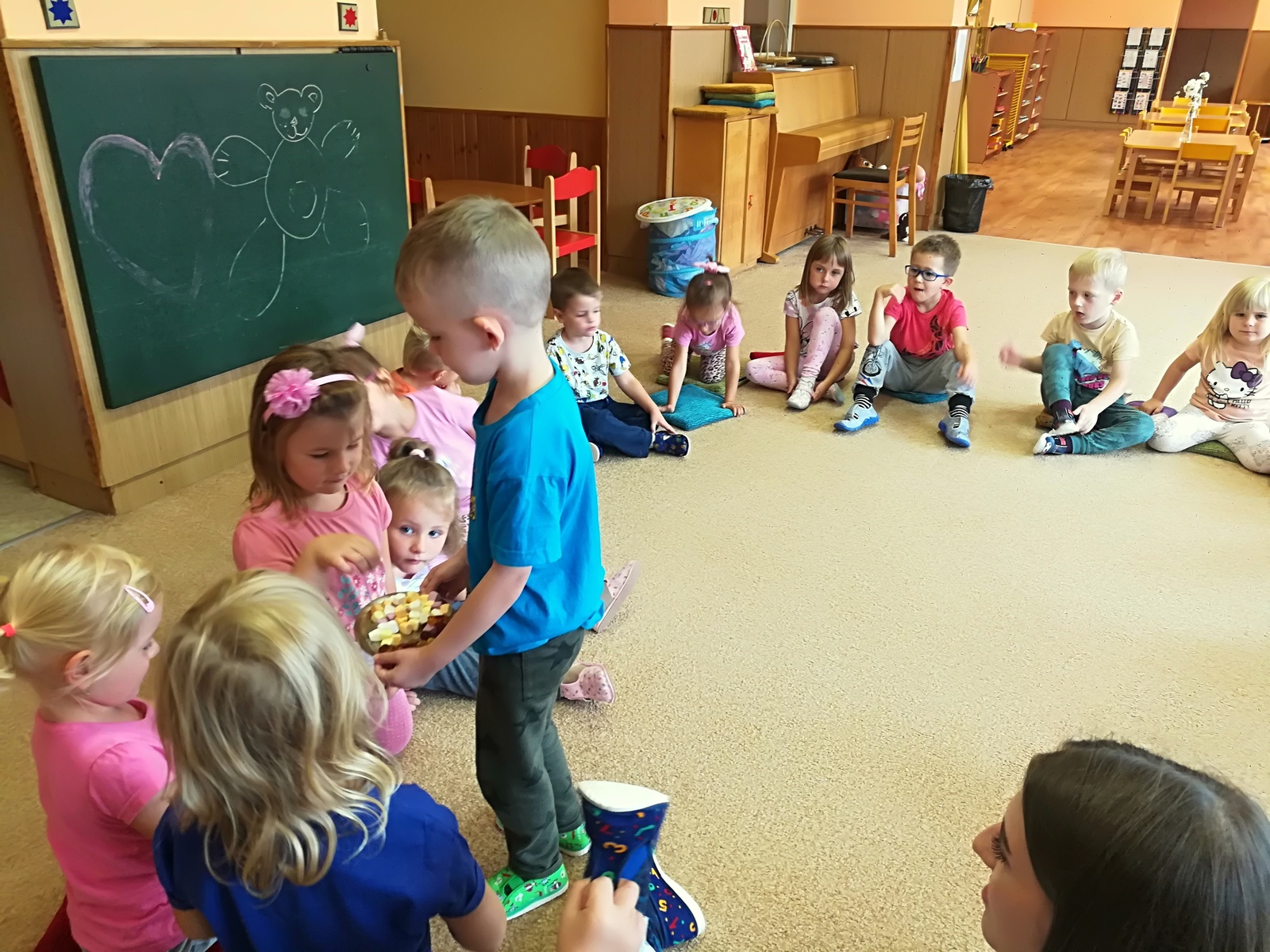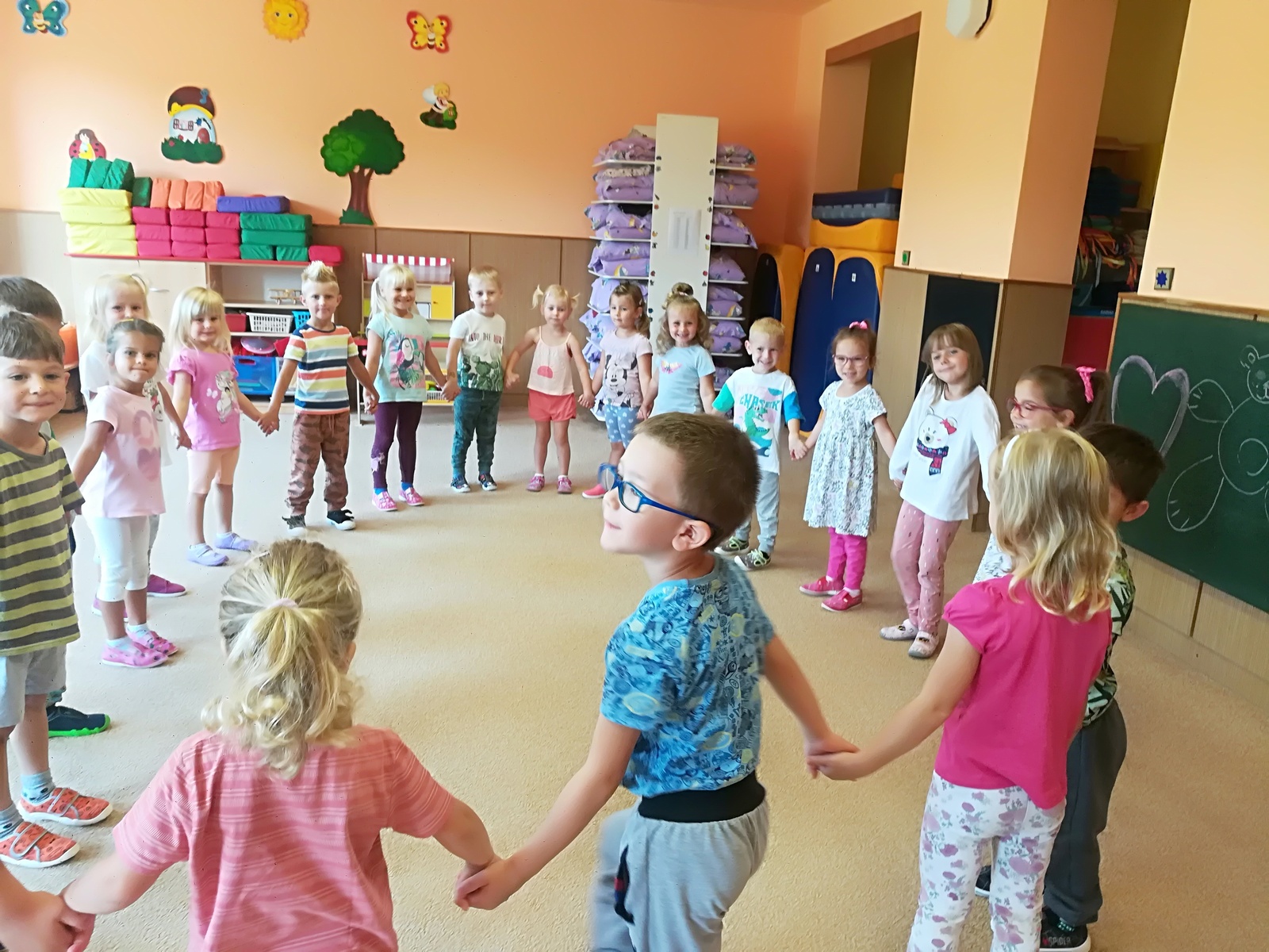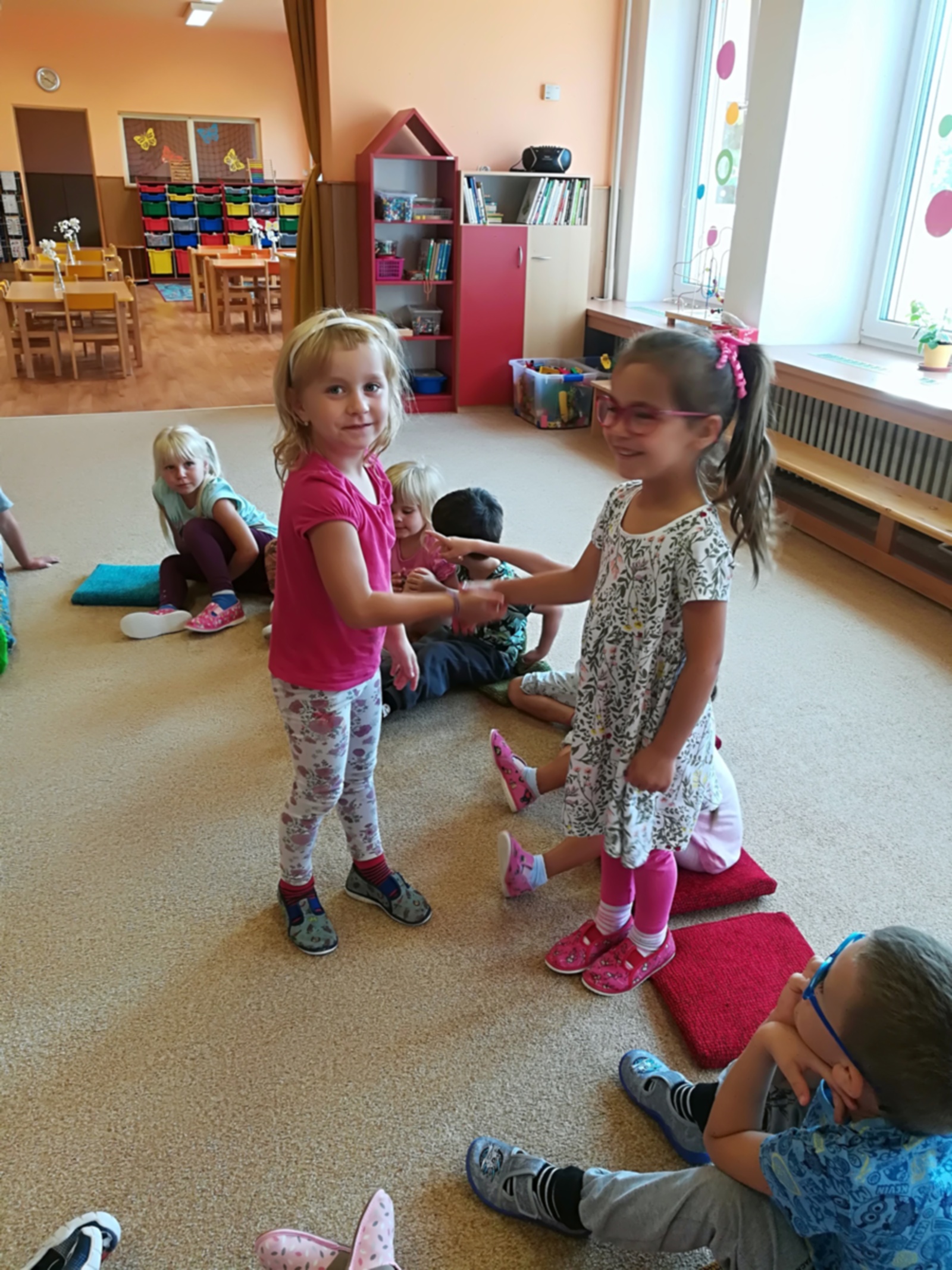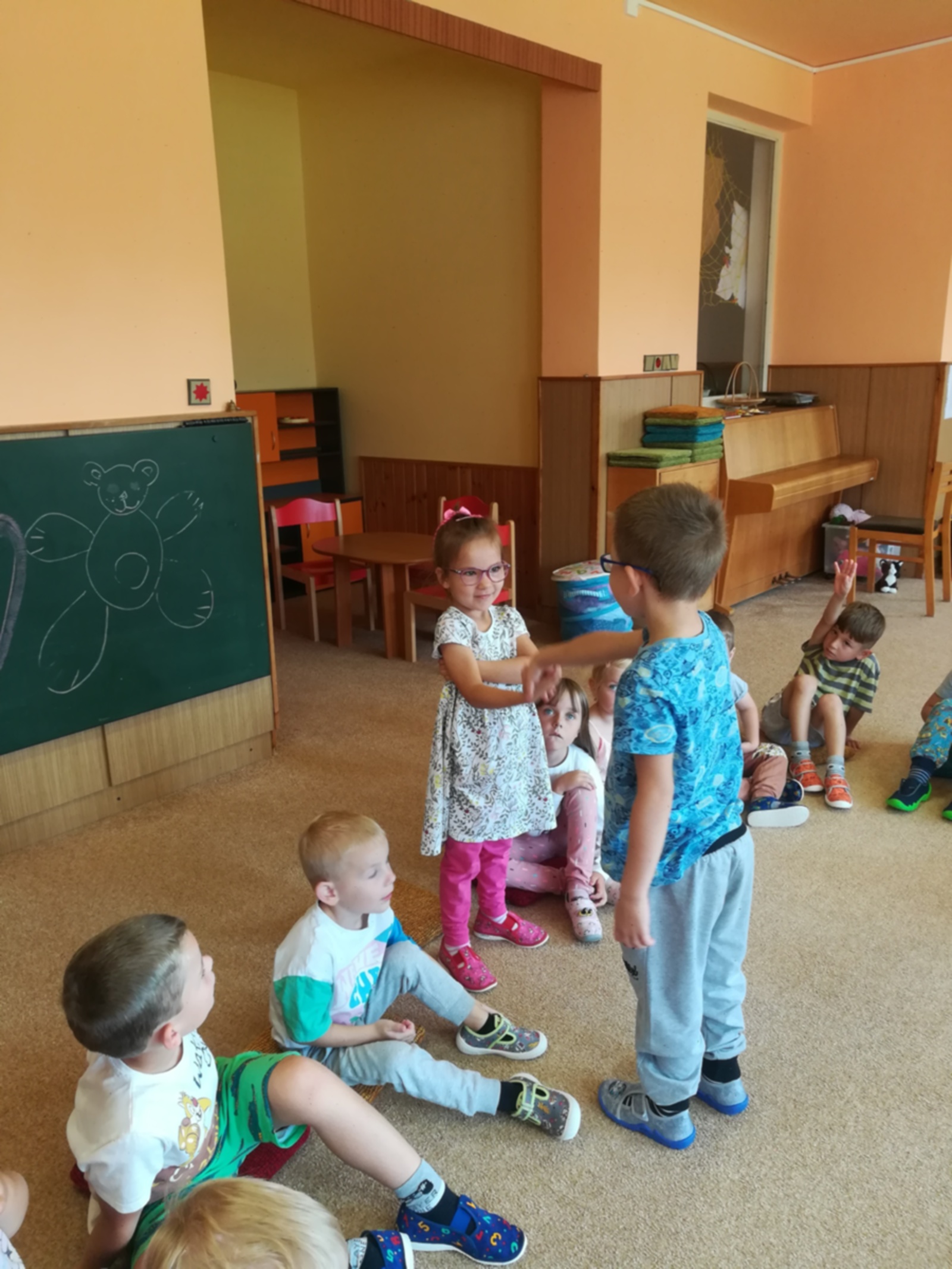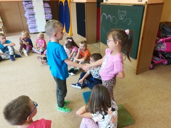 V týdnu nazvaném Kamarádi Motýlci jsme upevňovali přátelské vztahy mezi dětmi a znalost jména kamarádů při spontánních i řízených hrách, při pobytu venku, hráli jsme pohybové hry v kruhu s držením za ruce, posílali klubíčko od kamaráda ke kamarádovi- "pavučinka přátelství", barvičkami malovali motýlka, vystřihli ho podle čáry, říkali jsme si "Motýlí" básničku a zpívali písničku o tom, že jsme kamarádi a máme se rádi. Oslavili jsme narozeniny Adélky, Elišky, Timejky a Péti. V pátek jsme zkusili dokreslením detailů obličeje a vybarvením předtištěné postavičky vyjádřit "jak se cítím ve školce".