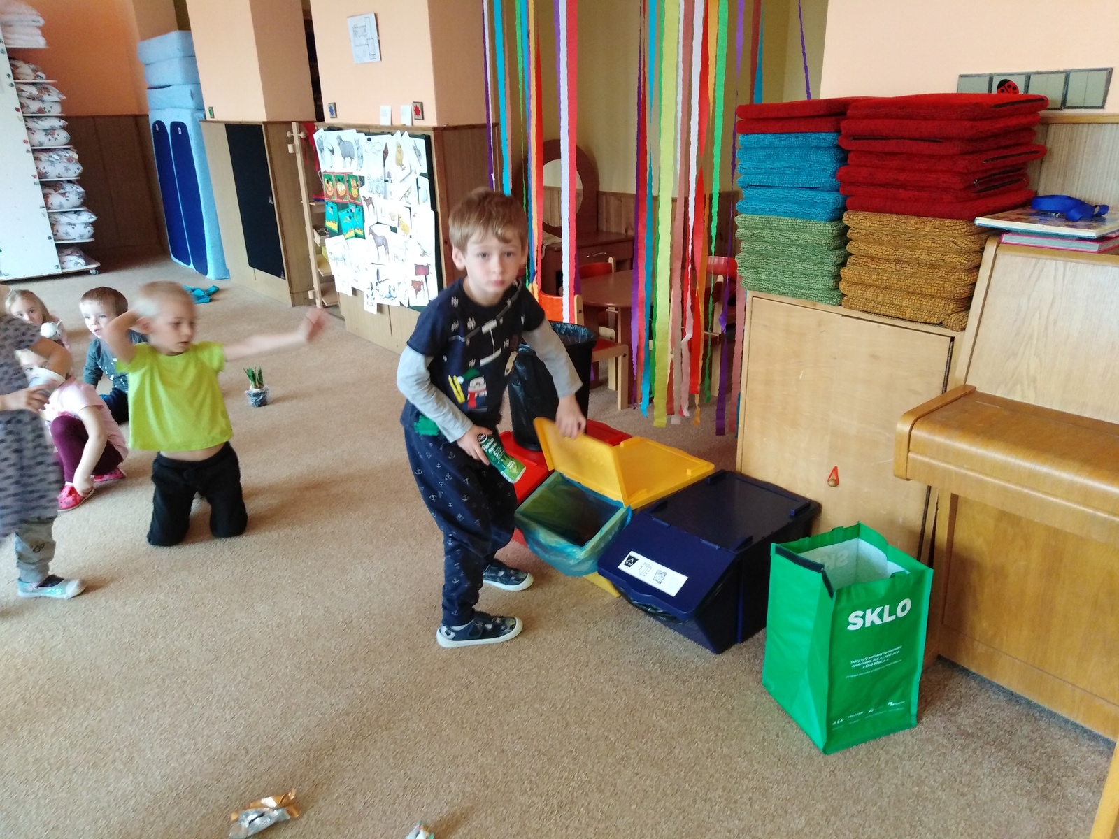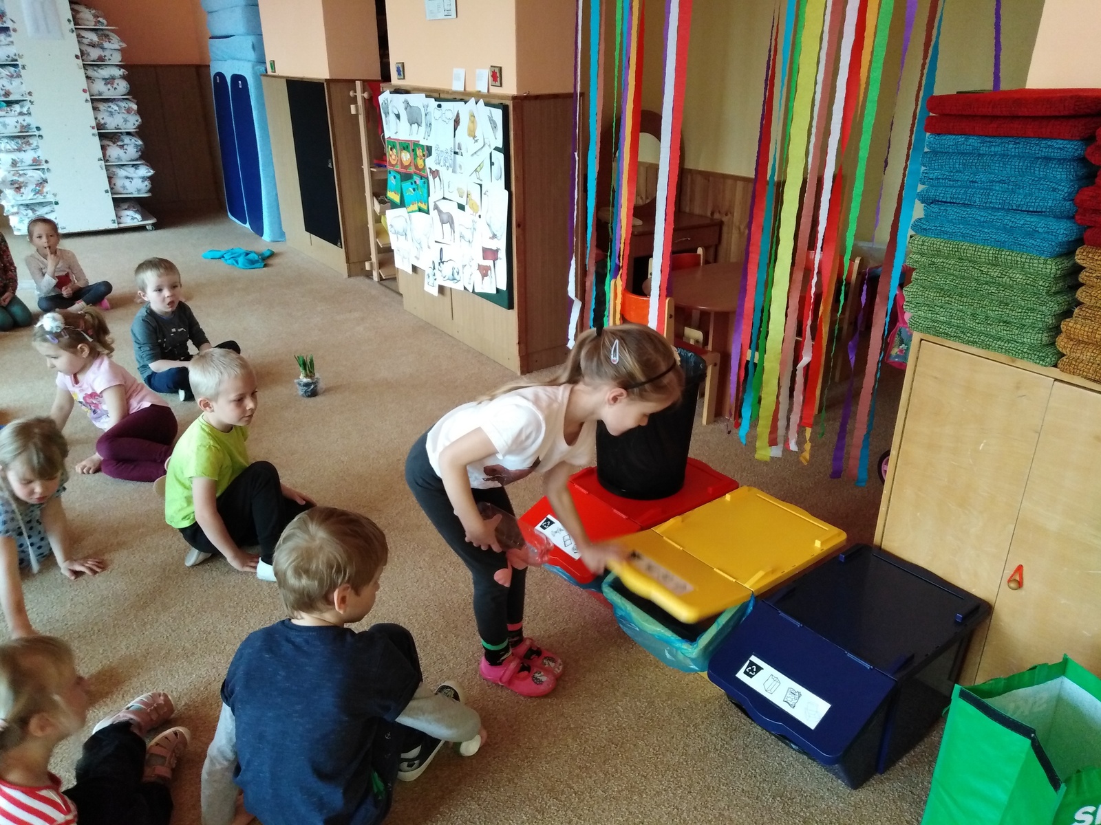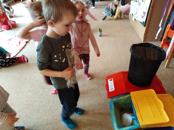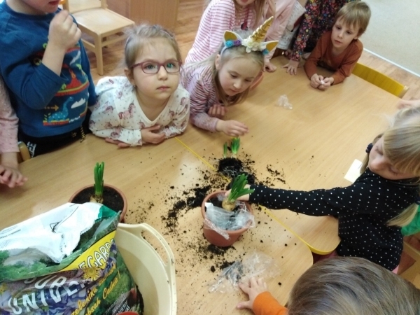 Prostřednictvím environmentální výchovy v tomto týdnu byly děti vedeny k poznávání přírody, k objevování, experimentování. Aby se děti něco o tomto tématu dozvěděly a zapamatovaly si to, realizovali jsme pokusy a experimenty jako "semínko", "příroda" a "znečištěný les". Děti pozorovaly růst květin v rozdílných podmínkách. Zasadily semínko jako malí zahradníčci a budou se o rostlinku starat až do její dospělosti, kdy za jejich snahu a píli budou na konci odměněny jejími plody. Jako ochránci přírody procvičily třídění odpadu do správných kontejnerů. Hledaly odpovědi na otázky: Odkud se rostliny berou? Jak o ně pečovat? K čemu se dají různé plodiny využít? Co rostlinám škodí a co prospívá? Děti si také trénovaly uvolnění ramenního, loketního a zápěstního kloubu. Grafickým záznamem kreslily sluníčko a jarní travičku. Krásně namalovaly vývojová stádia růstu zvolené rostlinky. Vytvořily si květinku z hlíny. Zahrály si hudebně pohybovou hru "Uvijeme věneček" a tělíčko si protáhly u cvičení motivovaného jarní přírodou.