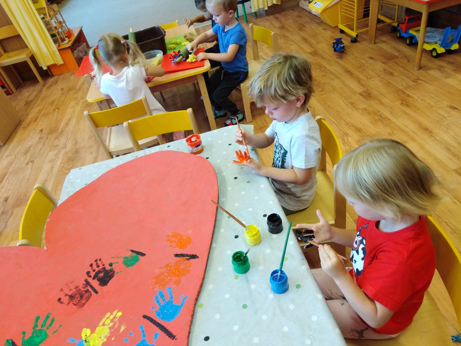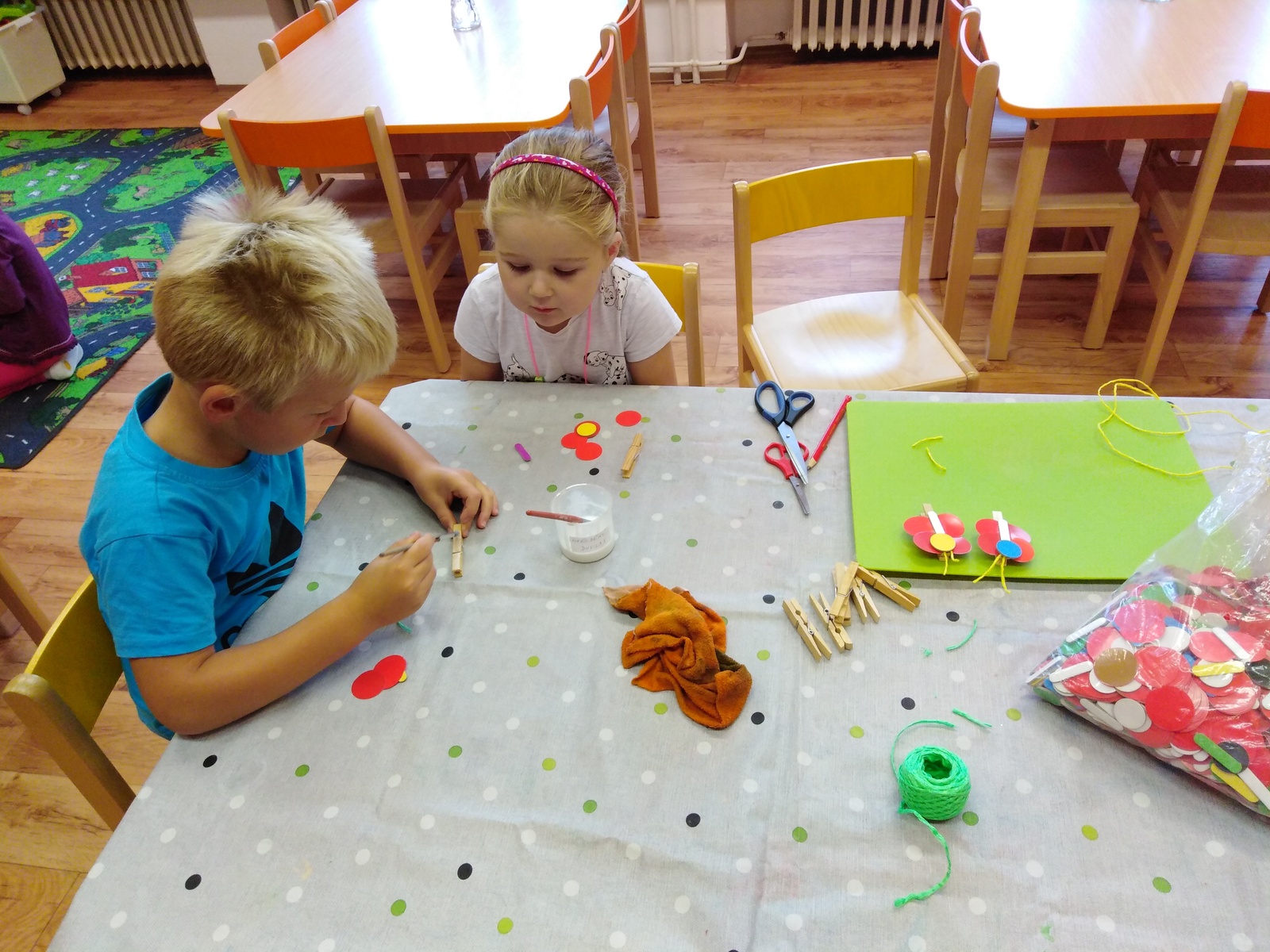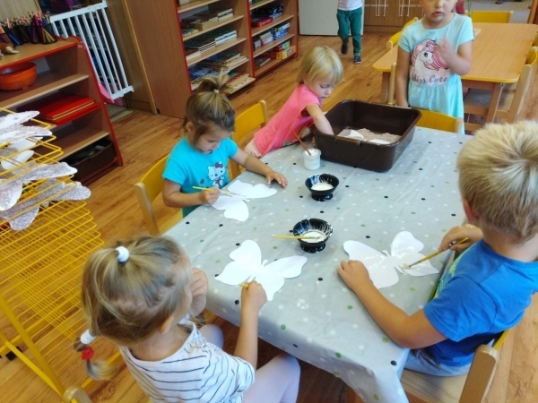 Týden s názvem Moje školička byl naplněn kamarádstvím, vstřícností, ohleduplností a vzájemnou spoluprací. Děti poznávaly nové kamarády, pracovaly s lepidlem u tvoření motýlků, malovaly barvičkami svého kamaráda, procvičily si zručnost prstíků při tvoření z kinetického písku, seznámily se s novou básničkou Motýlek. Hezké chvíle si také společně užily venku na zahradě.