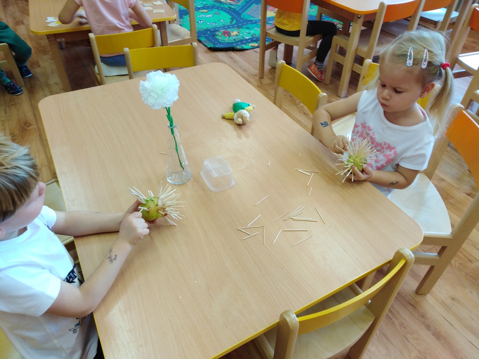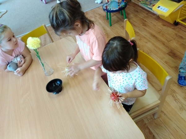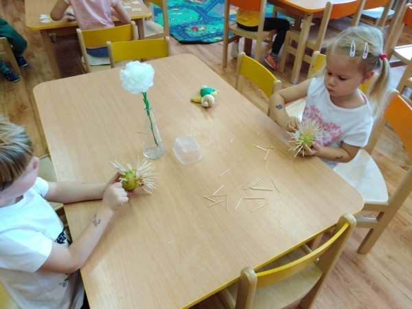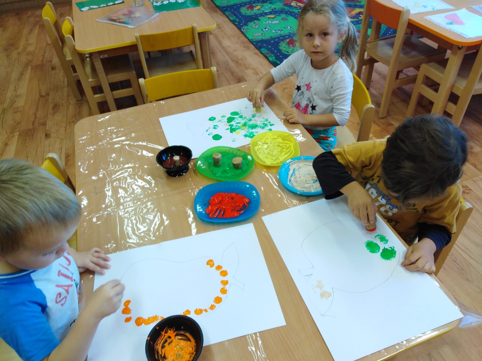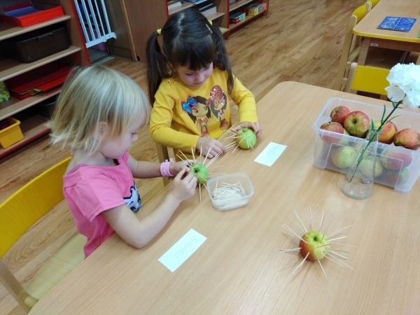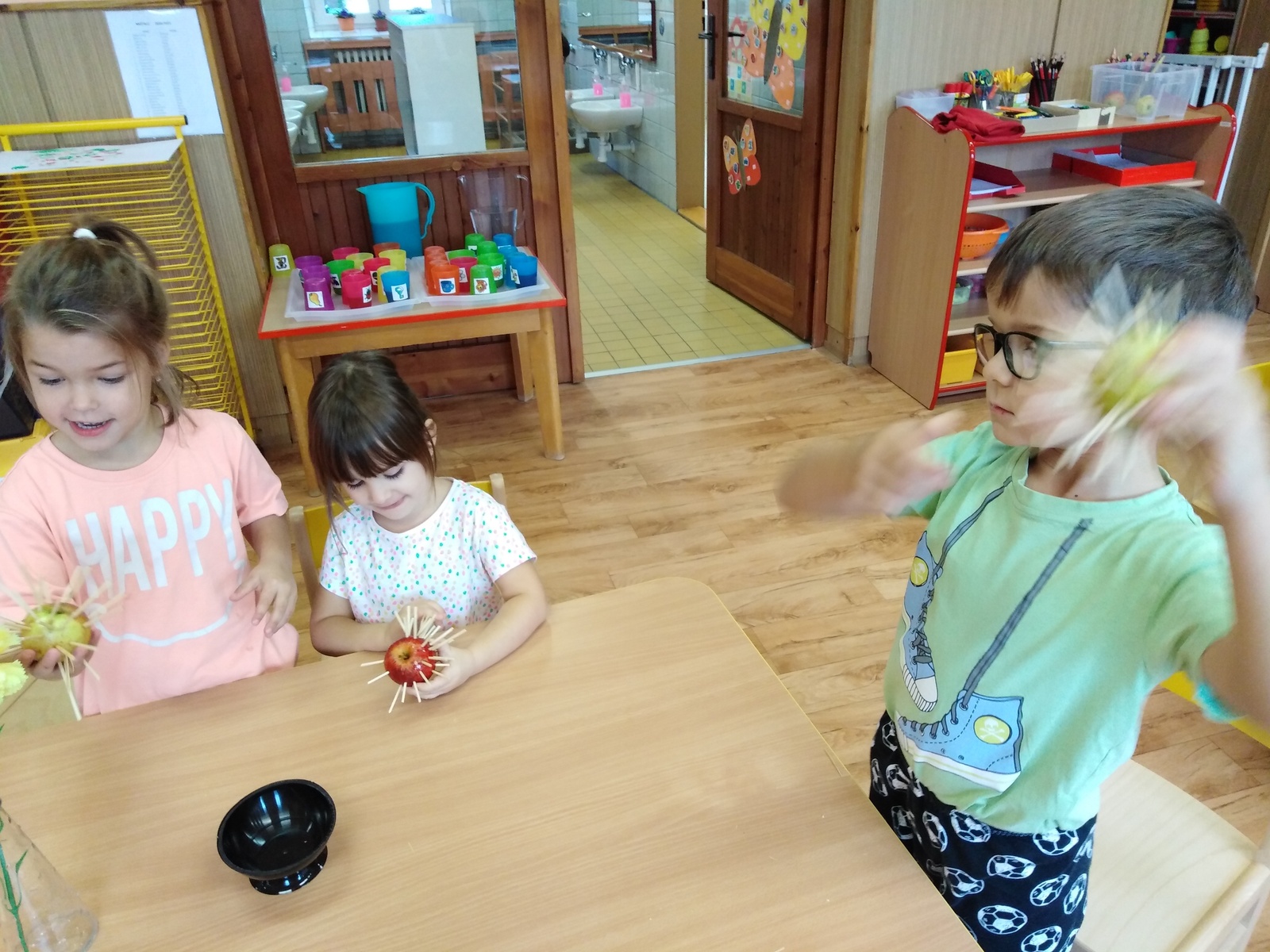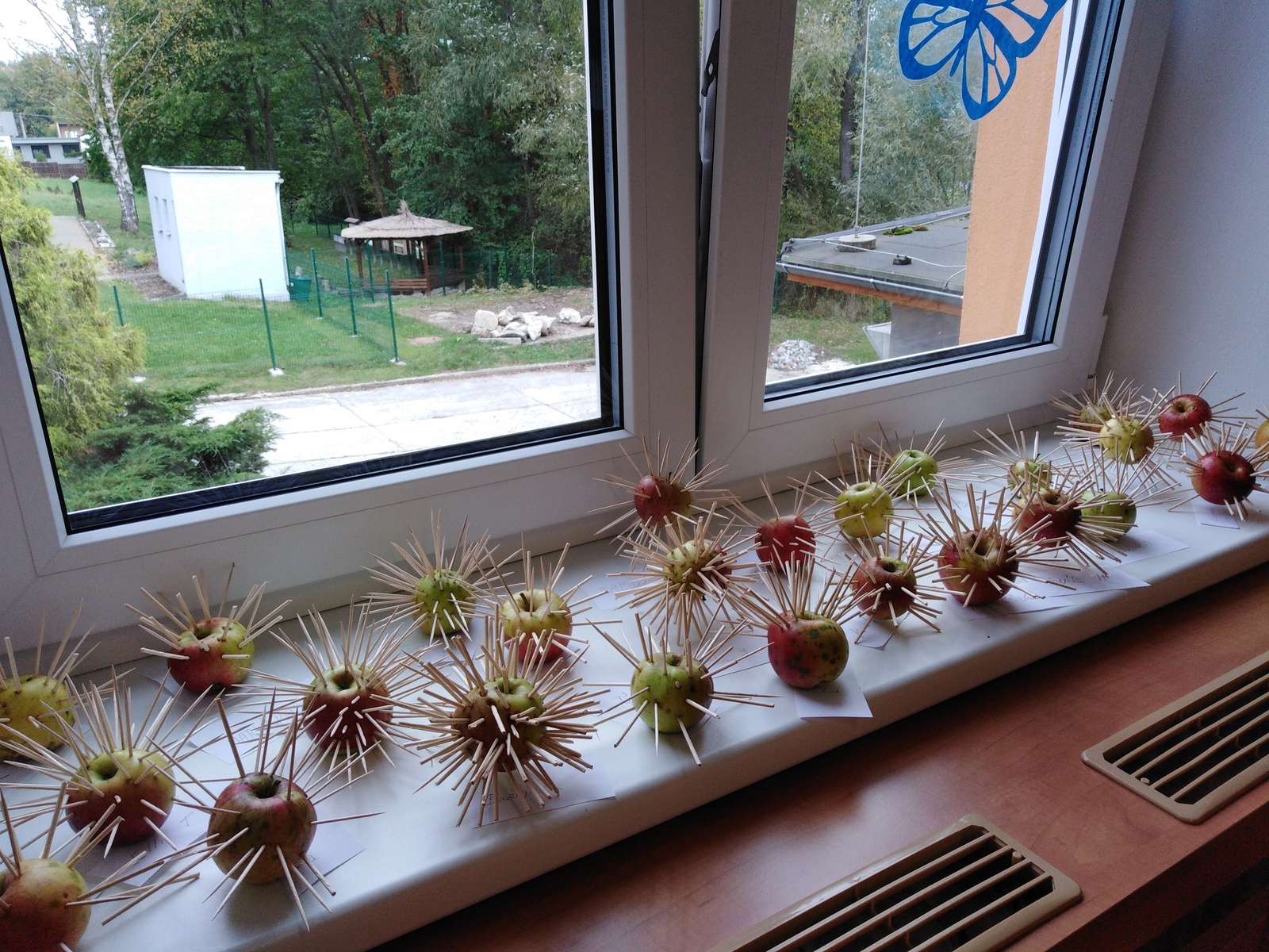 V týdnu pod názvem Kouzelný košíček se děti seznamovaly s vybranými plodinami z našich zahrádek. Děti si namalovaly své barevné ovoce. Vytvořily si ježečka z pohádkové knížky "Ježeček Dupálek". Seznámily se s novou podzimní básní "Houpy, hou" a zahrály si na prodavače ovoce a zeleniny. Využili jsme hezkého počasí a prohlédli jsme si zahrádky v okolí MŠ. Motýlci děkují rodičům za donesené příspěvky ovoce a zeleniny pro naši výstavku.