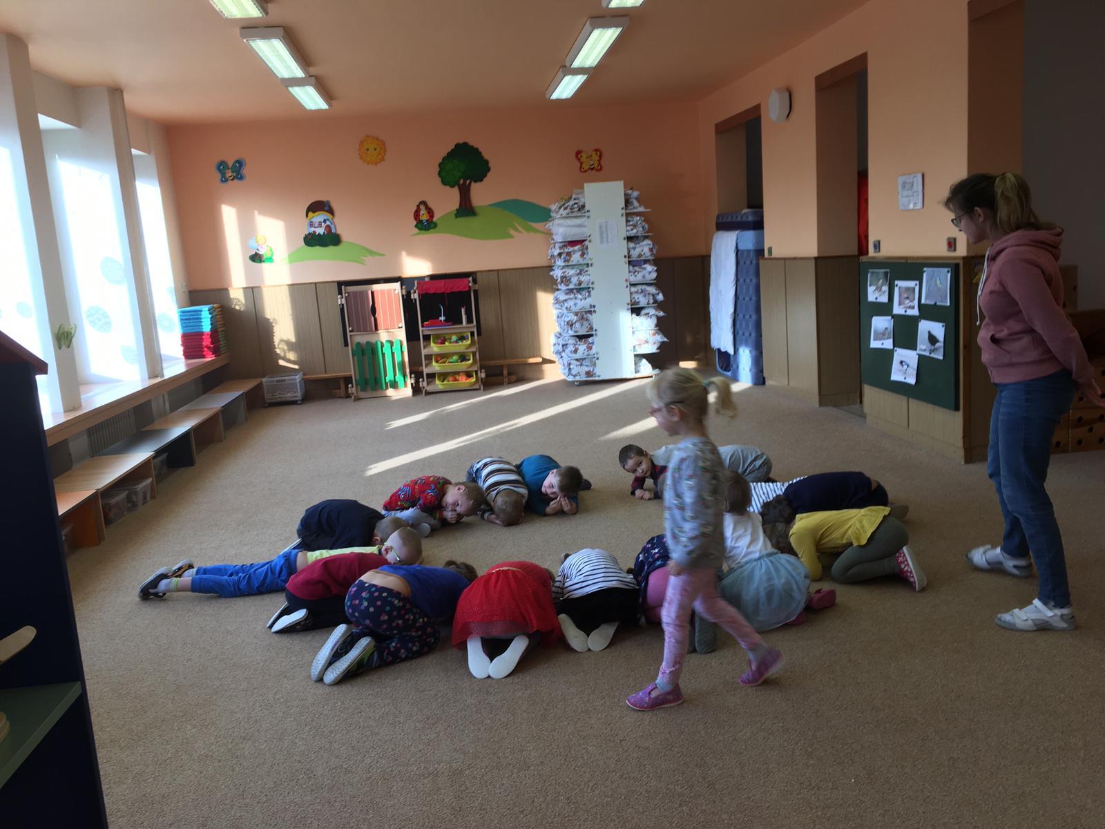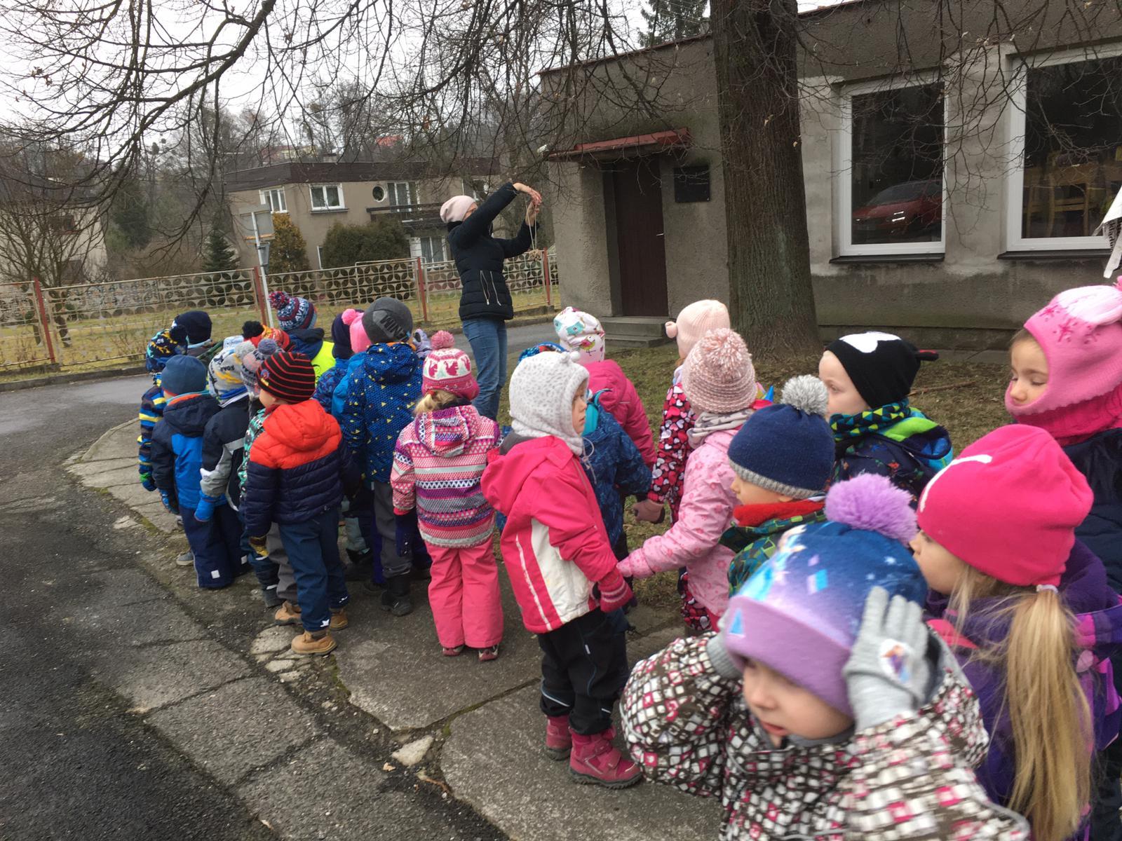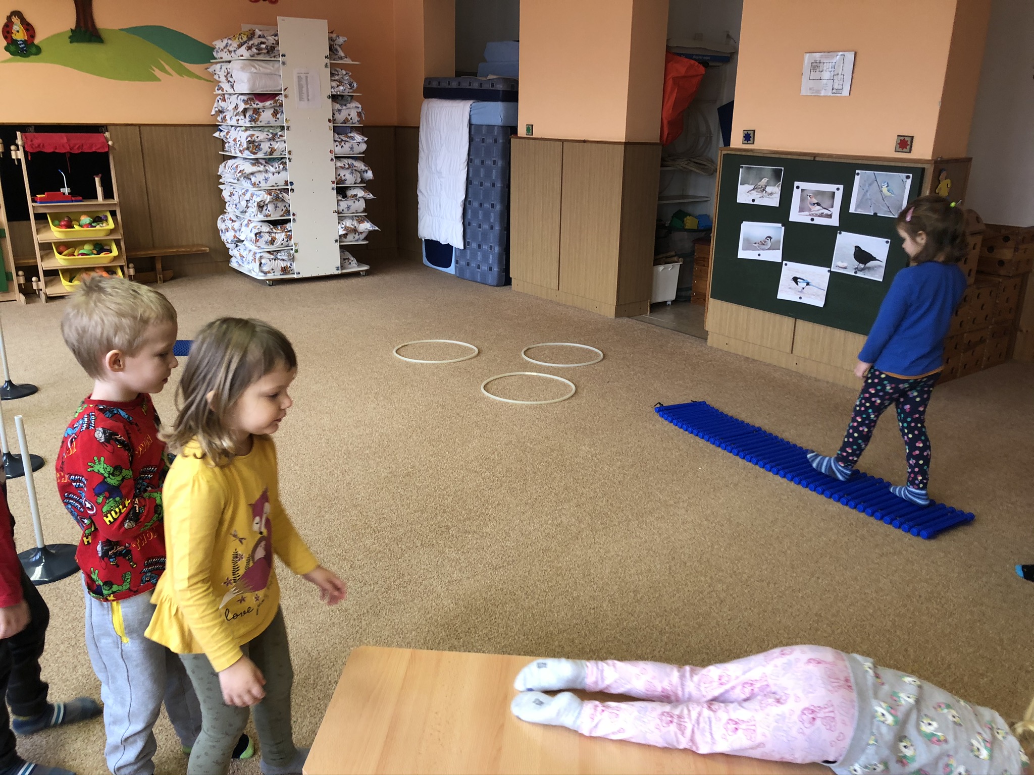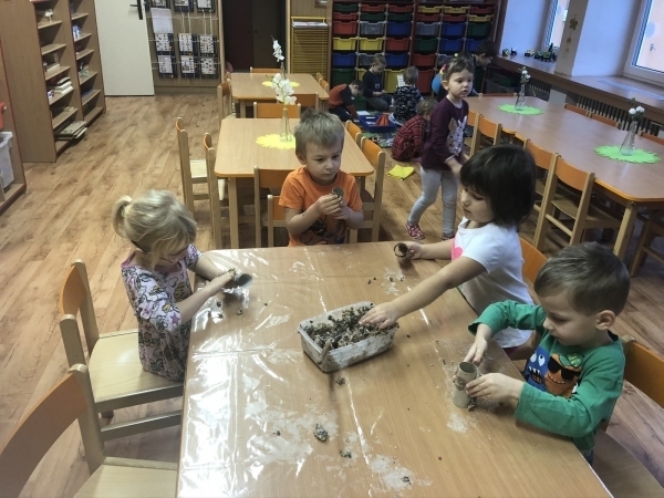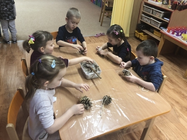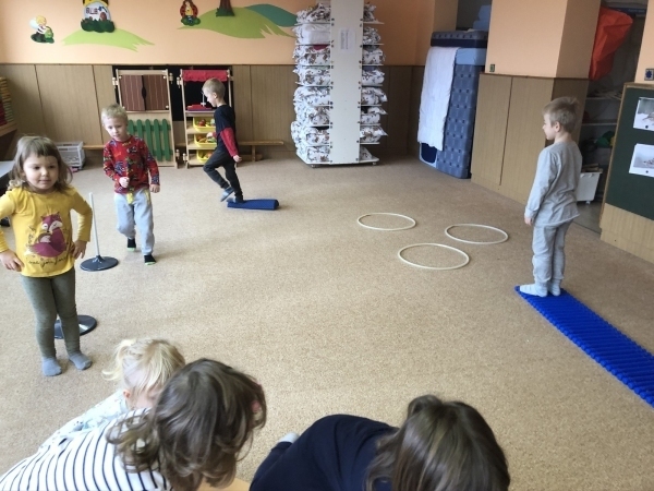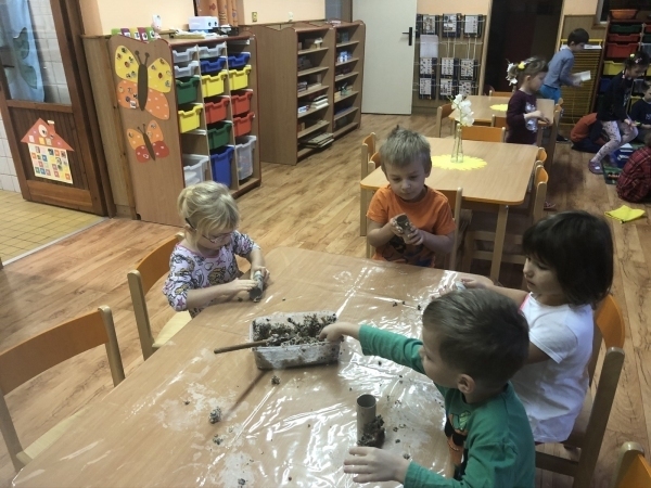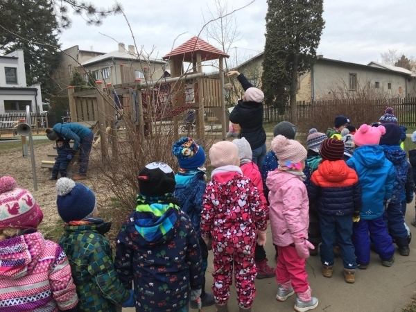 V tomto týdnu jsme si s dětmi povídali o ptáčcích, naučili jsme se některé ze stálých ptáčků poznávat, naučili jsme se novou písničku o vrabečkovi, malovali jsme Příběhy ptačích stop pomocí houbičky a šablony, také postavili jsme si překážkovou dráhu, která nám měla představovat složitou lesní pěšinku. Mimo jiné jsme také zkoušeli vyrobit ptačí krmítka pomocí šišky a směsi sádla a semínek, a poté jsme při čtvrteční procházce krmítka rozvěsili na stromy, aby se k nim ptáčci snáze dostali.