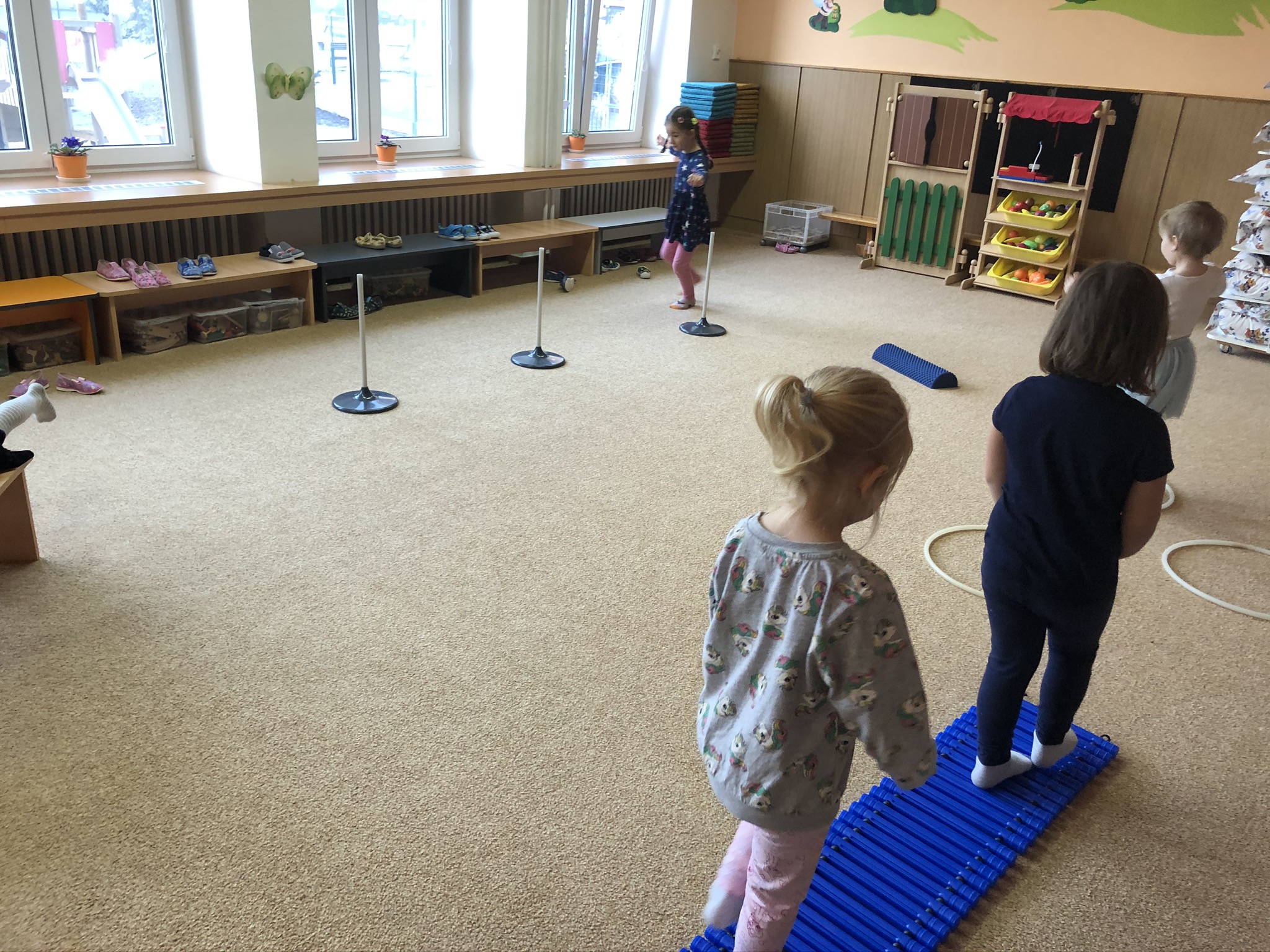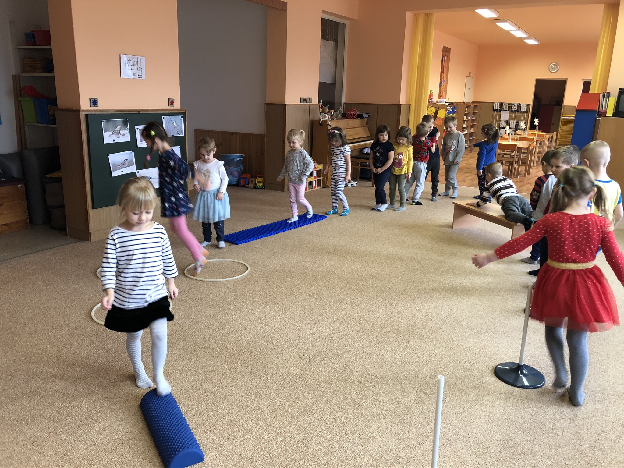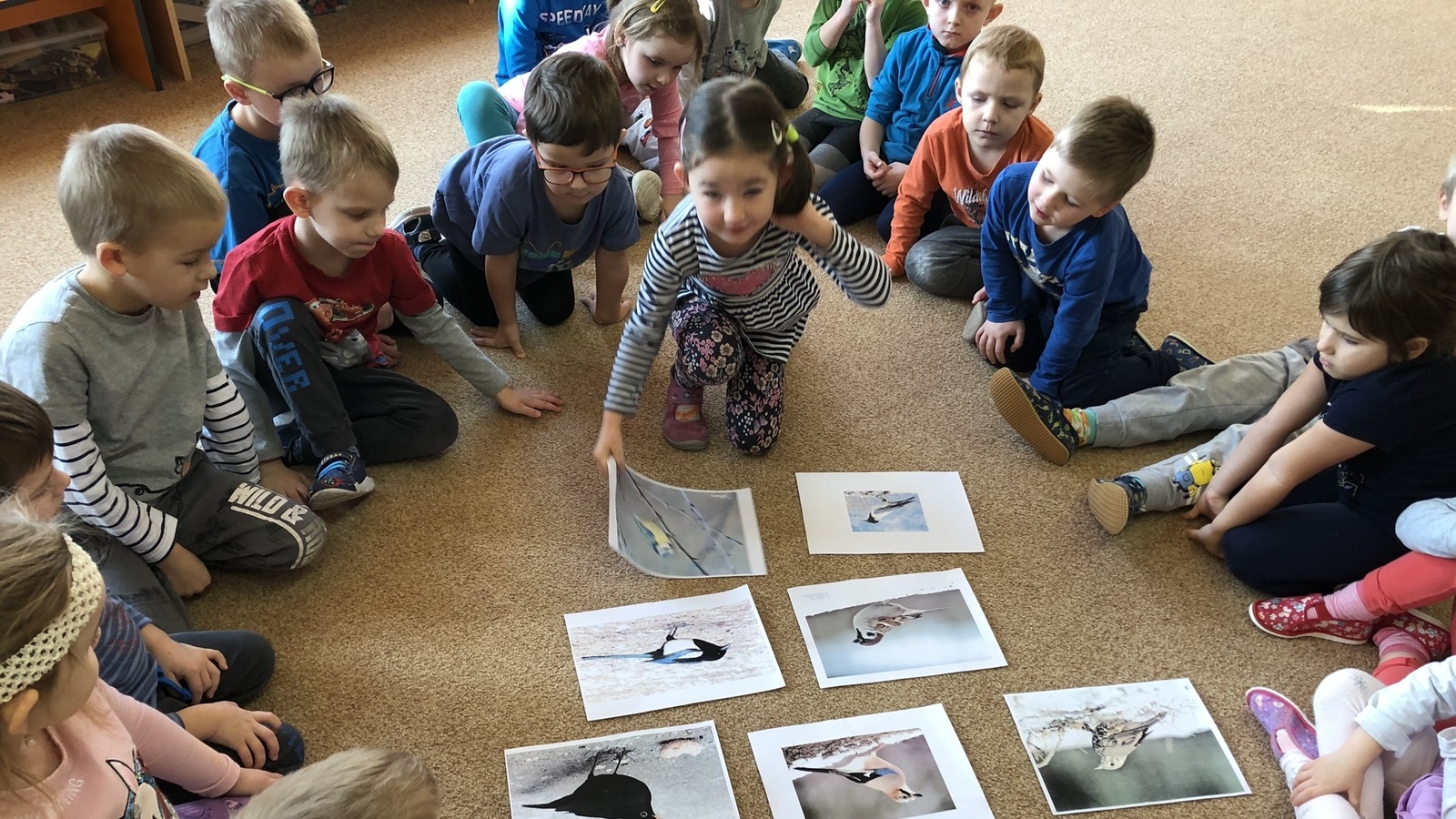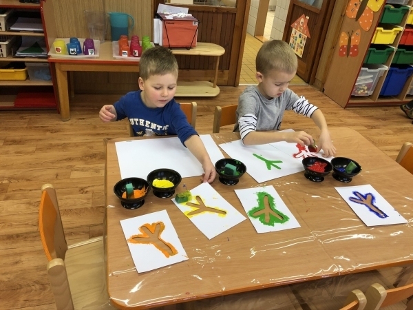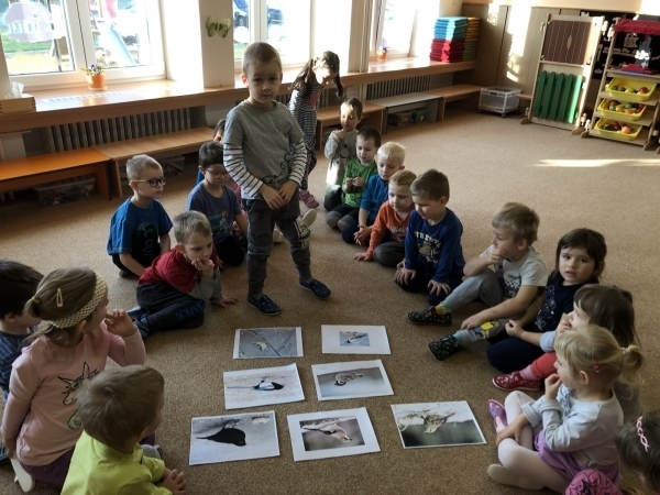 V tomto týdnu jsme si s dětmi povídali o ptáčcích, naučili jsme se některé ze stálých ptáčků poznávat, naučili jsme se novou písničku o vrabečkovi, malovali jsme Příběhy ptačích stop pomocí houbičky a šablony, také postavili jsme si překážkovou dráhu, která nám měla představovat složitou lesní pěšinku. Mimo jiné jsme také zkoušeli vyrobit ptačí krmítka pomocí šišky a směsi sádla a semínek, a poté jsme při čtvrteční procházce krmítka rozvěsili na stromy, aby se k nim ptáčci snáze dostali.