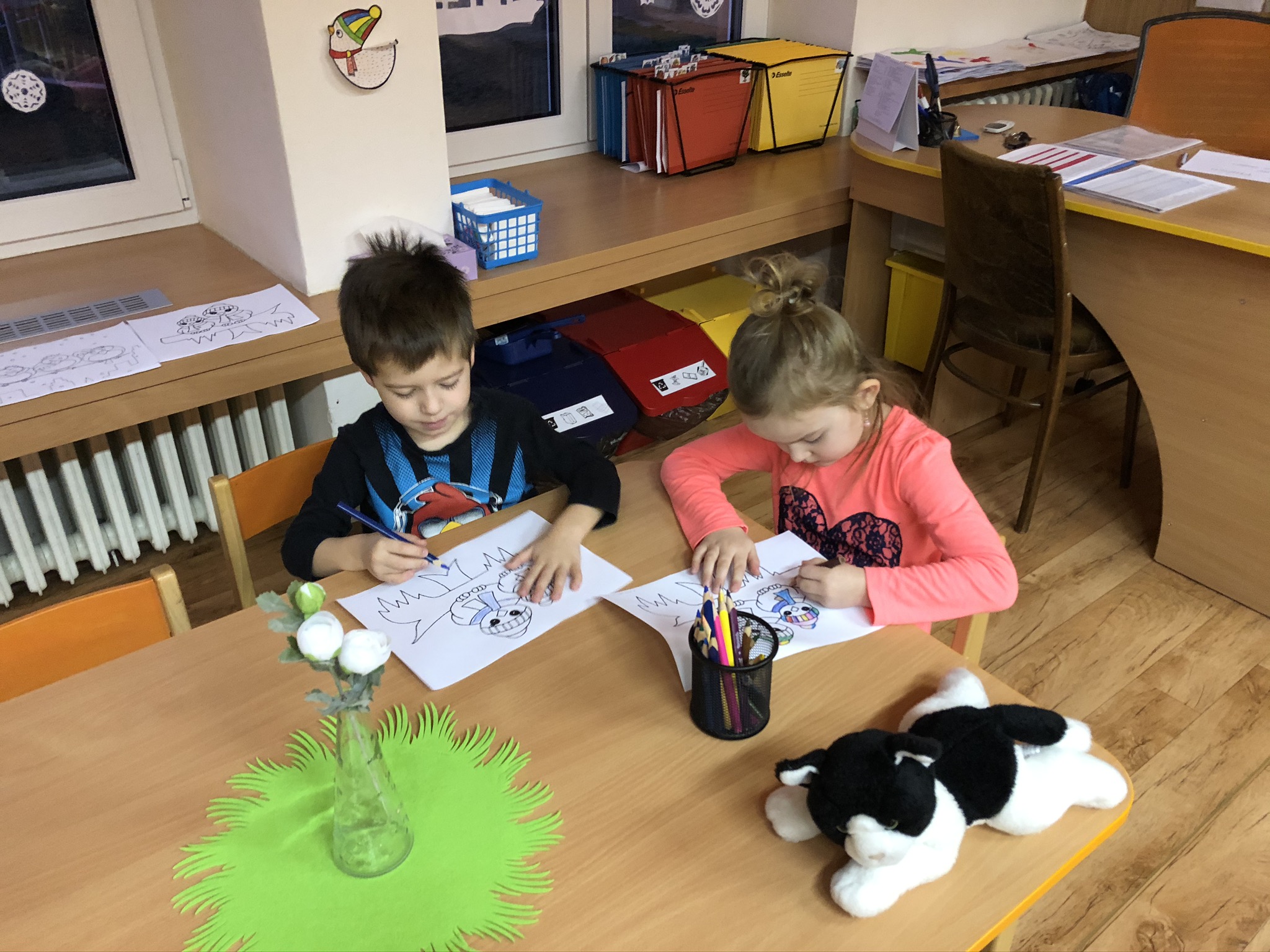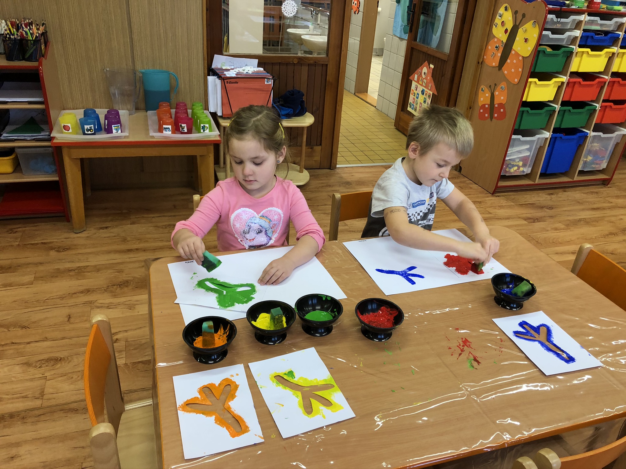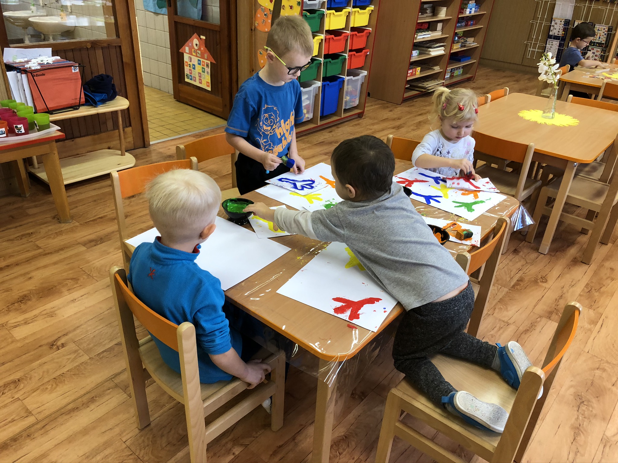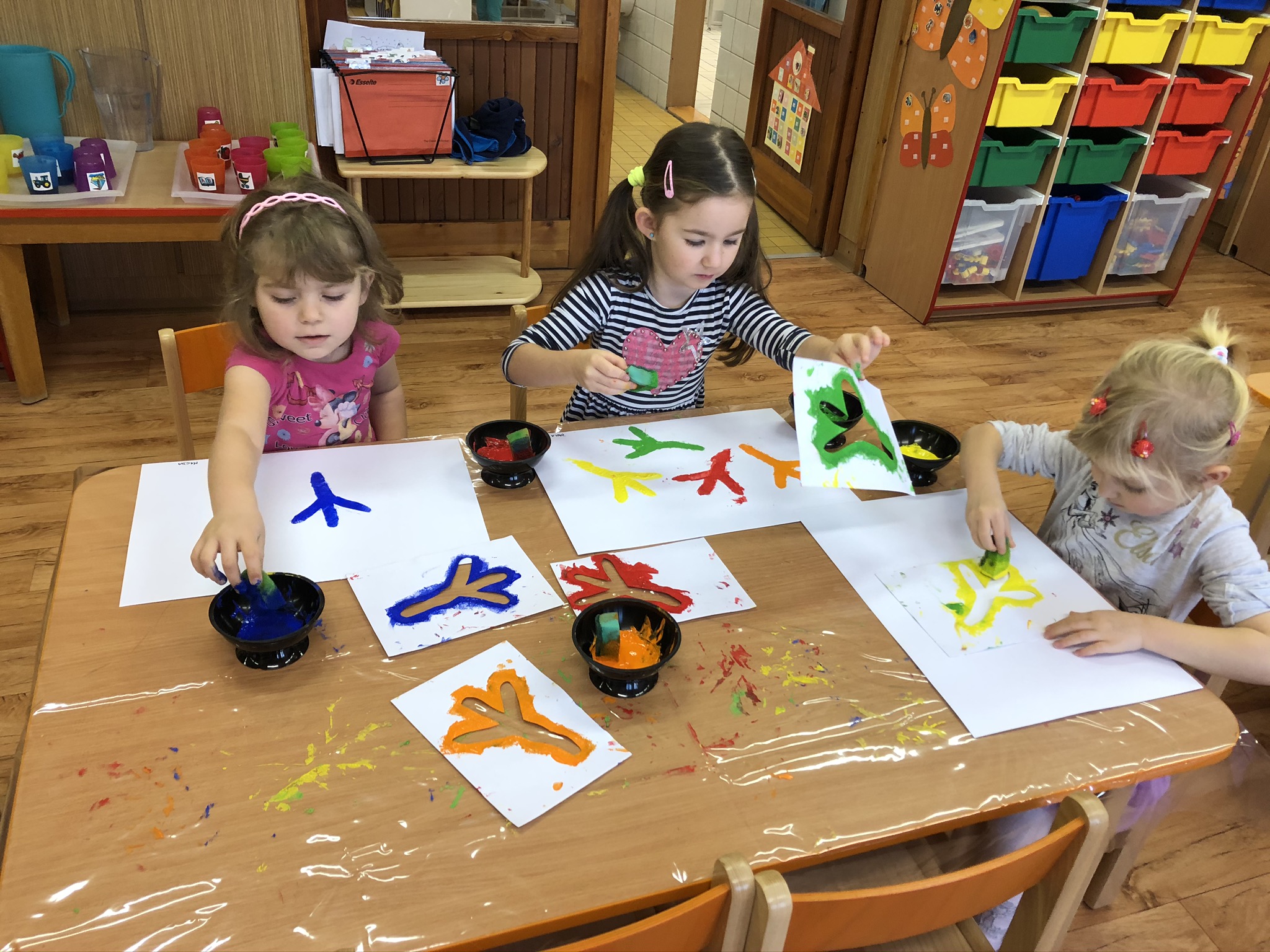 V tomto týdnu jsme si s dětmi povídali o ptáčcích, naučili jsme se některé ze stálých ptáčků poznávat, naučili jsme se novou písničku o vrabečkovi, malovali jsme Příběhy ptačích stop pomocí houbičky a šablony, také postavili jsme si překážkovou dráhu, která nám měla představovat složitou lesní pěšinku. Mimo jiné jsme také zkoušeli vyrobit ptačí krmítka pomocí šišky a směsi sádla a semínek, a poté jsme při čtvrteční procházce krmítka rozvěsili na stromy, aby se k nim ptáčci snáze dostali.