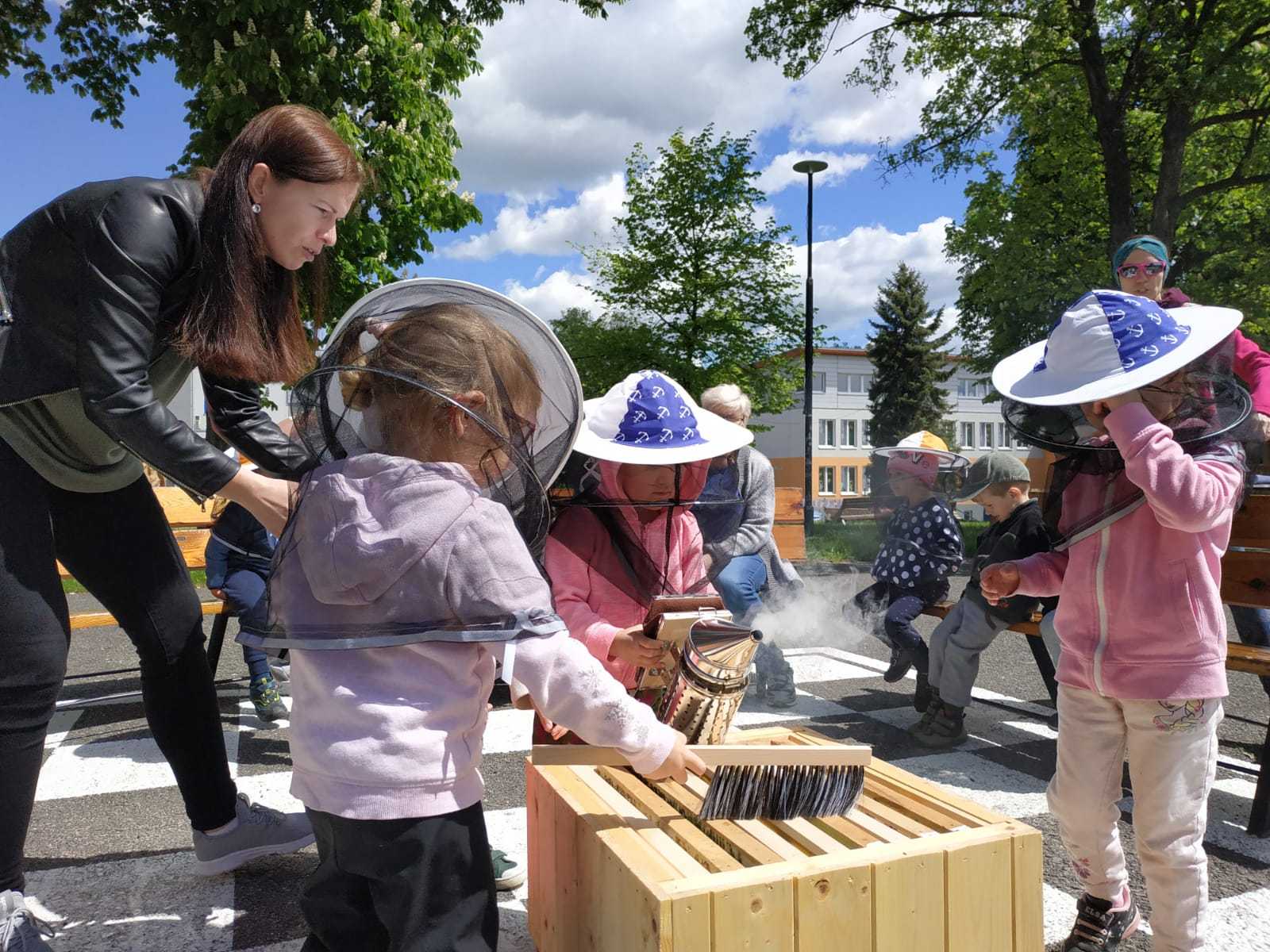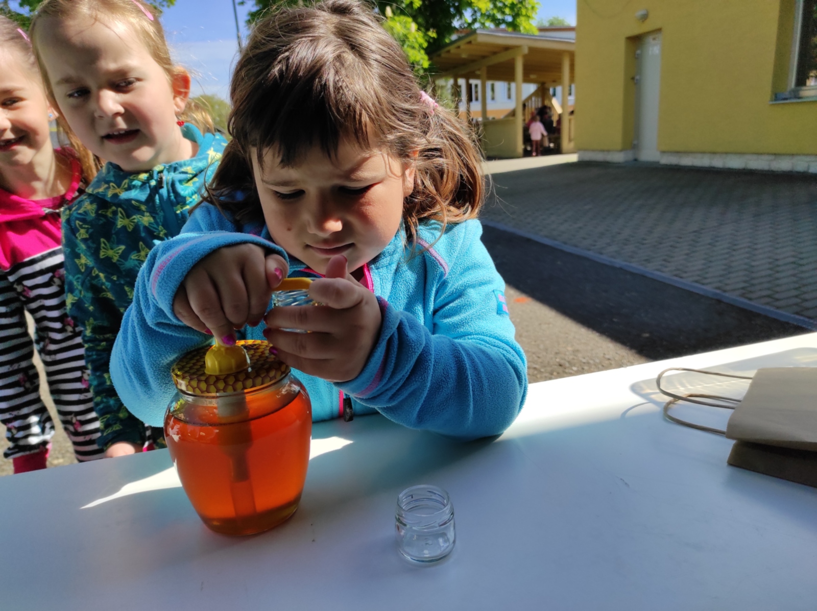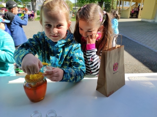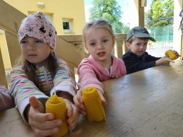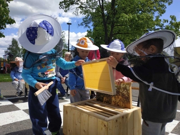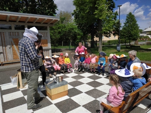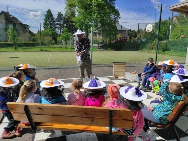 Ve středu 26. 5. 2021 zažily děti z mateřské školy zajímavé setkání s šenovskými včelaři. Ti nám velice pěkně, přiměřenou formou přiblížili život včelstva. Děti měly možnost vidět, jak to v úlu vypadá, hledaly v něm i včelí královnu, nasadily si včelařské kukly a vyzkoušely si vykuřování úlu. Další aktivity v podobě stáčení medu a výroba svíčky se dětem moc líbily. Děti se do školky vracely s pěkným zážitkem a taštičkou s včelařskými dárečky.