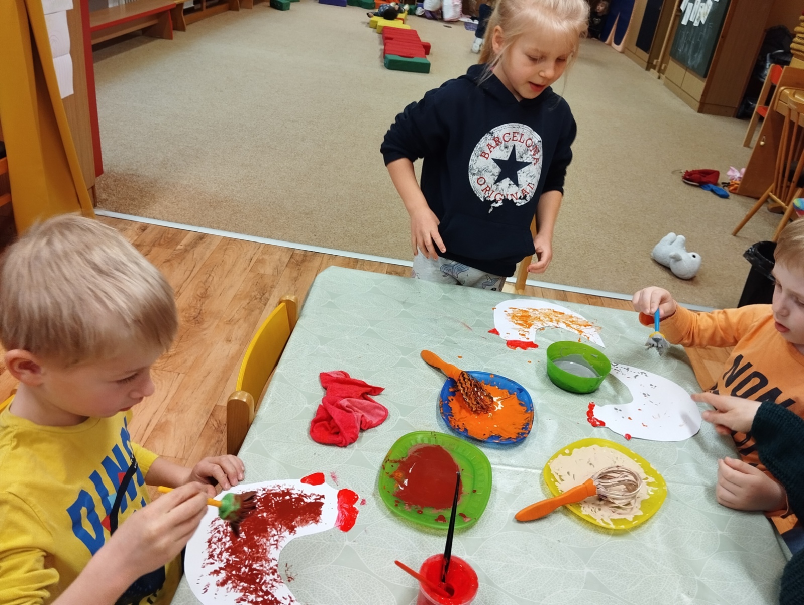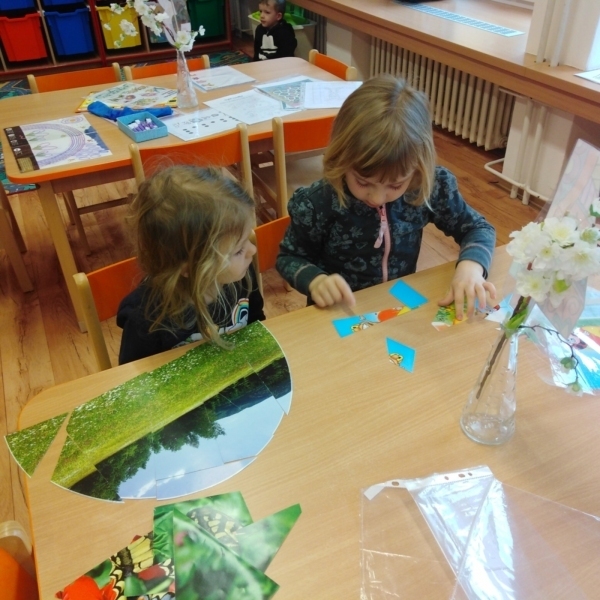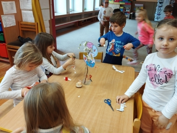 Celý Březen jsme si povídali o jaru a nadcházejících jarních svátcích. Zopakovali jsme si názvy ročních období a názvy jarních kytiček. Povídali jsme si o tom, jak se příroda na jaře mění. Seznámili jsme se s pojmem čas: jak plyne čas v přírodě, také jak plyne čas od rána do noci a s týdenním časovým úsekem od pondělí do neděle. Jmenovali jsme znaky jara a povídali si o velikonočních zvycích a tradicích. Připravovali jsme se na oslavu velikonočních svátků zdobením osazených květináčů, u kterých jsme také každý den pozorovali růst osení. Zdobili jsme vajíčka. Děti si procvičily uvolnění ramenního kloubu a práci podle pokynů p.učitelky při tvoření jarní slepičky. Upevňovaly si správný úchop pastelek při vybarvování omalovánek a výrobě zápichů. Zahráli jsme si hudebně pohybové hry Uvíjíme věneček, Jarní kytičky. Pohybové aktivity jsme si moc užili, ať už při cvičení v překážkové dráze, s náčiním, při jógovém cvičení, či cvičení s duhovým padákem. Venku jsme si společně užívali prvních jarních dnů, které jsme také využili k návštěvě bio farmy, kde jsme viděli spoustu oveček a dokonce jsme si mohli pohladit i jehňátka. Dětem se moc povedla výroba velikonočních vajíčkových zvířátek. Tímto děkujeme rodičům za přinesená vyfouklá vajíčka a paní Kuchařové za velikonoční perníčky, které si děti samy ozdobily sladkou polevou. Daneček a Nikolka nám představili své oblíbené pohádky a Táničce jsme popřáli k svátku