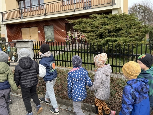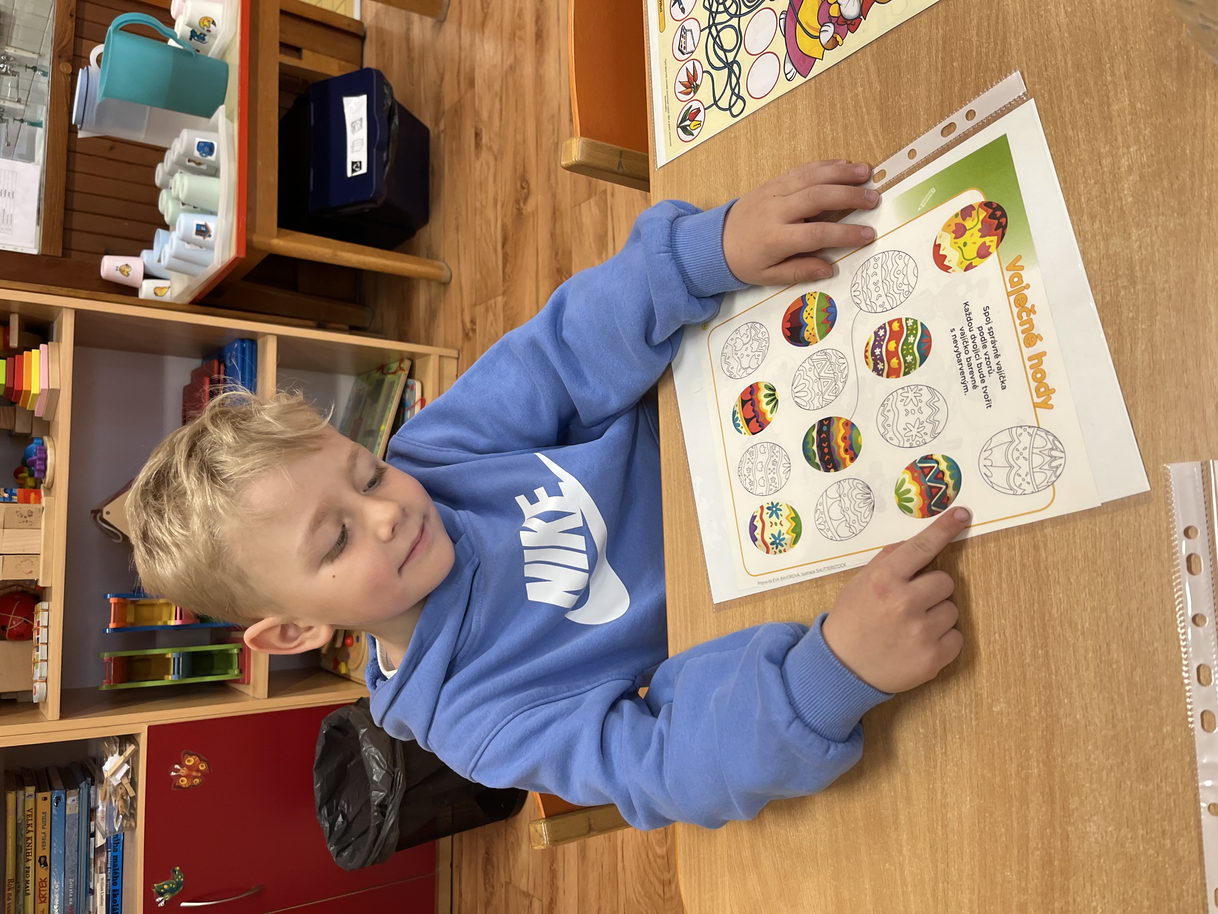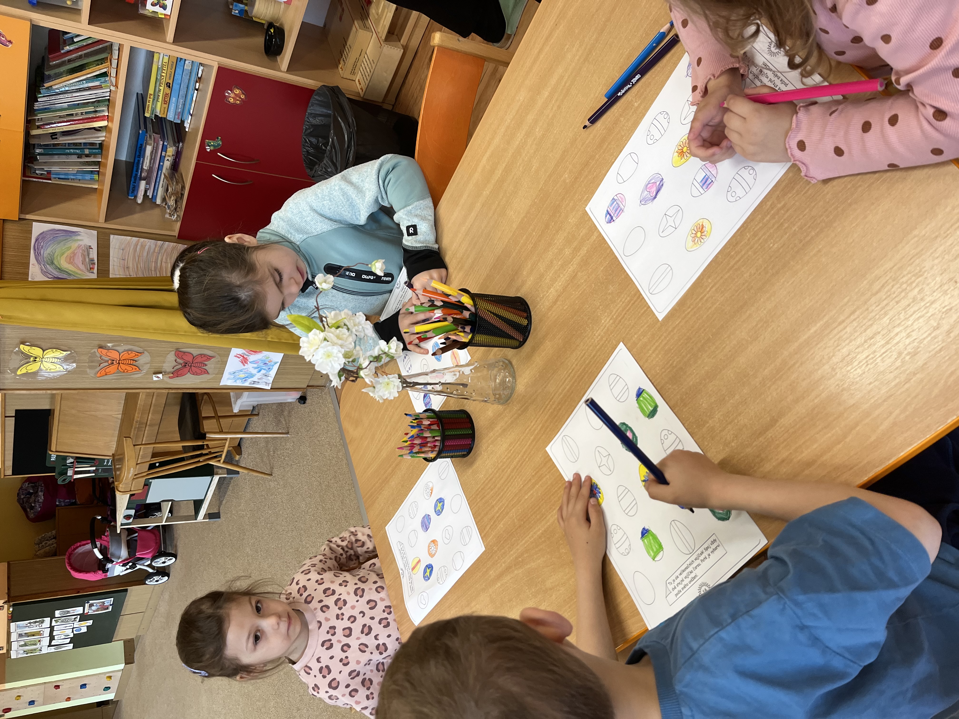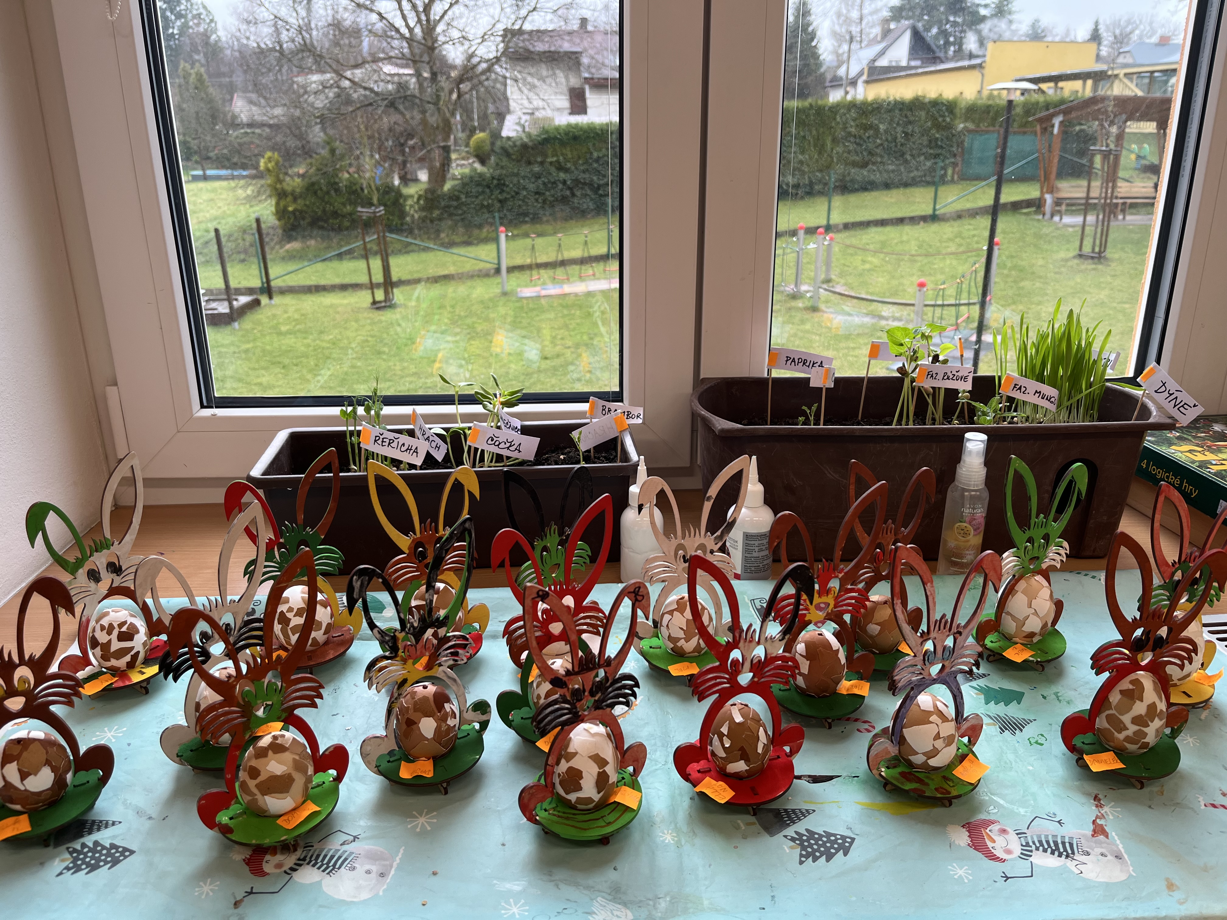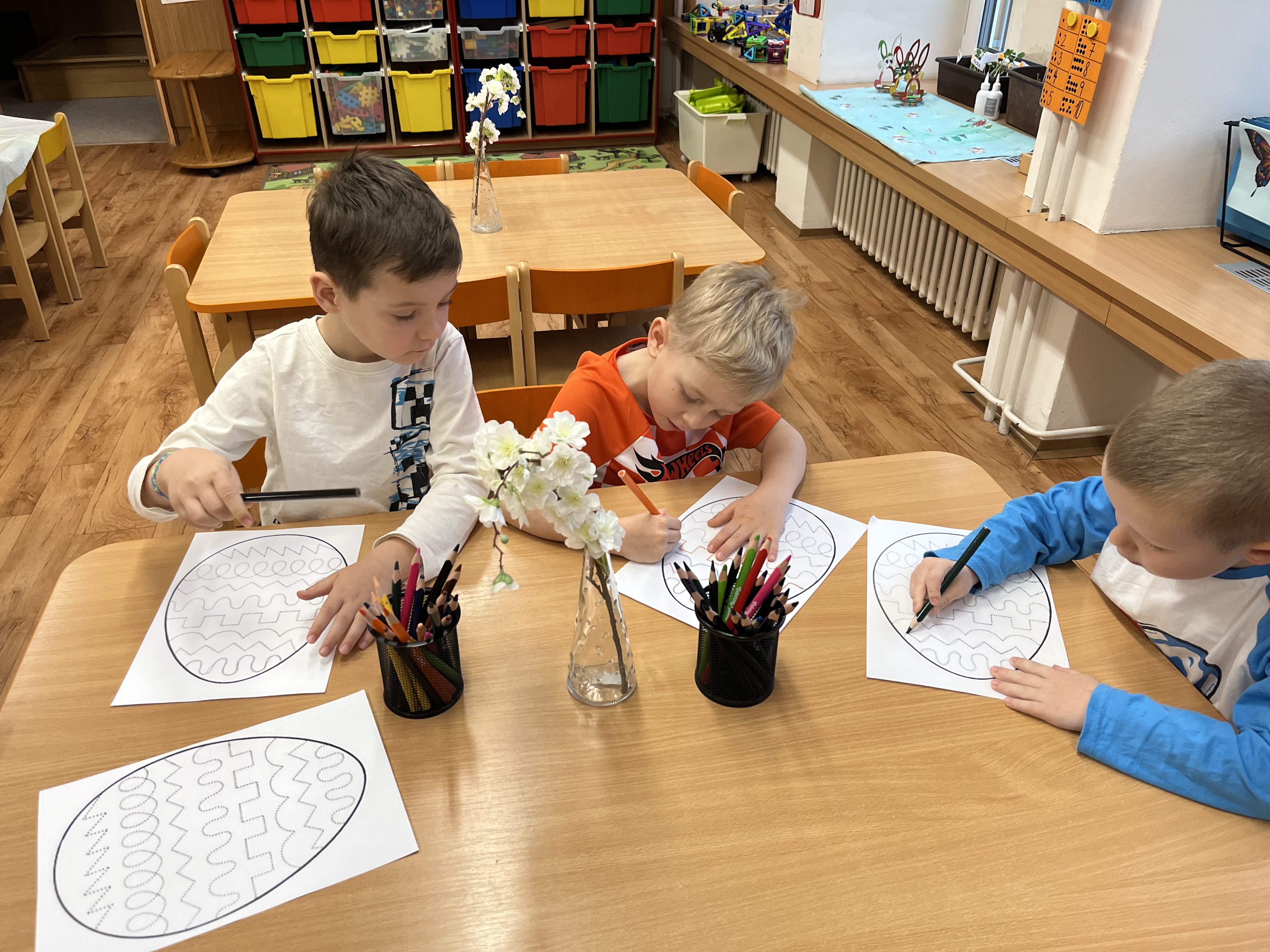 Připravovali jsme se na oslavu velikonočních svátků zdobením osázených květináčů, malováním velikonočního zajíčka a tvořením velikonočních vajíček. Tímto děkujeme rodičům za přinesená vyfouknutá vajíčka. Děti si procvičily grafomotoriku, předčtenářské i předmatematické dovednosti a práci podle pokynů paní učitelky při tvoření domečku pro broučky. Upevňovaly si také správný úchop pastelek při vybarvování omalovánek. Zahráli jsme si hudebně-pohybové hry "Uvíjíme věneček", "Ovečky, ovečky" a "Jarní kytičky". Pohybové aktivity jsme si moc užili – ať už při cvičení na překážkové dráze, s náčiním, při jógovém cvičení či cvičení s duhovým padákem.