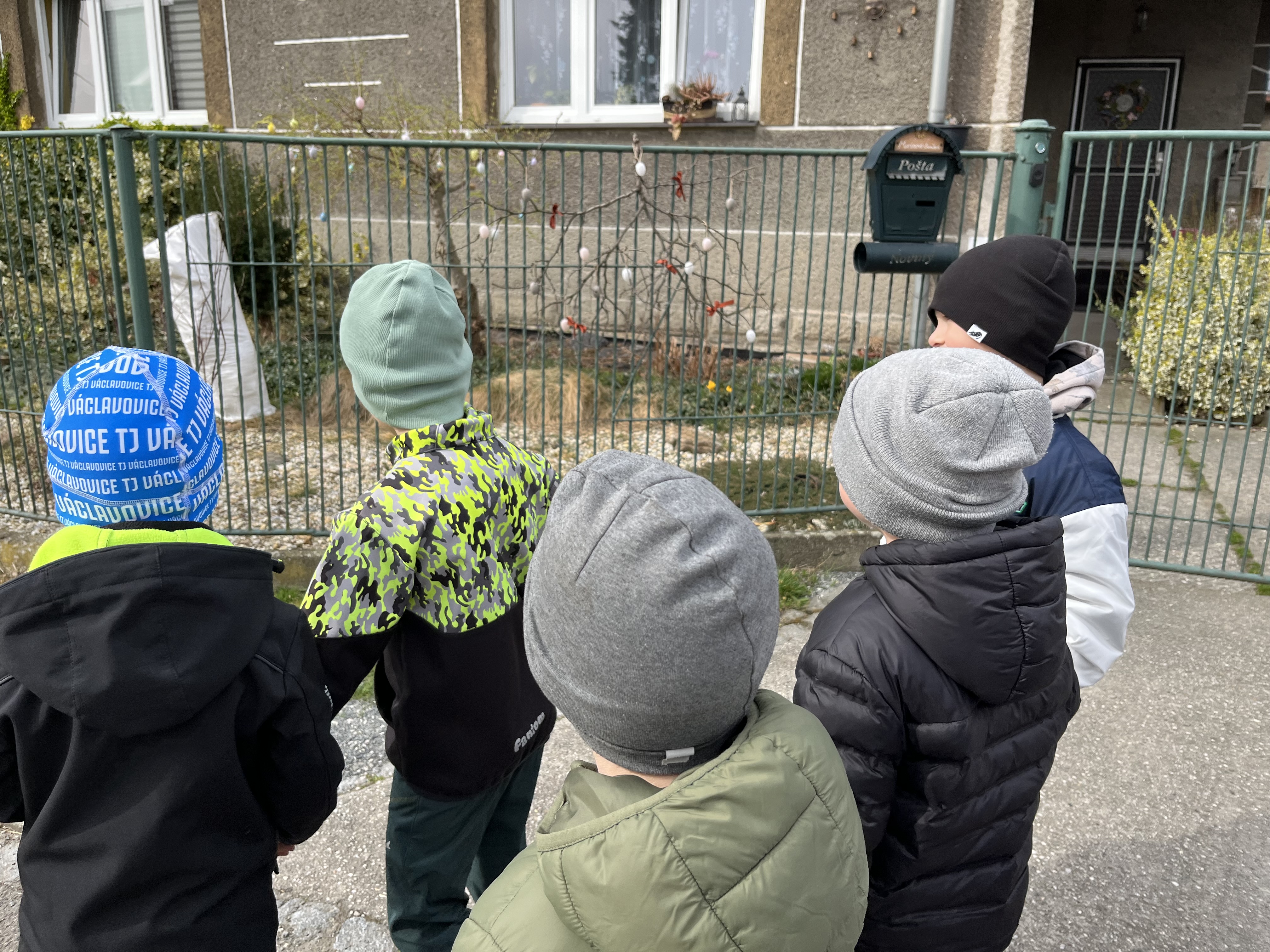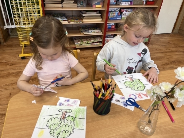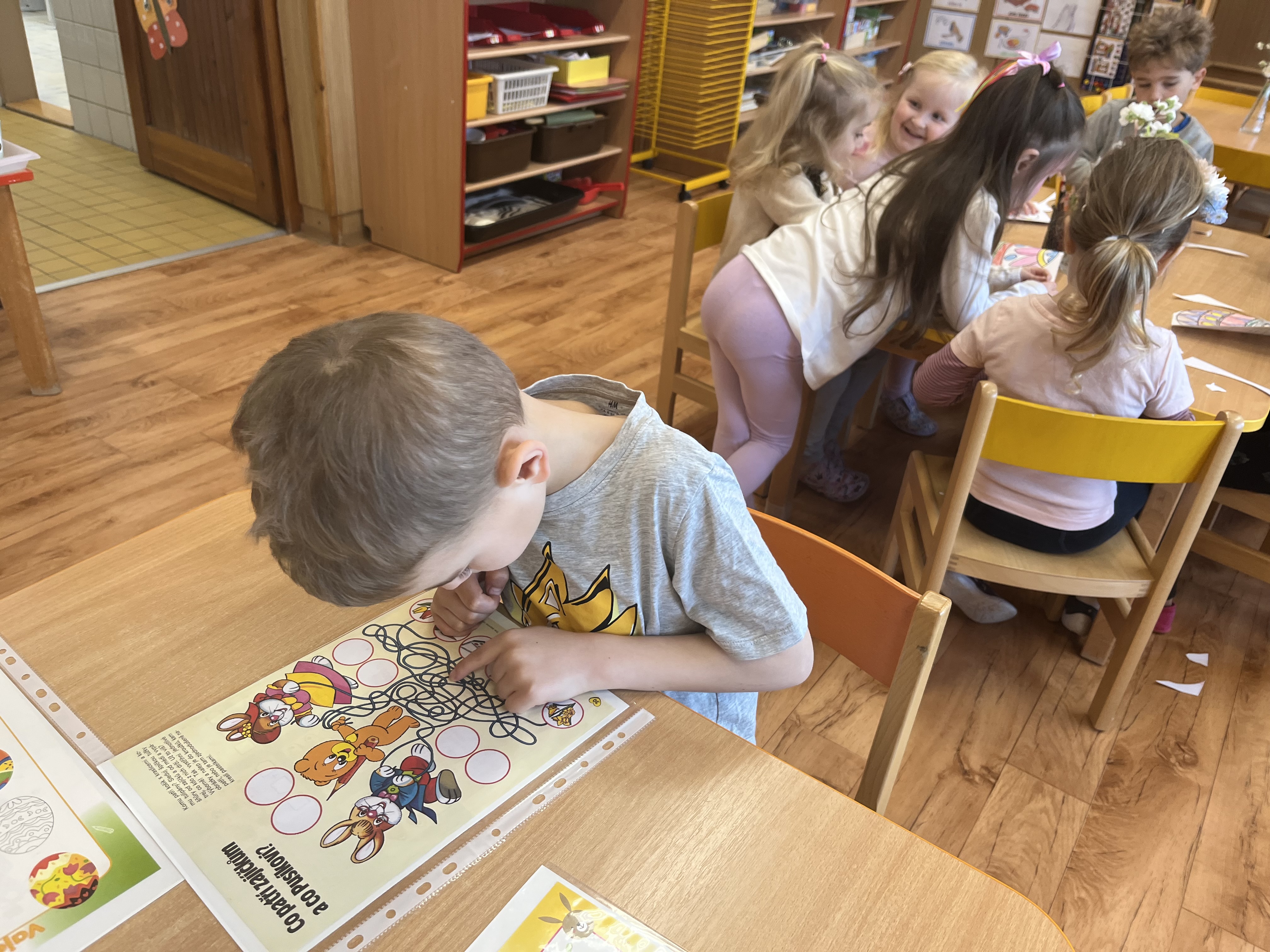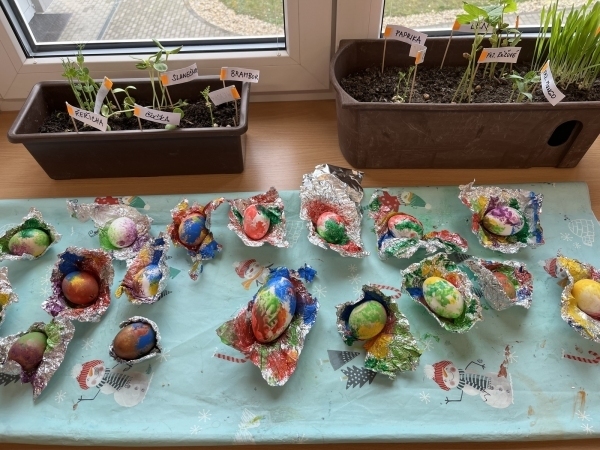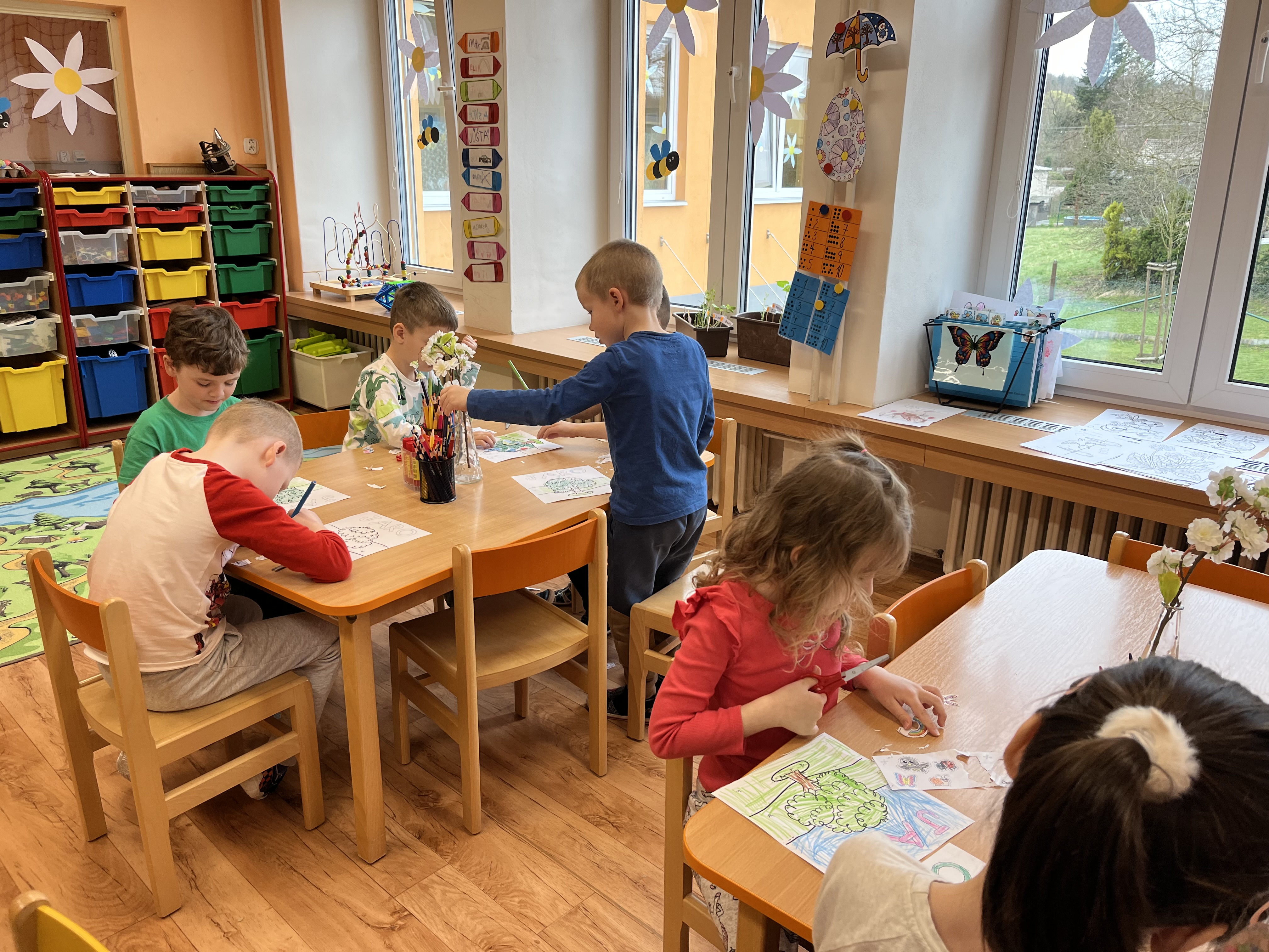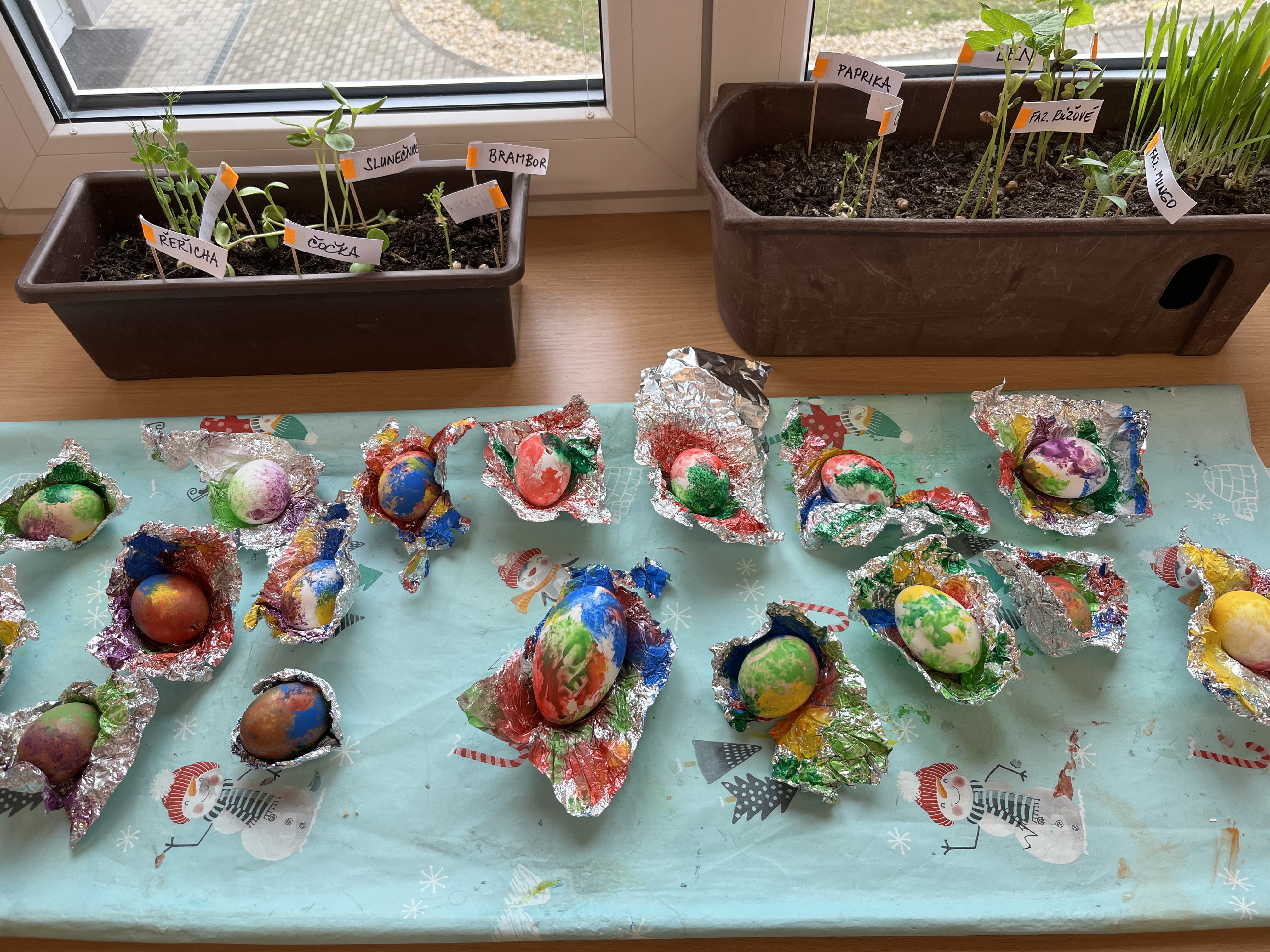 Připravovali jsme se na oslavu velikonočních svátků zdobením osázených květináčů, malováním velikonočního zajíčka a tvořením velikonočních vajíček. Tímto děkujeme rodičům za přinesená vyfouknutá vajíčka. Děti si procvičily grafomotoriku, předčtenářské i předmatematické dovednosti a práci podle pokynů paní učitelky při tvoření domečku pro broučky. Upevňovaly si také správný úchop pastelek při vybarvování omalovánek. Zahráli jsme si hudebně-pohybové hry "Uvíjíme věneček", "Ovečky, ovečky" a "Jarní kytičky". Pohybové aktivity jsme si moc užili – ať už při cvičení na překážkové dráze, s náčiním, při jógovém cvičení či cvičení s duhovým padákem.