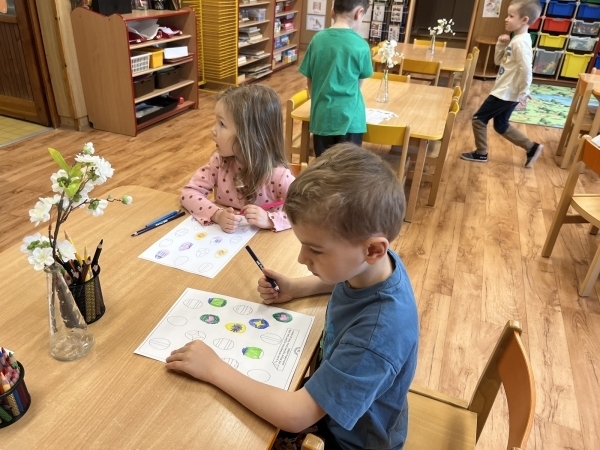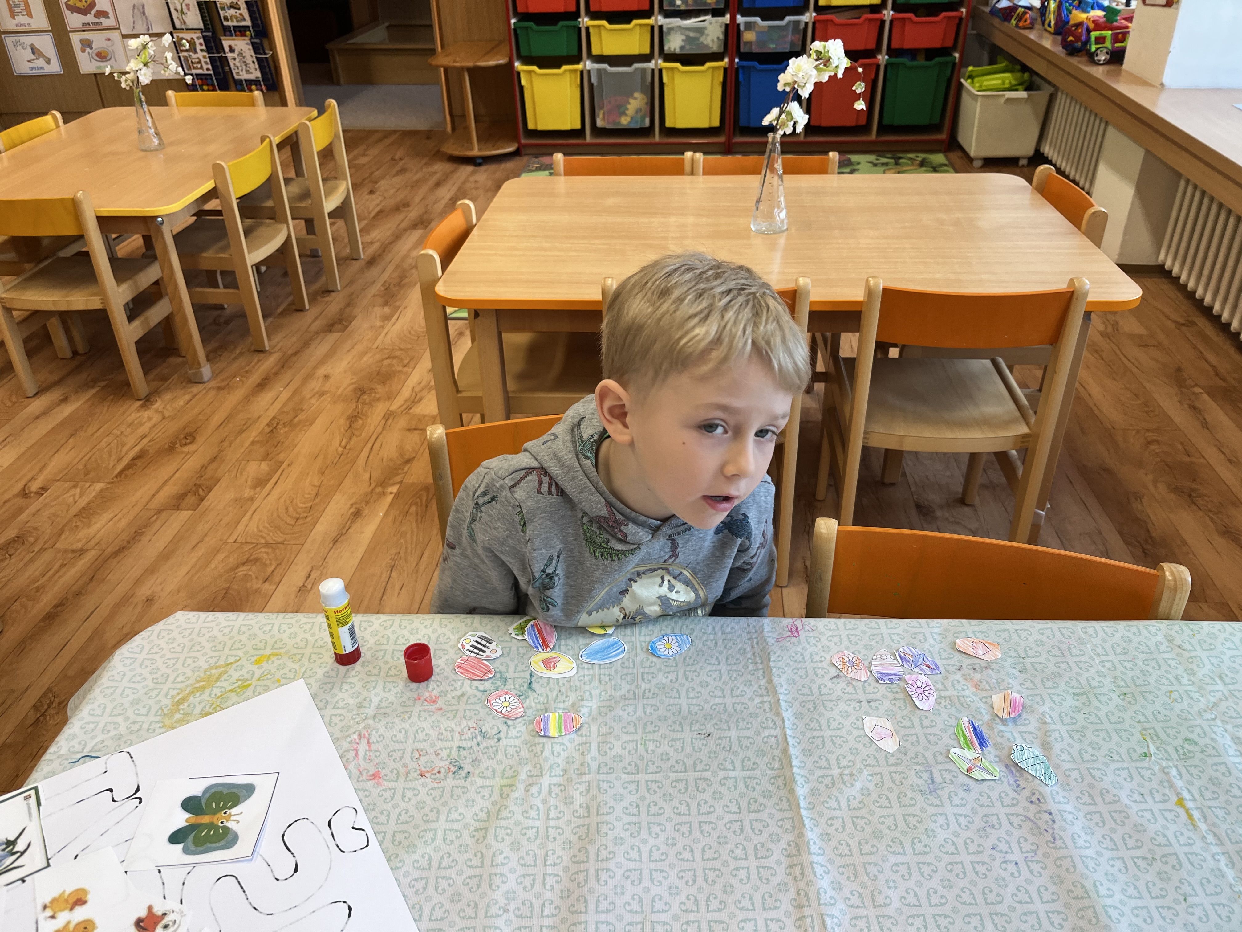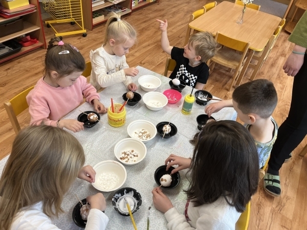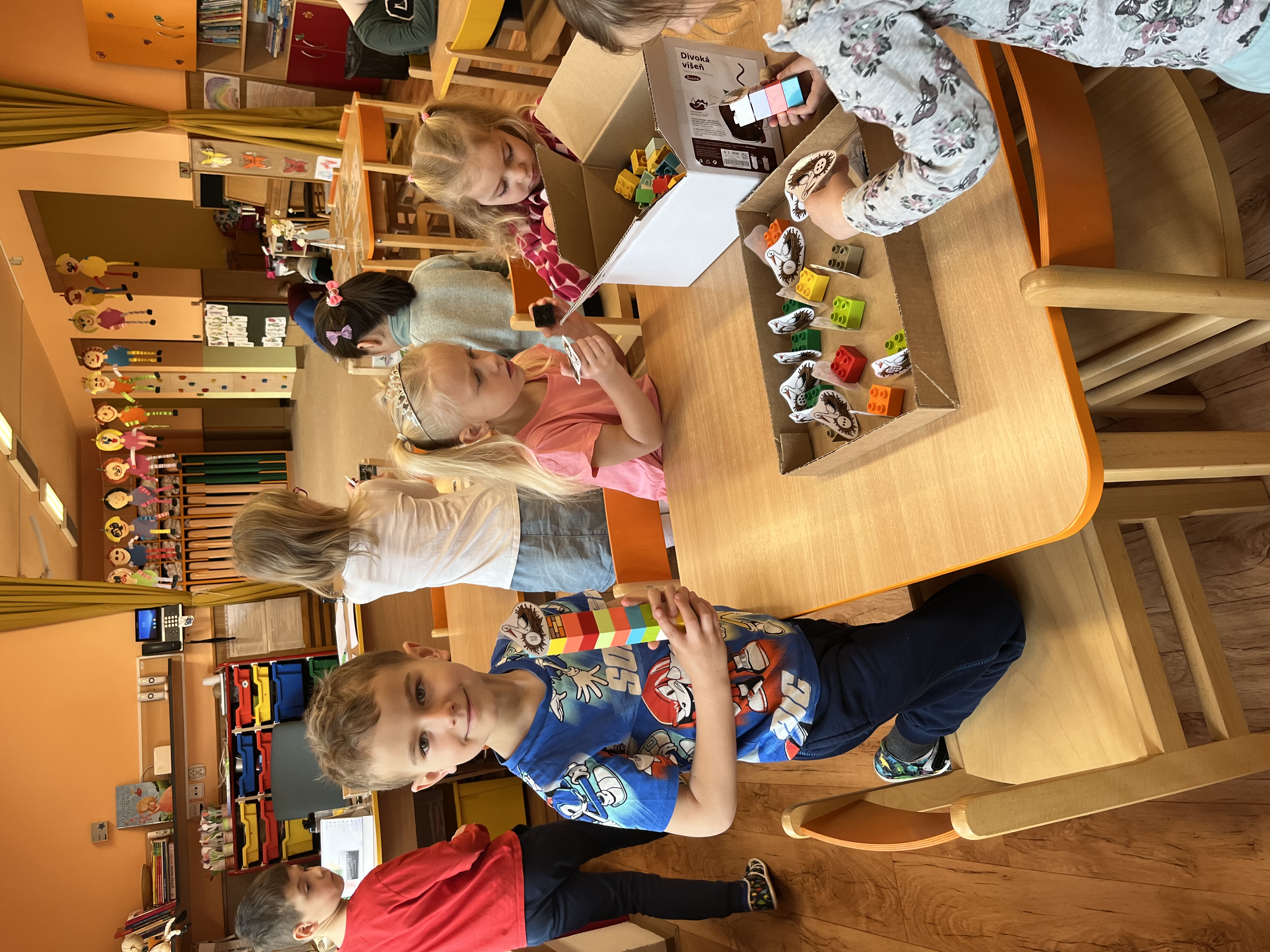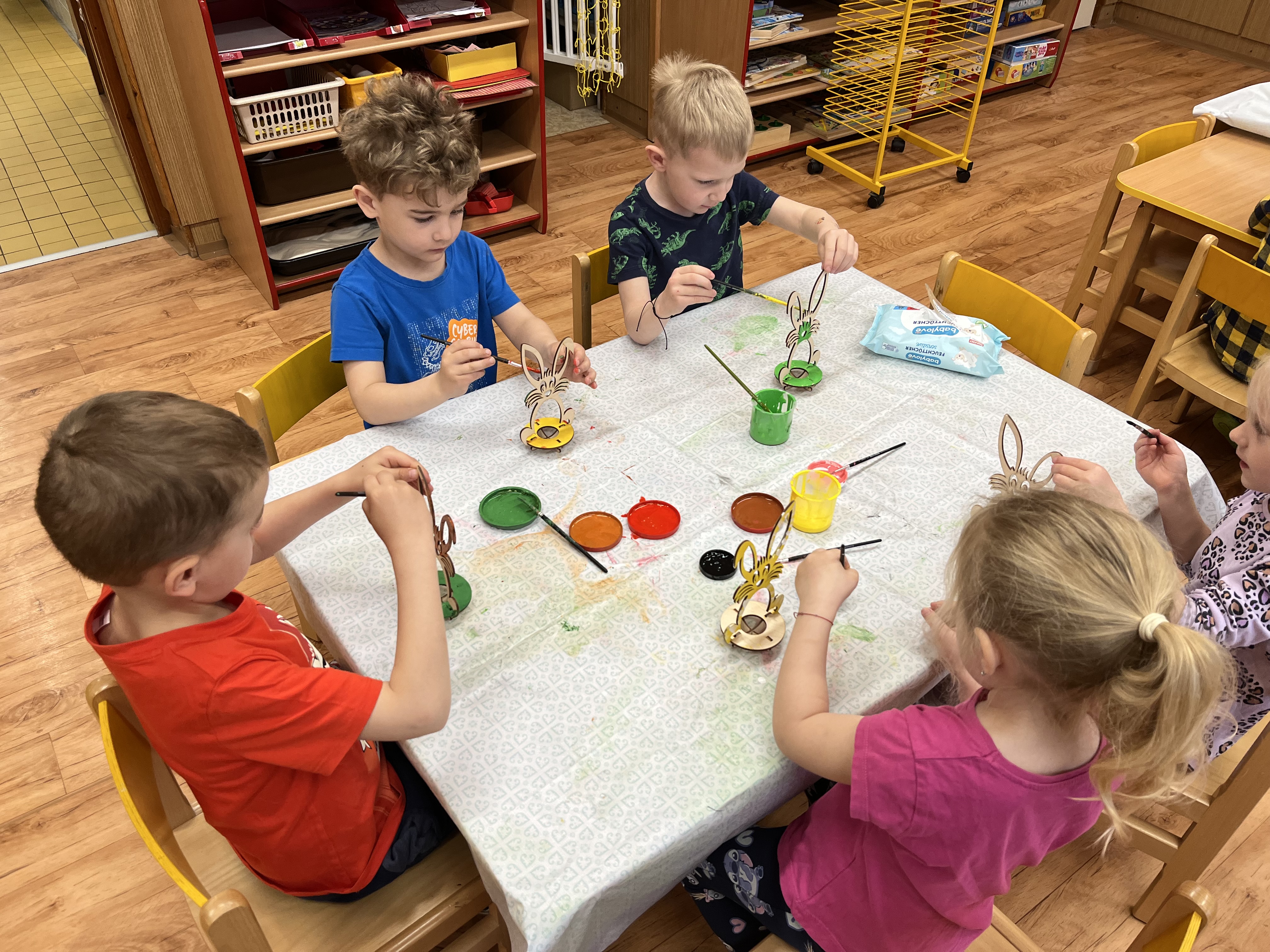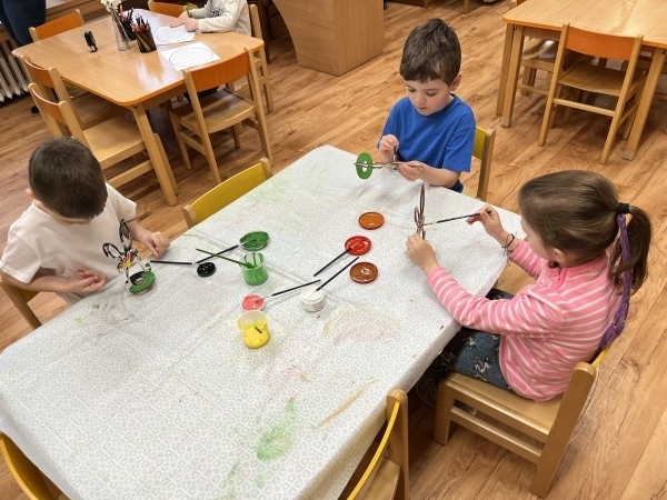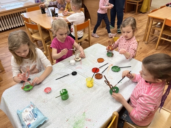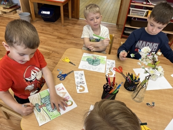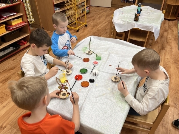 Připravovali jsme se na oslavu velikonočních svátků zdobením osázených květináčů, malováním velikonočního zajíčka a tvořením velikonočních vajíček. Tímto děkujeme rodičům za přinesená vyfouknutá vajíčka. Děti si procvičily grafomotoriku, předčtenářské i předmatematické dovednosti a práci podle pokynů paní učitelky při tvoření domečku pro broučky. Upevňovaly si také správný úchop pastelek při vybarvování omalovánek. Zahráli jsme si hudebně-pohybové hry "Uvíjíme věneček", "Ovečky, ovečky" a "Jarní kytičky". Pohybové aktivity jsme si moc užili – ať už při cvičení na překážkové dráze, s náčiním, při jógovém cvičení či cvičení s duhovým padákem.