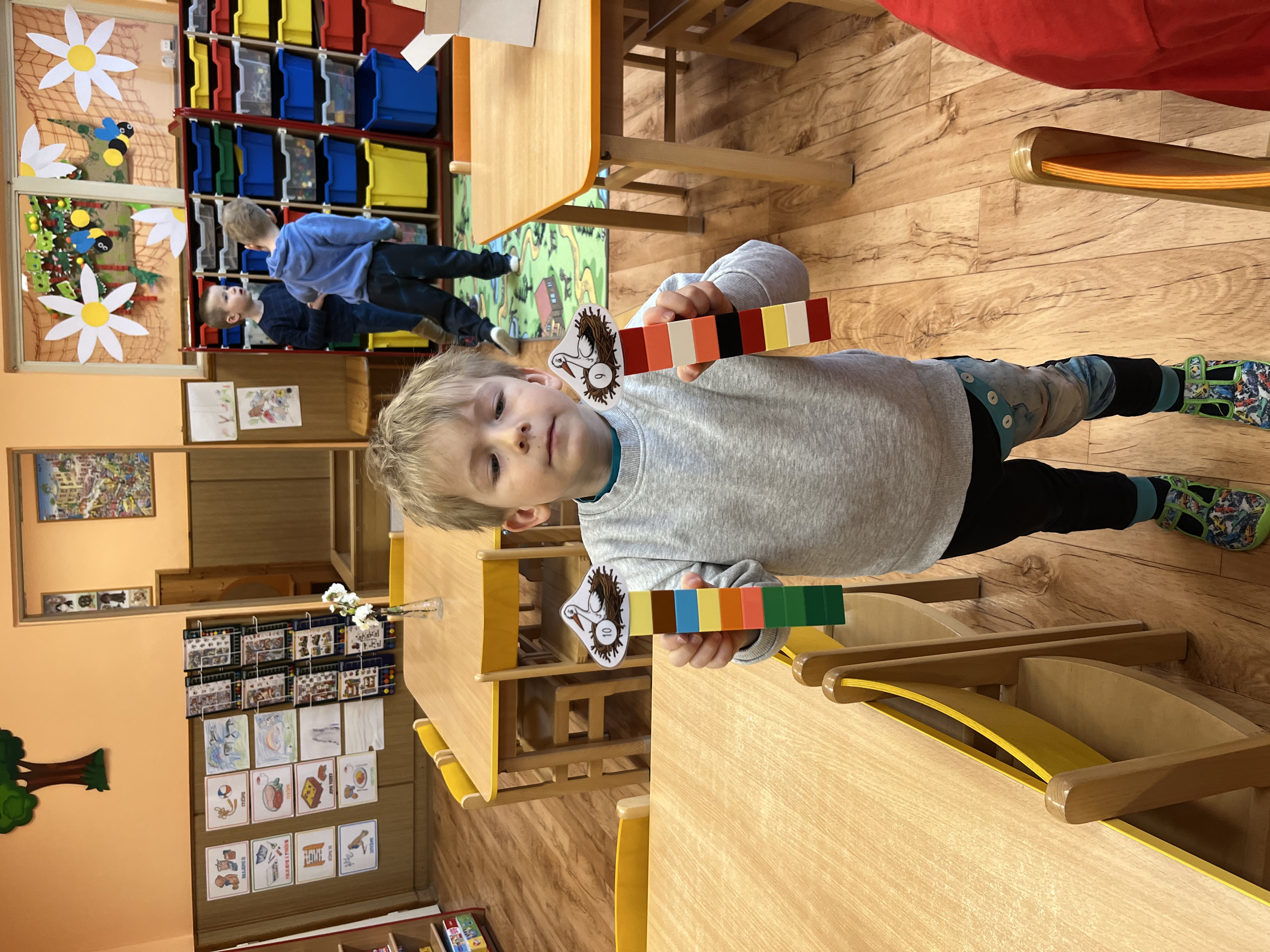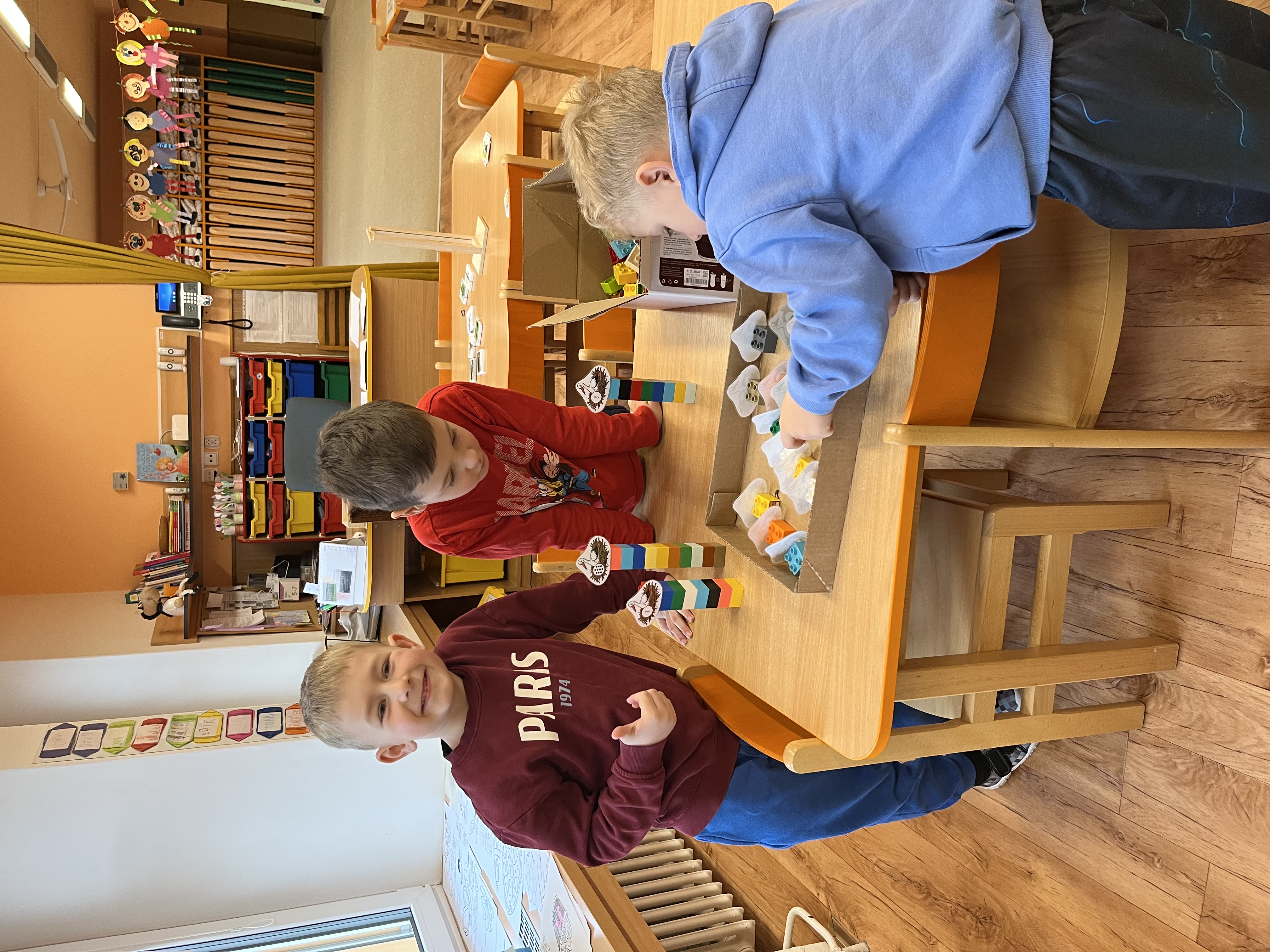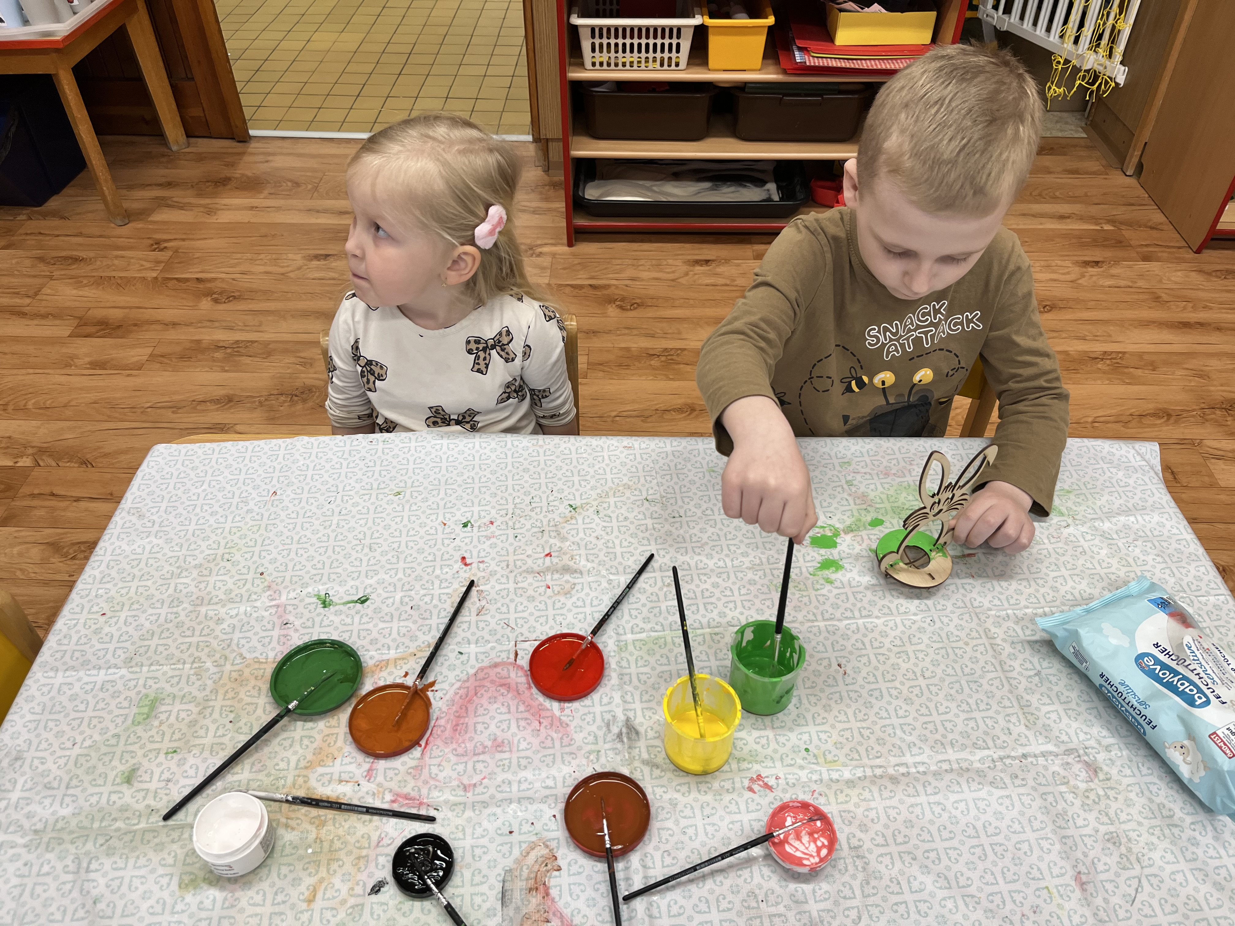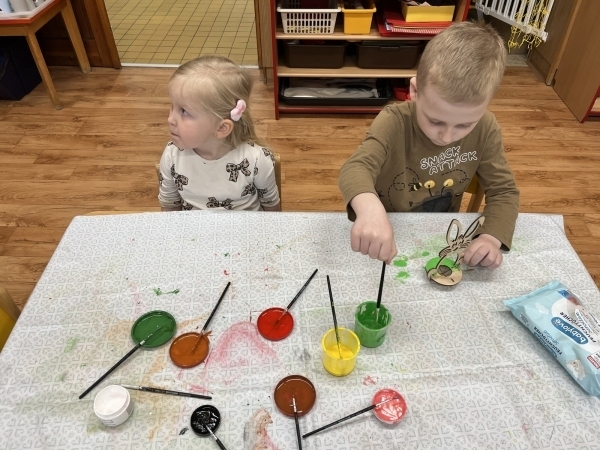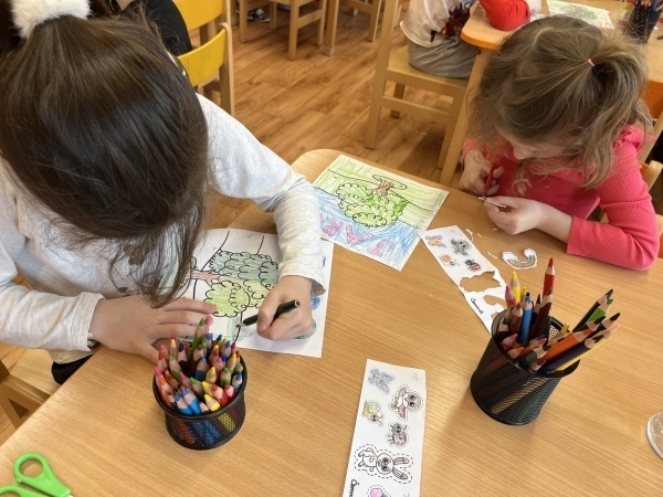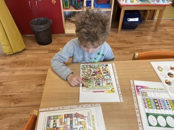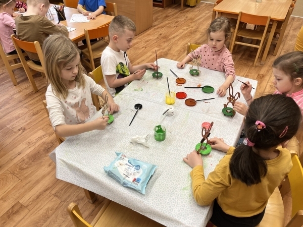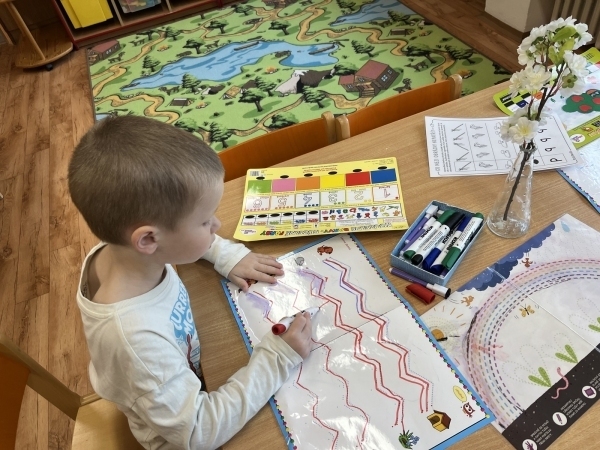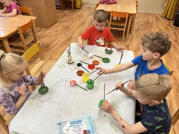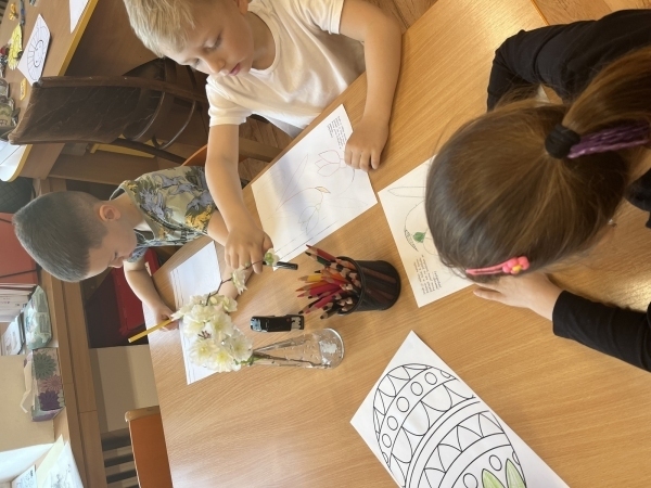 Připravovali jsme se na oslavu velikonočních svátků zdobením osázených květináčů, malováním velikonočního zajíčka a tvořením velikonočních vajíček. Tímto děkujeme rodičům za přinesená vyfouknutá vajíčka. Děti si procvičily grafomotoriku, předčtenářské i předmatematické dovednosti a práci podle pokynů paní učitelky při tvoření domečku pro broučky. Upevňovaly si také správný úchop pastelek při vybarvování omalovánek. Zahráli jsme si hudebně-pohybové hry "Uvíjíme věneček", "Ovečky, ovečky" a "Jarní kytičky". Pohybové aktivity jsme si moc užili – ať už při cvičení na překážkové dráze, s náčiním, při jógovém cvičení či cvičení s duhovým padákem.