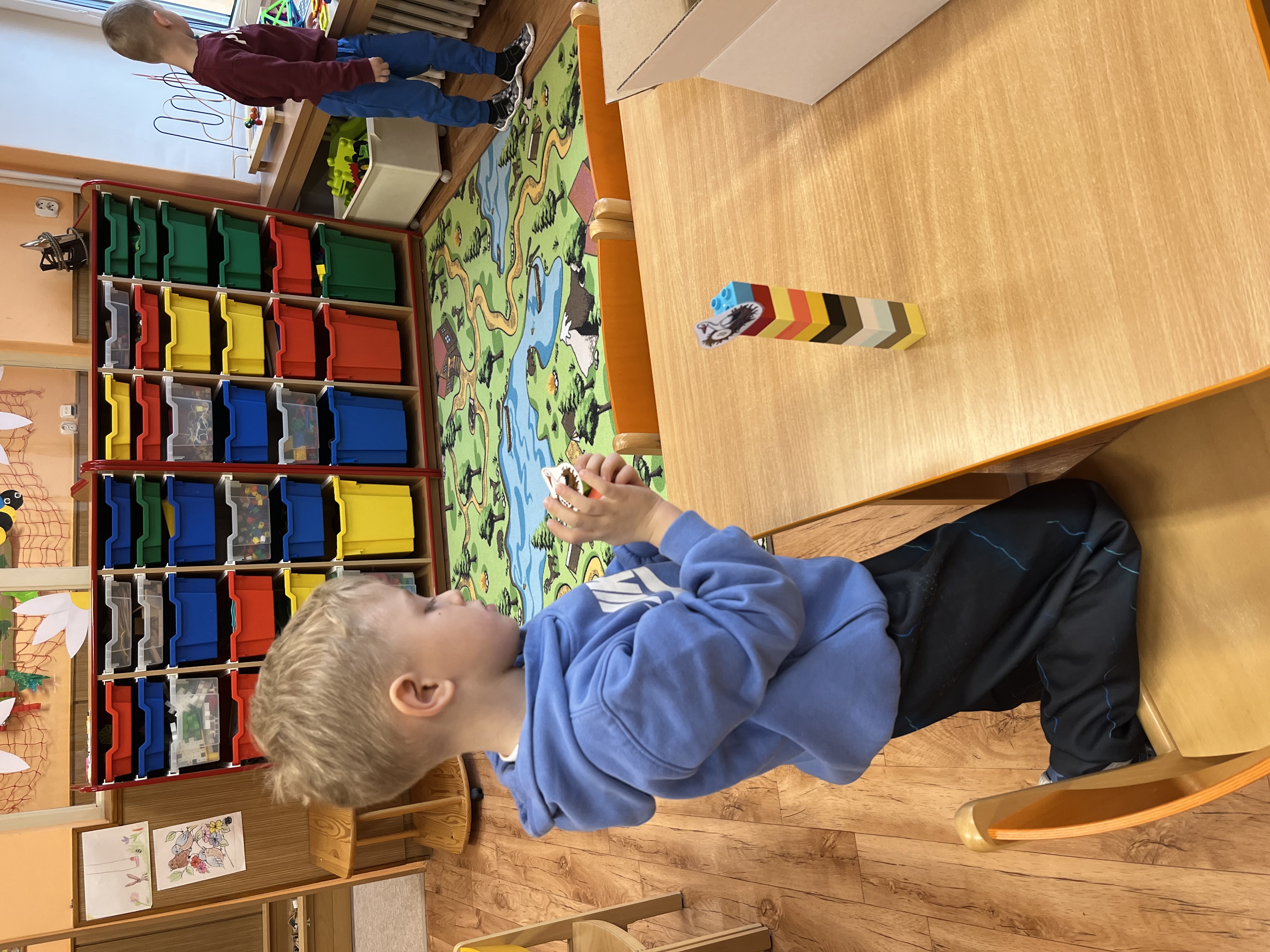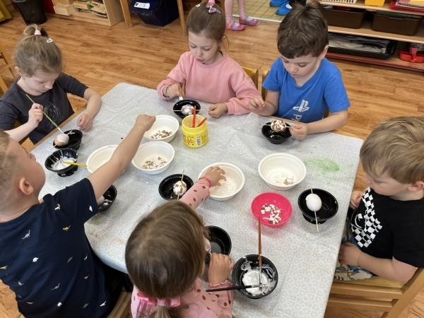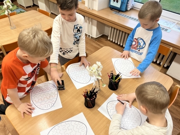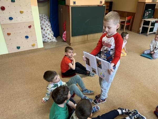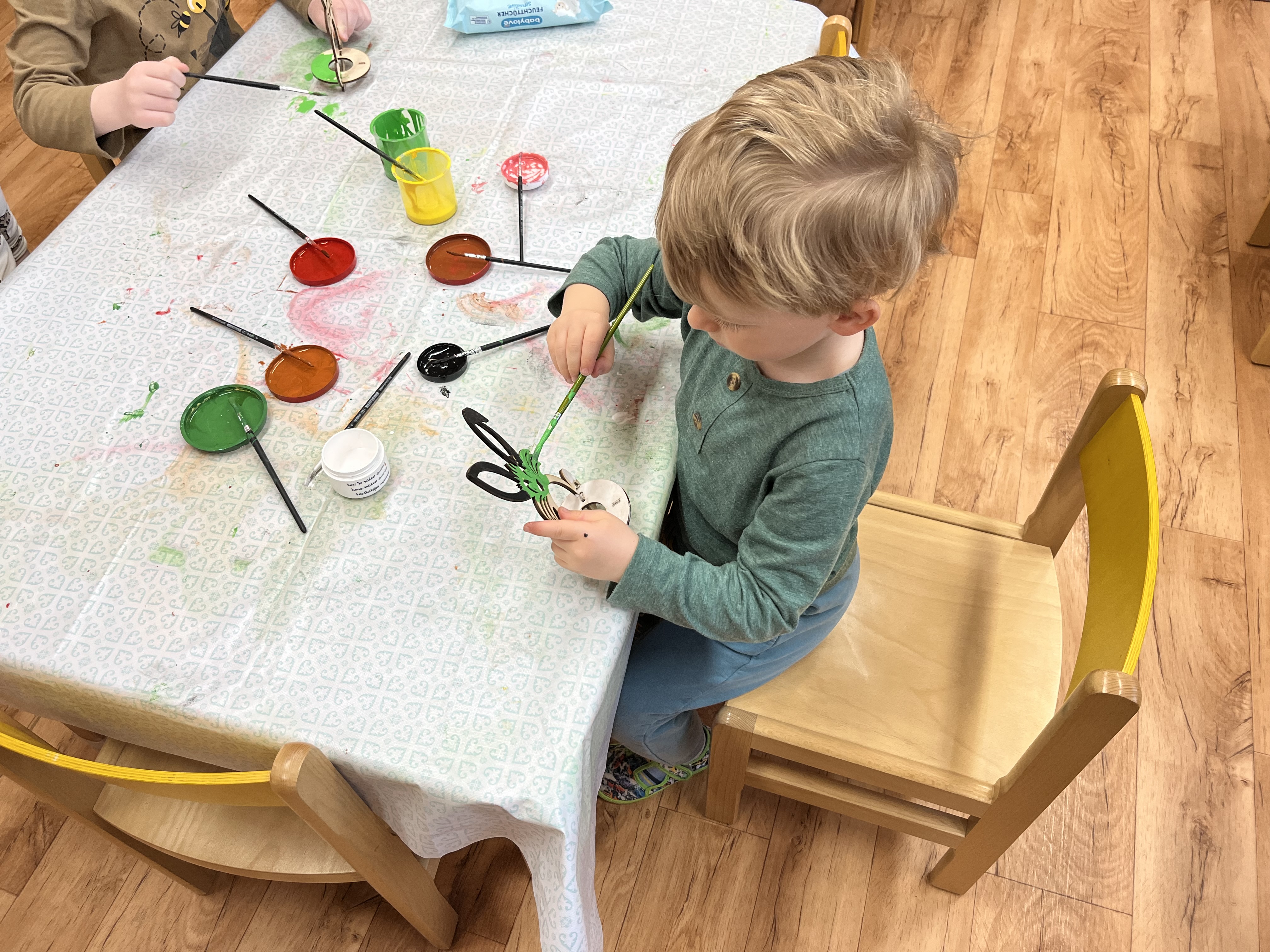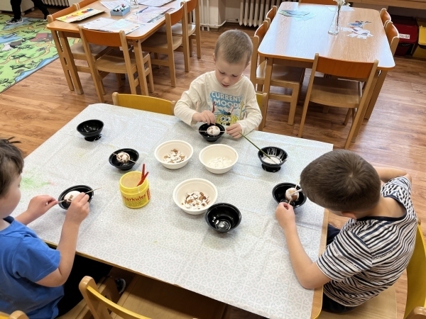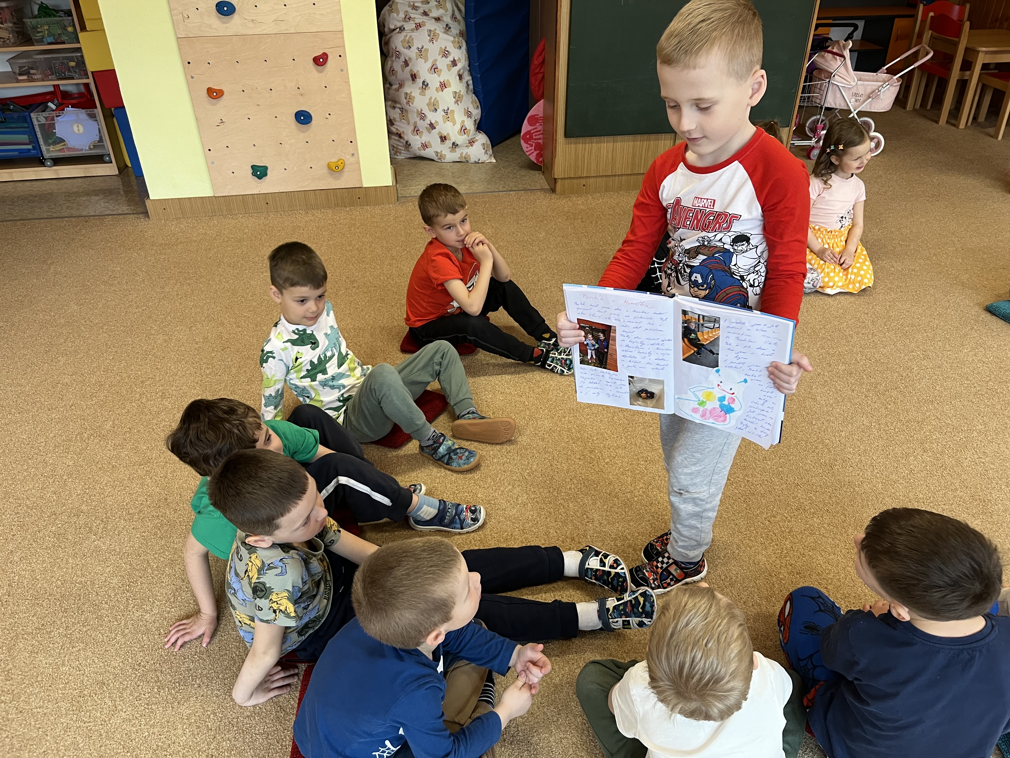 Připravovali jsme se na oslavu velikonočních svátků zdobením osázených květináčů, malováním velikonočního zajíčka a tvořením velikonočních vajíček. Tímto děkujeme rodičům za přinesená vyfouknutá vajíčka. Děti si procvičily grafomotoriku, předčtenářské i předmatematické dovednosti a práci podle pokynů paní učitelky při tvoření domečku pro broučky. Upevňovaly si také správný úchop pastelek při vybarvování omalovánek. Zahráli jsme si hudebně-pohybové hry "Uvíjíme věneček", "Ovečky, ovečky" a "Jarní kytičky". Pohybové aktivity jsme si moc užili – ať už při cvičení na překážkové dráze, s náčiním, při jógovém cvičení či cvičení s duhovým padákem.