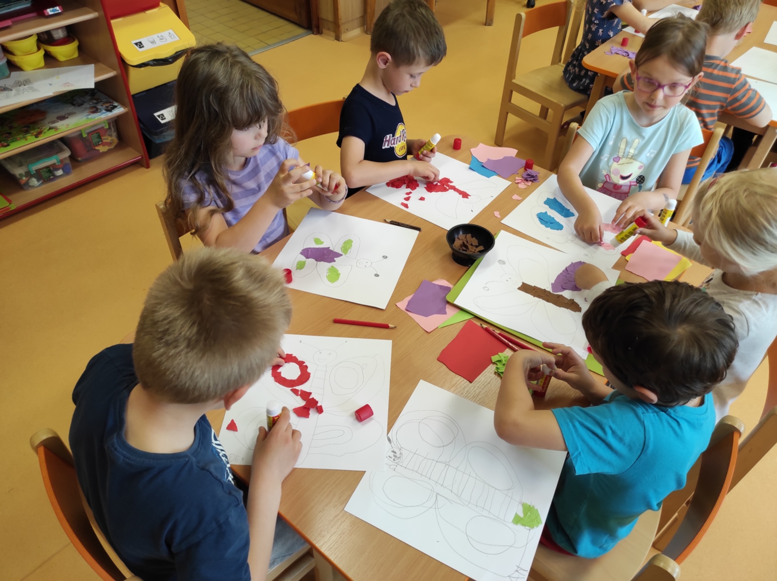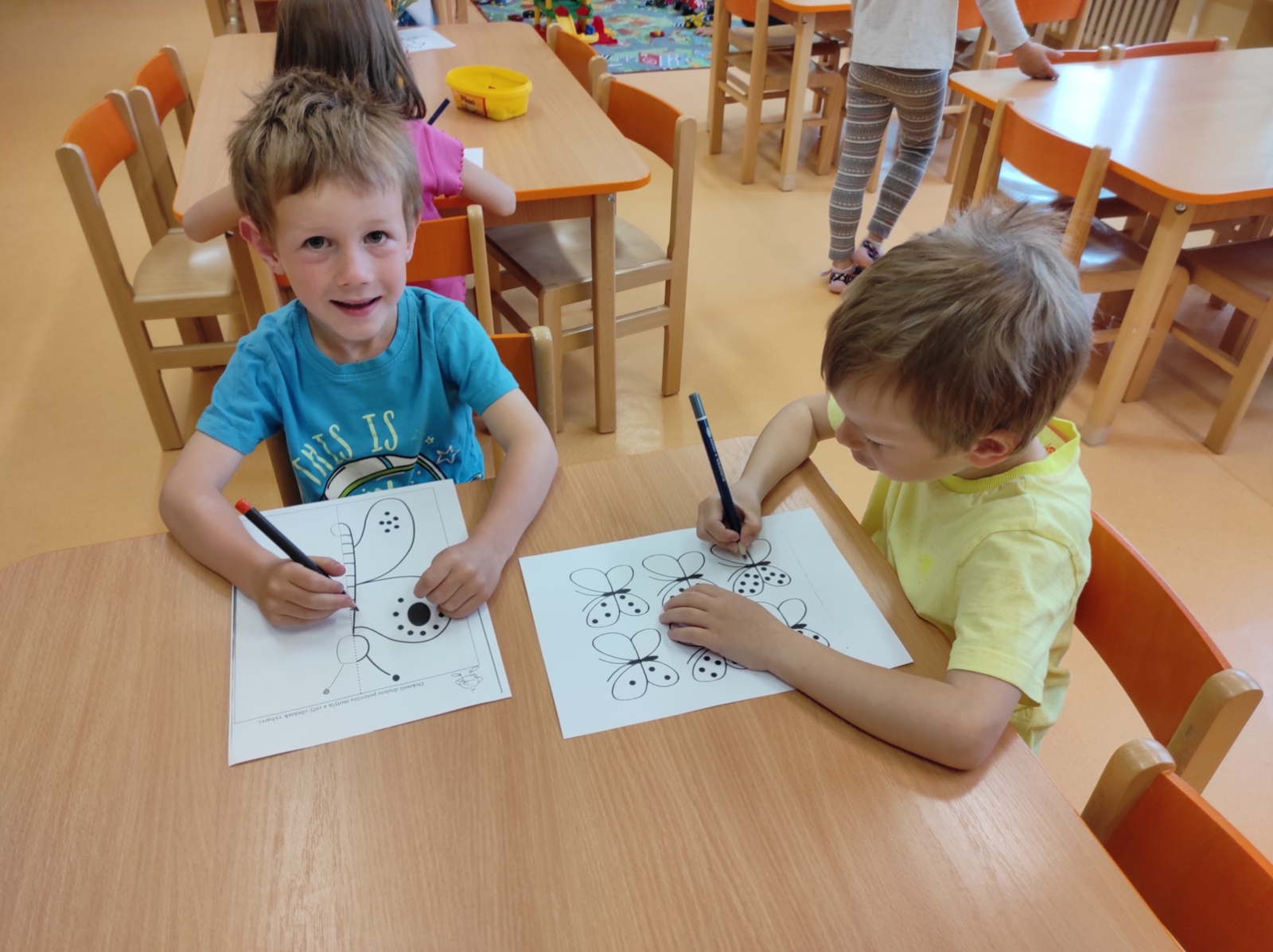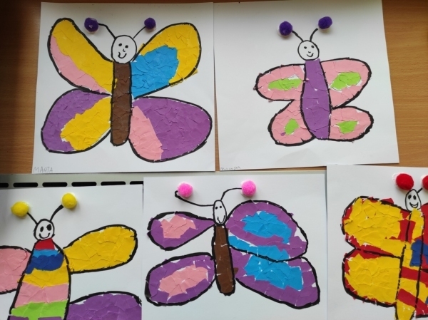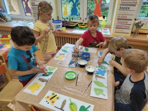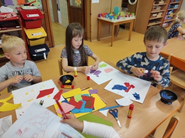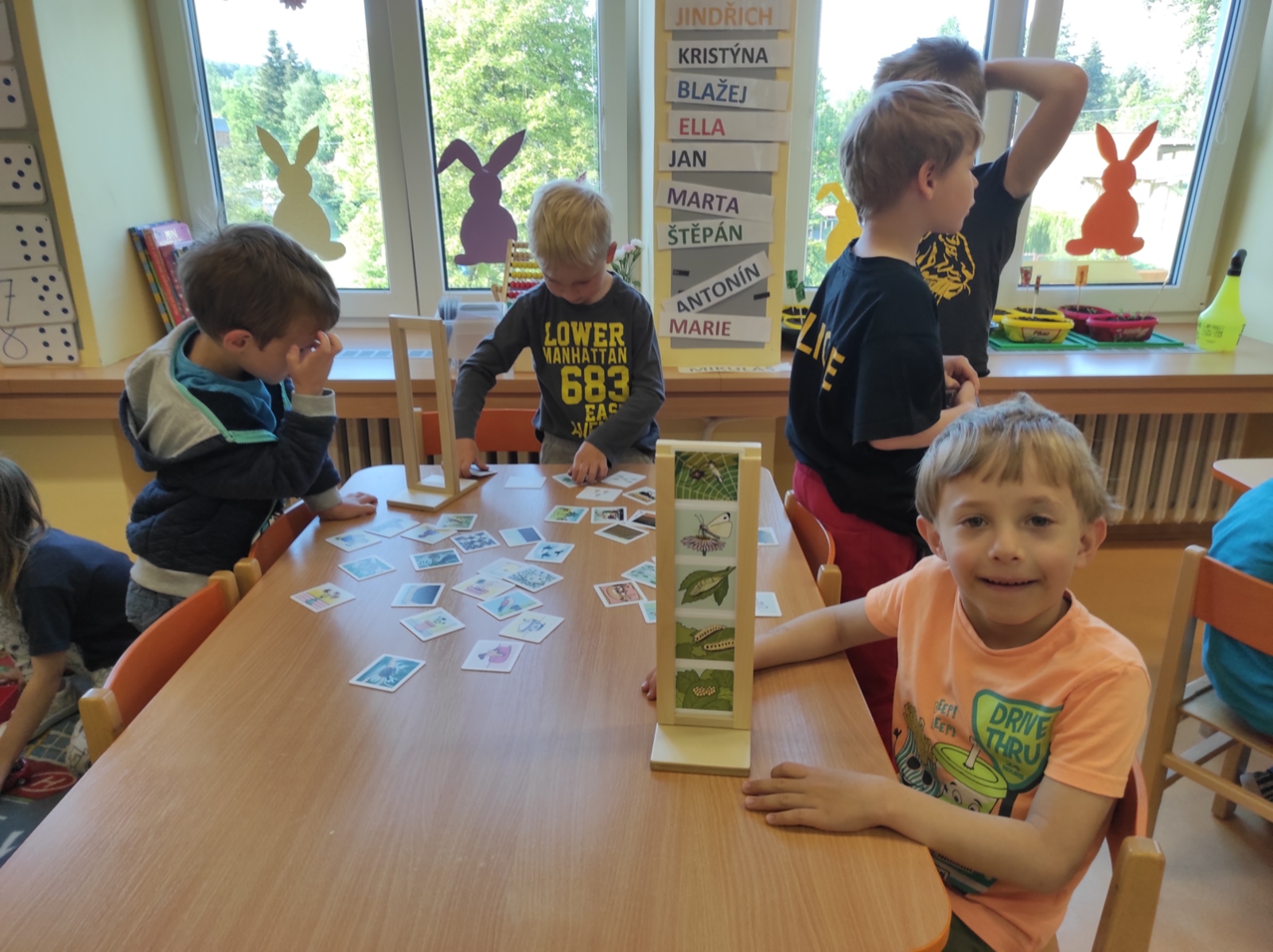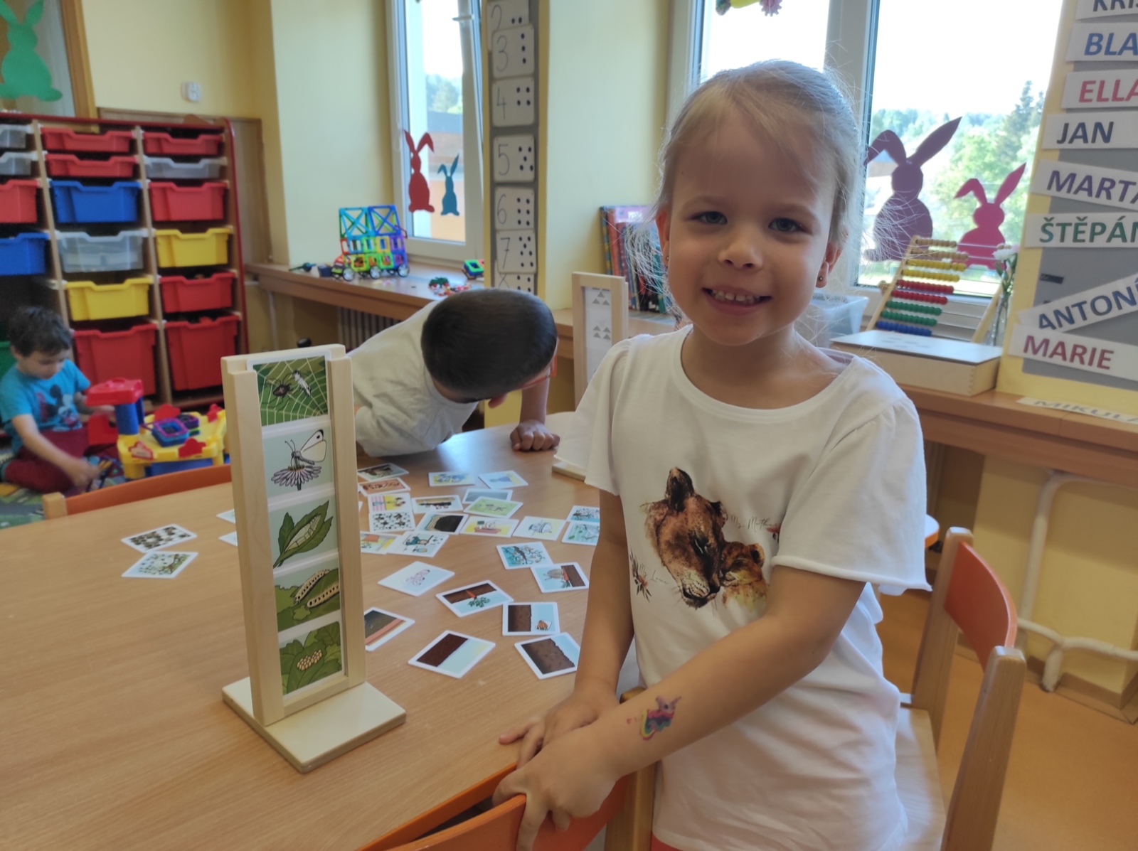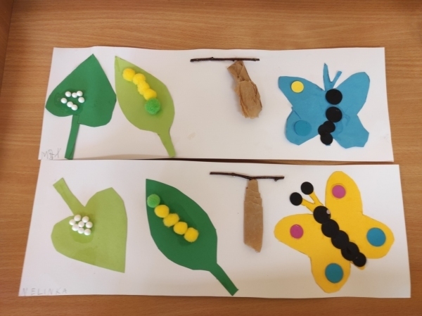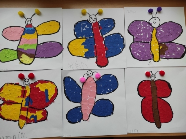 Jak se zrodí motýlek? To už děti ze třídy Sluníček ví. Jednotlivé fáze vývoje motýla jsme si ukázaly na obrázku, pohybově znázornily vlastním tělem, a dokonce i vyrobily. Děti dokreslily polovinu motýlka a zdokonalovaly jemnou motoriku při trhání barevných papírku na ozdobení svého motýlka. Při cvičení s padákem jsme z některých kamarádů vytvořily kuklu a při soutěživých hrách v družstvech jsme zdokonalovaly týmovou spolupráci. Děti pracovaly i s pěknou pomůckou, kde vyhledávaly 5 obrázků, které k sobě patří a poskládaly z nich příběh života. Krásné motýlky děti sestavily i z kamínků. Letí motýl tiše, křidélka má jako z plyše...