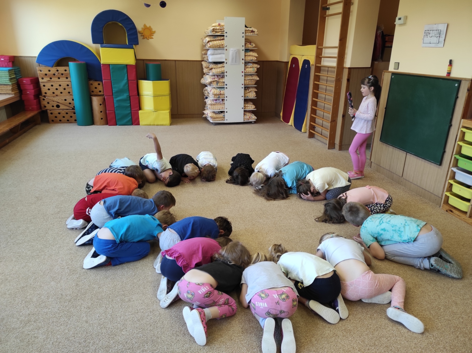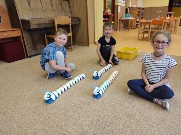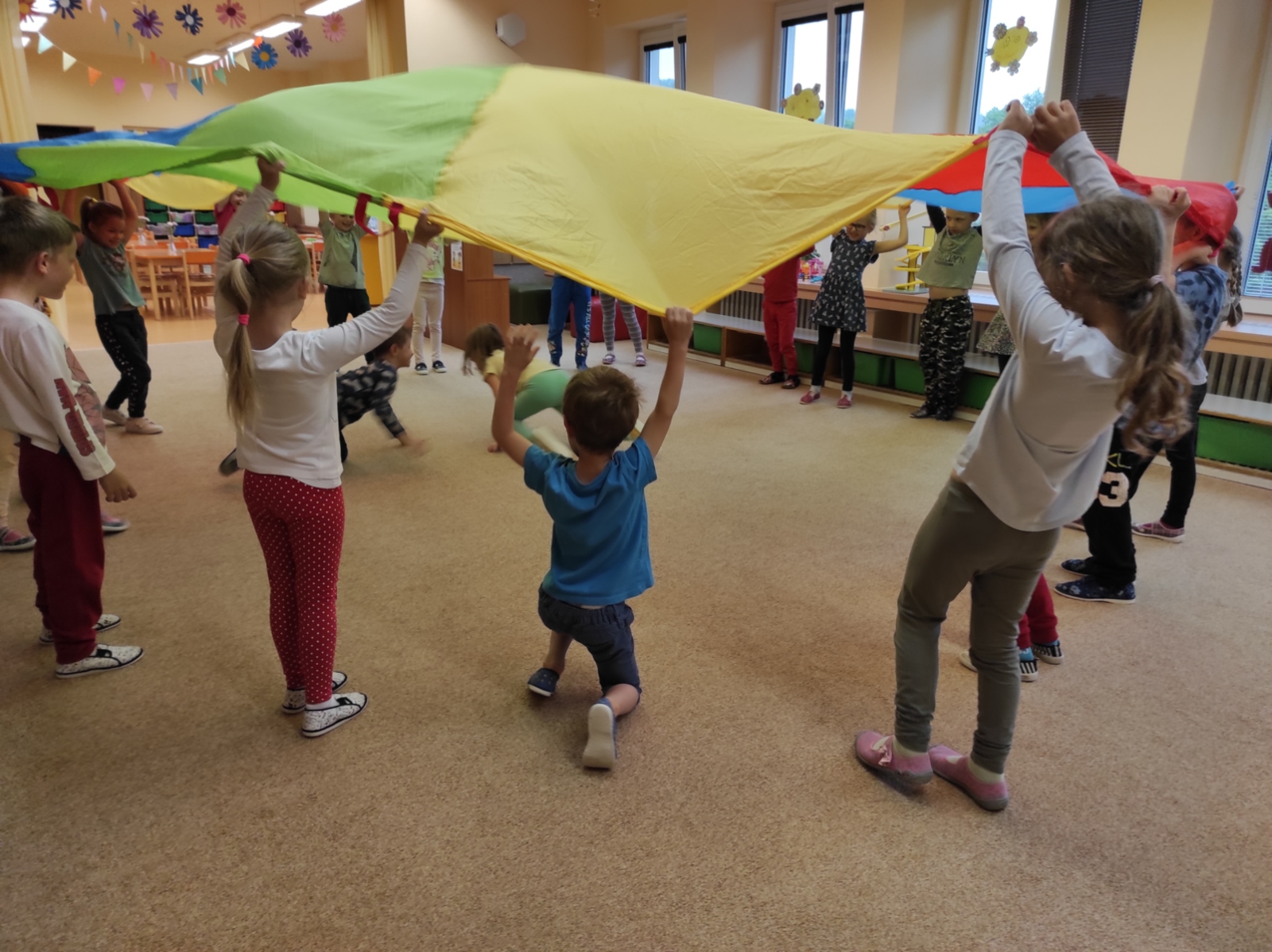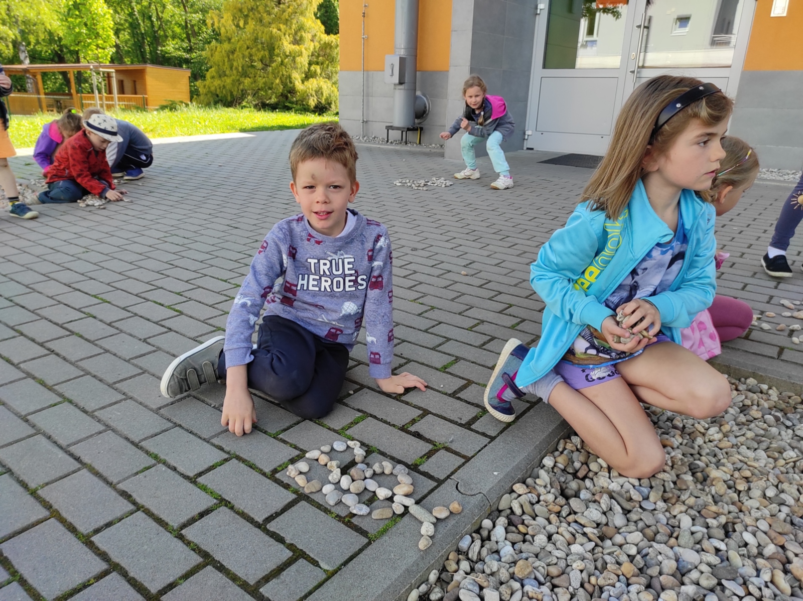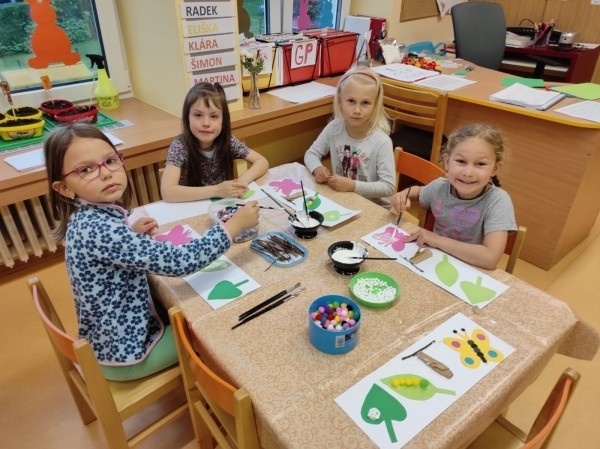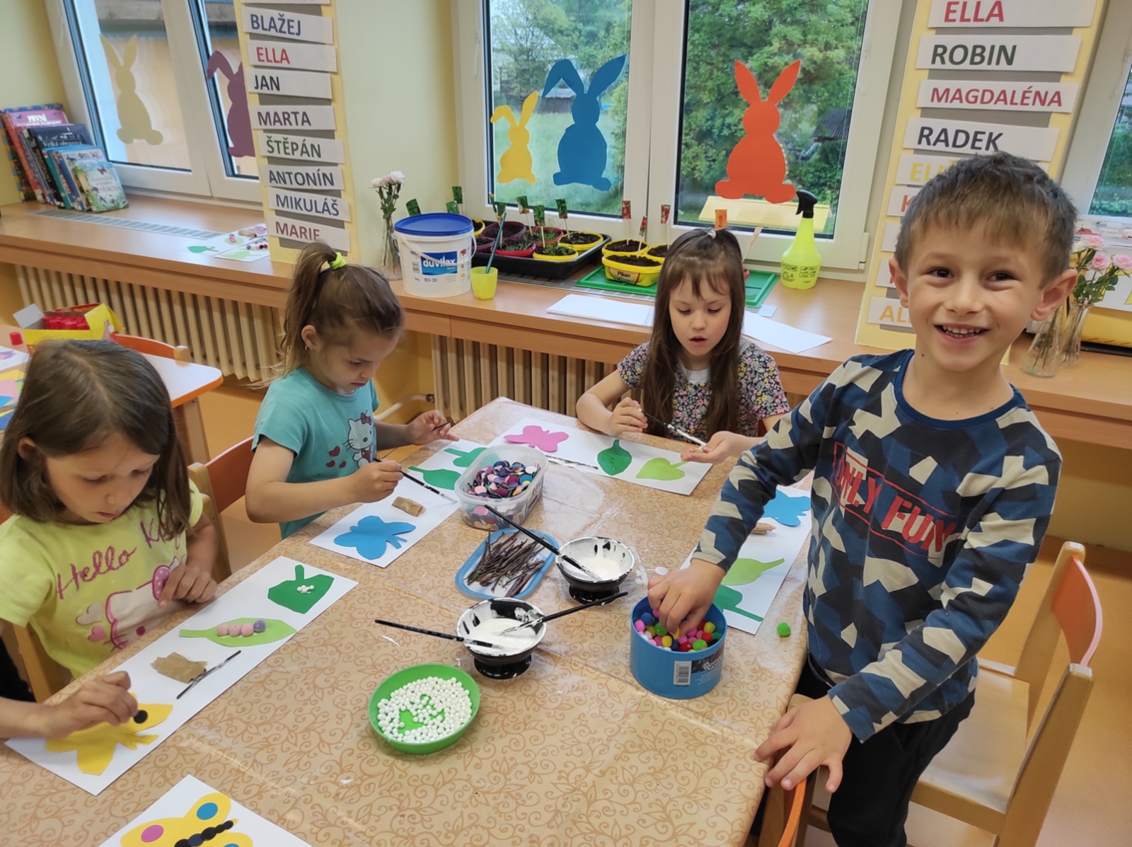 Jak se zrodí motýlek? To už děti ze třídy Sluníček ví. Jednotlivé fáze vývoje motýla jsme si ukázaly na obrázku, pohybově znázornily vlastním tělem, a dokonce i vyrobily. Děti dokreslily polovinu motýlka a zdokonalovaly jemnou motoriku při trhání barevných papírku na ozdobení svého motýlka. Při cvičení s padákem jsme z některých kamarádů vytvořily kuklu a při soutěživých hrách v družstvech jsme zdokonalovaly týmovou spolupráci. Děti pracovaly i s pěknou pomůckou, kde vyhledávaly 5 obrázků, které k sobě patří a poskládaly z nich příběh života. Krásné motýlky děti sestavily i z kamínků. Letí motýl tiše, křidélka má jako z plyše...