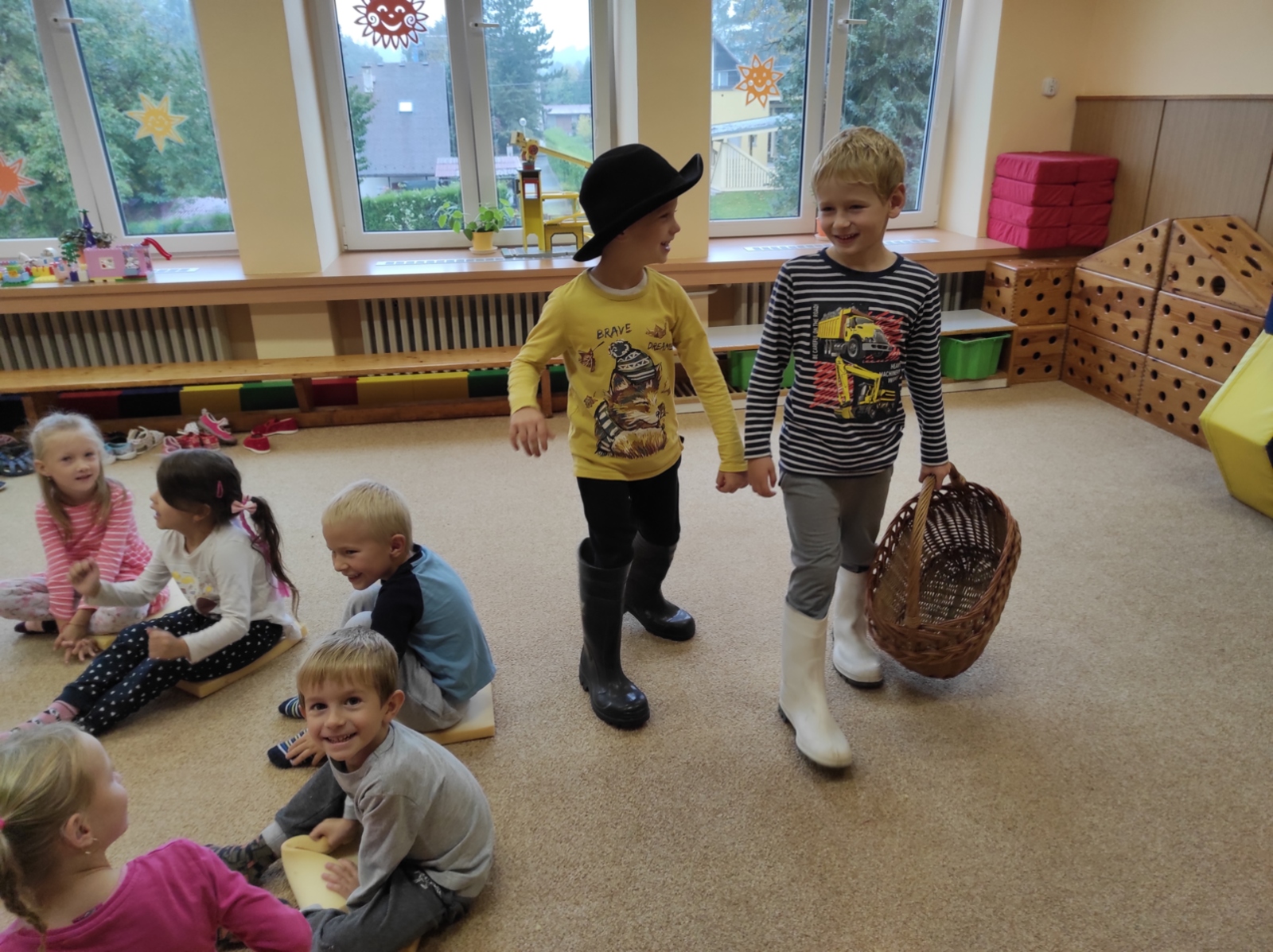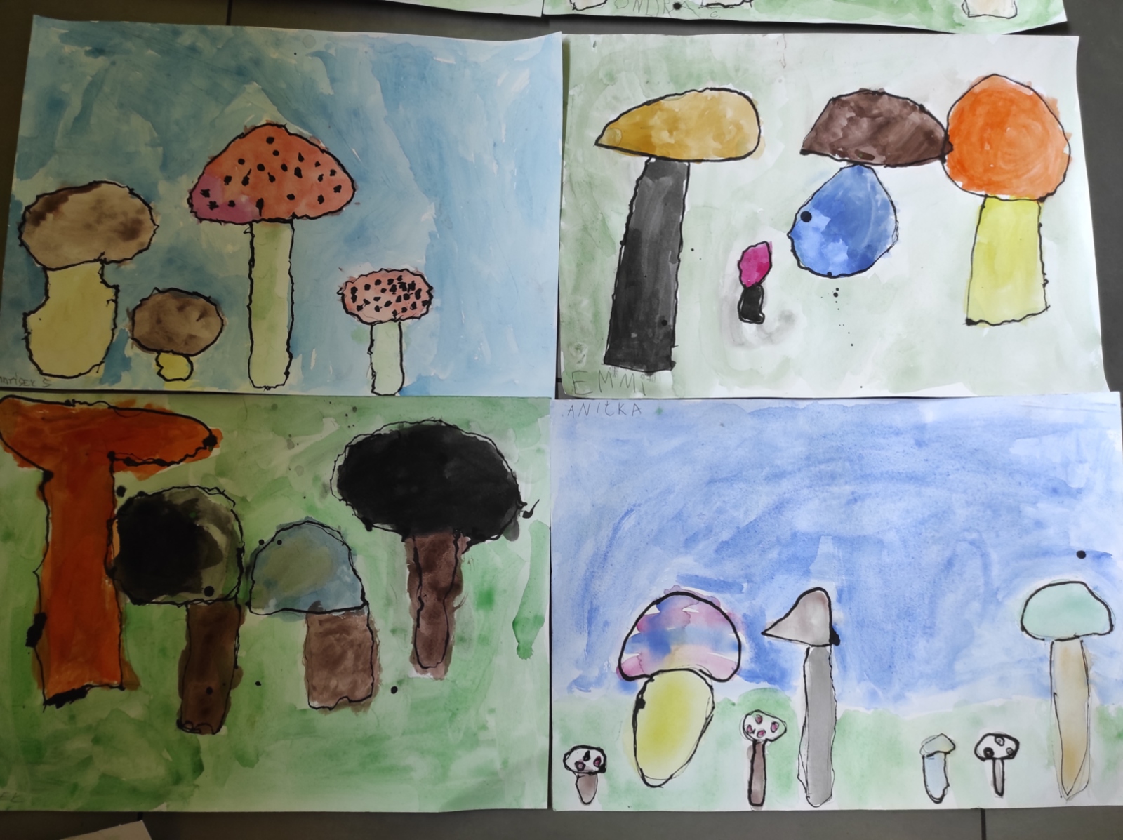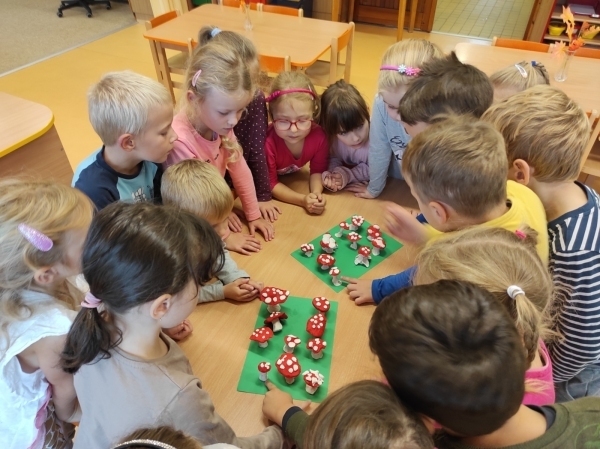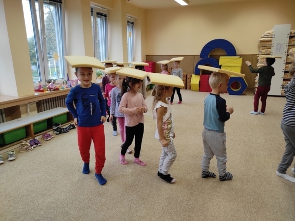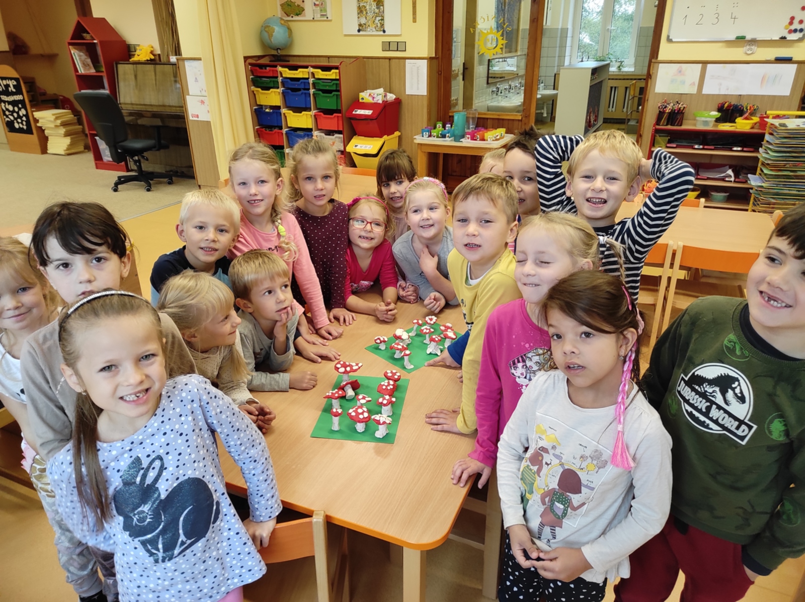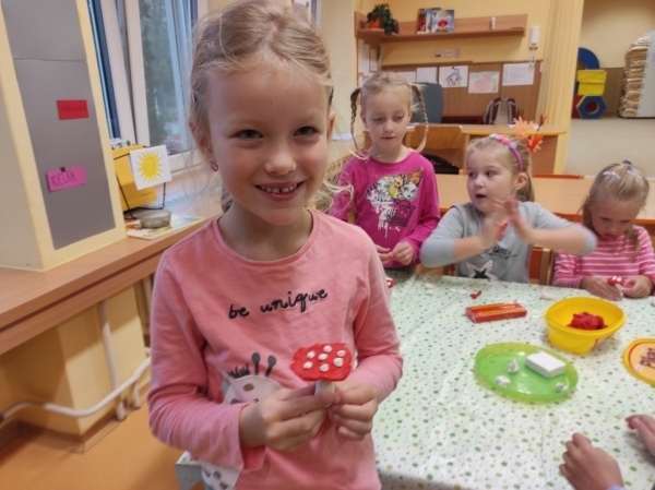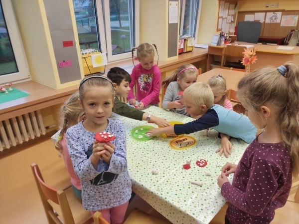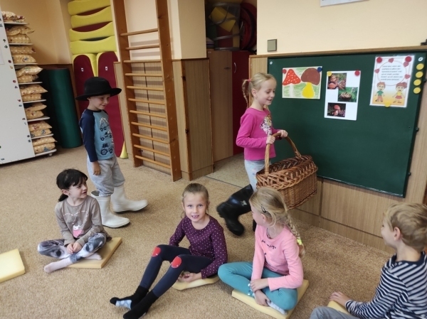 ...hádaly se v lese, kterou z nich si houbař, v košíku odnese. Tahle písnička nás provázela týdnem plným houbaření. Děti se seznámily s atlasem hub, jejich rozdělením, získaly povědomí o různorodosti podob hřibů a jejich zpracování. Pozorování podzimní přírody zrakem i sluchem jsme si užili na krásné procházce v pláštěnkách. Dětem se moc povedlo i zachycení tvaru hub v kresbě, které potom vymalovaly barvami se správným úchopem štětce, a nakonec pečlivě vyznačili linii tuší. V pohybových aktivitách děti zdolávaly možné překážky v lese nebo si vyzkoušely vzpřímený pohyb s kloboučkem na hlavě. Děti zvládly vymodelovat úžasné muchomůrky.