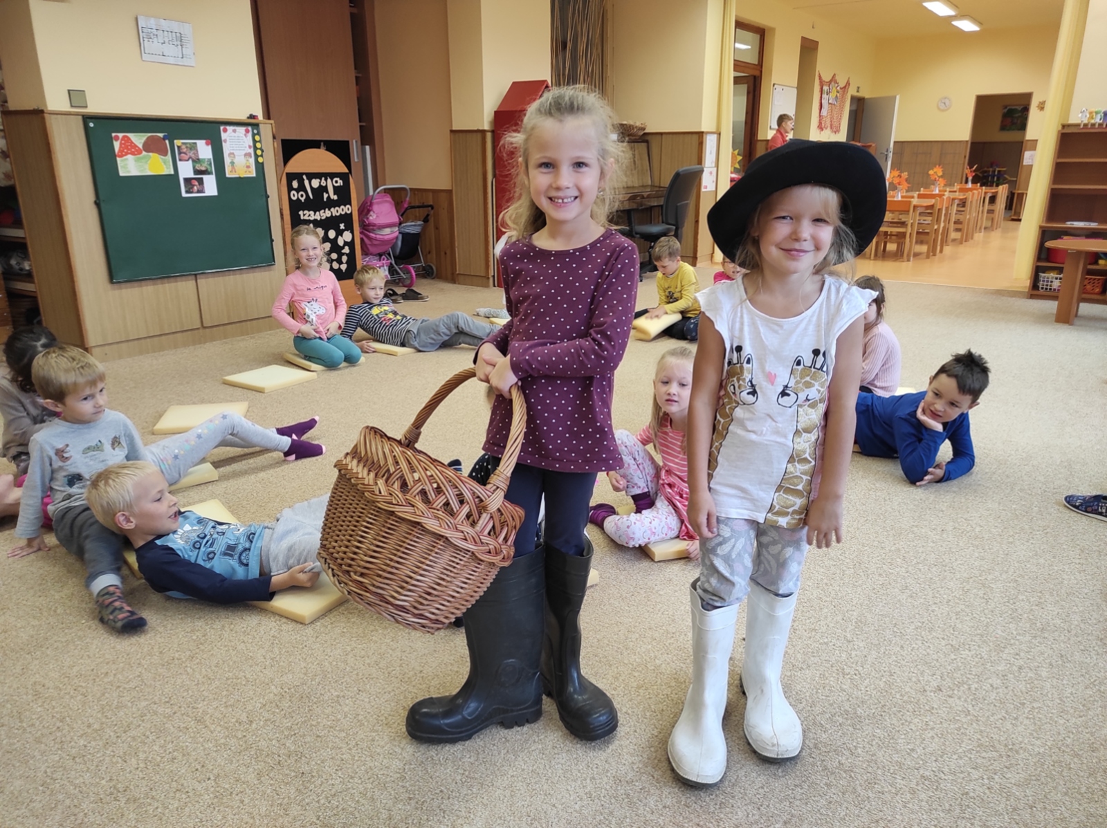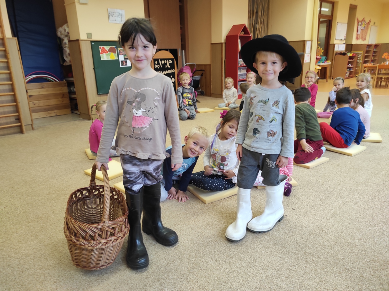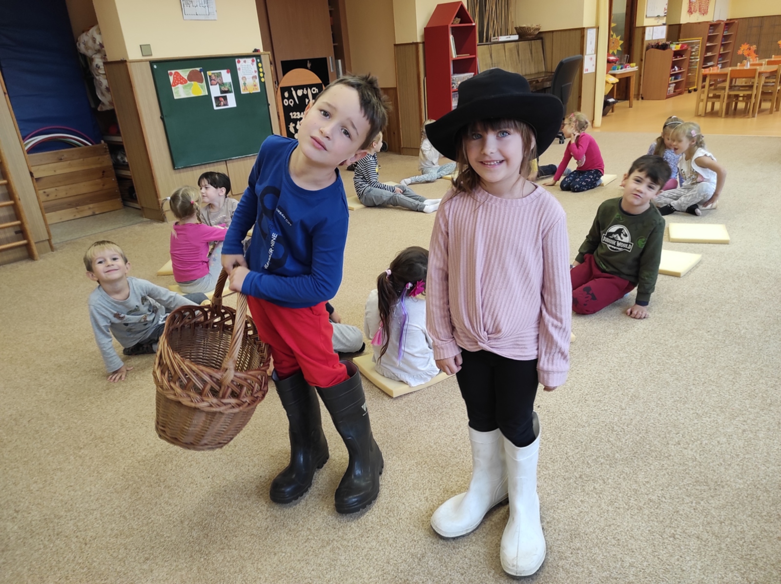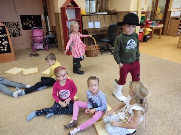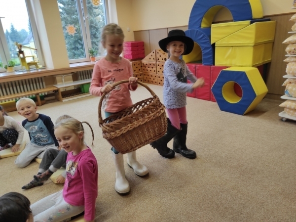 ...hádaly se v lese, kterou z nich si houbař, v košíku odnese. Tahle písnička nás provázela týdnem plným houbaření. Děti se seznámily s atlasem hub, jejich rozdělením, získaly povědomí o různorodosti podob hřibů a jejich zpracování. Pozorování podzimní přírody zrakem i sluchem jsme si užili na krásné procházce v pláštěnkách. Dětem se moc povedlo i zachycení tvaru hub v kresbě, které potom vymalovaly barvami se správným úchopem štětce, a nakonec pečlivě vyznačili linii tuší. V pohybových aktivitách děti zdolávaly možné překážky v lese nebo si vyzkoušely vzpřímený pohyb s kloboučkem na hlavě. Děti zvládly vymodelovat úžasné muchomůrky.