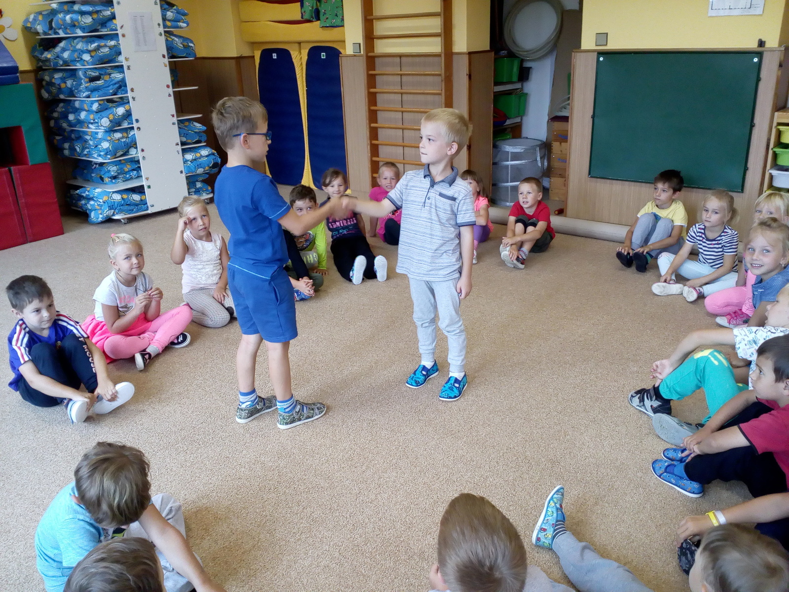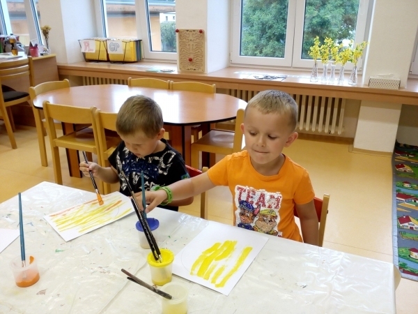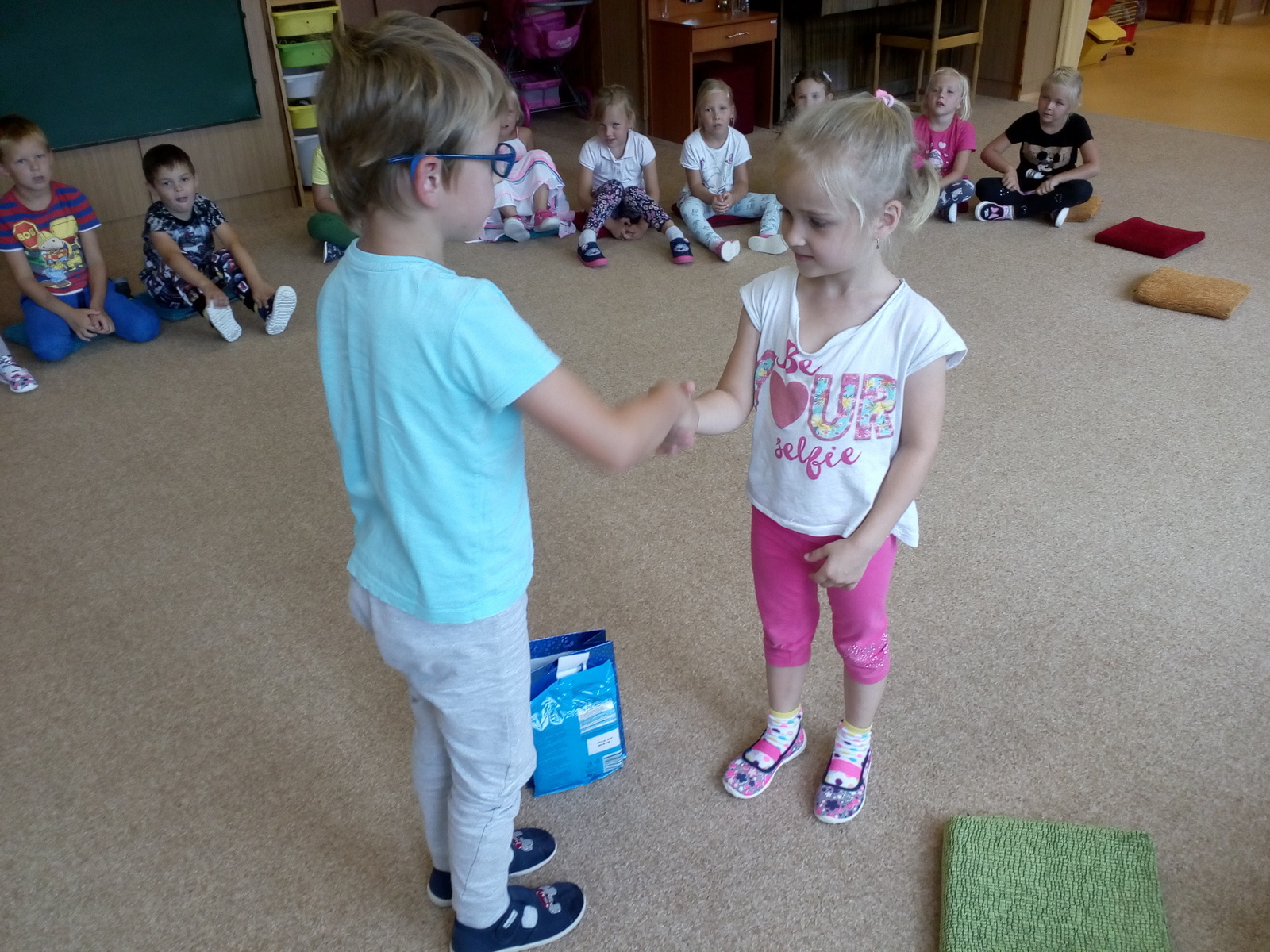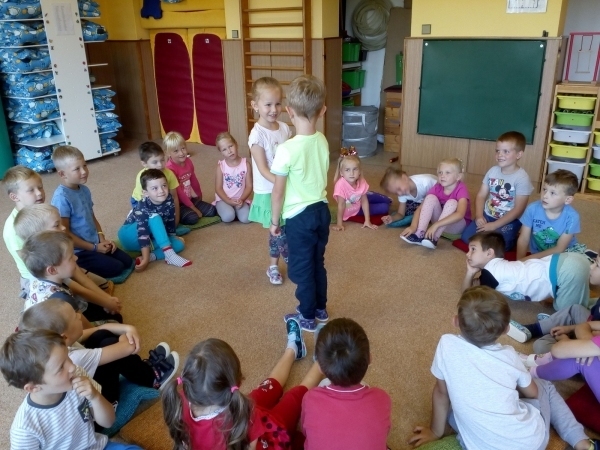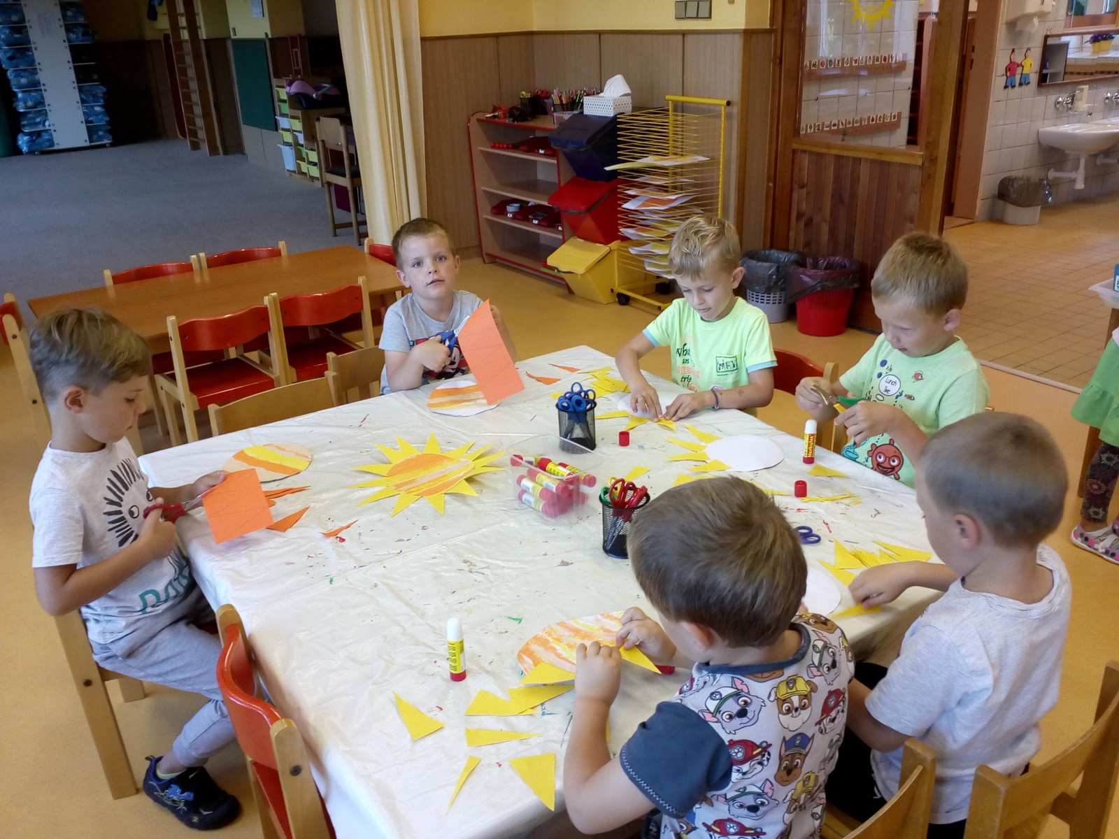 V prvním týdnu tohoto školního roku byly děti uvedeny do třídy Sluníček, ve které spolu prožijí nový školní rok. Na malé exkurzi ve školní kuchyni a jídelně se děti seznámily s prací našich šikovných paní kuchařek. Navštívily kamarády ze tříd Motýlků a Soviček, popřály několika kamarádům k narozeninám a svátku, naučily se novou píseň "Jsme kamarádi" a vyrobily si sluníčko. V neposlední řadě se seznámily s bezpečností chování v mateřské škole a při pobytu venku.