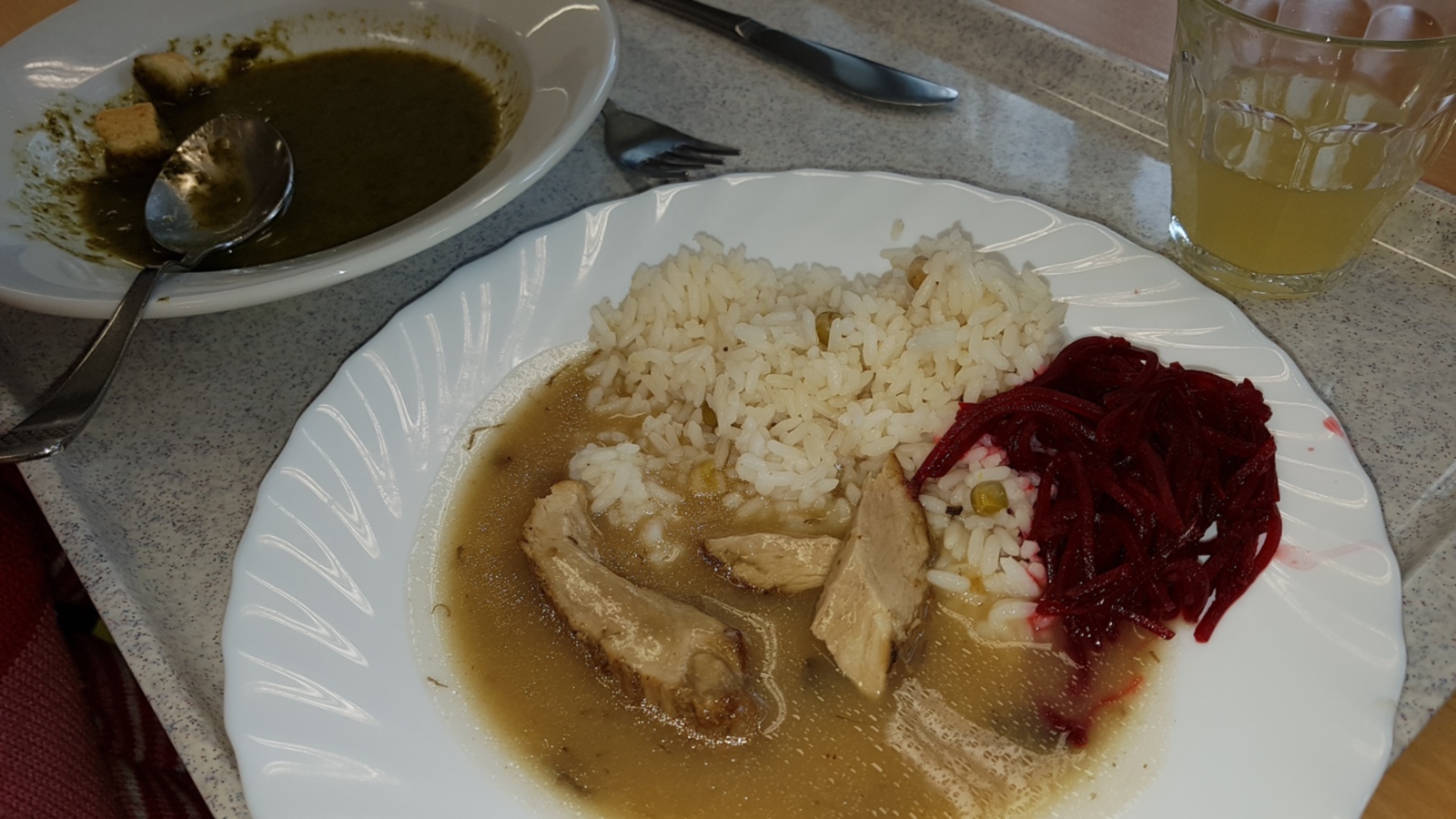 Představte si, představte si, co jsem měl dnes k obědu, špenátovou polévku, teď už sílu naberu, dušené vepřové, snědli jsme ho, jak by ne, to koukáte, to koukáte, co jsem měl dnes k obědu!