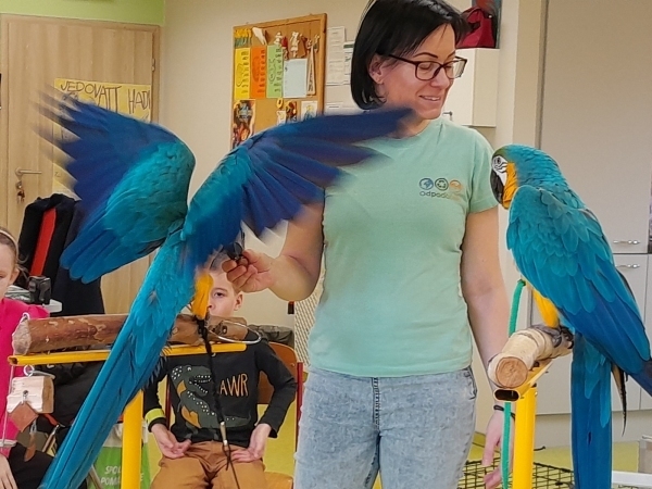Dnes nás v družině navštívila milá paní Alena Majetná se svými papoušky Ara Ararauna Agátkou a Artuškem. Vyprávěla nám, jak se o ně stará, čím je krmí, co jim nevíce chutná. Víte, že se dá i papoušek venčit? Oba totiž patří mezi volnoletce. Dozvěděli jsme se, kolik měří jejich nejdelší ocasní pero, jaké mají rozpětí křídel, kolik váží a spoustu dalších zajímavostí.
