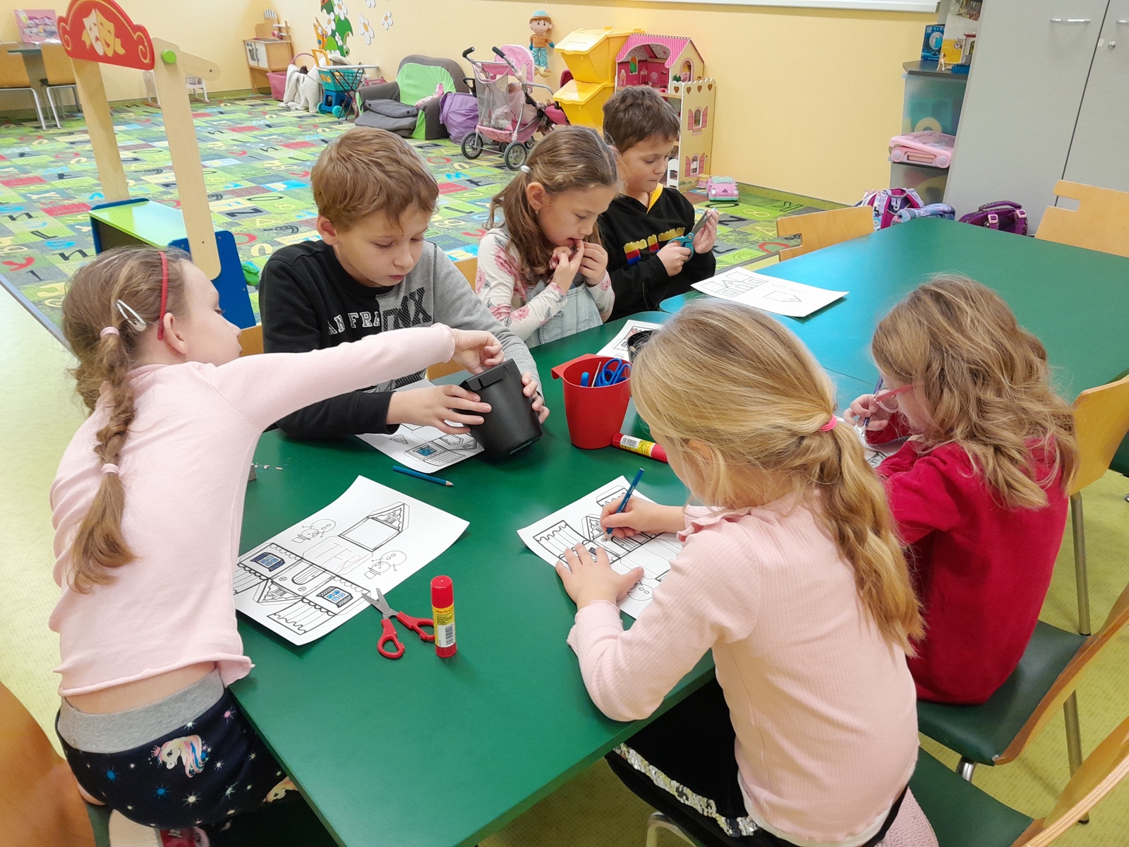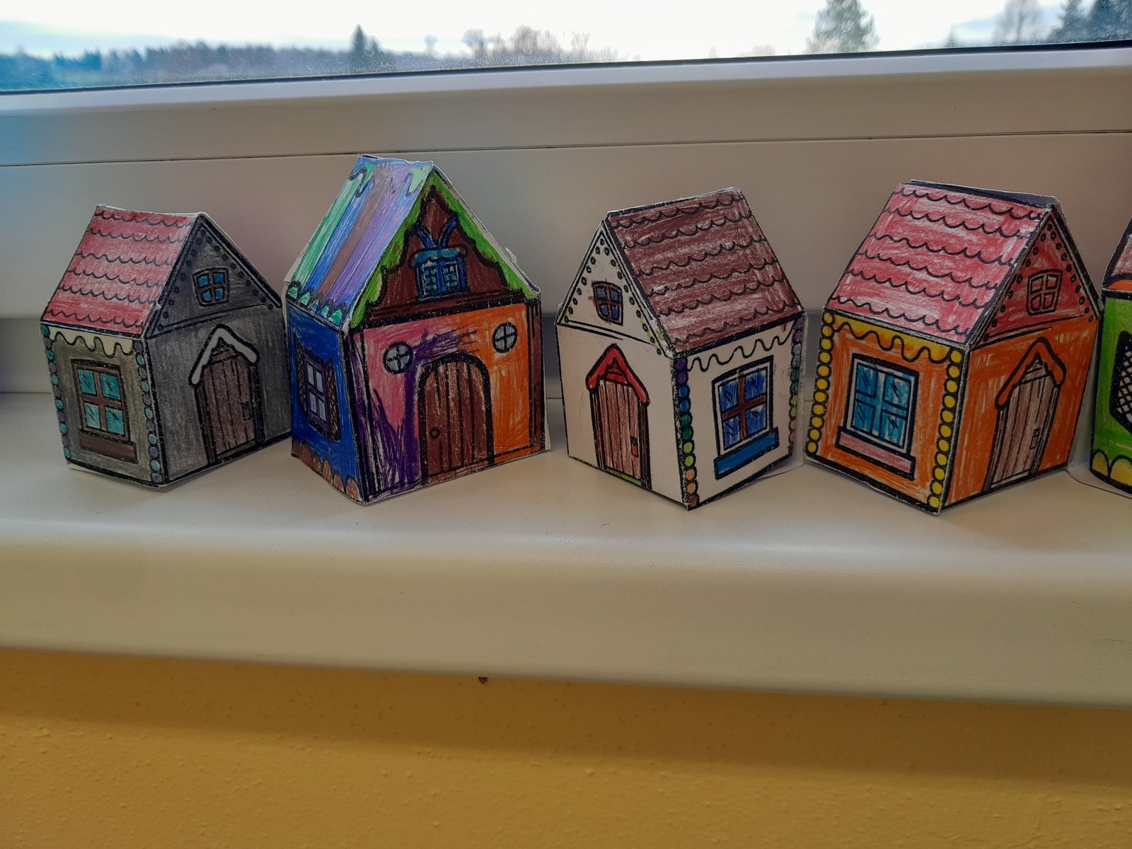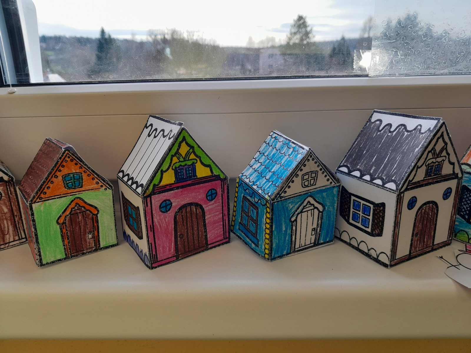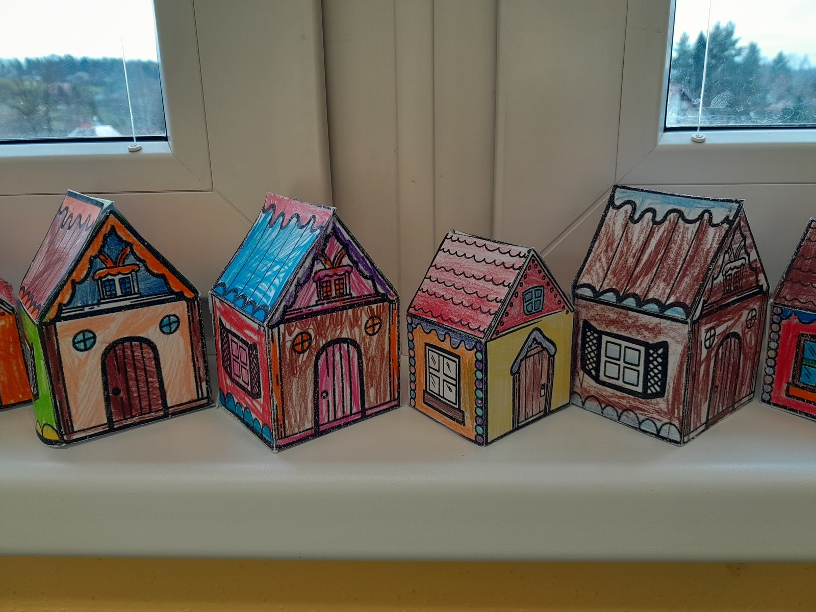 Vvbarvovali jsme, vystřihovali, skládali a slepovali malé domečky, ze kterých jsme stavěli městečko.