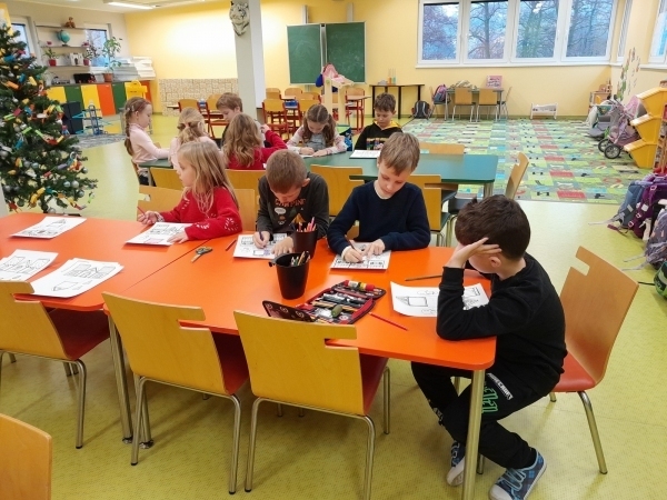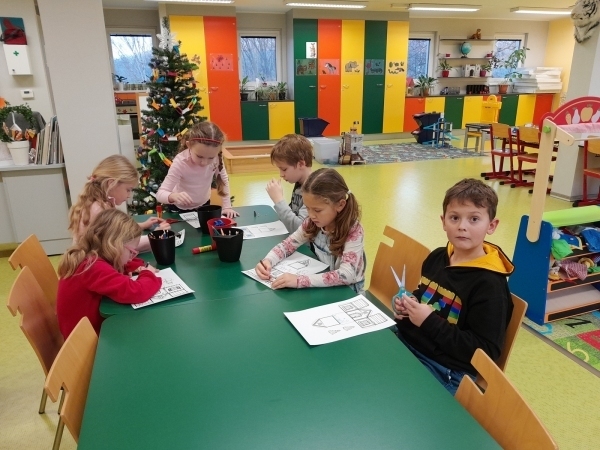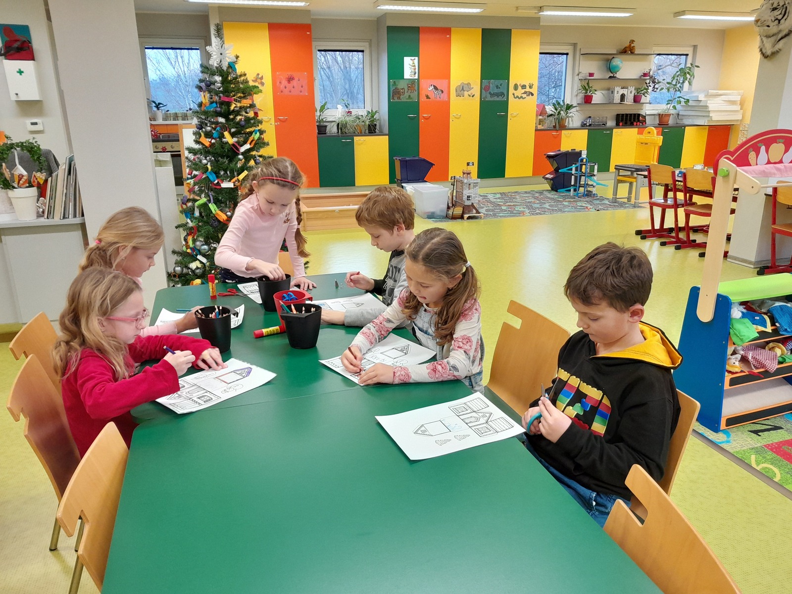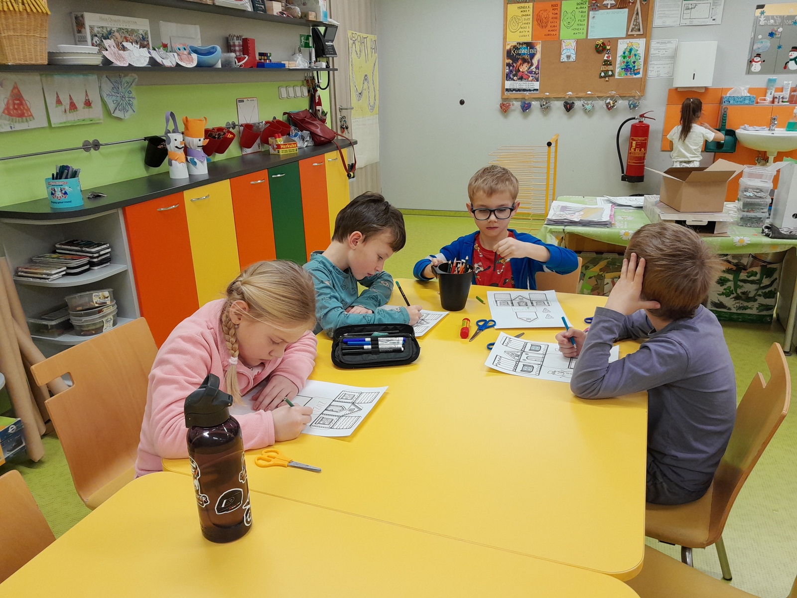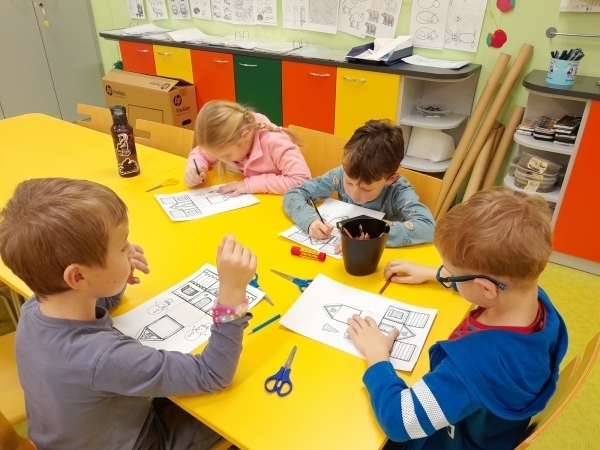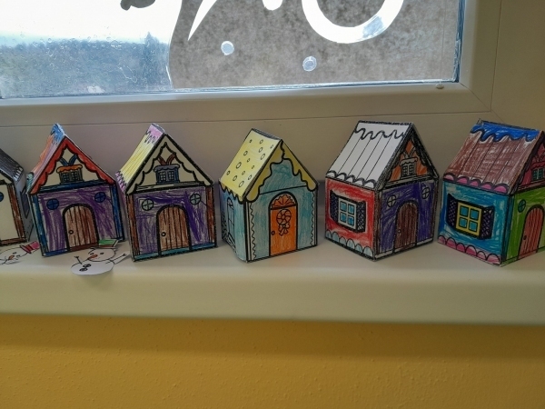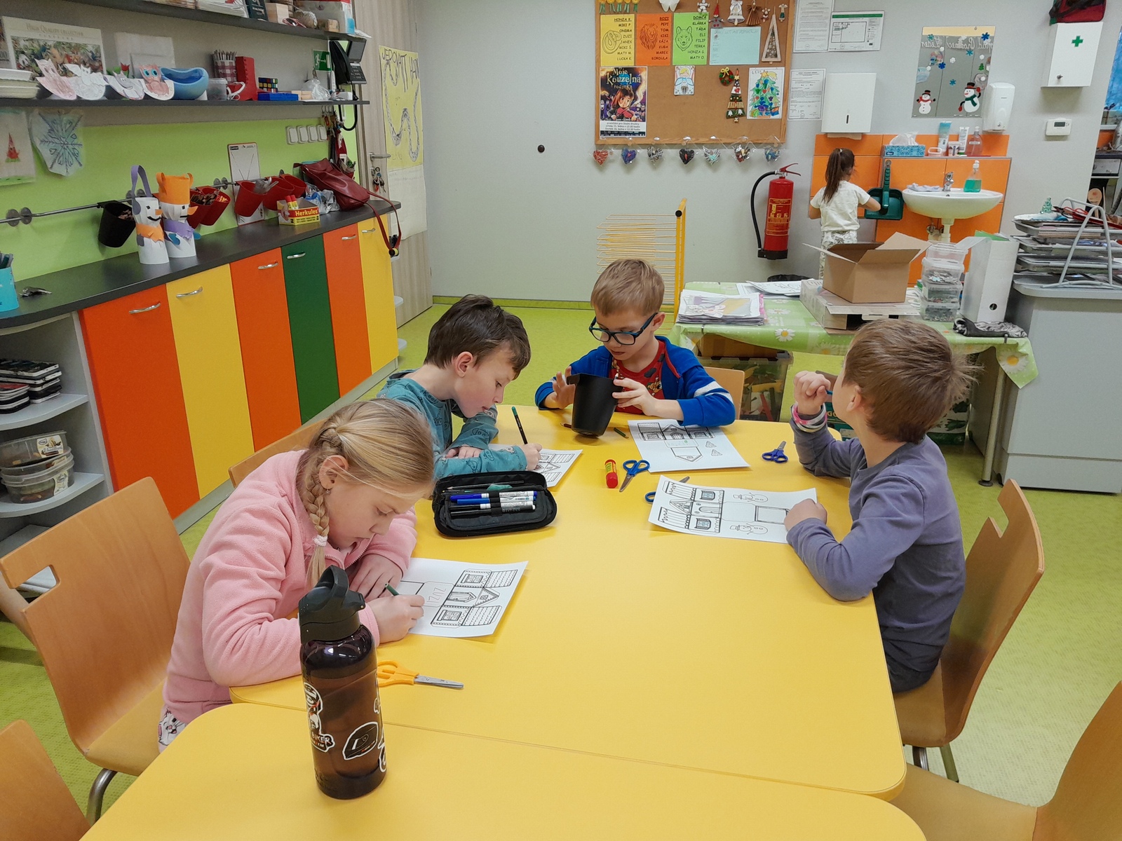 Vvbarvovali jsme, vystřihovali, skládali a slepovali malé domečky, ze kterých jsme stavěli městečko.