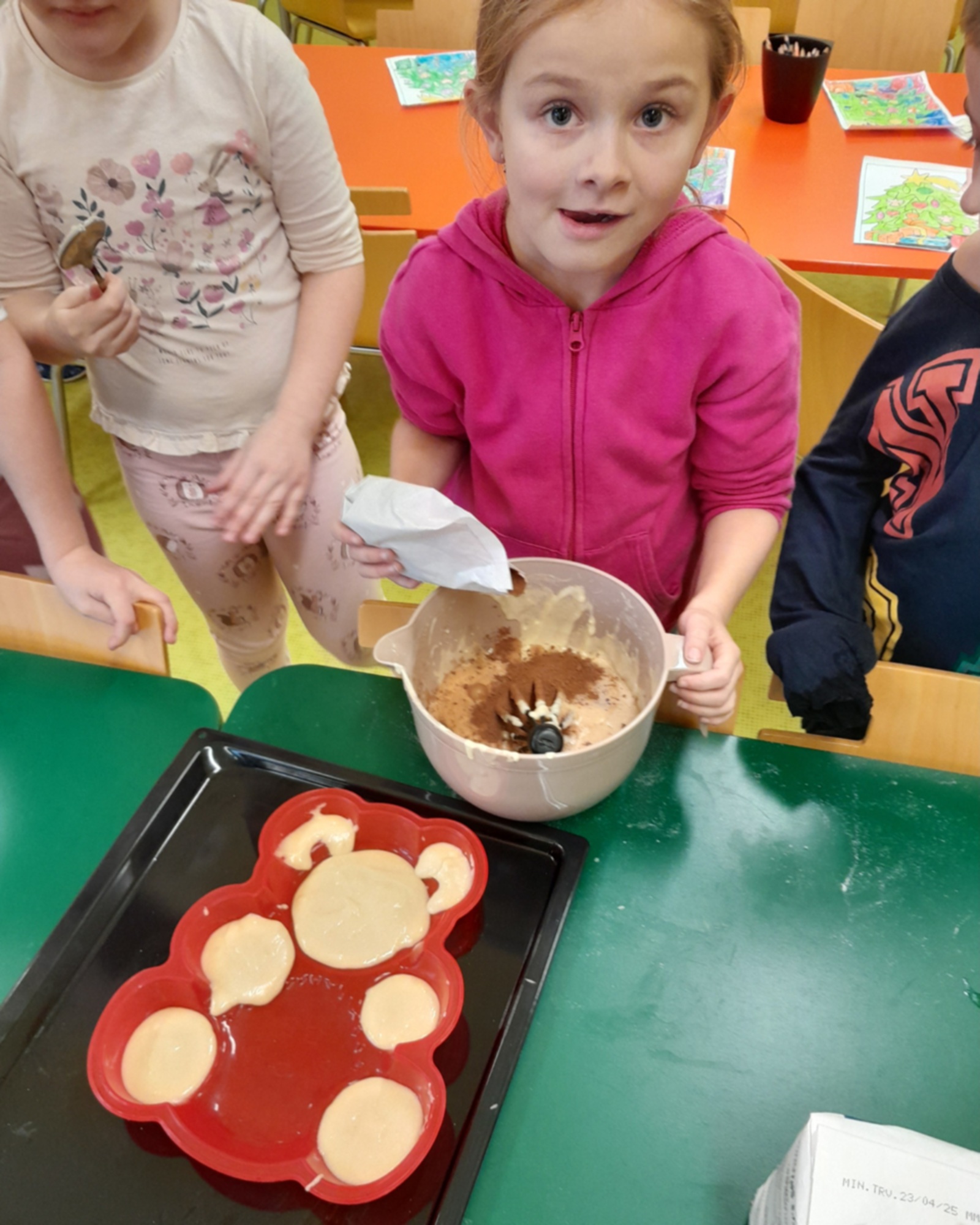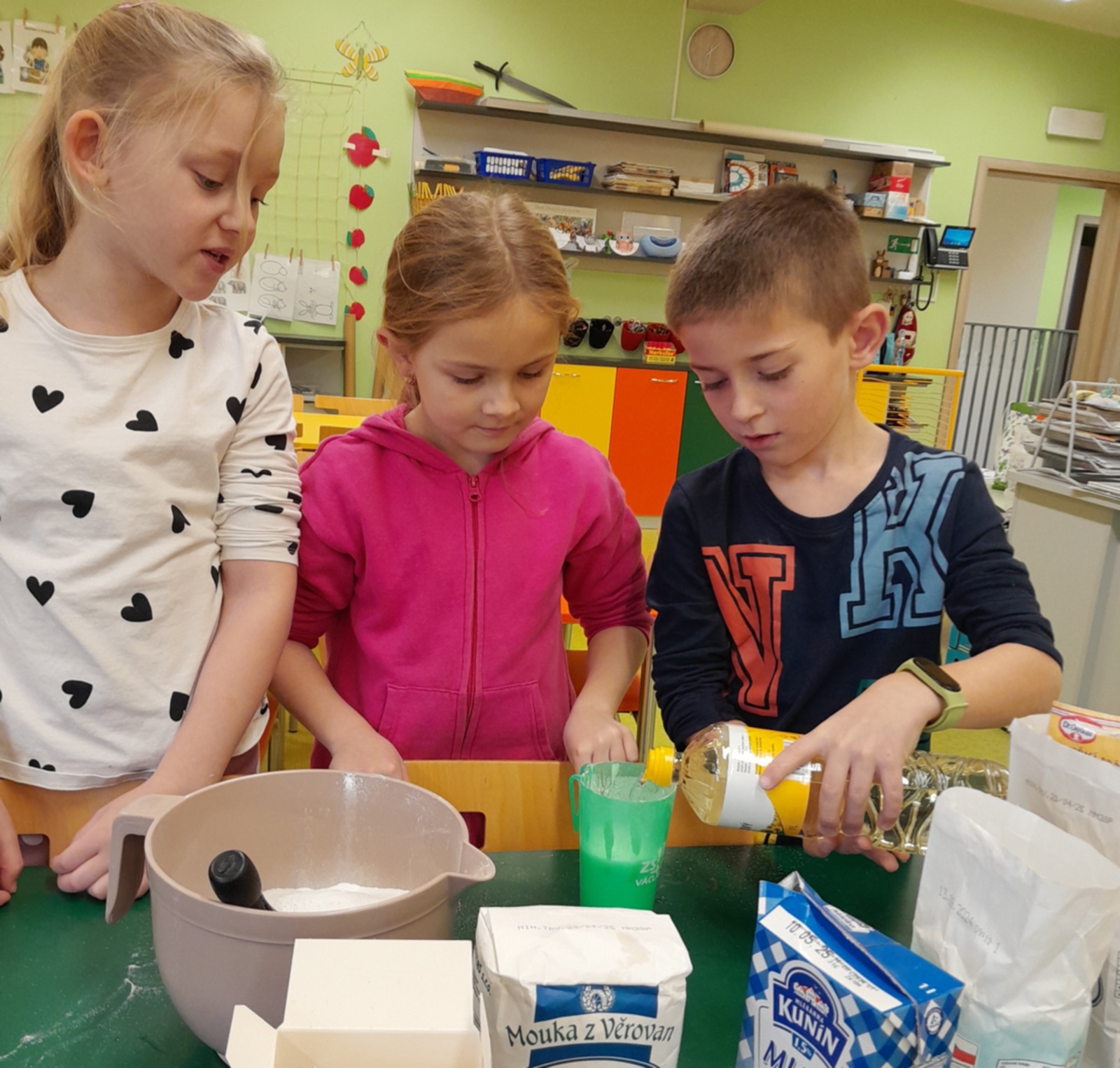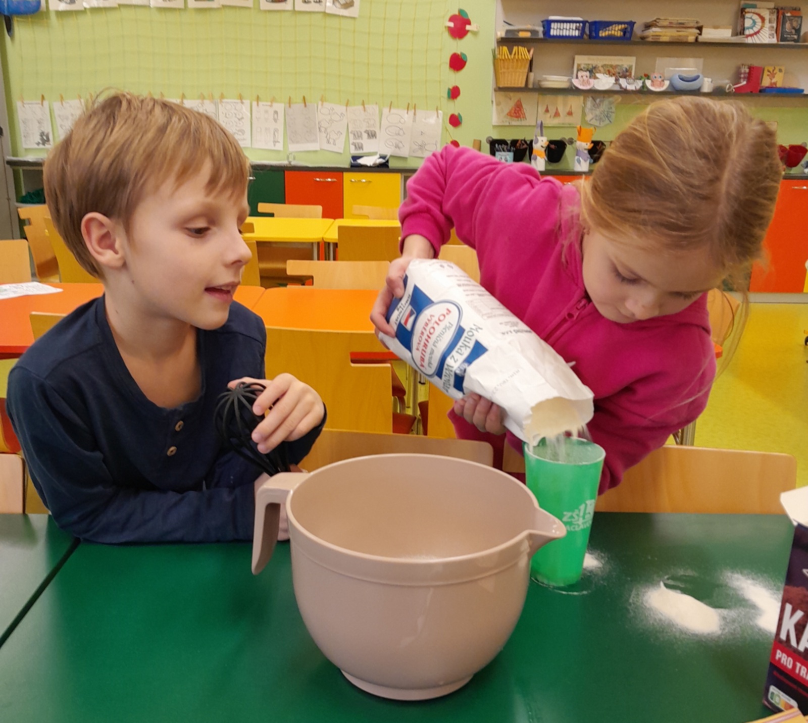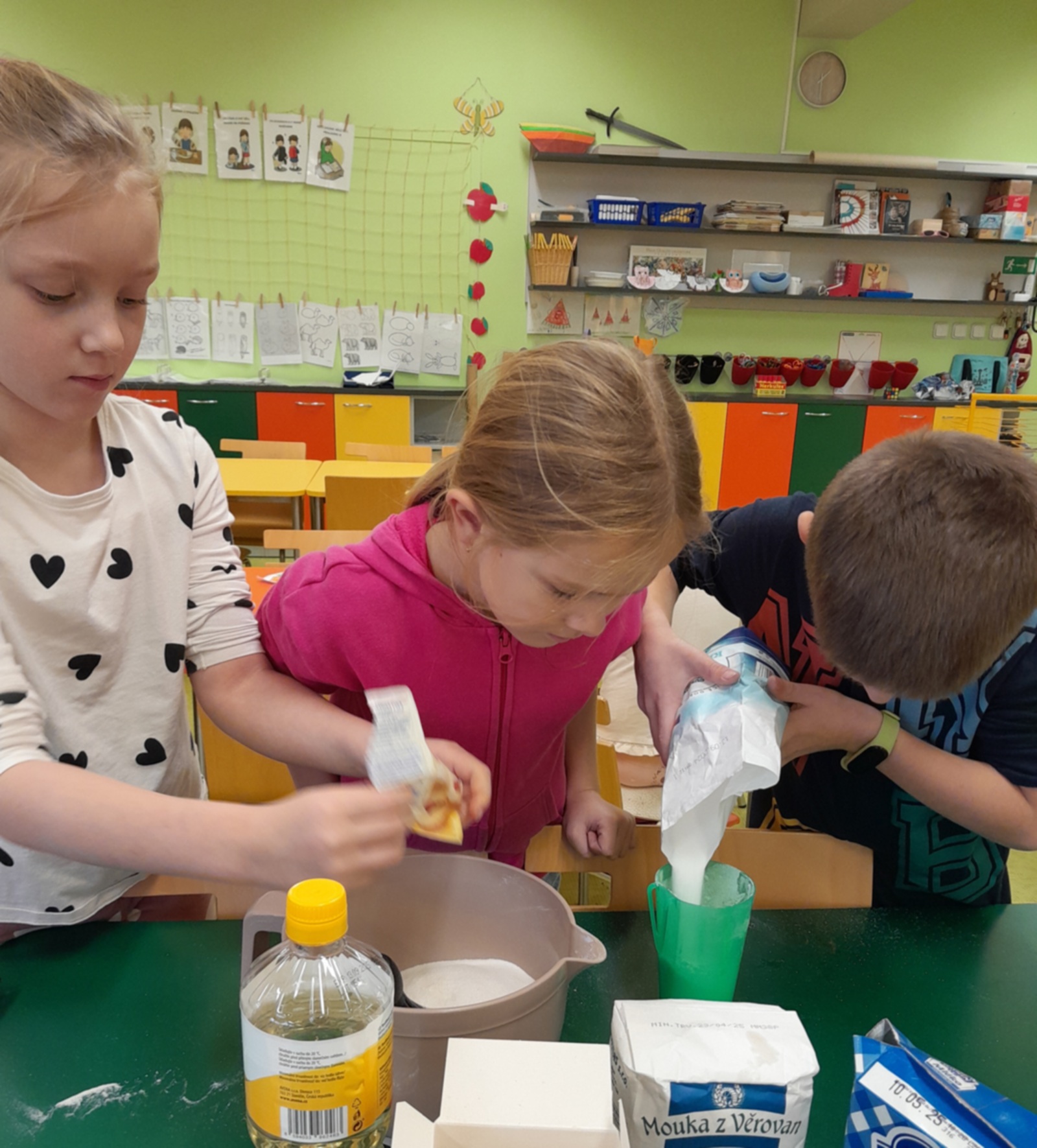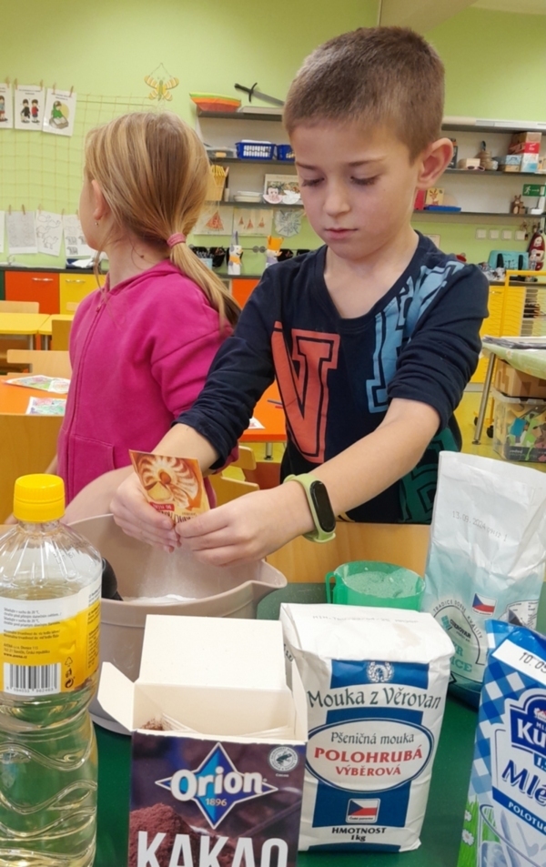Připravili jsme si suroviny a pečlivě je odměřovali a dávkovali do mísy. Po vymísení jsme těsto přežily do připravené formy a šup s ní do trouby. Krasná vůně nás po čase upozornila, že máme upečeno!
