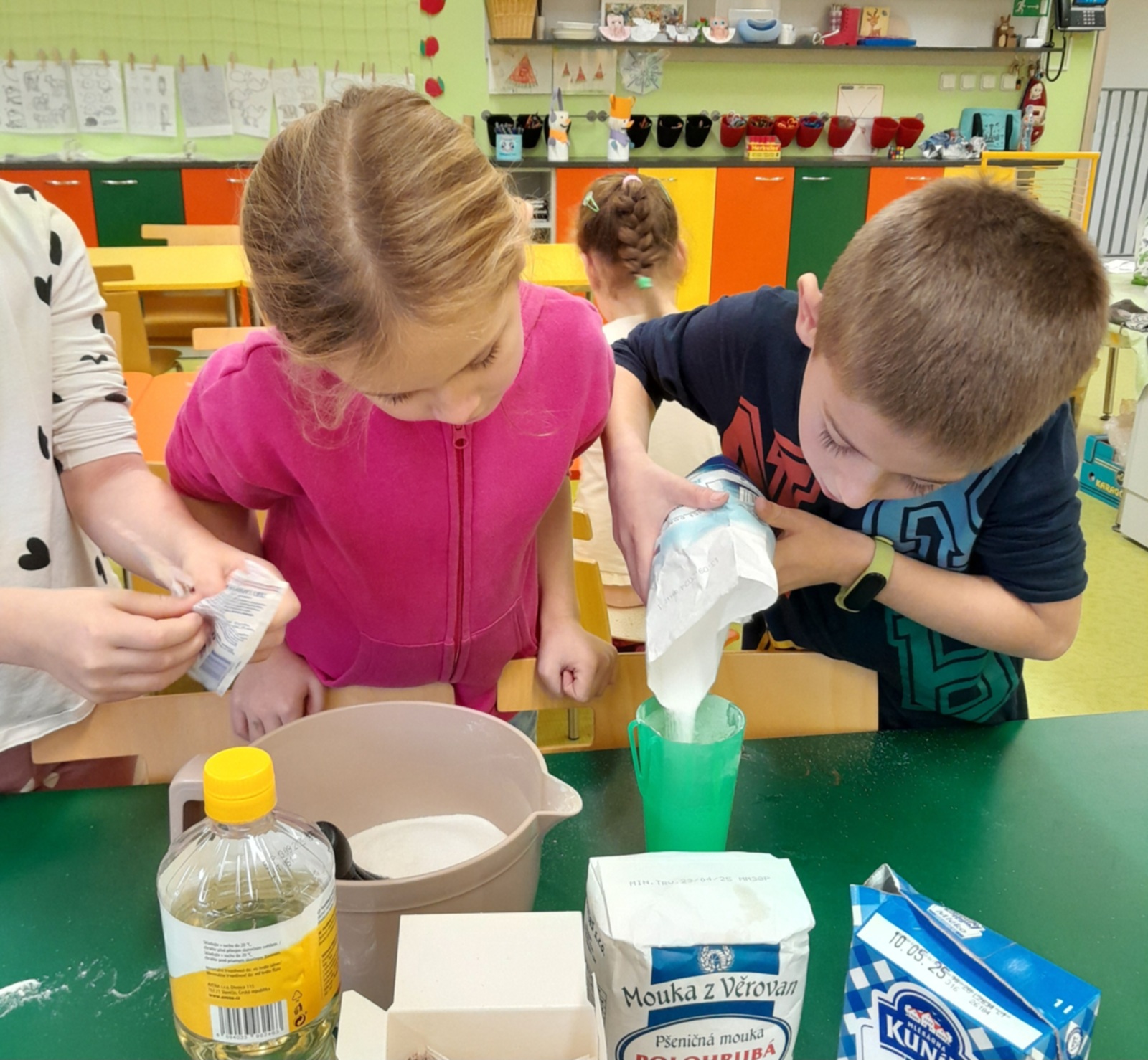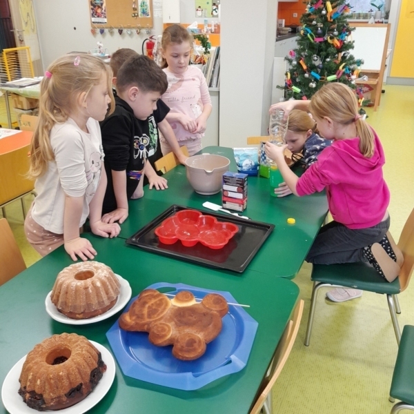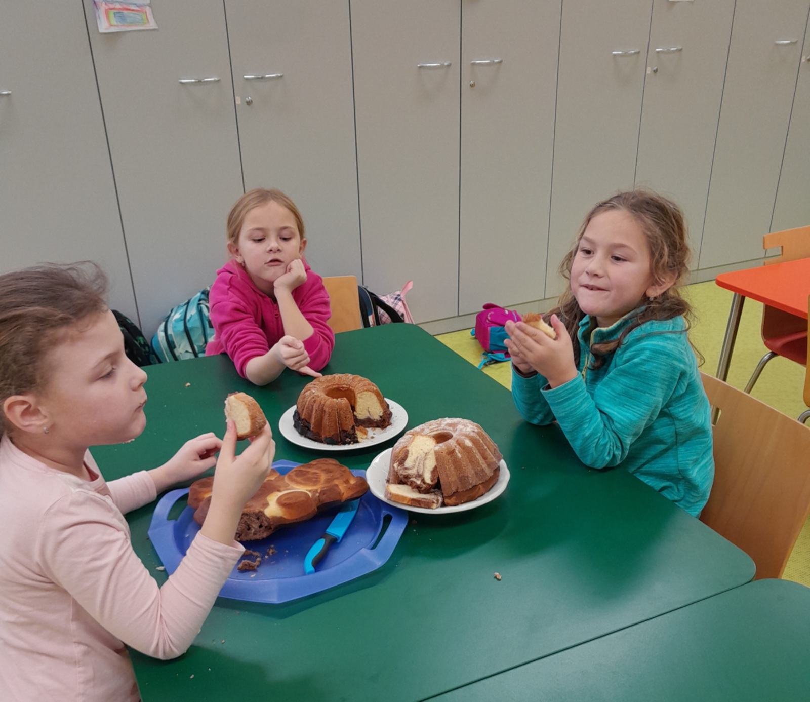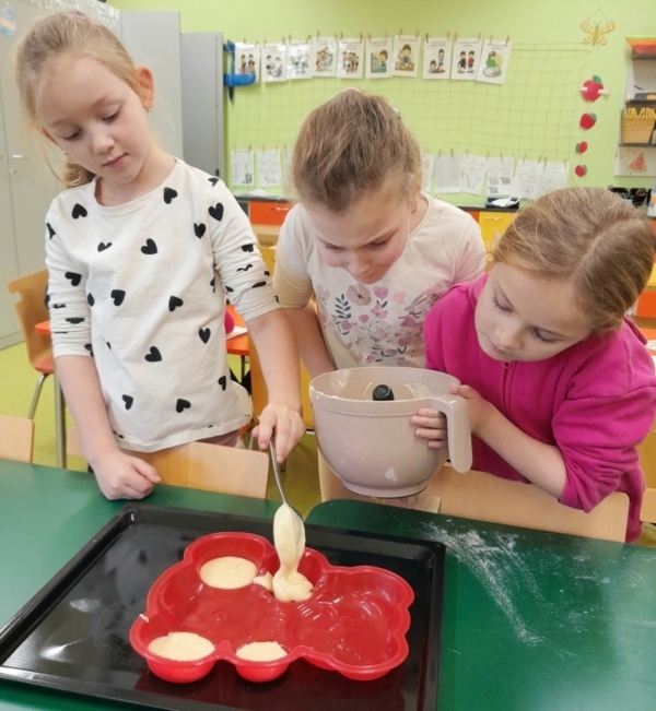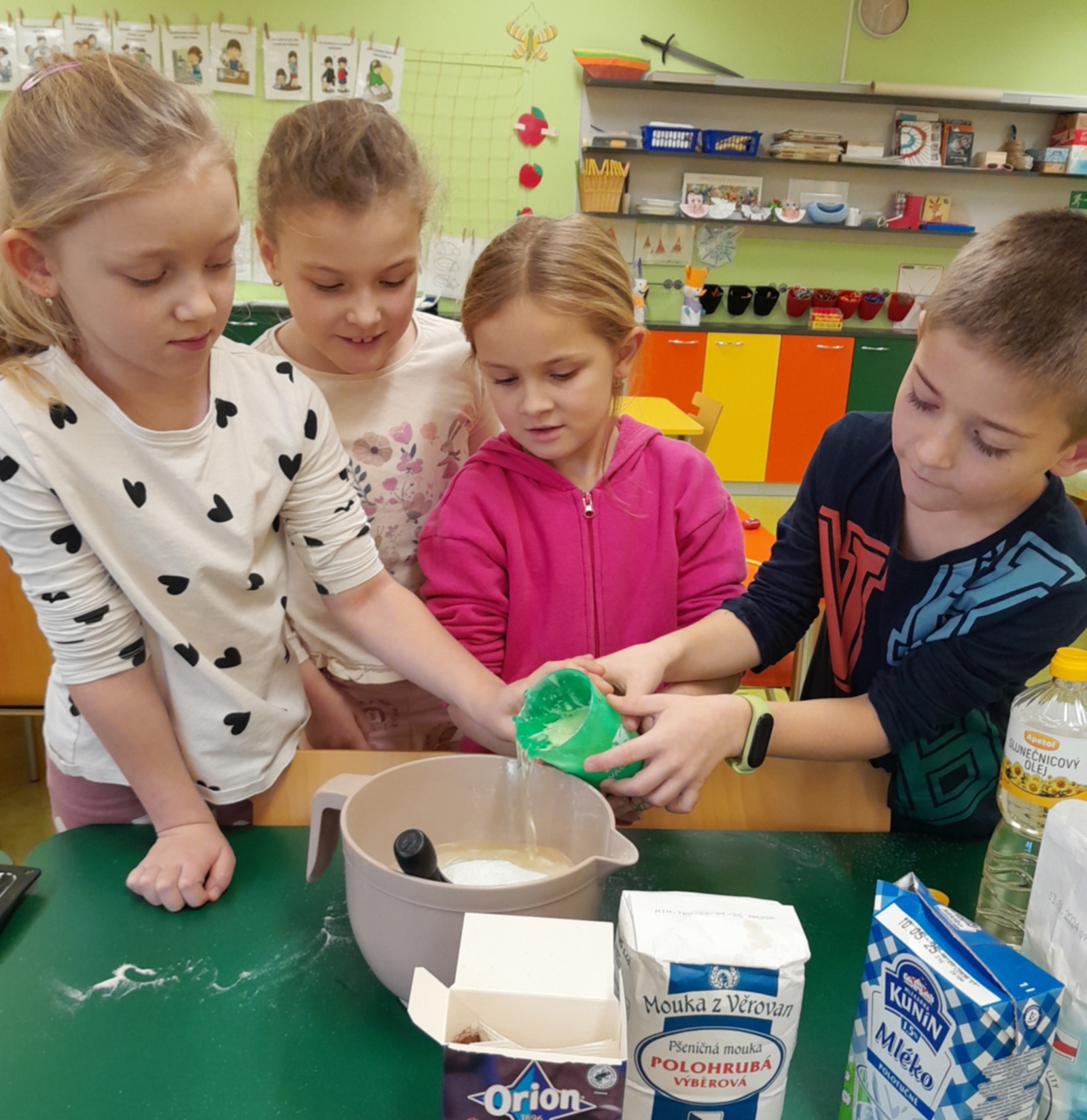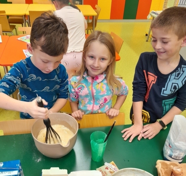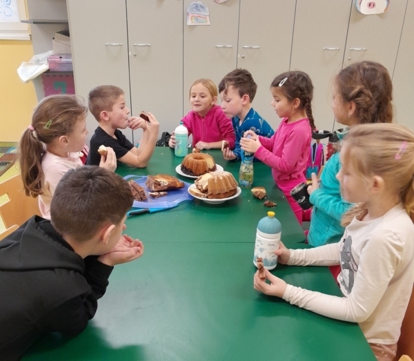 Připravili jsme si suroviny a pečlivě je odměřovali a dávkovali do mísy. Po vymísení jsme těsto přežily do připravené formy a šup s ní do trouby. Krasná vůně nás po čase upozornila, že máme upečeno!