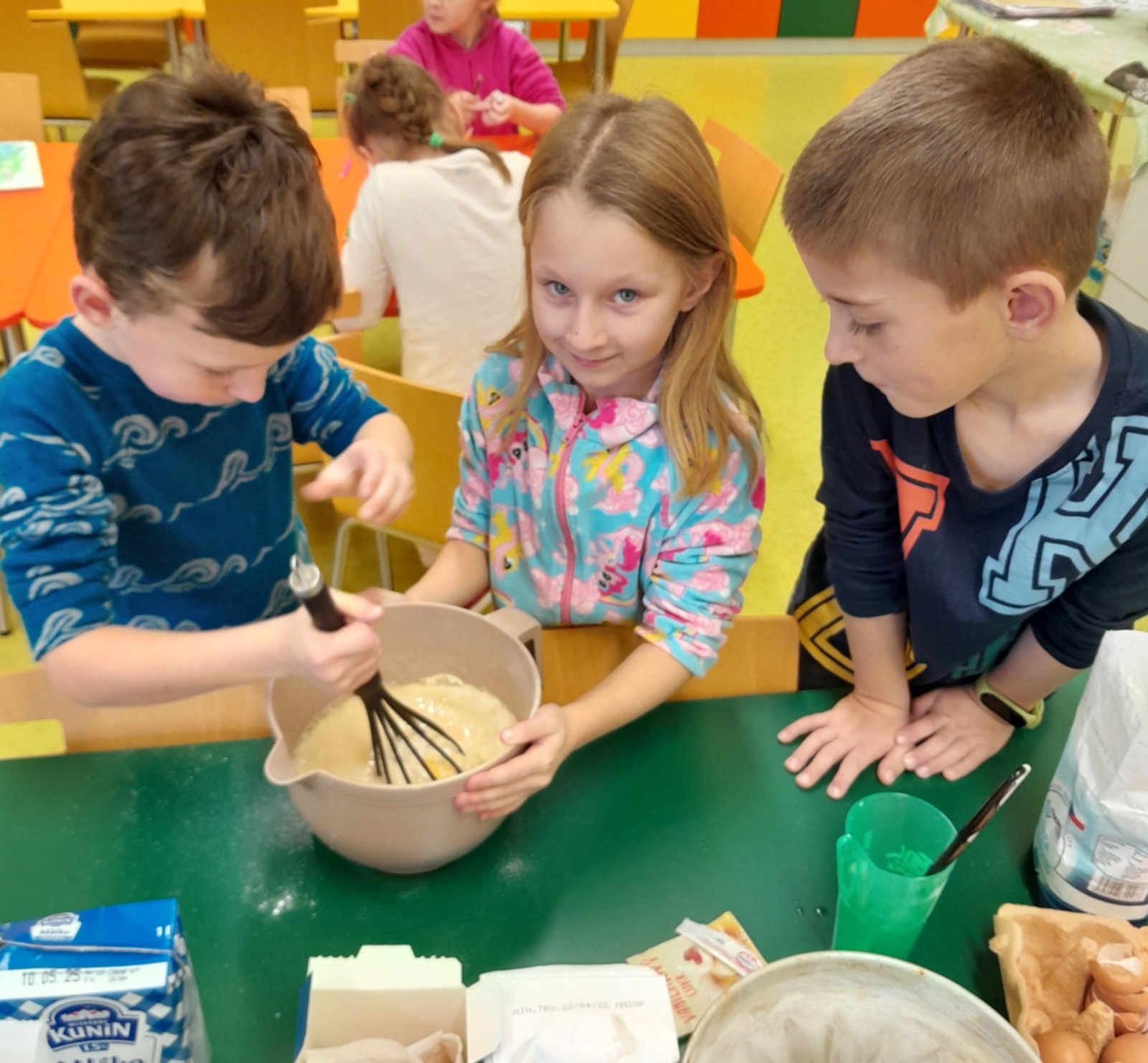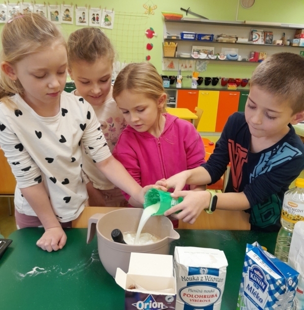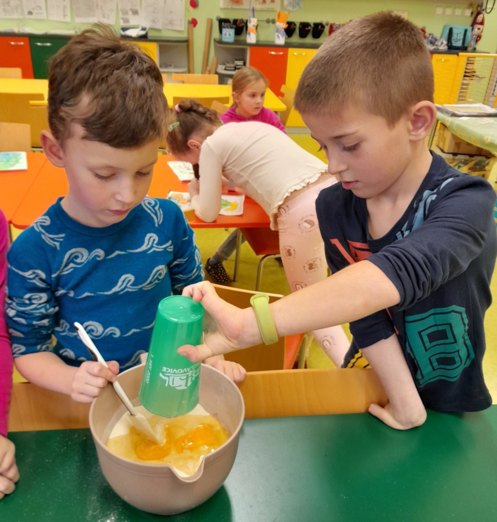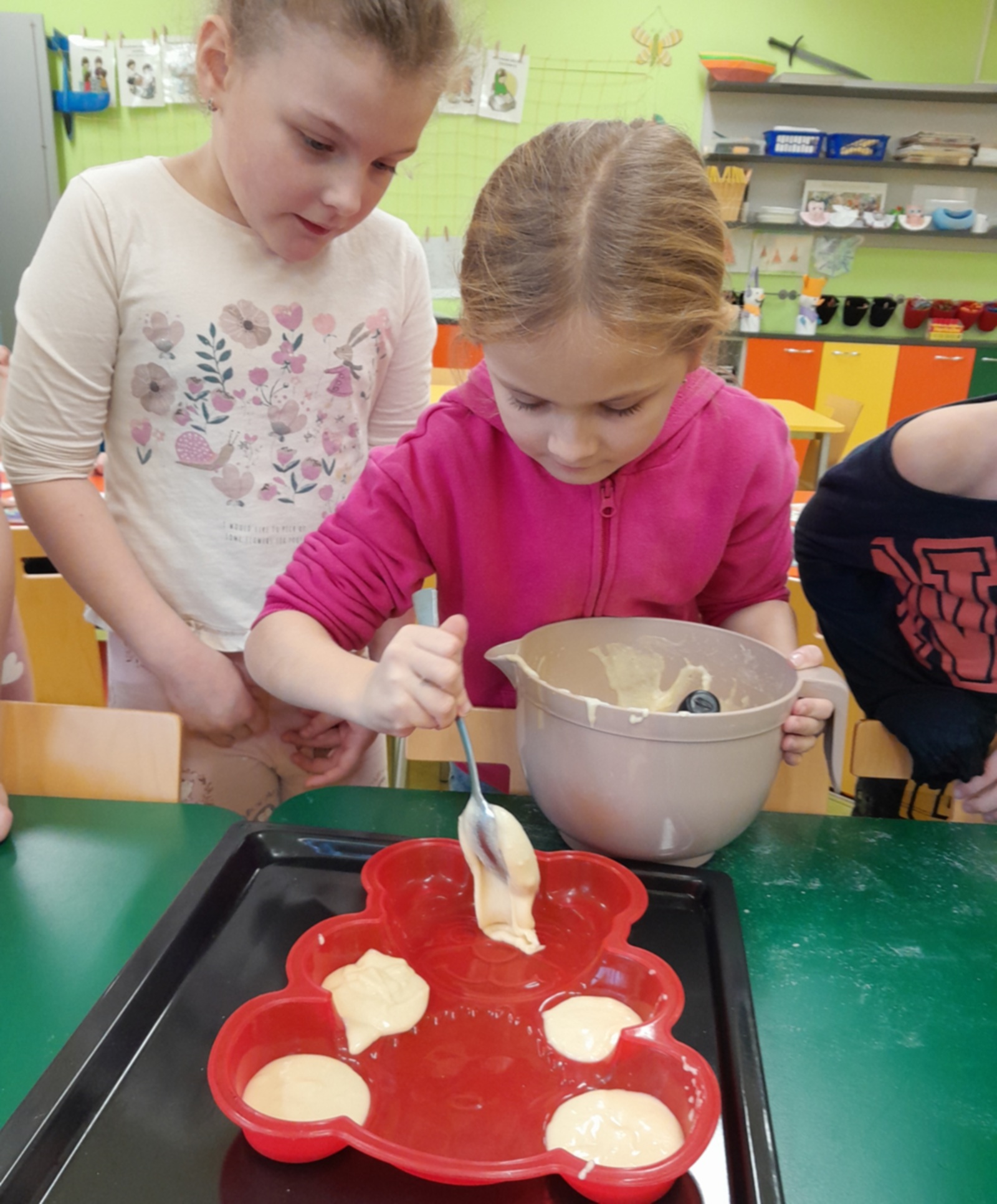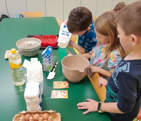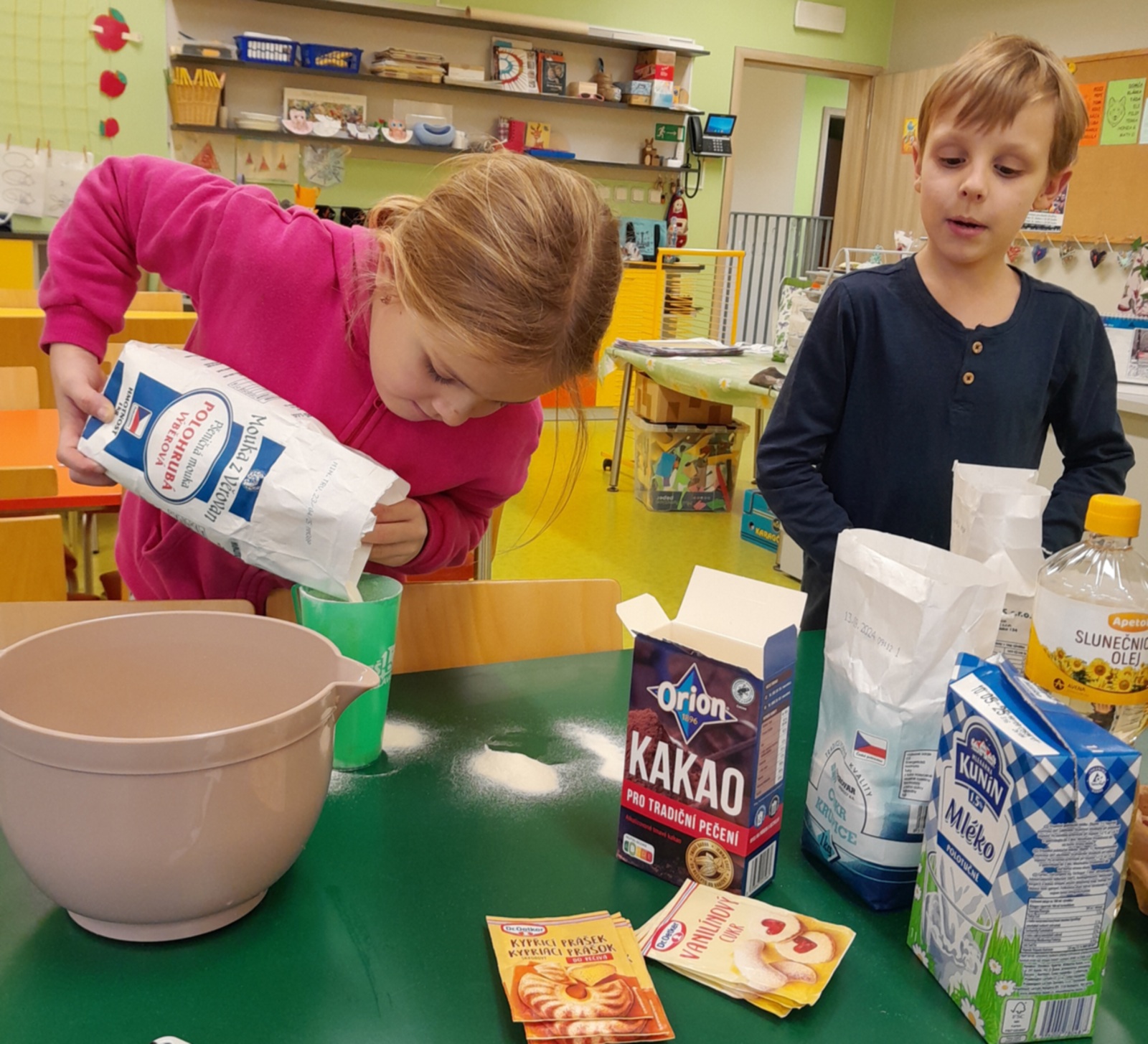 Připravili jsme si suroviny a pečlivě je odměřovali a dávkovali do mísy. Po vymísení jsme těsto přežily do připravené formy a šup s ní do trouby. Krasná vůně nás po čase upozornila, že máme upečeno!