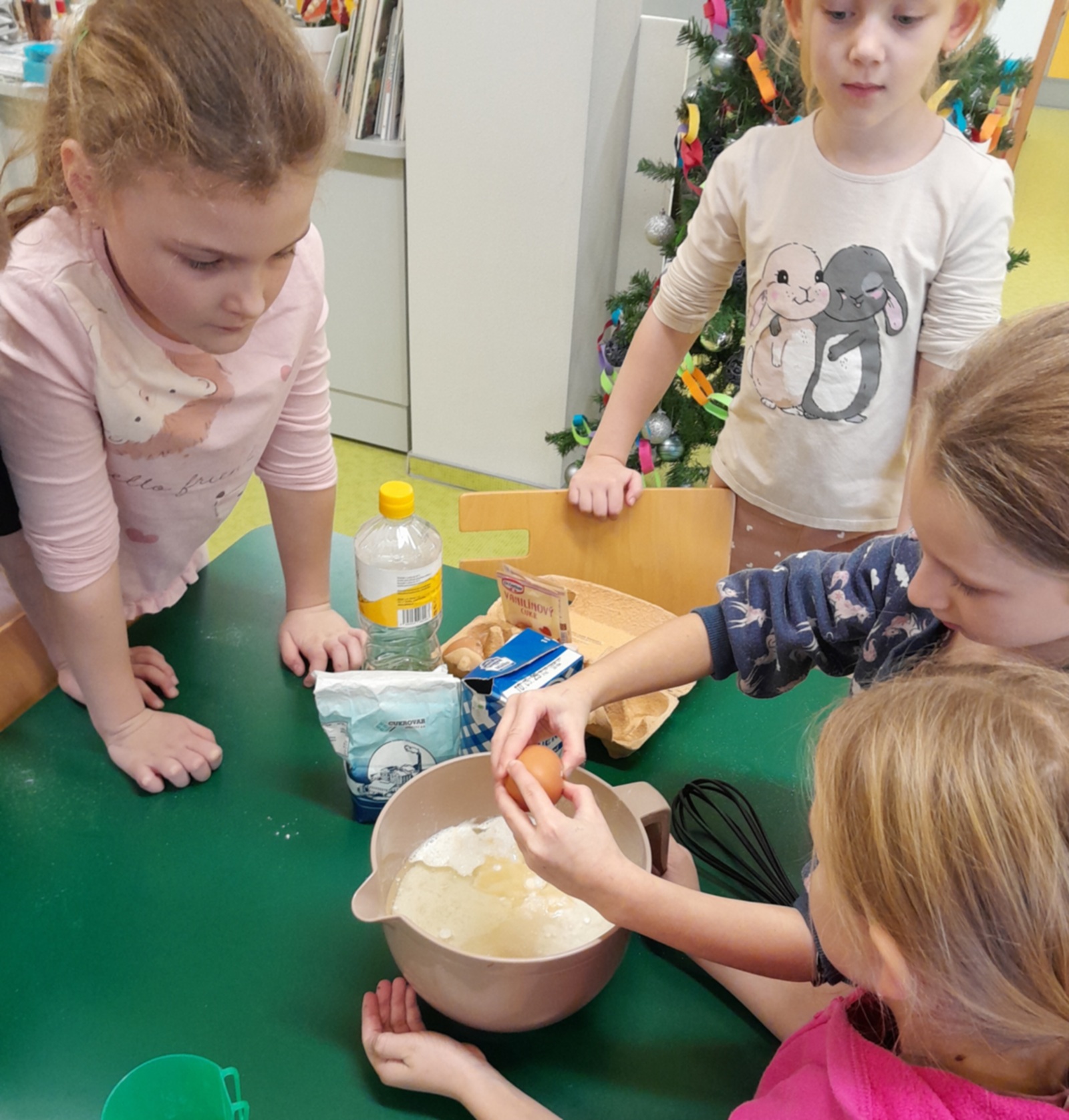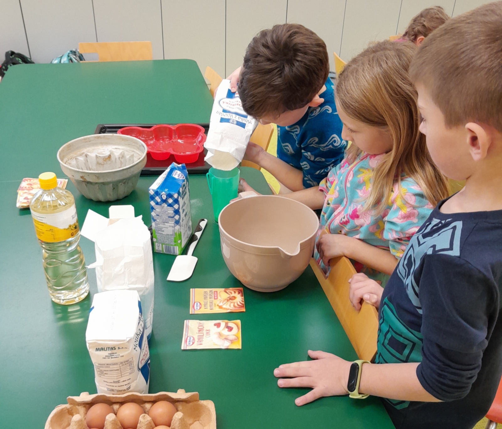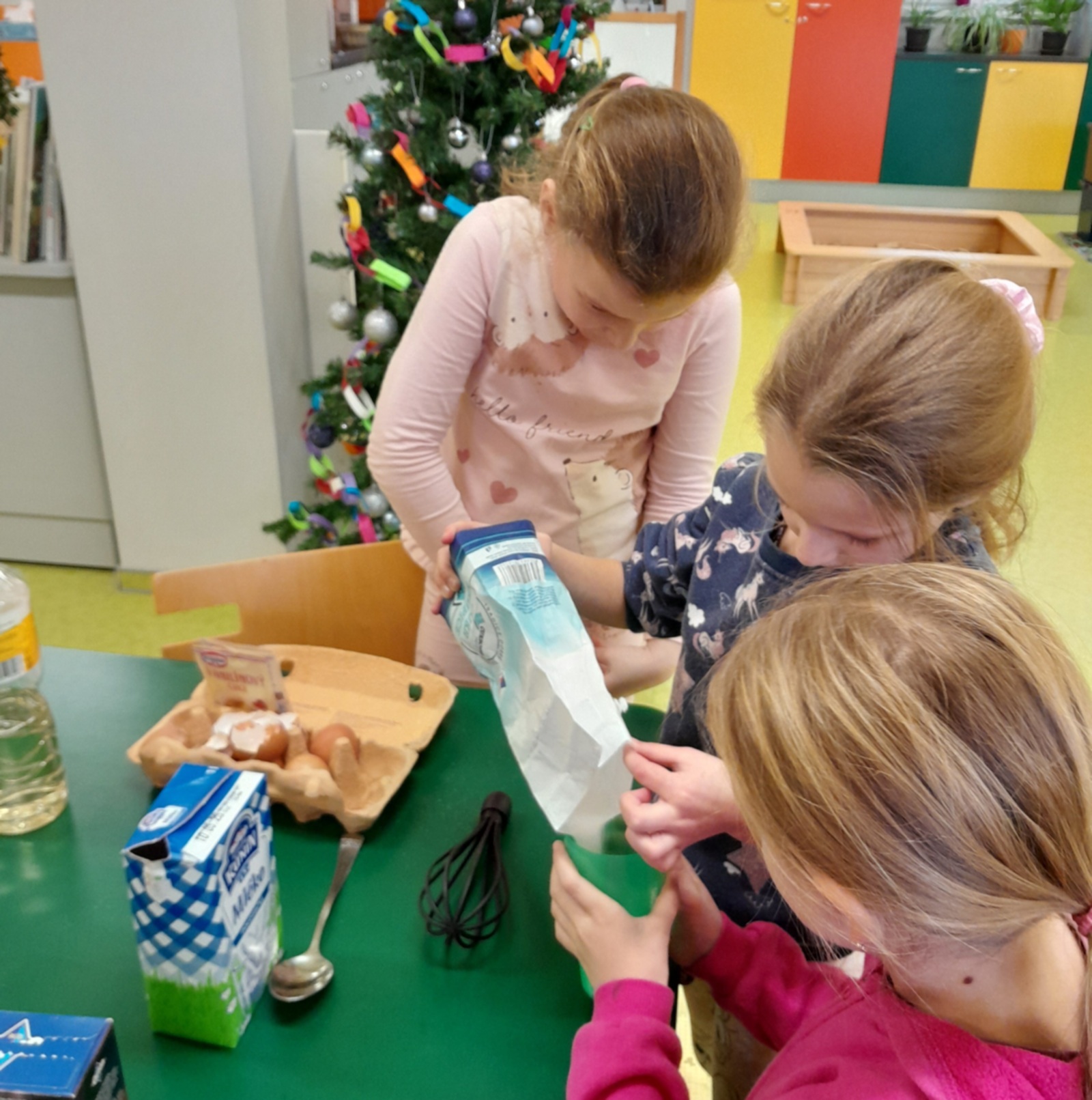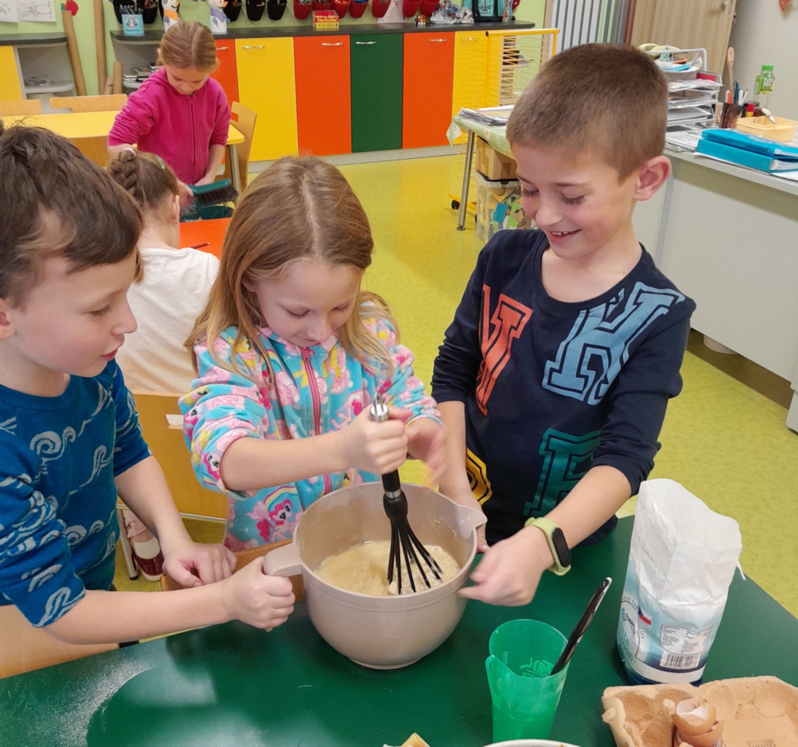 Připravili jsme si suroviny a pečlivě je odměřovali a dávkovali do mísy. Po vymísení jsme těsto přežily do připravené formy a šup s ní do trouby. Krasná vůně nás po čase upozornila, že máme upečeno!
