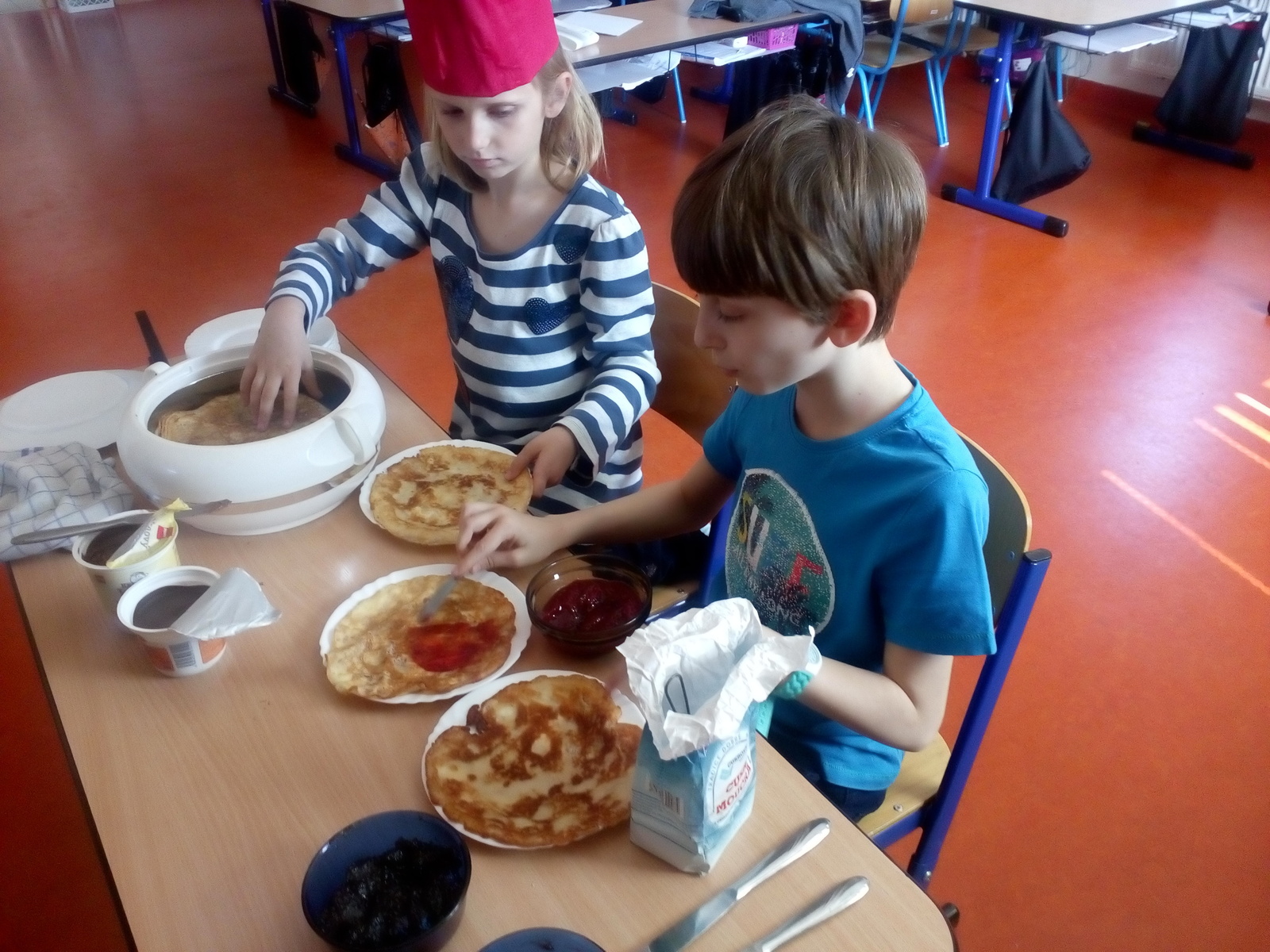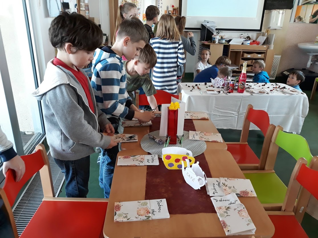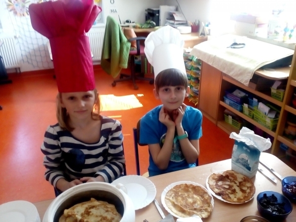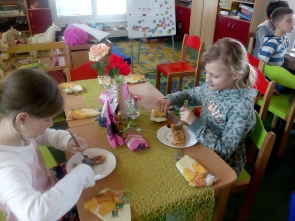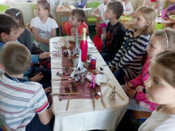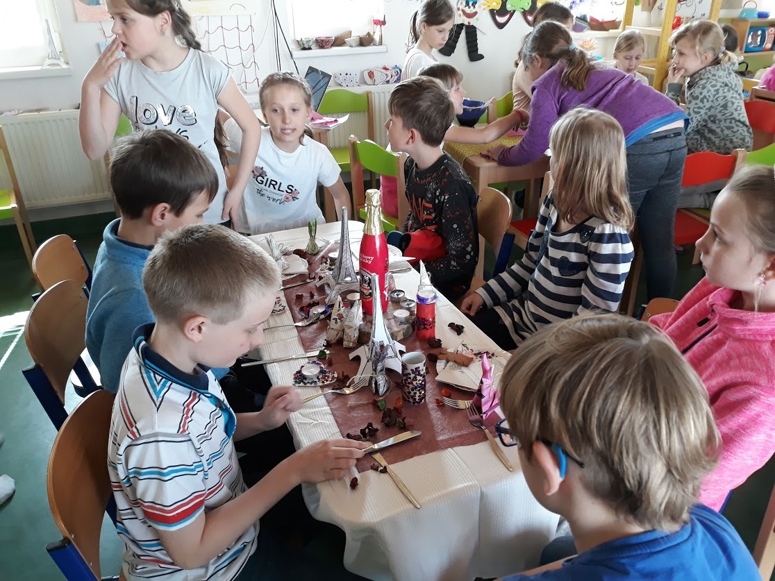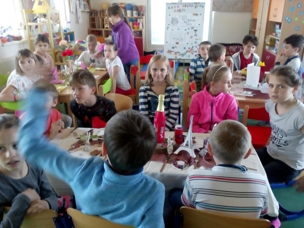 ...konkrétně v pařížské restauraci. Každý tým měl za úkol si předem promyslet a nazdobit slavnostní tabuli. Na návštěvu k nám přišla paní učitelka Lucie Chrastinová, která dětem předvedla způsob skládání ubrousků. Za snahu byly děti odměněny palačinkami. Z jídelního lístku měli na výběr palačinky s nutelou, domácí rybízovou marmeládou nebo povidly. To byla dobrota!