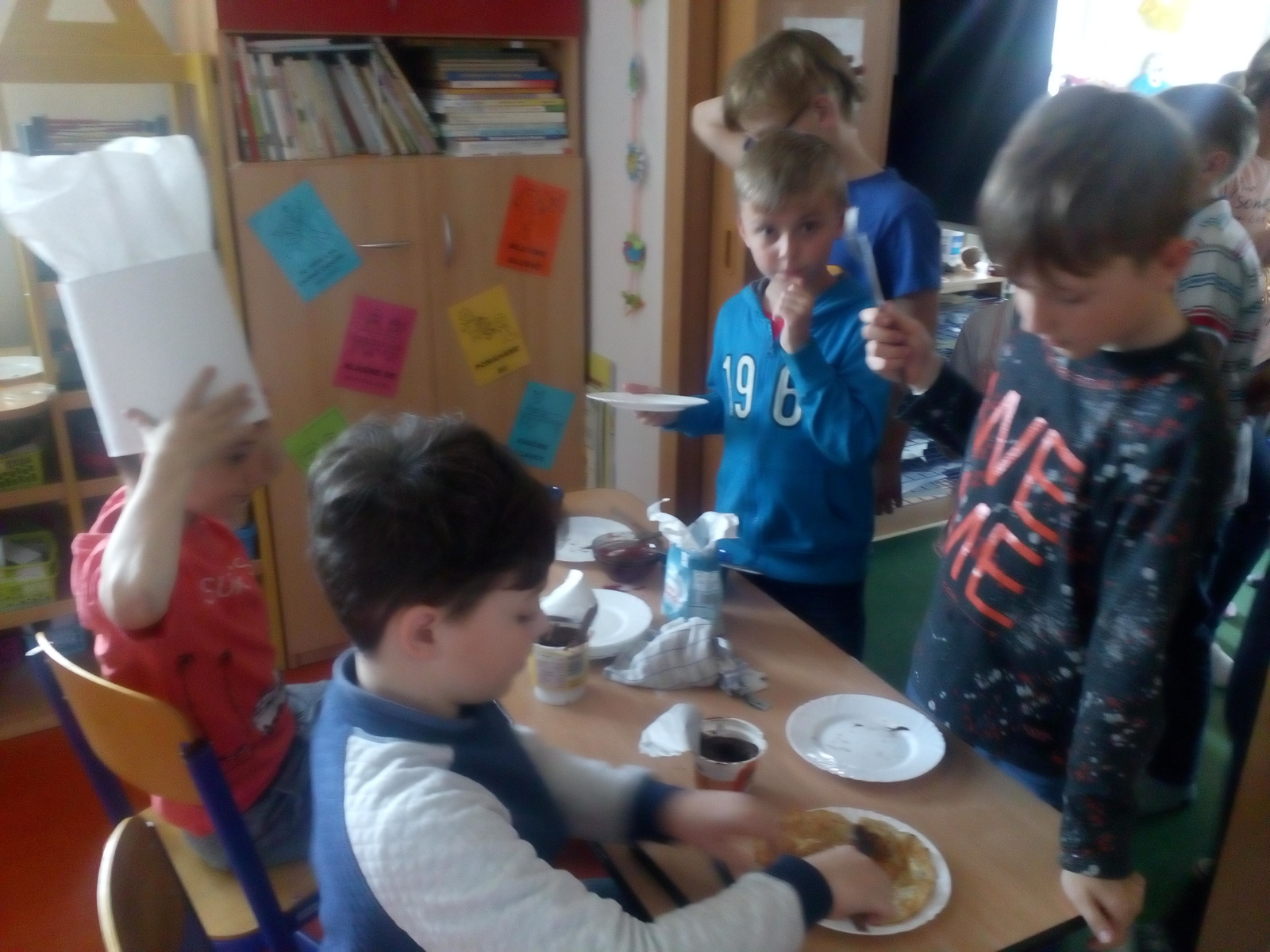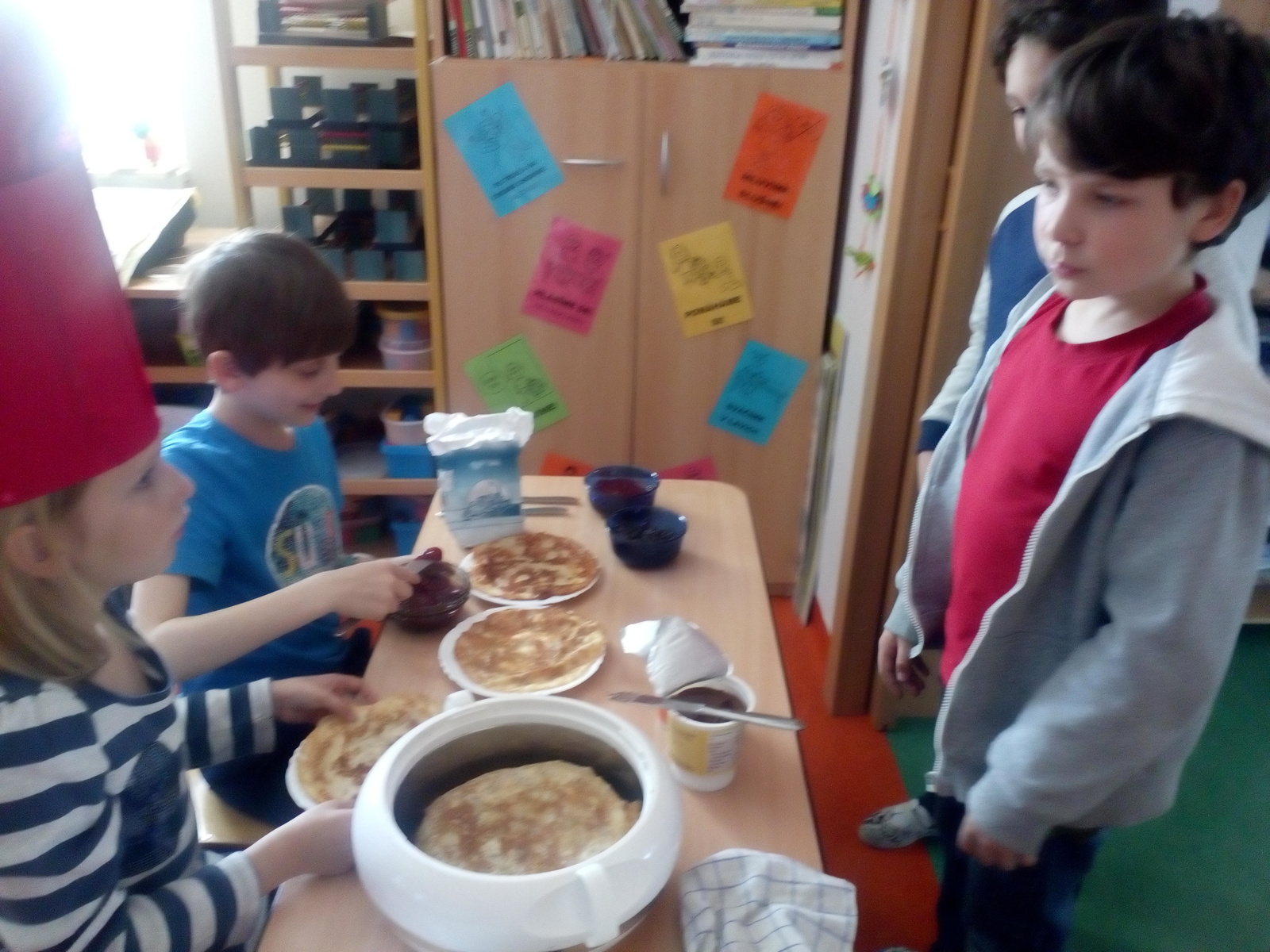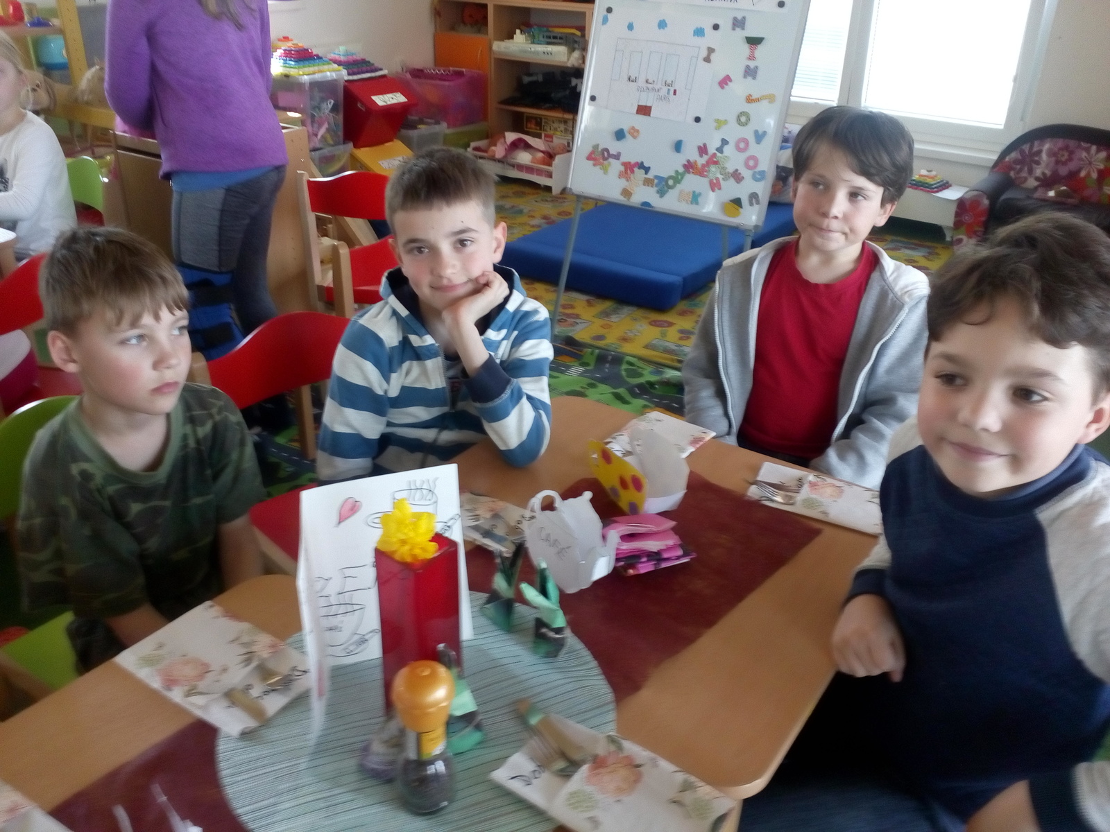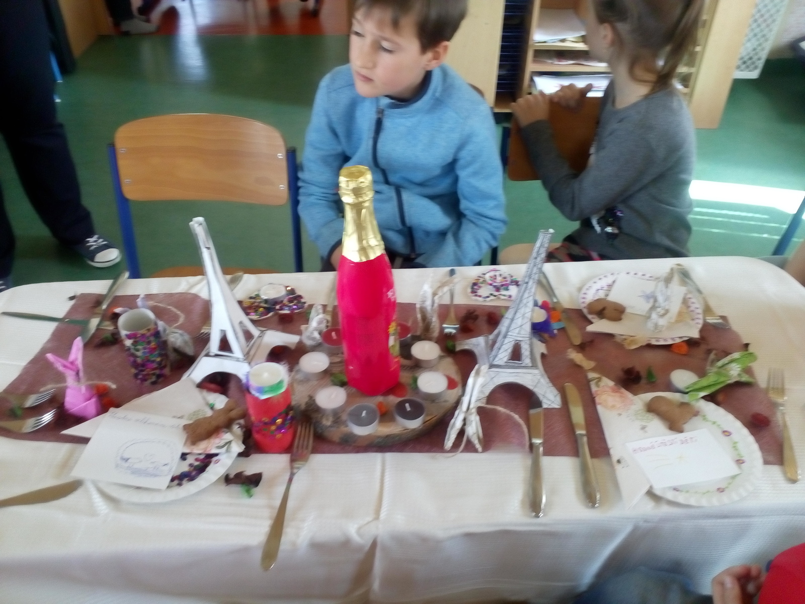 ...konkrétně v pařížské restauraci. Každý tým měl za úkol si předem promyslet a nazdobit slavnostní tabuli. Na návštěvu k nám přišla paní učitelka Lucie Chrastinová, která dětem předvedla způsob skládání ubrousků. Za snahu byly děti odměněny palačinkami. Z jídelního lístku měli na výběr palačinky s nutelou, domácí rybízovou marmeládou nebo povidly. To byla dobrota!