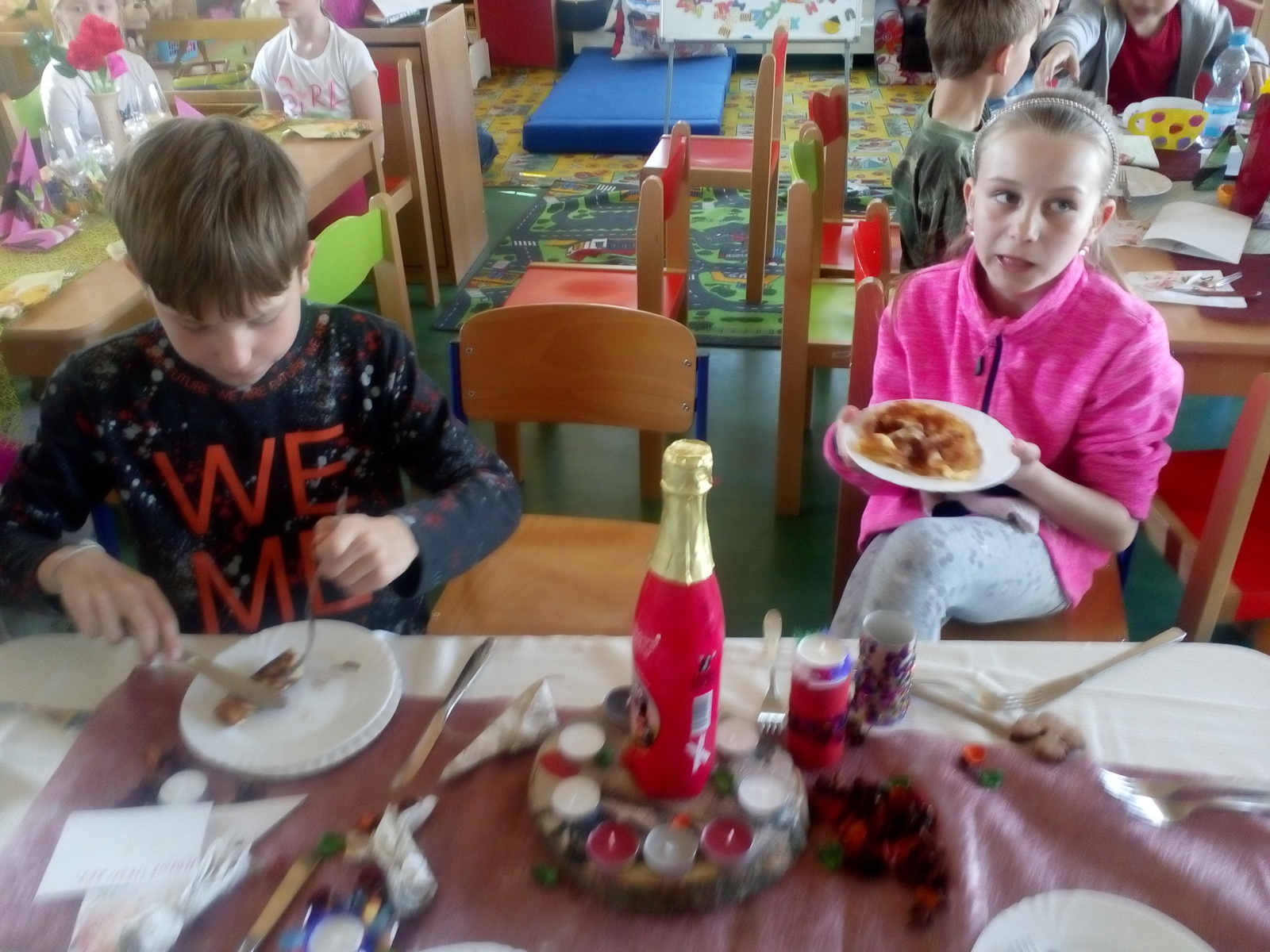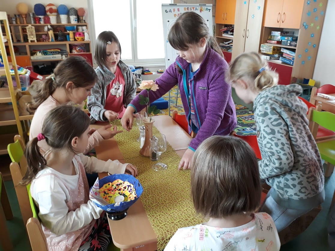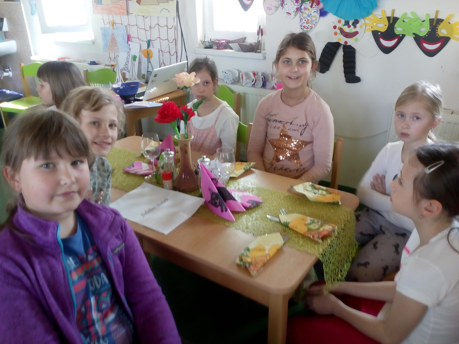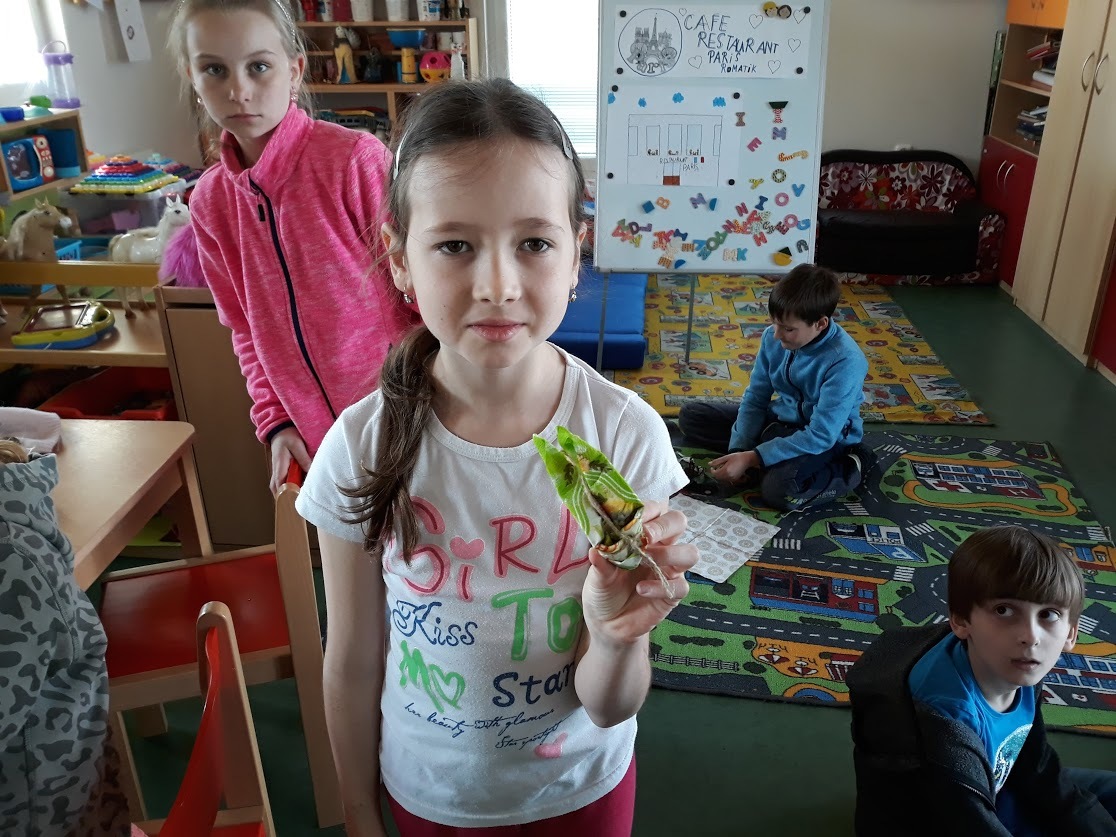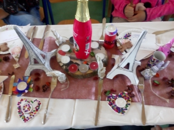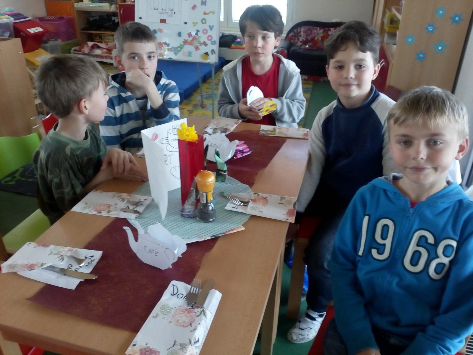 ...konkrétně v pařížské restauraci. Každý tým měl za úkol si předem promyslet a nazdobit slavnostní tabuli. Na návštěvu k nám přišla paní učitelka Lucie Chrastinová, která dětem předvedla způsob skládání ubrousků. Za snahu byly děti odměněny palačinkami. Z jídelního lístku měli na výběr palačinky s nutelou, domácí rybízovou marmeládou nebo povidly. To byla dobrota!