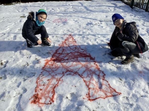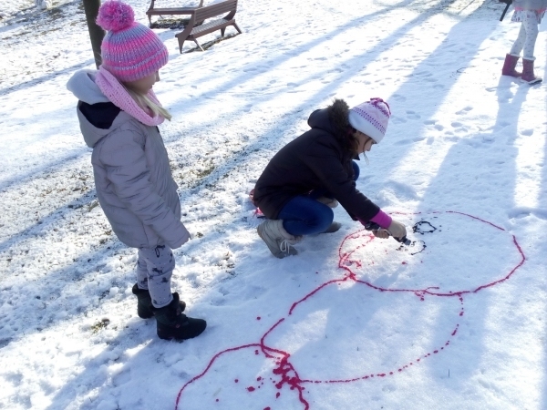 Počasí nám tento týden ke stavbě sněhuláků moc nepřálo, tak jsme si je alespoň namalovali na sněhu temperovými barvami. A protože nás kreslení bavilo, zkusili jsme i jiné obrázky.