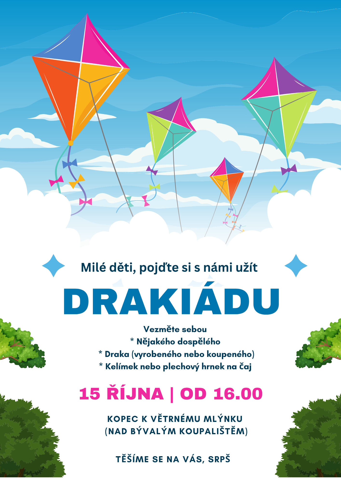 Srdečně vás zveme na Drakiádu, která se uskuteční 15. října 2025. Místo setkání: kopec u větrného mlýnku, od 16:00 hodin. Těšíme se na Vás, SRPŠ