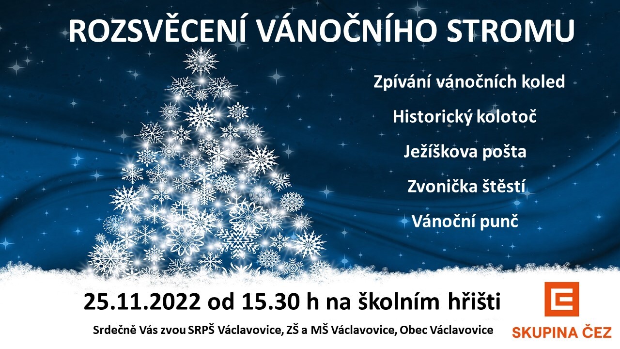 Přijměte prosím pozvání na Rozsvěcení Vánočního stromu v pátek 25. 11. 2022 od 15.30 hod. na školním hřišti. Slavnostní Rozsvěcení stromu spolu se zpíváním koled proběhne v 16.30 hod. Přichystán bude vánoční punč pro děti i dospělé, historický vánoční kolotoč, výroba vánočních svíček, zvonička pro štěstí, Ježíškova pošta i vánoční fotokoutek.