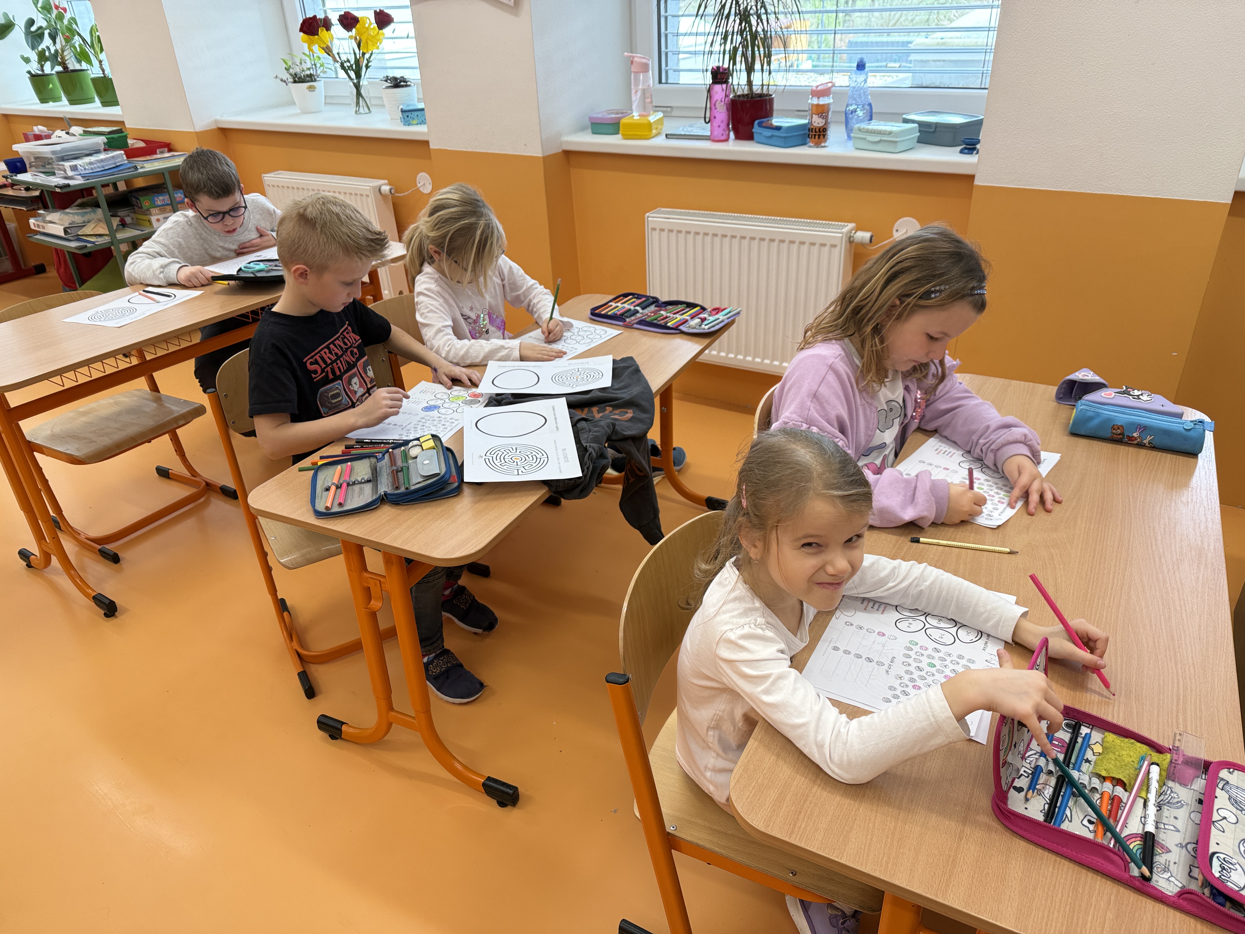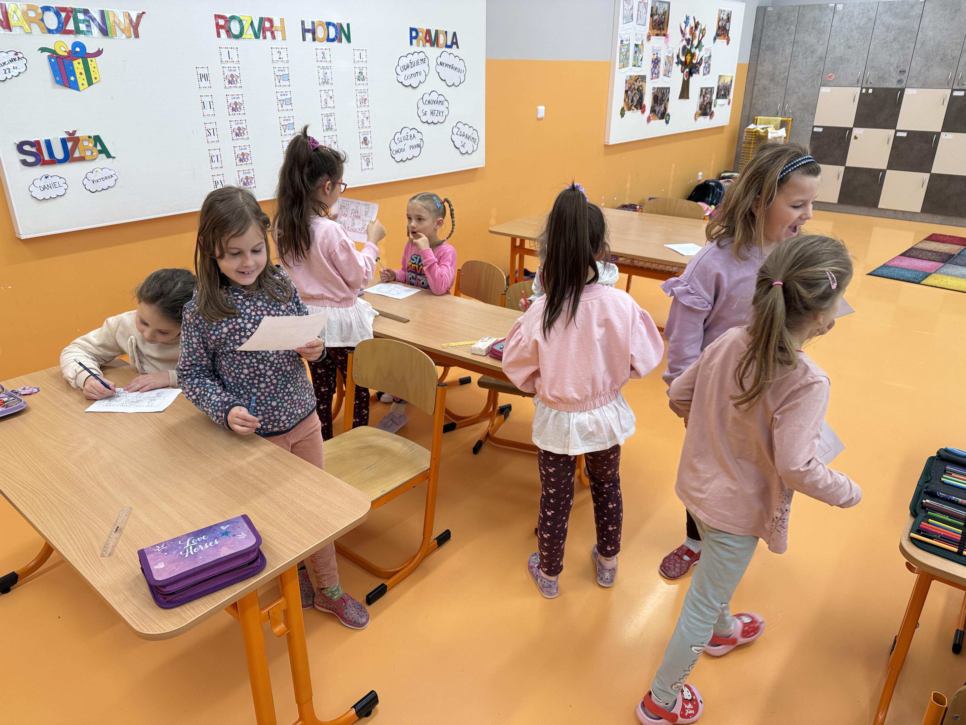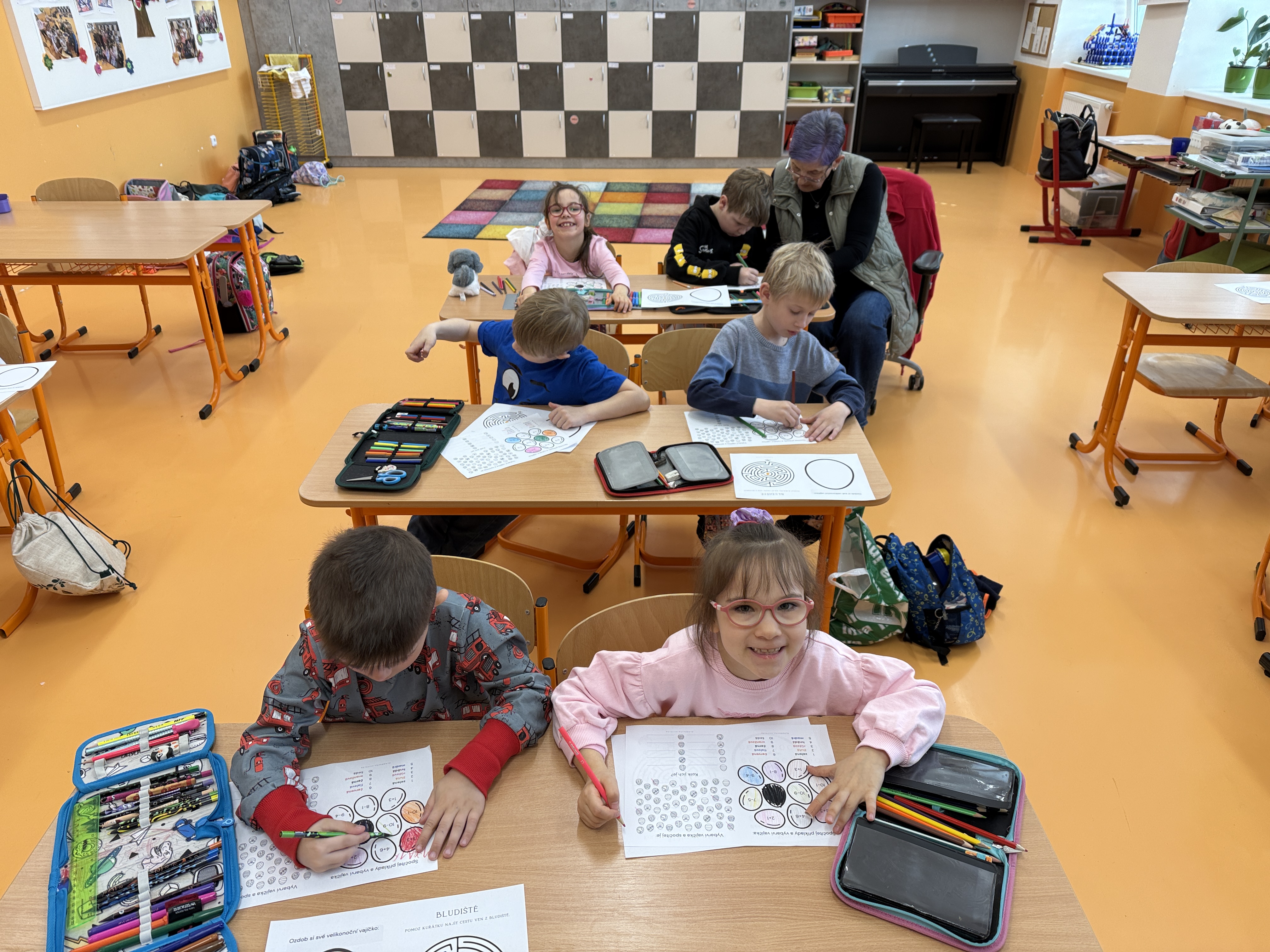 Nejdříve jsme si zahráli na zajíčky, kteří se v komunikační aktivitě procvičující čtení, psaní, paměť, zrakové i sluchové vnímání, snažili vypátrat jména ostatních zajíčků. Pak jsme si zopakovali určování času, seznámili se s pravítkem a rýsovali naše první přímky. V tělocviku zajíčci kličkovali před hladovými myslivci a poslední hodina patřila žertovným úkolům.