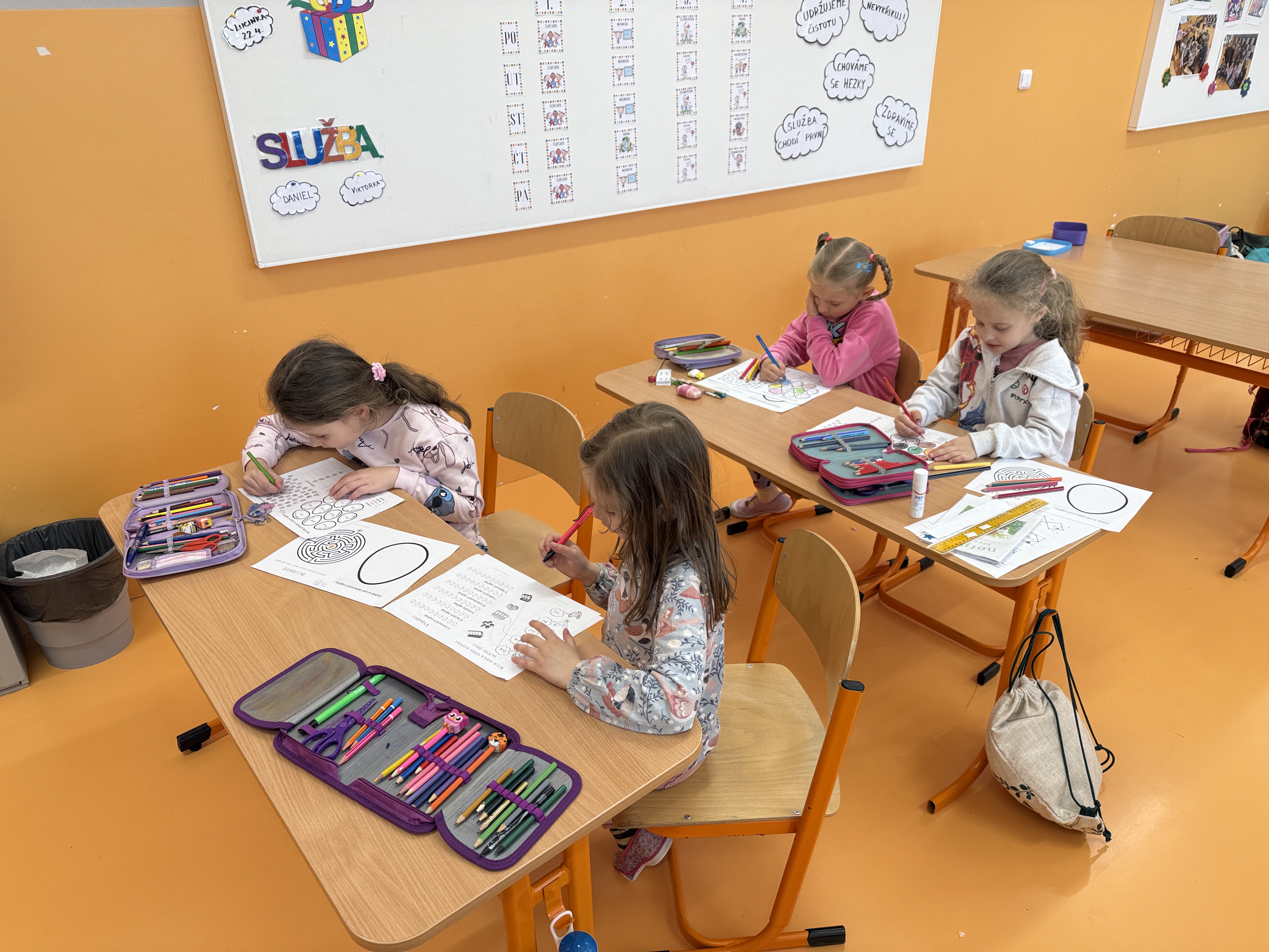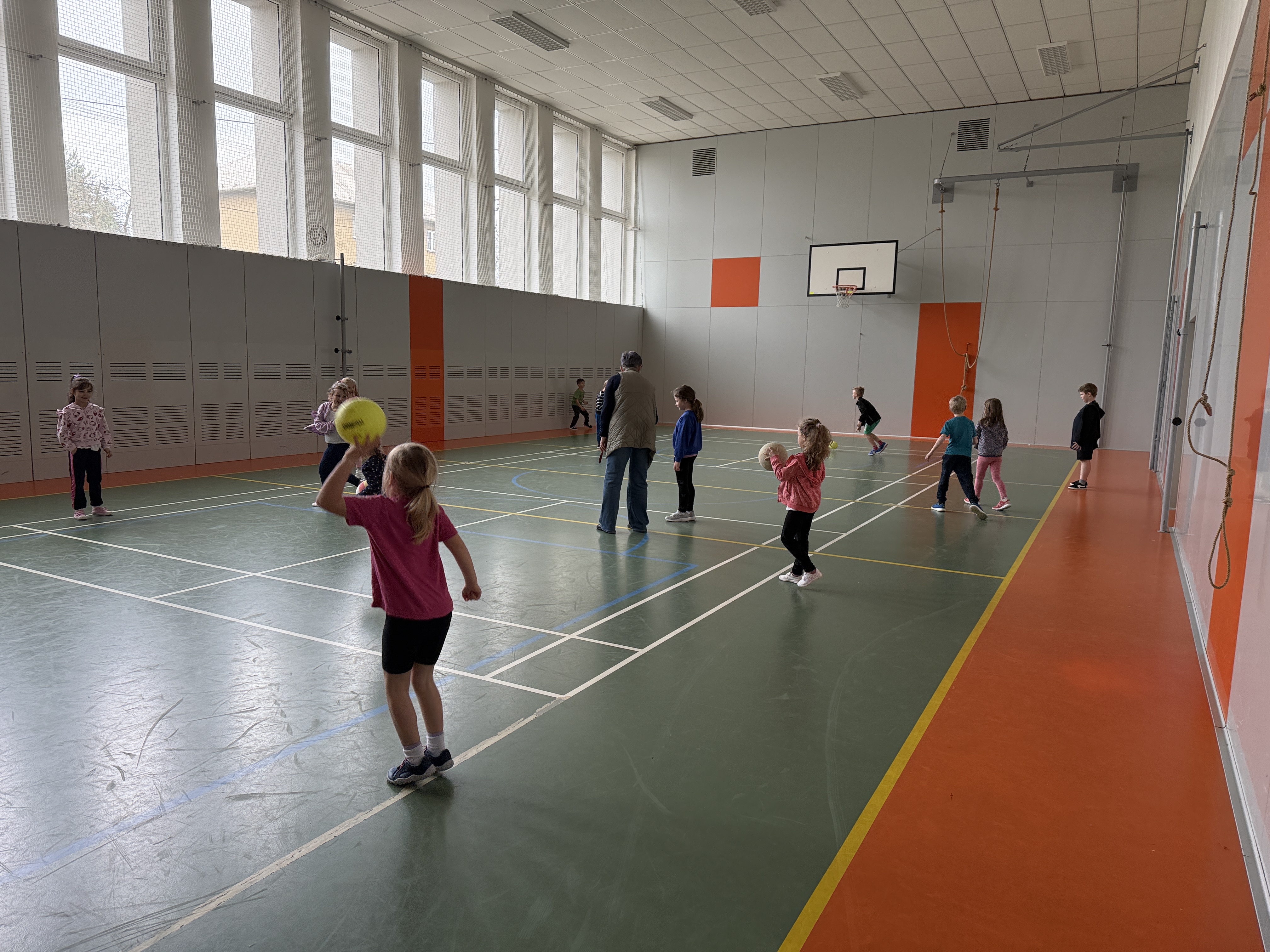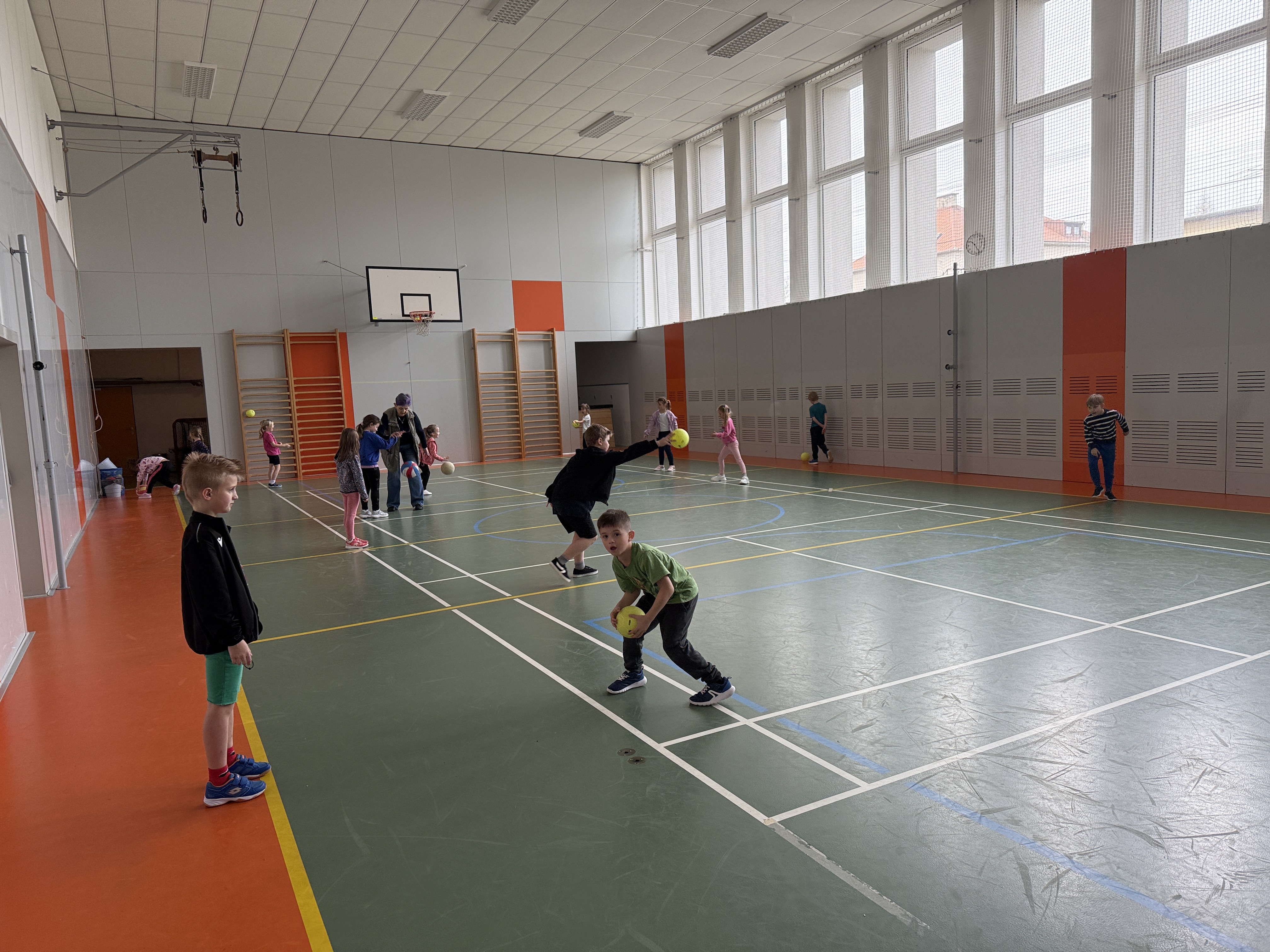 Nejdříve jsme si zahráli na zajíčky, kteří se v komunikační aktivitě procvičující čtení, psaní, paměť, zrakové i sluchové vnímání, snažili vypátrat jména ostatních zajíčků. Pak jsme si zopakovali určování času, seznámili se s pravítkem a rýsovali naše první přímky. V tělocviku zajíčci kličkovali před hladovými myslivci a poslední hodina patřila žertovným úkolům.
