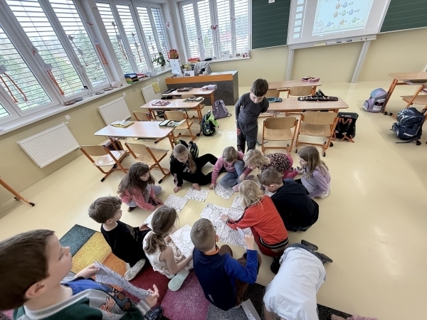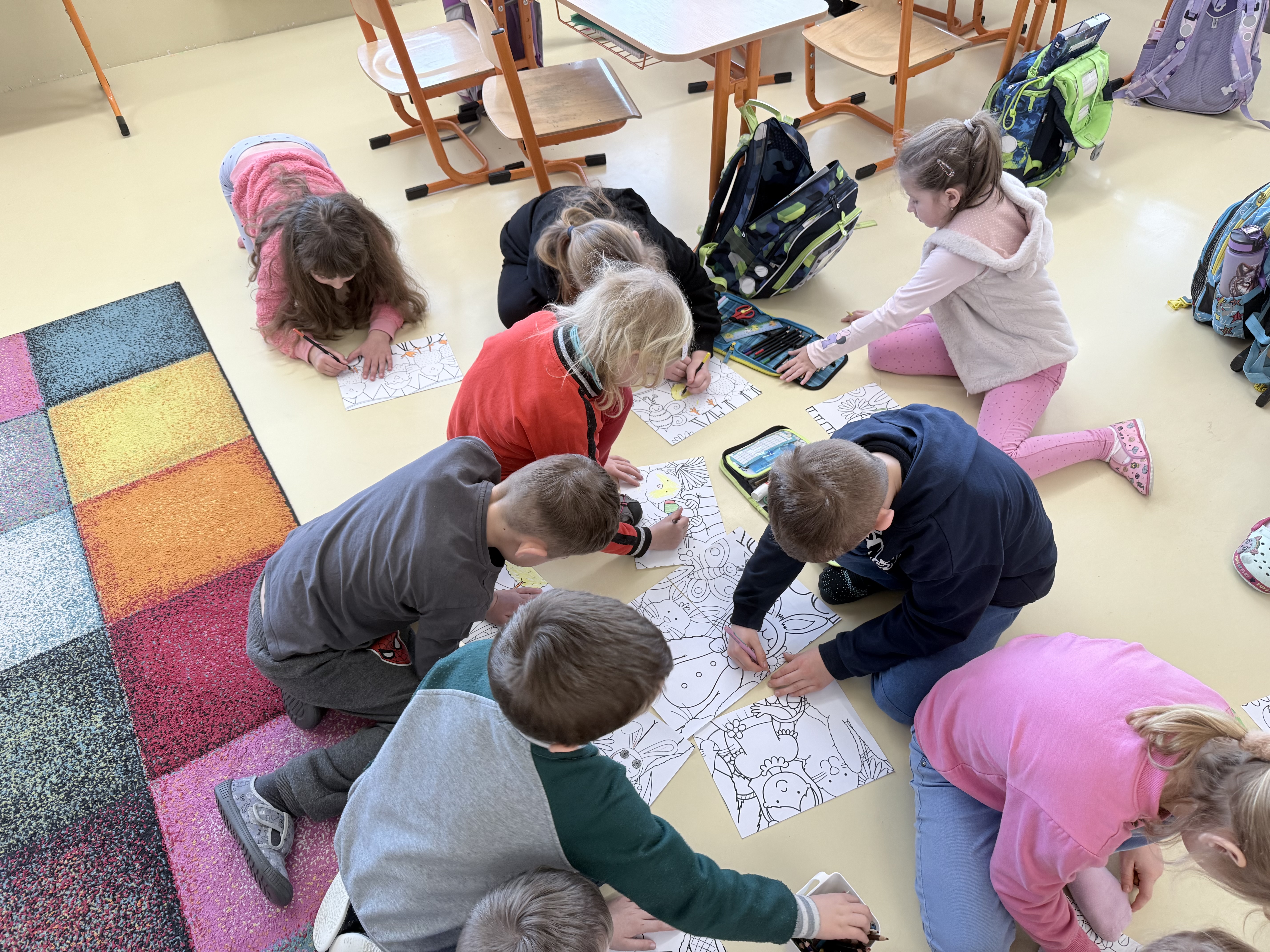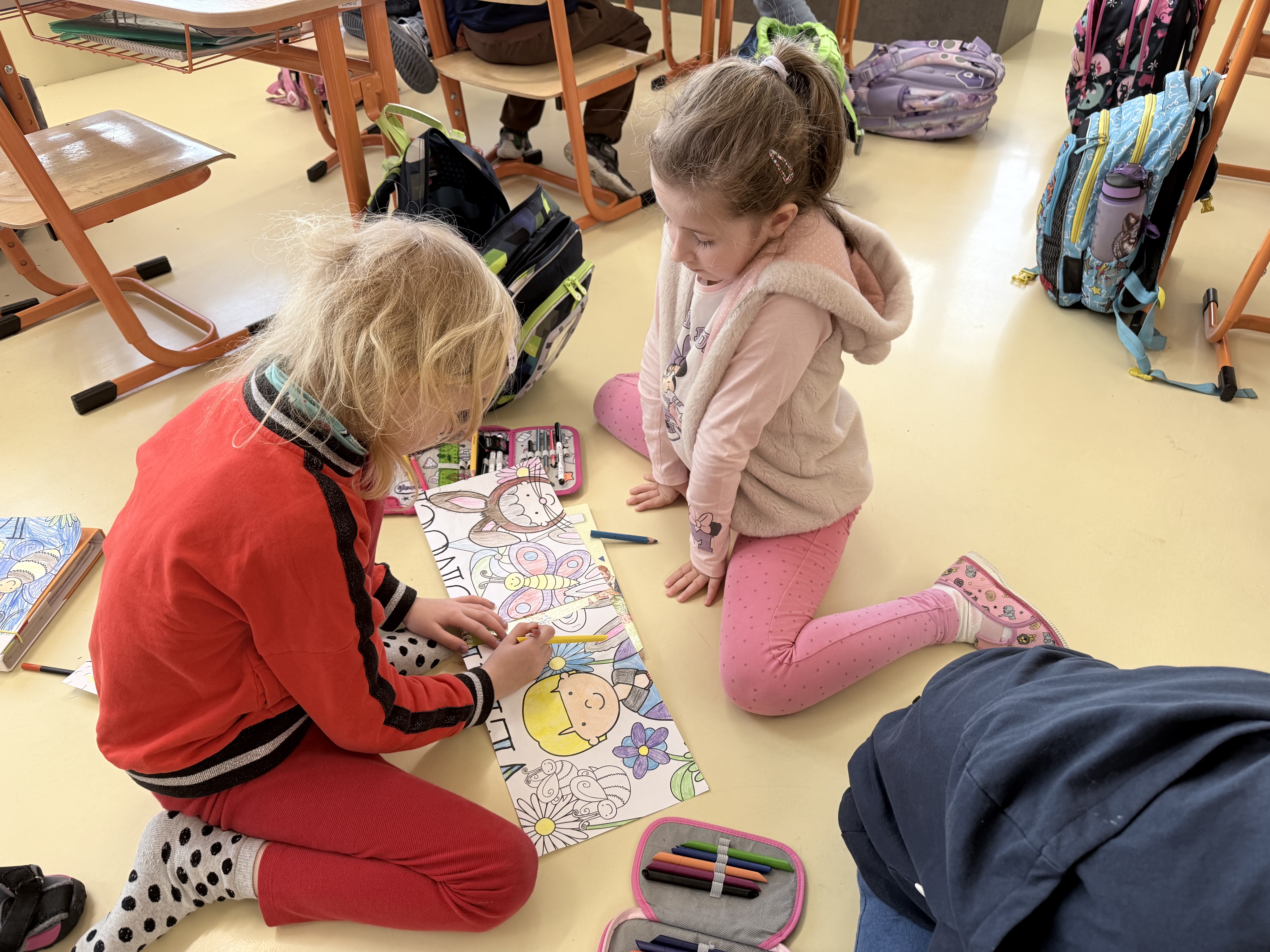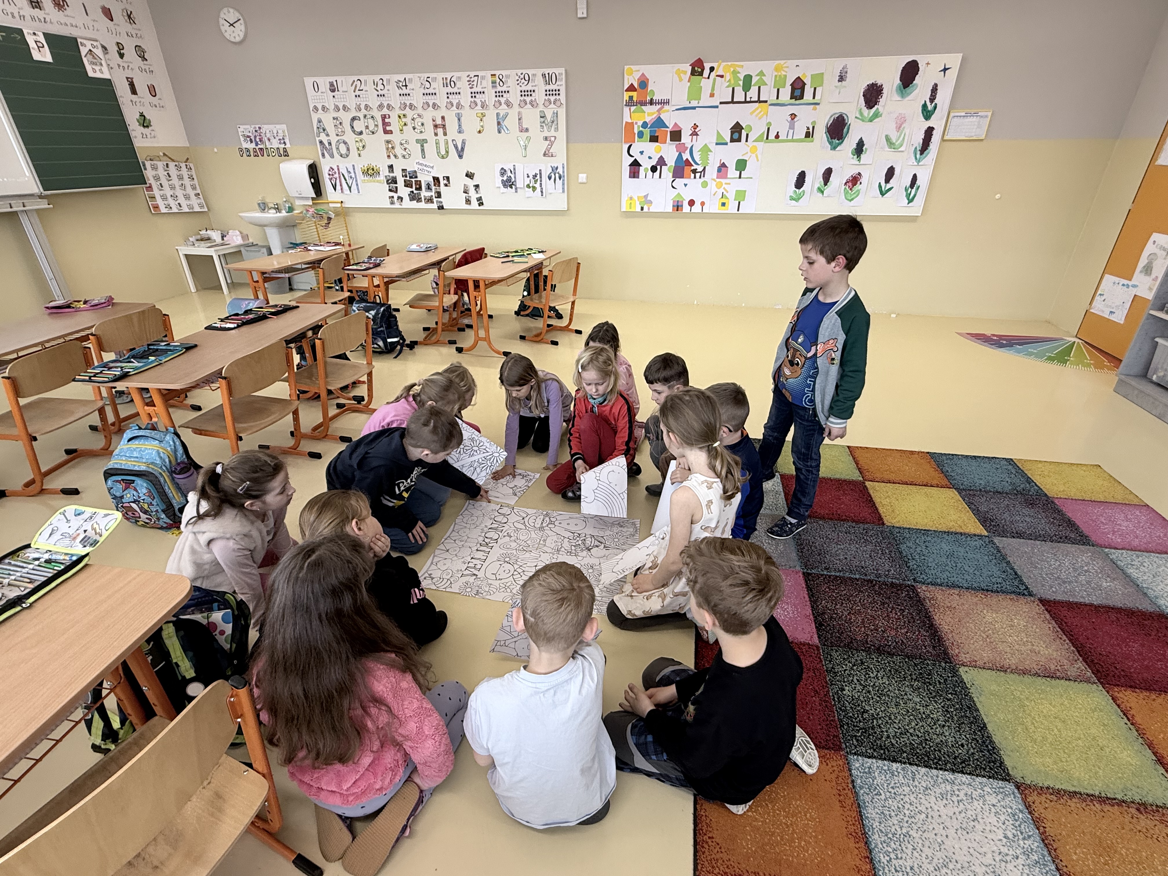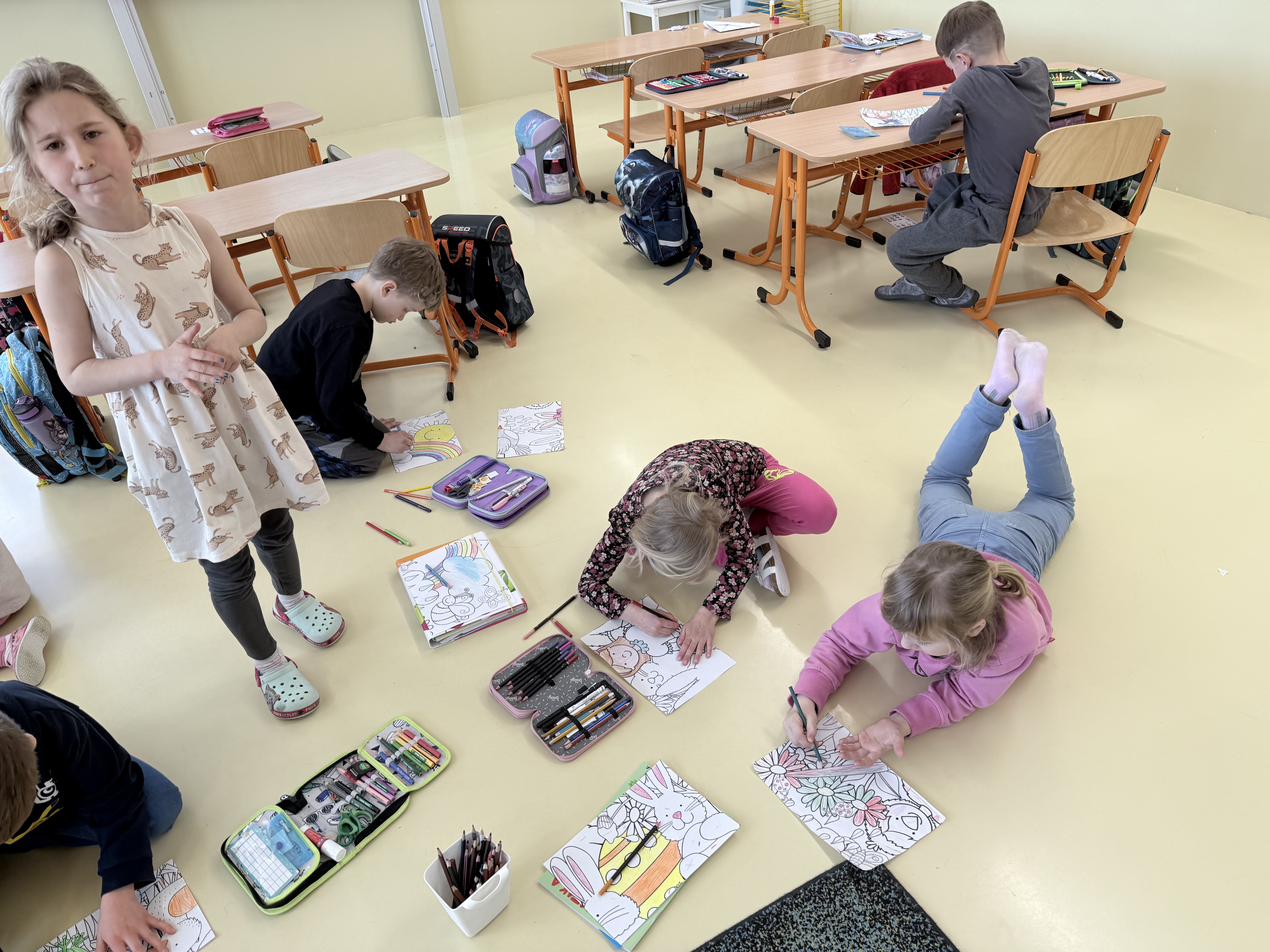 Poslední den před velikonočními prázdninami jsme si zahráli velikonoční hry - Slovní hady, počítali jsme začarovaná vajíčka. Navštívili nás také kamarádi z 1. A. Novinkou byl pro nás kooperativní obraz. Nejprve bylo potřeba obraz poskládat, abychom zjistili, co z jednotlivých listů vznikne. Poté přišla nejtěžší část - společně se domluvit na barvách tak, aby obraz působil jednotně. Bylo to velmi náročné, ale vše jsme to zvládli! Jsme totiž jeden tým!