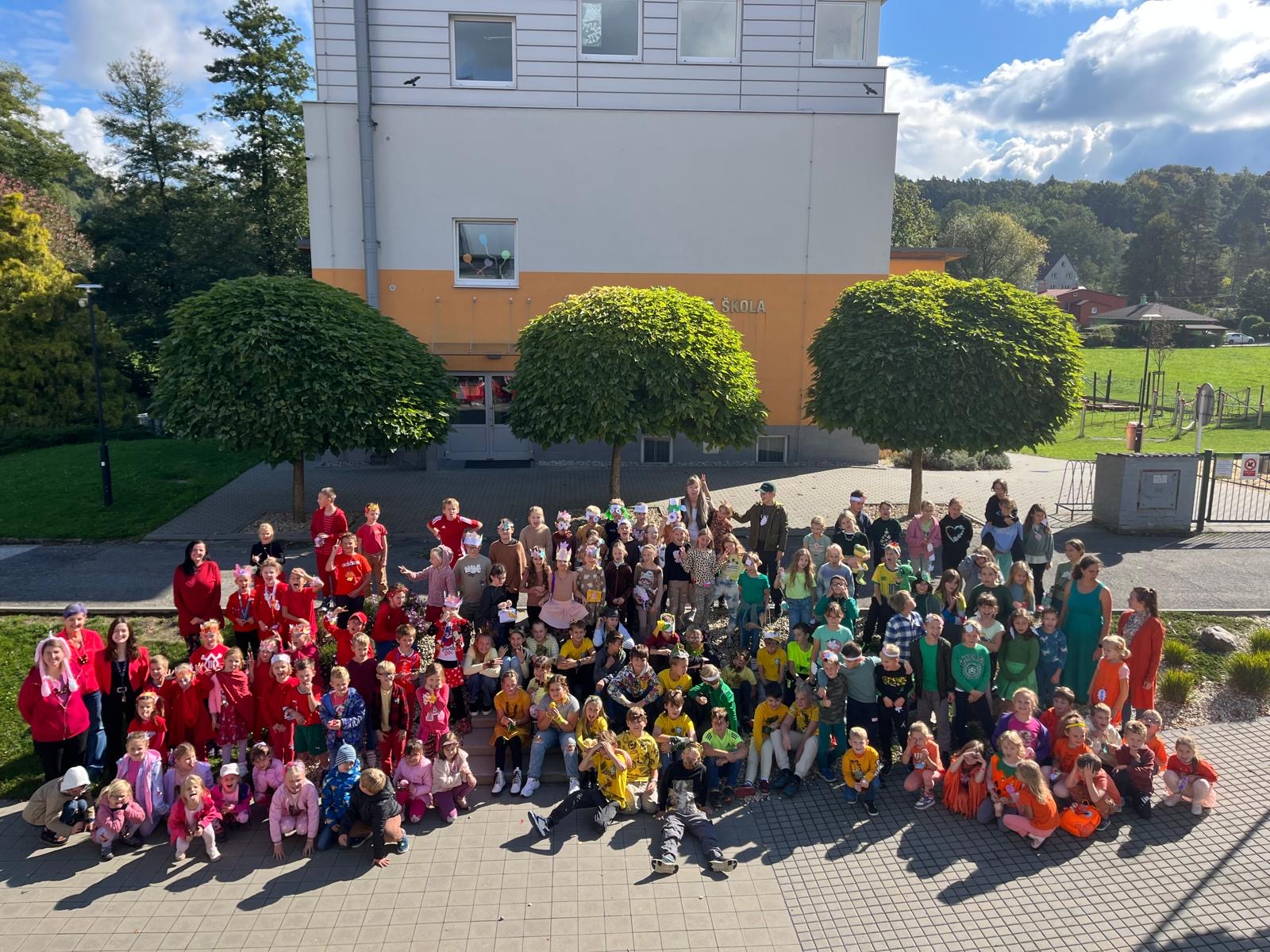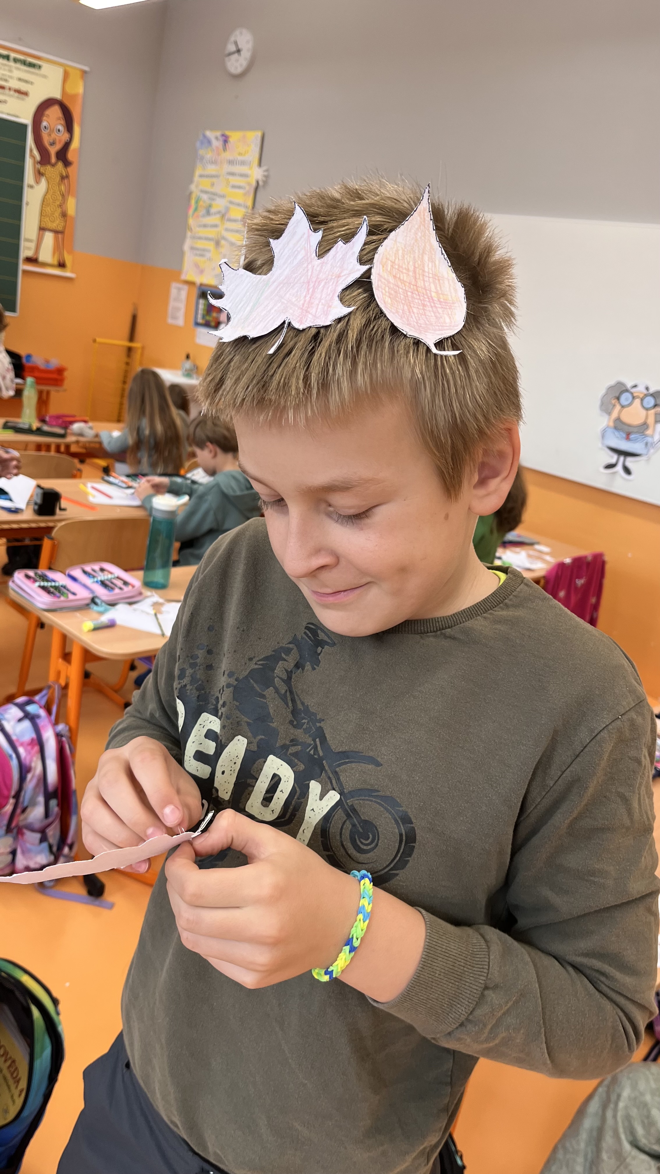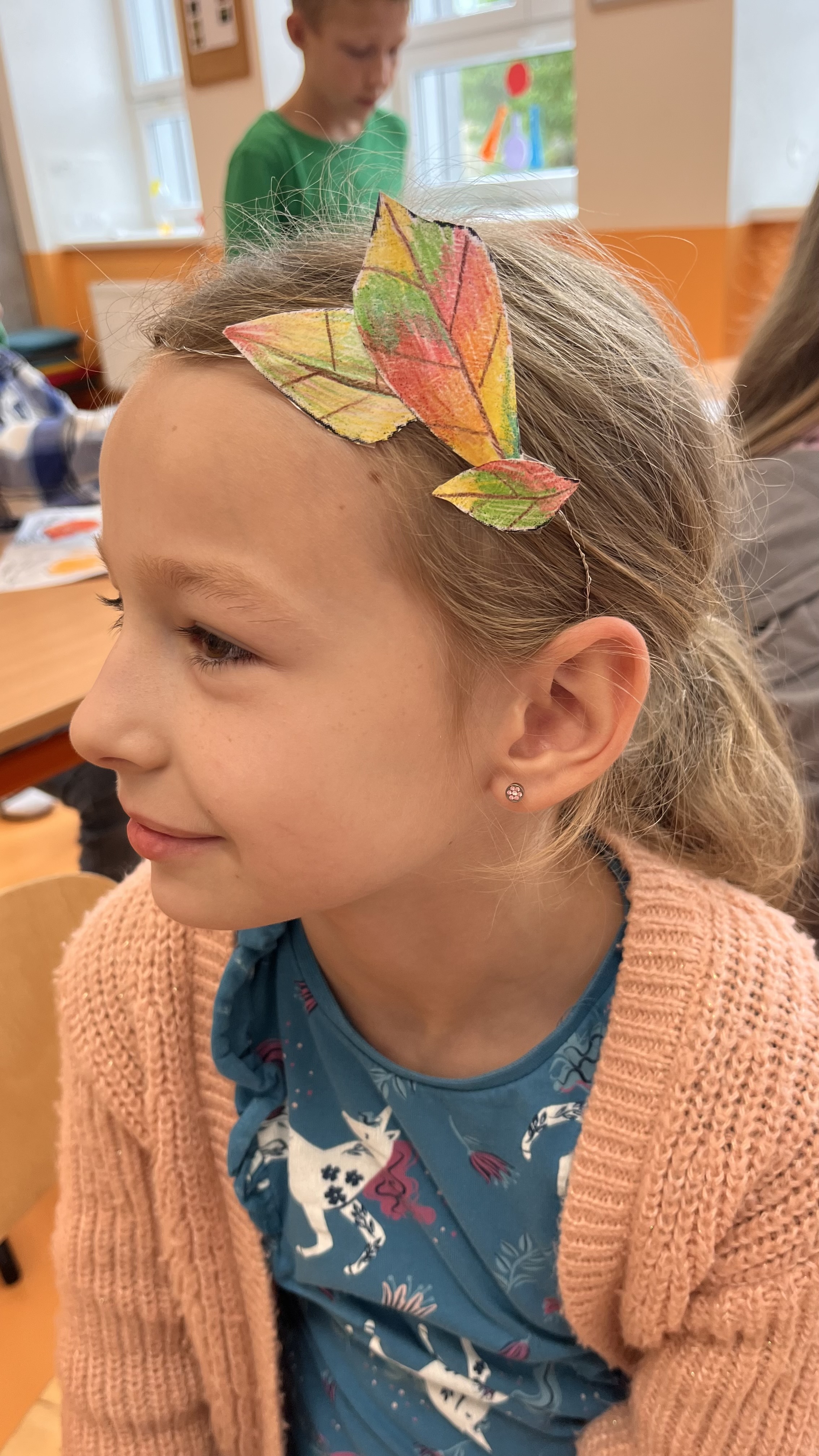 V pondělí jsme si užili den plný barev. Žáci každé třídy přišli oblečeni do všech odstínů barev podzimu. Společným úkolem byla výroba módního doplňku z listí či jiných přírodnin. Děti se ozdobily množstvím rozmanitých čelenek, náhrdelníků, náramků i přívěsků a při společném závěrečném focení jim to moc slušelo.