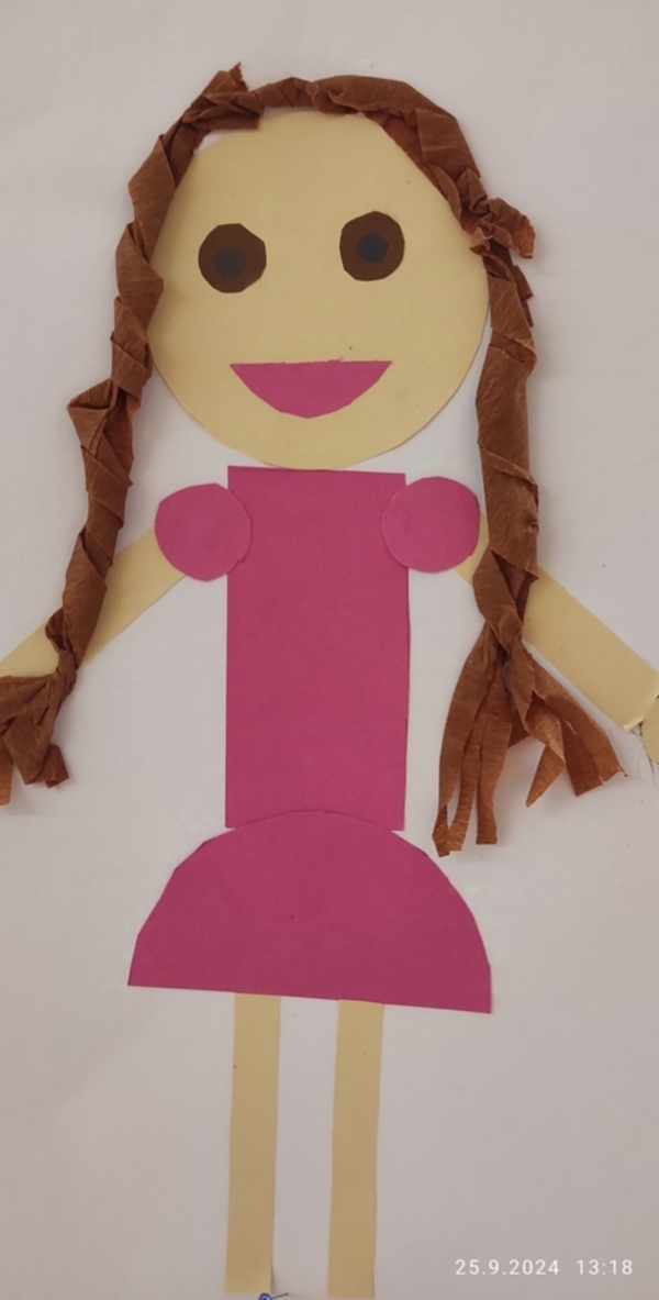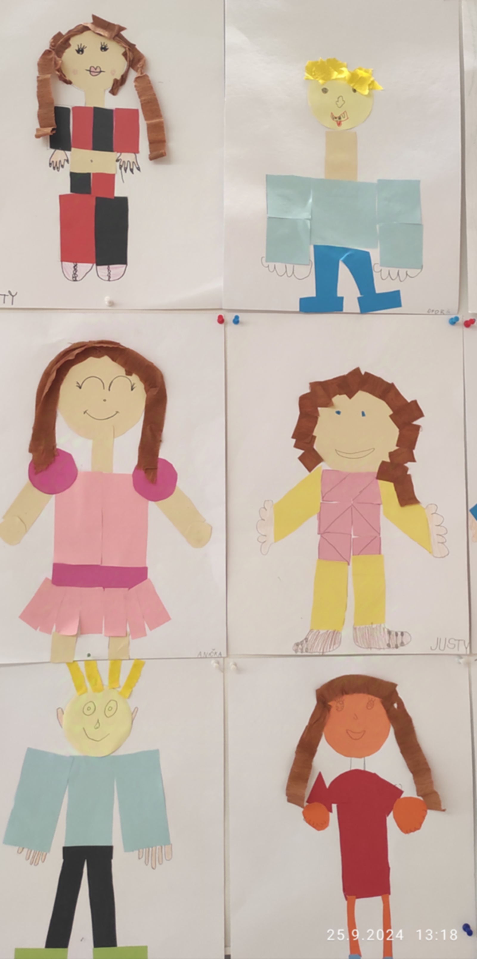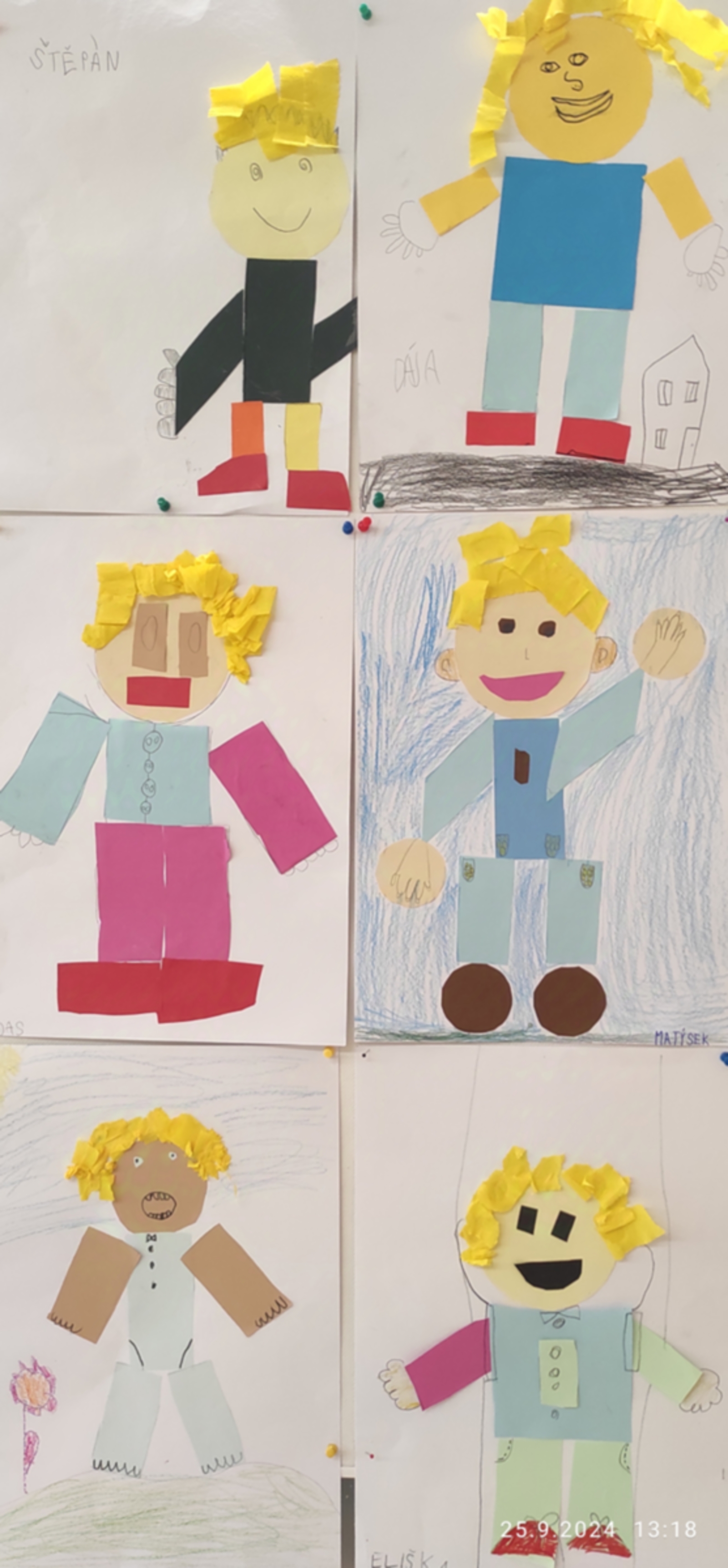 Zopakovat geometrické tvary můžeme nejen v sešitech a s pomocí názorných tvarů, ale také v pracovních činnostech při výrobě výtvorů. My jsme se pustili do výroby našeho kamaráda z učebnice. Je ro Pepa. Z obkreslených a vystřižených tvarů jsme sestavili tělo a dotvořili detaily podle svých představ. A aby nebyl Pepa sám, udělali jsme i jeho sestru Áju. No řekněte, sluší jim to?