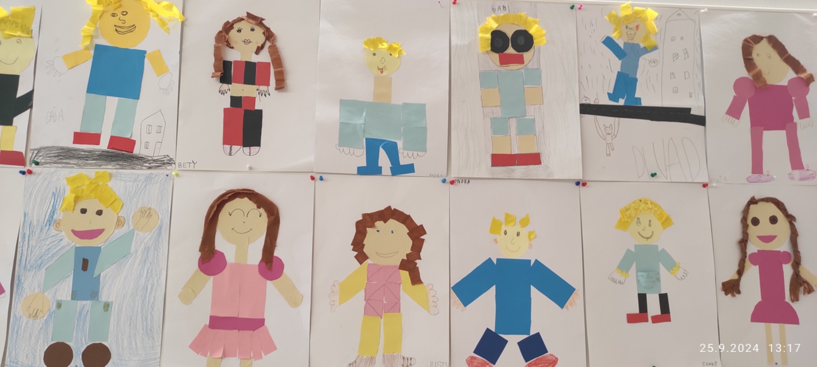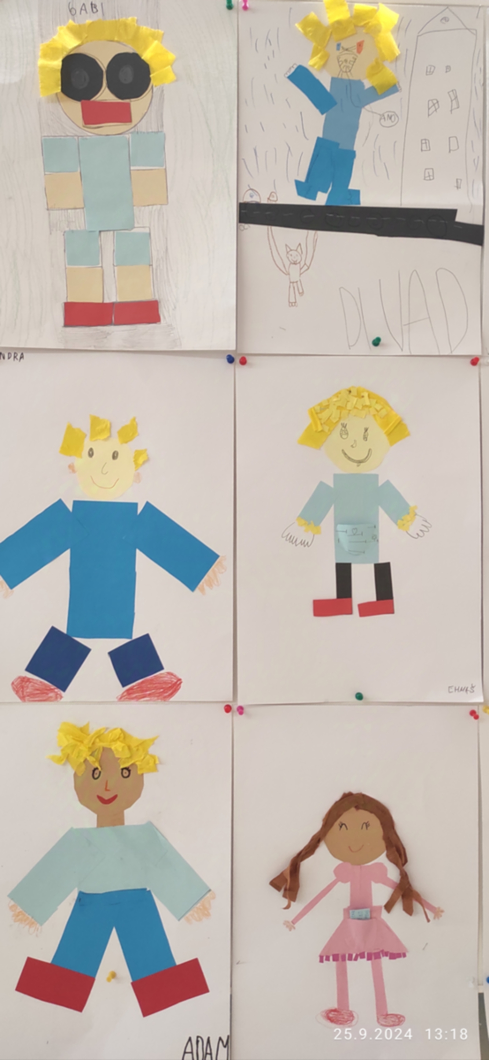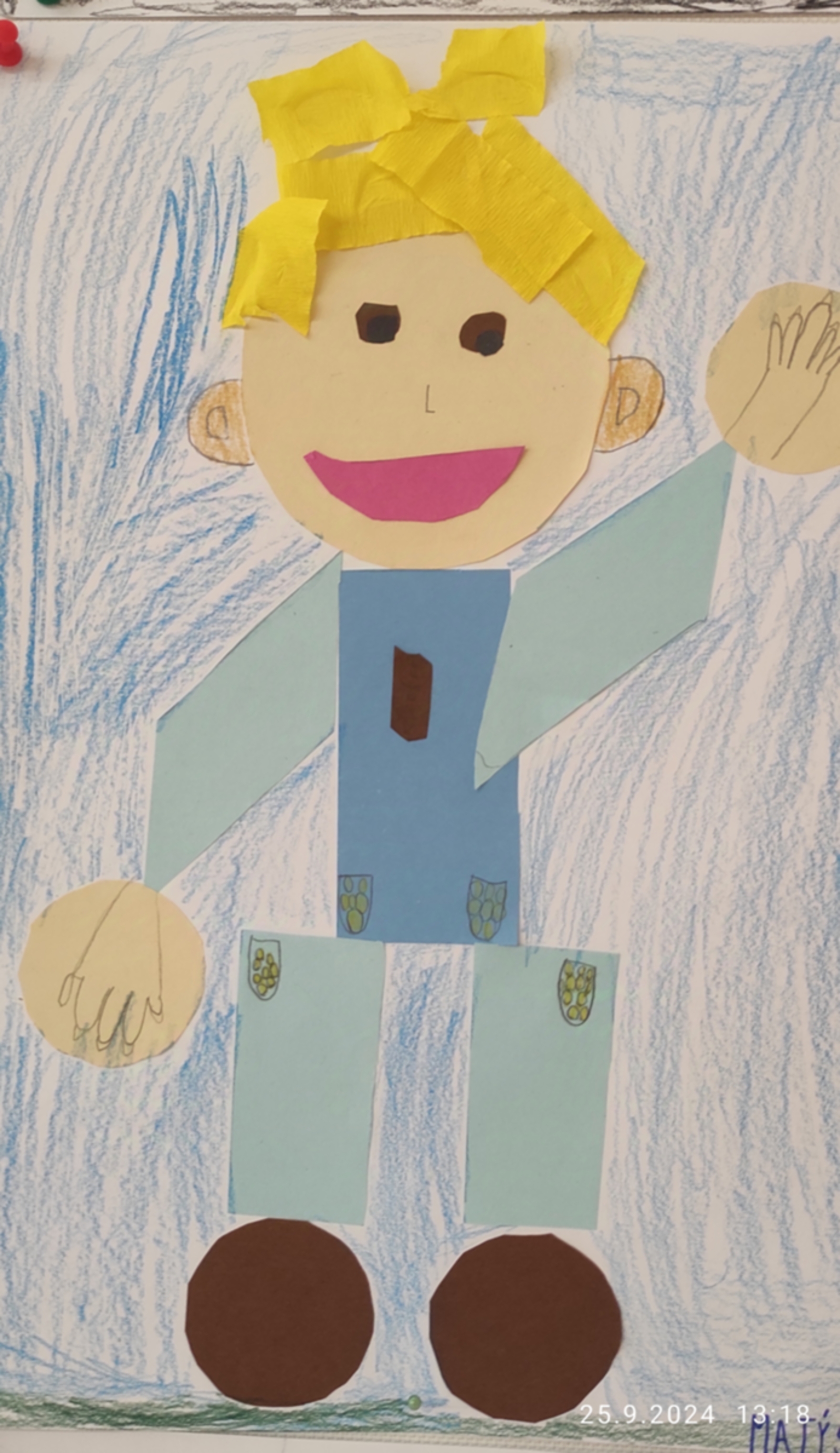 Zopakovat geometrické tvary můžeme nejen v sešitech a s pomocí názorných tvarů, ale také v pracovních činnostech při výrobě výtvorů. My jsme se pustili do výroby našeho kamaráda z učebnice. Je ro Pepa. Z obkreslených a vystřižených tvarů jsme sestavili tělo a dotvořili detaily podle svých představ. A aby nebyl Pepa sám, udělali jsme i jeho sestru Áju. No řekněte, sluší jim to?